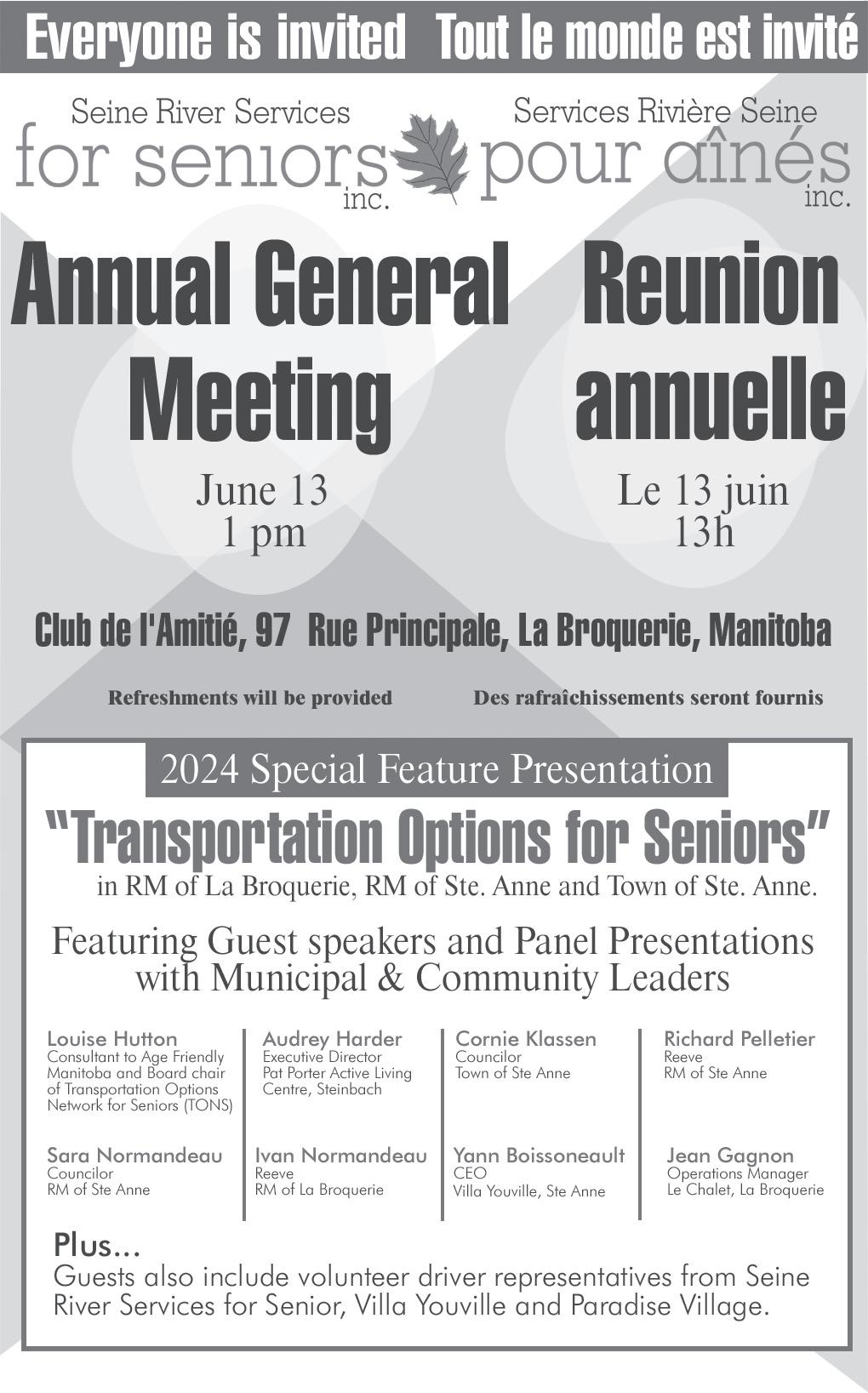 On June 13, the Seine River Services for Seniors (SRS) will hold their Annual General Meeting (AGM) at Centre de l’amitié, 97 Rue Principale, La Broquerie, starting at 1 pm.