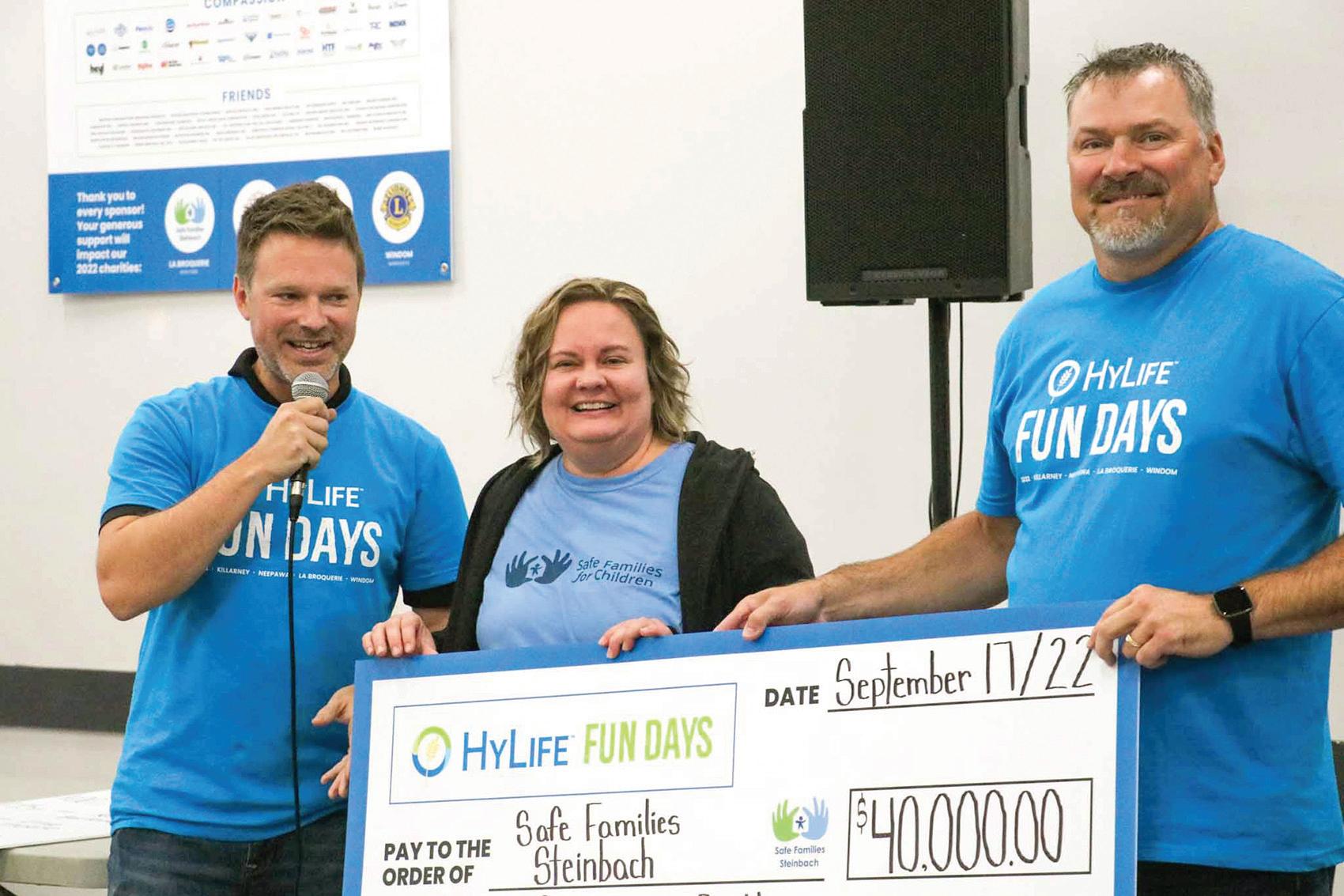HyLife 2022 Fun Days events wrapped up with a significant donation of more than $170,000 to local charities. In Steinbach, Safe Families Director Michelle Peters was shocked to learn that the group’s transitional housing for youth initiative was getting a big boost. Submitted photo