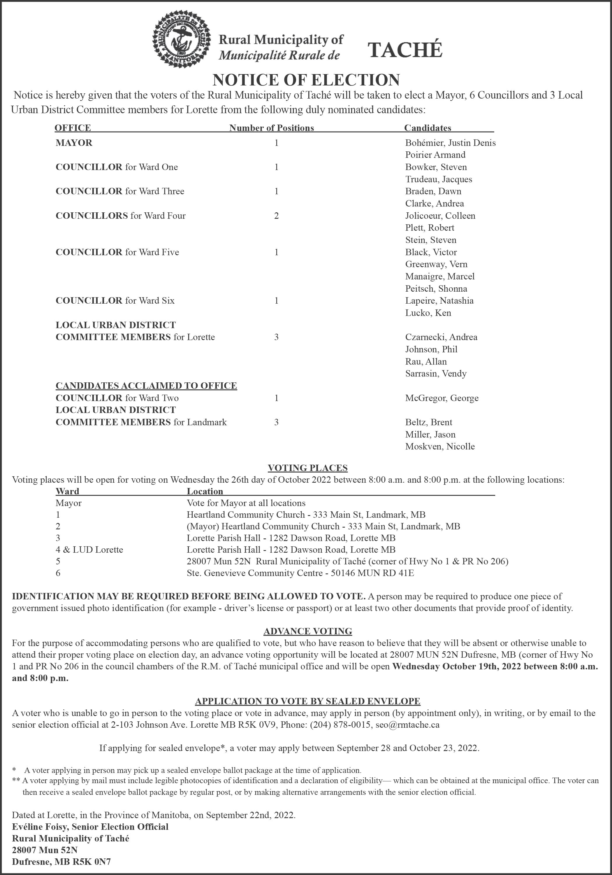 Card Making Workshop – Thursday, October 13, 7 – 9 pm at the Community Centre. Take home 3 cards, bilingual cards available. Maximum 15 participants. Register by Sep tember 30. Contact 204-878-3321 ext 108.