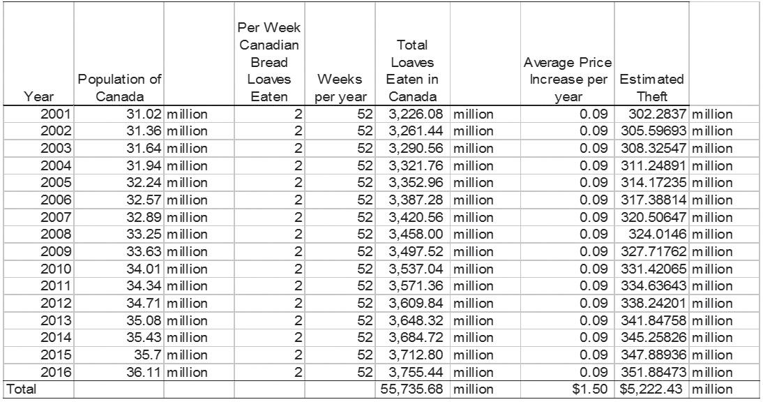 Over a 16 year period the price increase is about .10 cents per year ($1.50) and if every Canadian ate 2 loaves of bread once a week (think about all those school lunches), over 52 weeks in a year where we eat about 55,735.68 million loaves, these grocers stole $5.222 billion with just under a 10 cents price increase from Canadians on one basic grocery item.