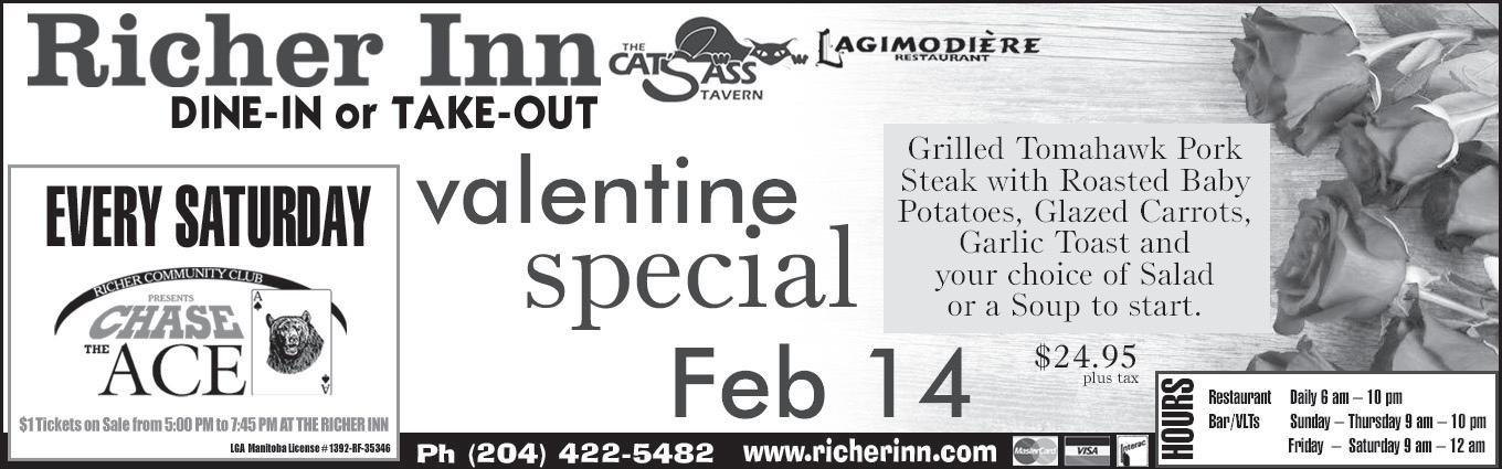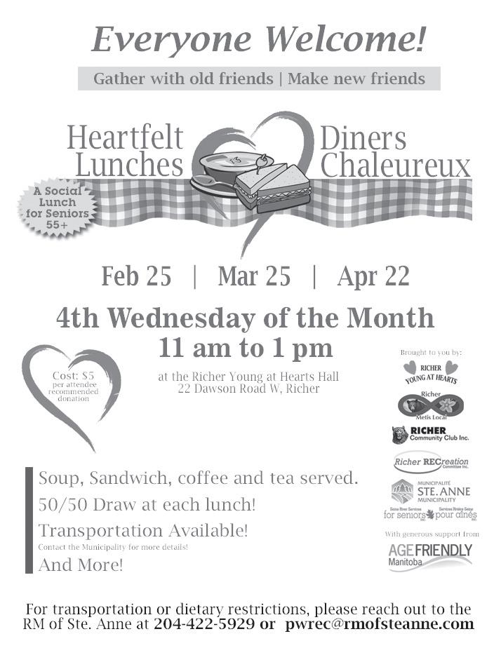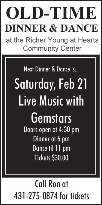 The next Richer Young At Hearts Dinner and Dance is scheduled for Feb 21 with music by Gemstars. Doors open at 4:30 pm, Dinner is at 6 pm with dancing until 11 pm. Tickets are $30 per person. Contact Ron @ 431 275 0874 for tickets or information.