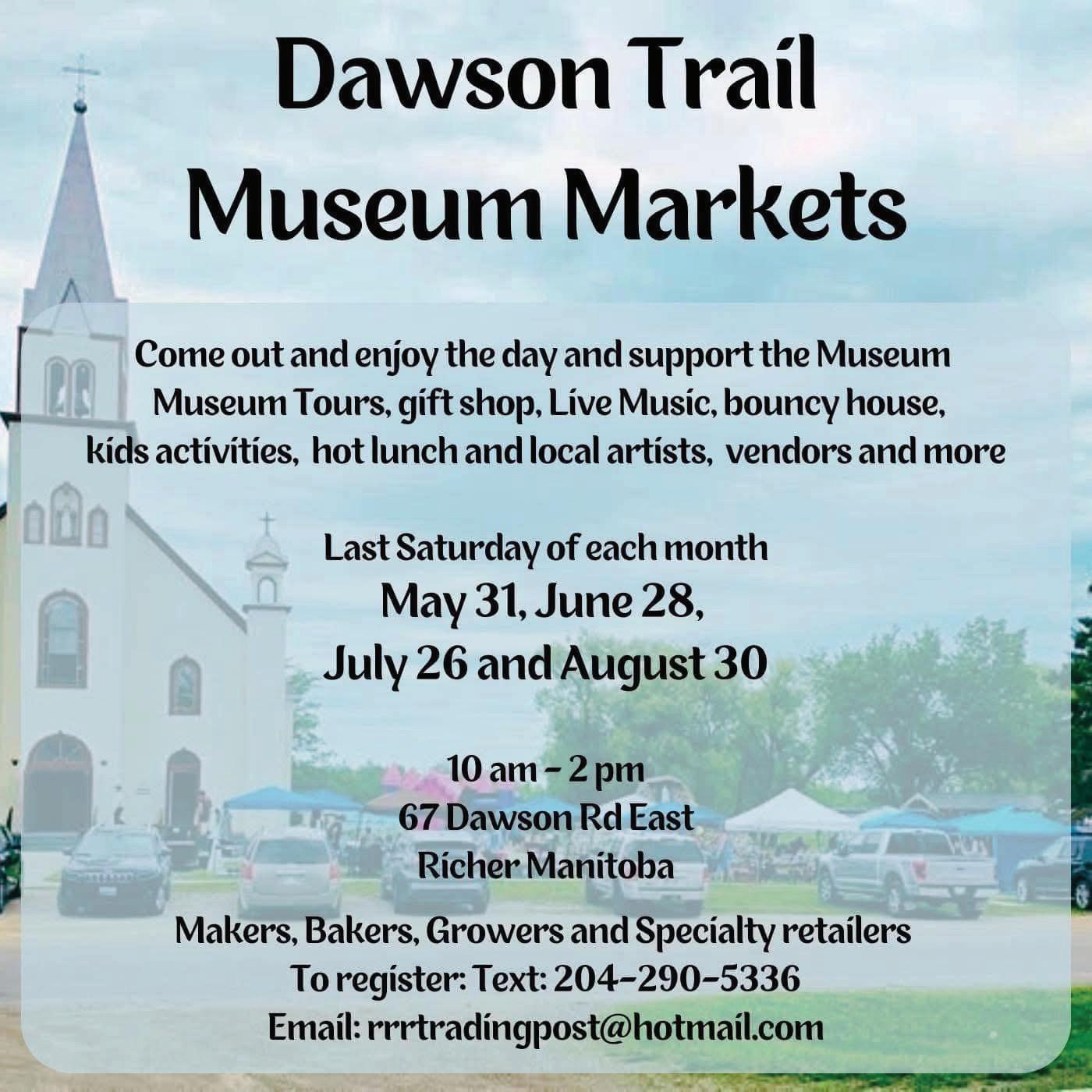 are held at the Dawson Trail Museum on Saturday, July 26, Aug 30 from 10 am to 2 pm. We welcome Bakers, Growers and Specialty retailers. Come listen to live music, bouncy castle, gift shop, self museum tours, hot lunch and local artists, vendors and more. To register: Text: 204290-5336 or email: rrrtradingpost@hotmail. com.