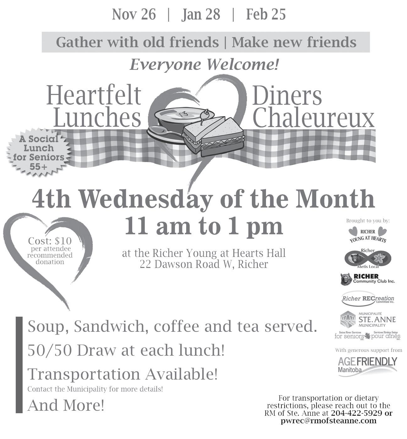 For 55+ every 4th Wednesday from 11 am to 1 pm at the Richer Young at Hearts Hall. Suggested donation is $10, which goes back into the program to fund the lunches. For more info contact RM of Ste Anne at 204-422-5929. Next lunch is Nov 26.