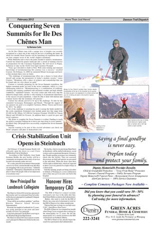 Conquering Seven Summits for Ile Des Chênes Man By Marianne Curtis An Ile Des Chênes man with a unique love of heights was recently recognized as a sport star of the week for his love of pushing the limits. In about two months Dean Carriere will be launching an expedition that will see him conquer seven of the world’s highest mountains. While Manitoba fails to have the peaks needed to launch a mountaineer, Carriere has turned his prairie landscape into a circuit of training exercise in preparation for the Carstensz Expedition. He will travel to Papau, Indonesia to take on the 16,023 foot high Carstensz Pyramid. “Years ago I decided to climb in Peru. With some training and minimal knowledge of mountaineering this journey was a success,” recalled Carriere. On February 14, 2009, he summited Mount Aconcagua and knew at that moment there were no limits. “The challenge of mountaineering offers me a chance to learn about myself and escape the parameters of today’s modern society,” states Carriere. “Mountains offer a place of richness and comradeship that can be found only in a few places on earth.” Carriere is currently preparing for the Seven Summits expedition, the highest mountain peaks on each of the seven continents, which is a very challenging endeavor. “Mountaineering is a combination of trekking, climbing and camping combined with inclement weather and high altitude conditions,” explained Carriere. “At every corner and with every step the unknown danger lurks, and this is why training is of paramount importance to the success of each expedition. I must be able to deal with internal and external factors that the mountain will present.” Carriere has already proved to be up to the challenge. To date he has summited Aconcagua, Kilimanjaro and Denali. “Through the support of my sponsors my goal is to complete Carstensz, Elbrus, Vinson and Everest by 2013,” he added. Part of the challenge to reaching his goal is raising the funds needed for the costly expedition. Estimated costs include guide fees that range from $5,200 for Mt. Elbrus, $15,900 for Carstensz Pyramid, $38,000 for Vinson Massif and $59,000 for Everest. In addition there is need for gear and travel expenses. “My desire to complete the Seven Summits is evident. Funding to reach my goals is essential, helping me to move one step closer to every summit,” he added. Only 200 people have successfully completed the Seven Summits Challenge. Anyone wanting to be part of this excited adventure can check out Dean’s progress and plan at deancarriere.com.