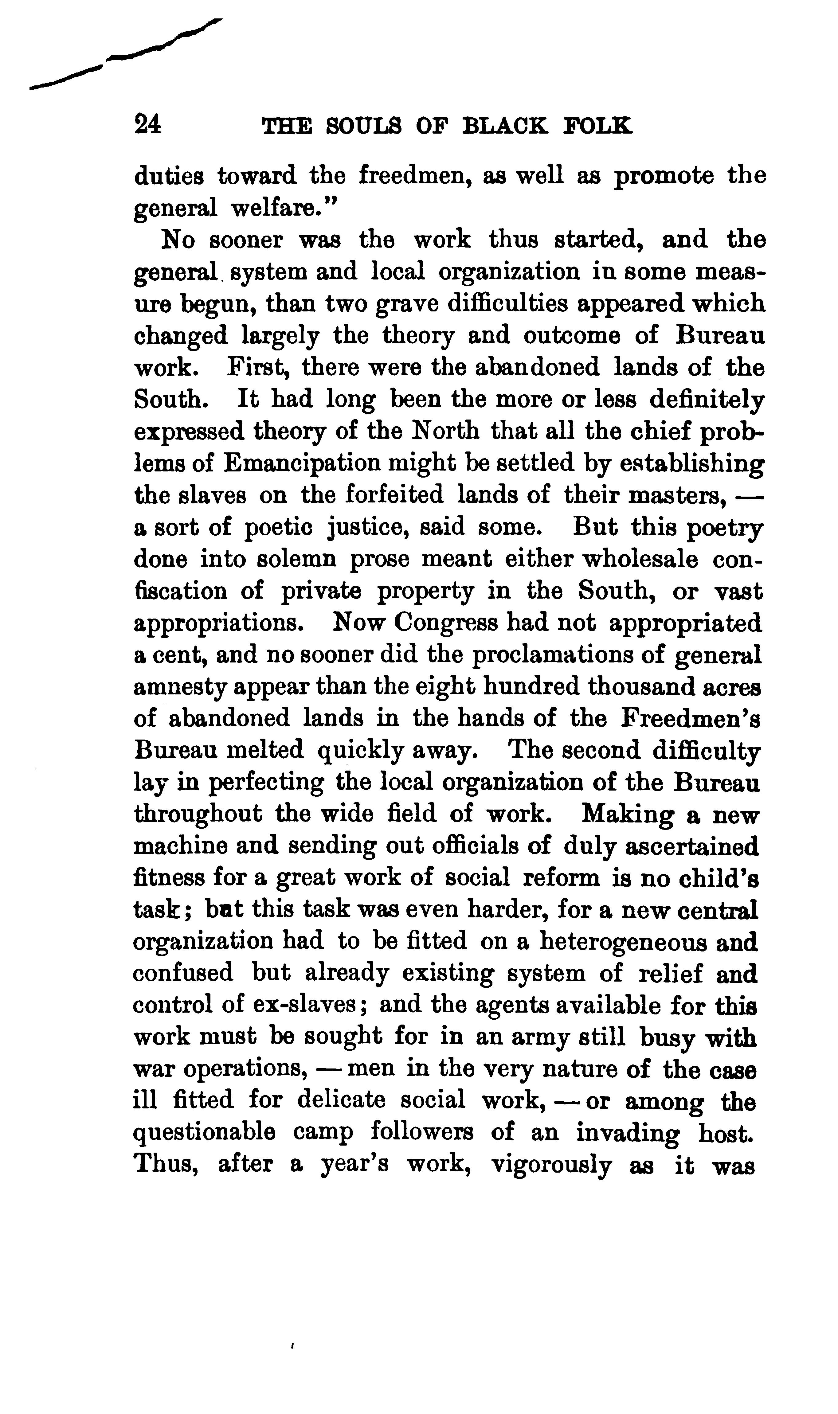 No sooner was the work thus started, and the general system and local organization in some measure begun, than two grave difficulties appeared which changed largely the theory and outcome of Bureau work. First, there were the abandoned lands of the South. It had long been the more or less definitely expressed theory of the North that all the chief problems of Emancipation might be settled by establishing the slaves on the forfeited lands of their masters,a sort of poetic justice, said some. But this poetry done into solemn prose meant either wholesale confiscation of private property in the South, or vast appropriations. Now Congress had not appropriated acent, and no sooner did the proclamations of general amnesty appear than the eight hundred thousand acres of abandoned lands in the hands of the Freedmen's Bureau melted quickly away. The second difficulty lay in perfecting the local organization of the Bureau throughout the wide field of work. Making a new machine and sending out officials of duly ascertained fitness for a great work of social reform is no child's task; but this task was even harder, for a new central organization had to be fitted on a heterogeneous and confused but already existing system of relief and control of ex-slaves ; and the agents available for this work must be sought for in an army still busy with war operations, men in the very nature of the case ill fitted for delicate social work,- or among the questionable camp followers of an invading host. Thus, after a year's work, vigorously as it was