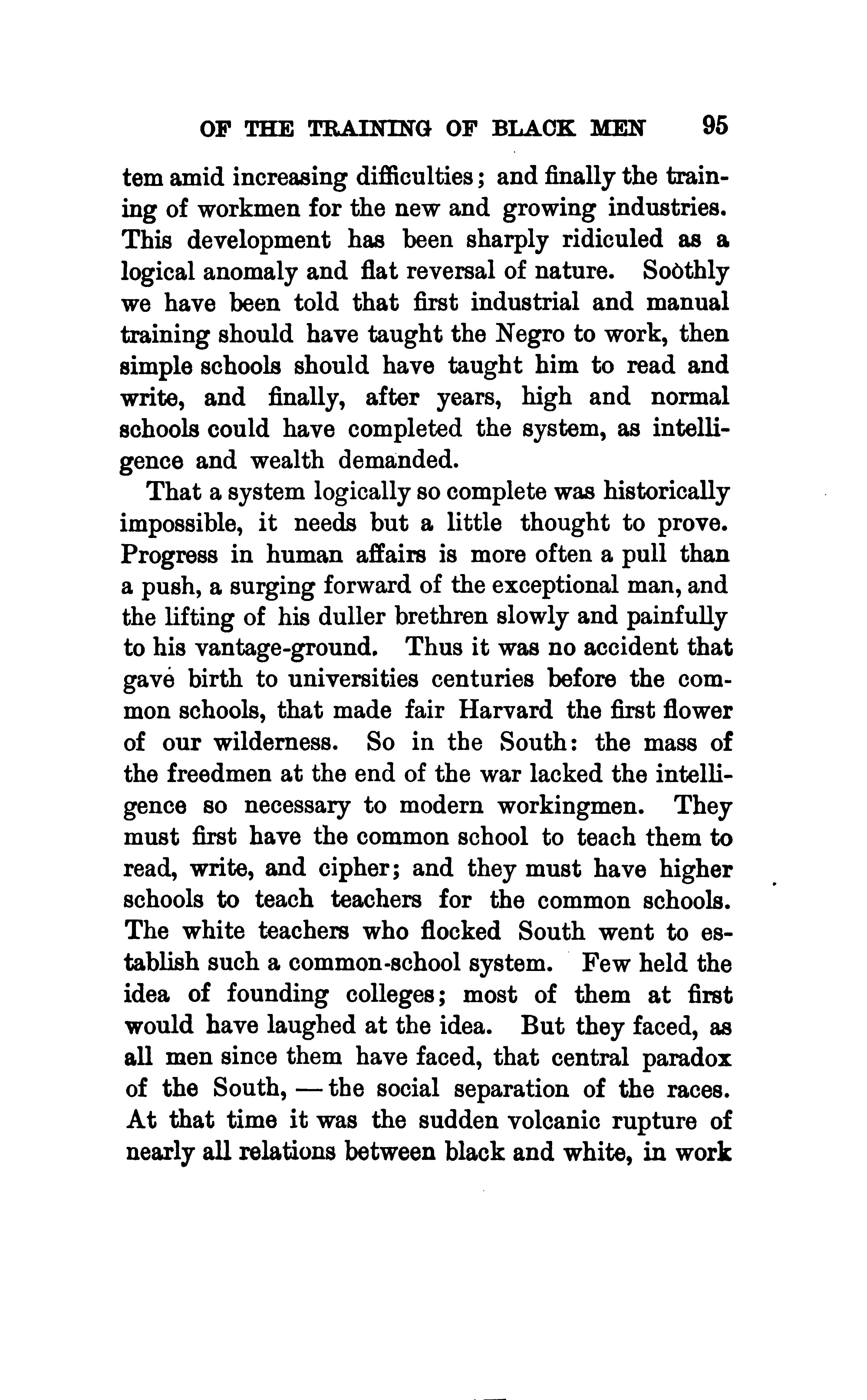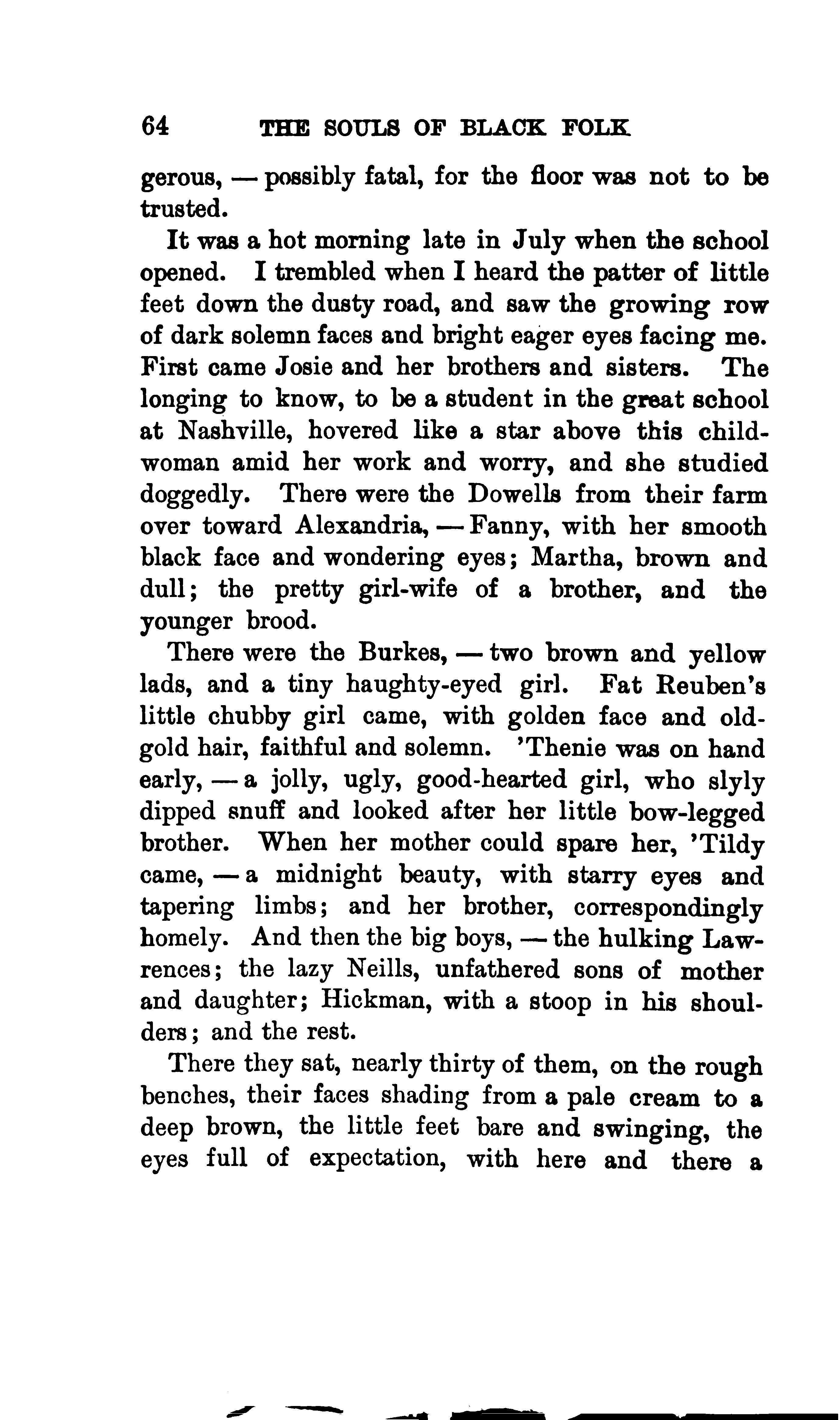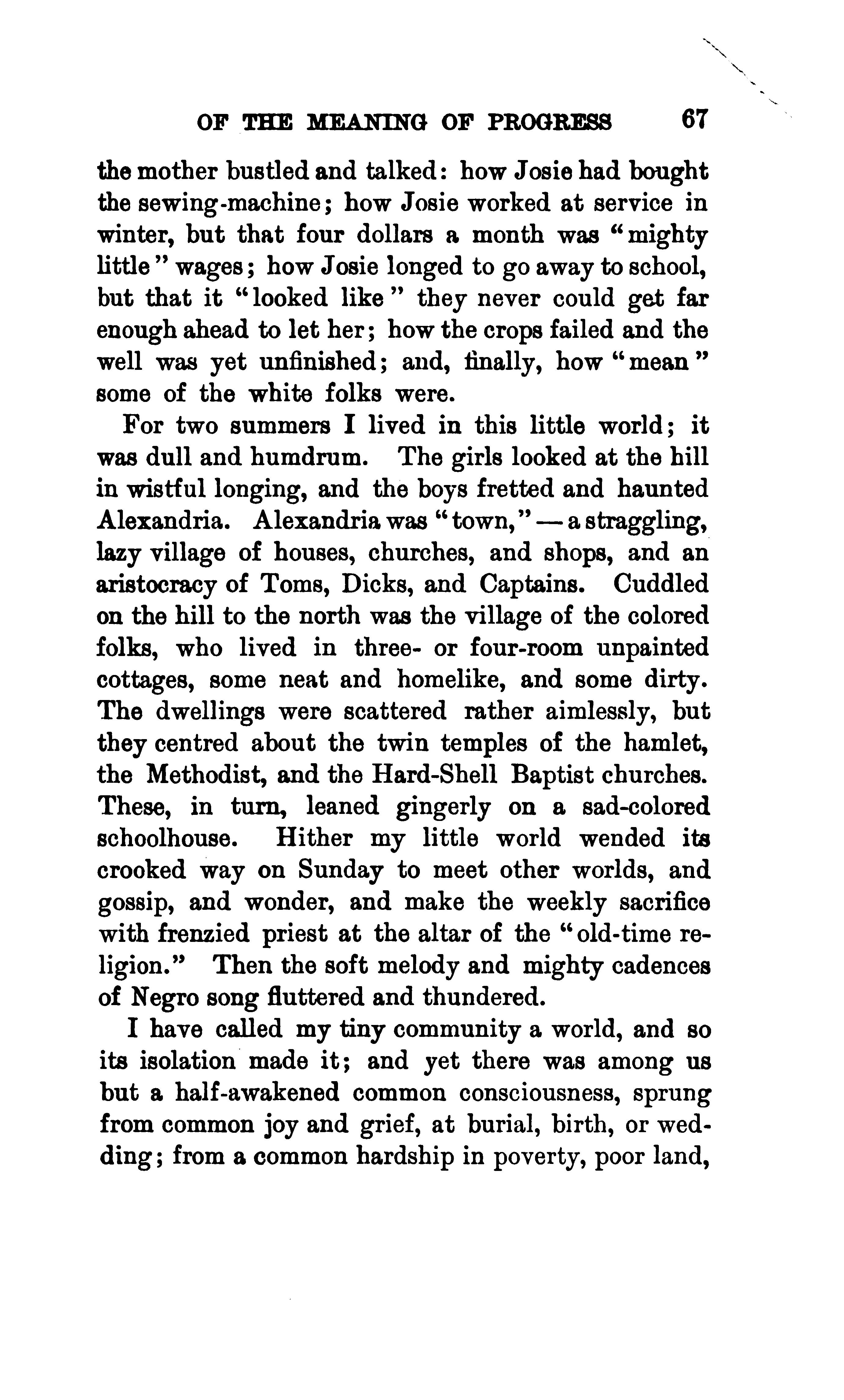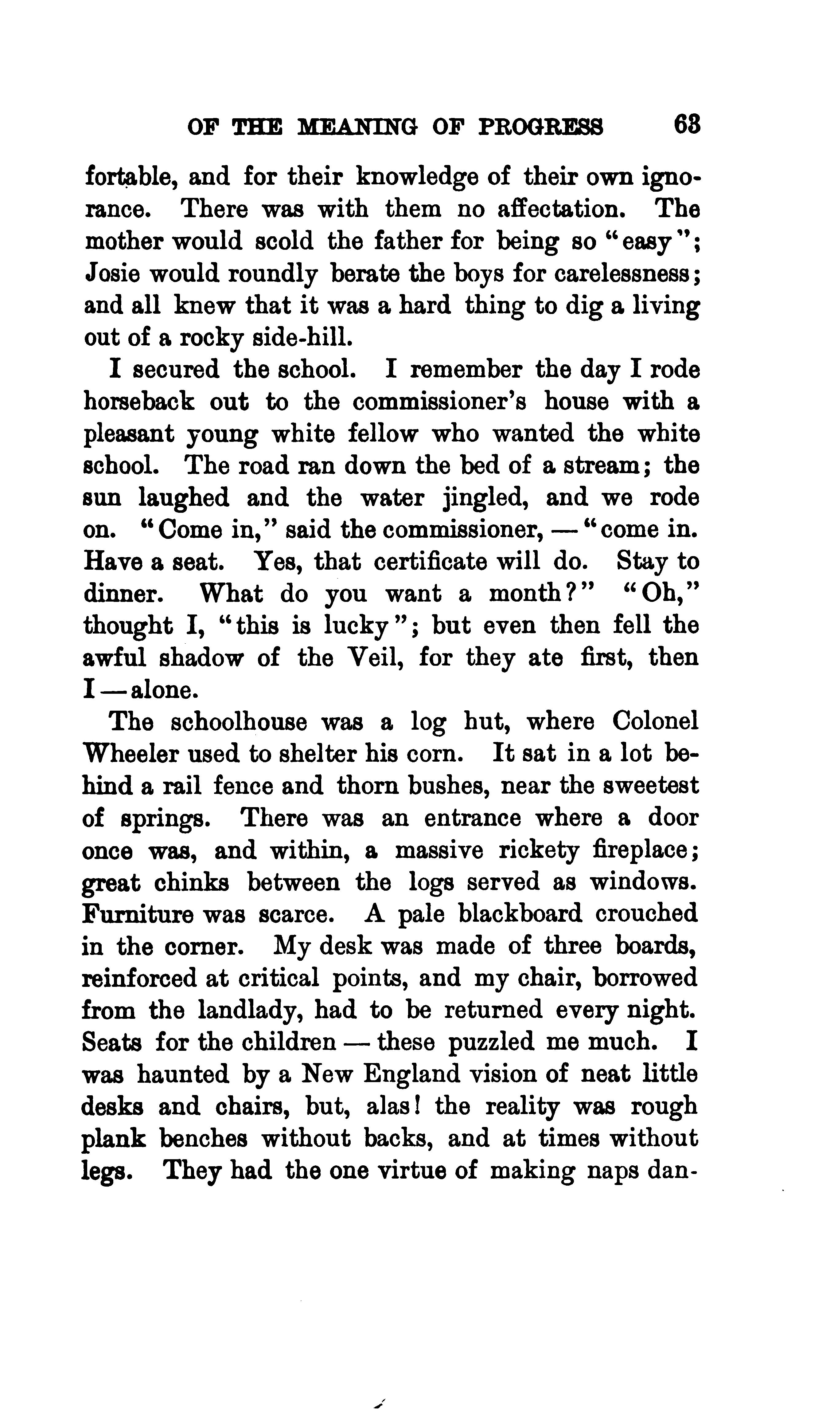 Up the new path the advance guard toiled, slowly heavily, doggedly ; only those who have watched and guided the faltering feet, the misty minds, the dull understandings, of the dark pupils of these schools know howfaithfully, how piteously, this people strove to learn. It was weary work. The cold statistician wrote down the inches of progress here and there, noted also where here and there a foot had slipped or some one had fallen. To the tired climbers, the horizon was ever dark, the mists were often cold, the Canaan was always dim and far away. If, however, the vistas disclosed as yet no goal, no restingplace, little but flattery and criticism, the journey at least gave leisure for reflection and self-examination ; it changed the child of Emancipation to the youth with dawning self-consciousness, self-realization, selfrespect. In those sombre forests of his striving his own soul rose before him, and he saw himself, darkly as through a veil ; and yet he saw in himself some faint revelation of his power, of his mission. He began to have a dim feeling that, to attain his place in the world, he must be himself, and not another. For the first time he sought to analyze the burden he bore upon his back, that dead-weight of social degradation partially masked behind a halfnamed Negro problem. He felt his poverty; without a cent, without a home, without land, tools, or savings, he had entered into competition with rich, landed, skilled neighbors. To be a poor man is hard, but to be a poor race in a land of dollars is the very bottom of hardships. He felt the weight of his ignorance,not simply of letters, but of life, of