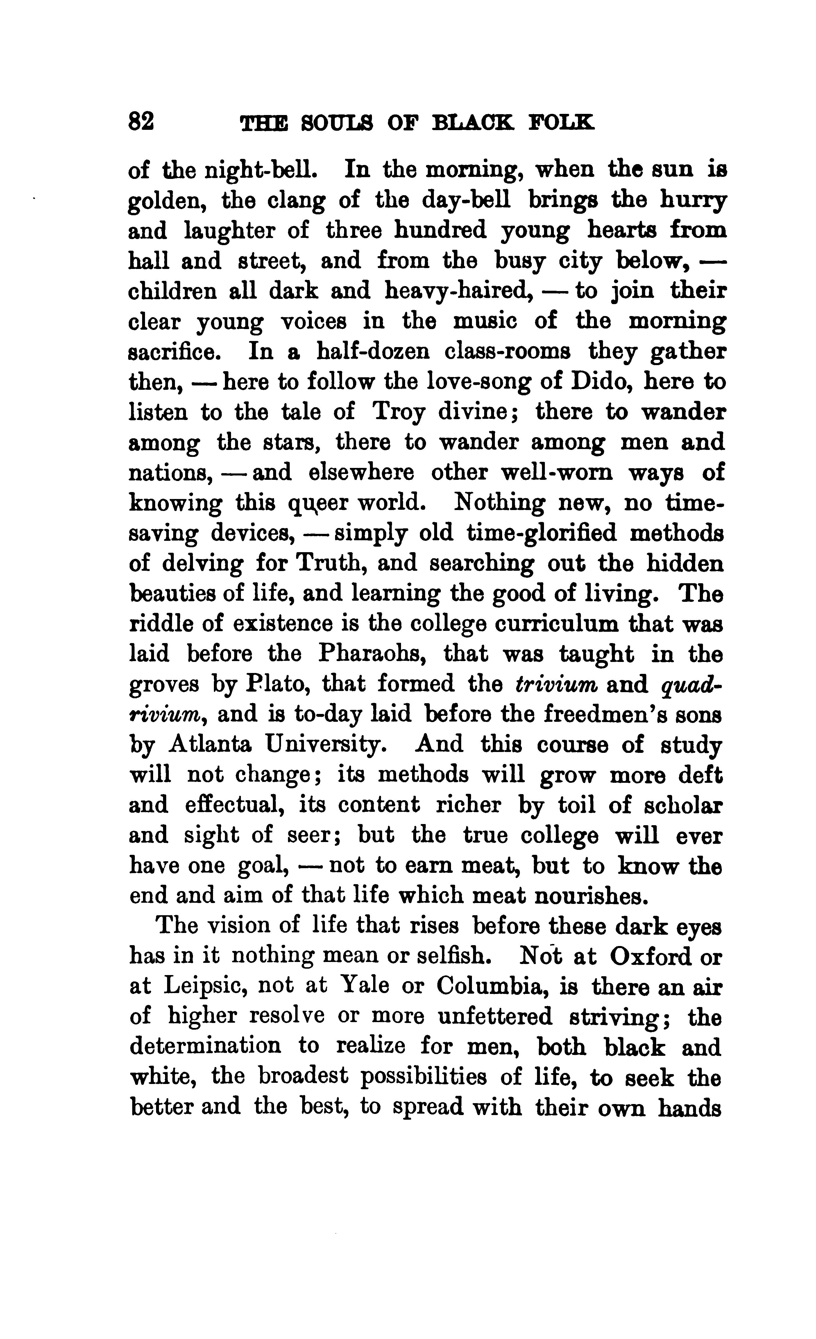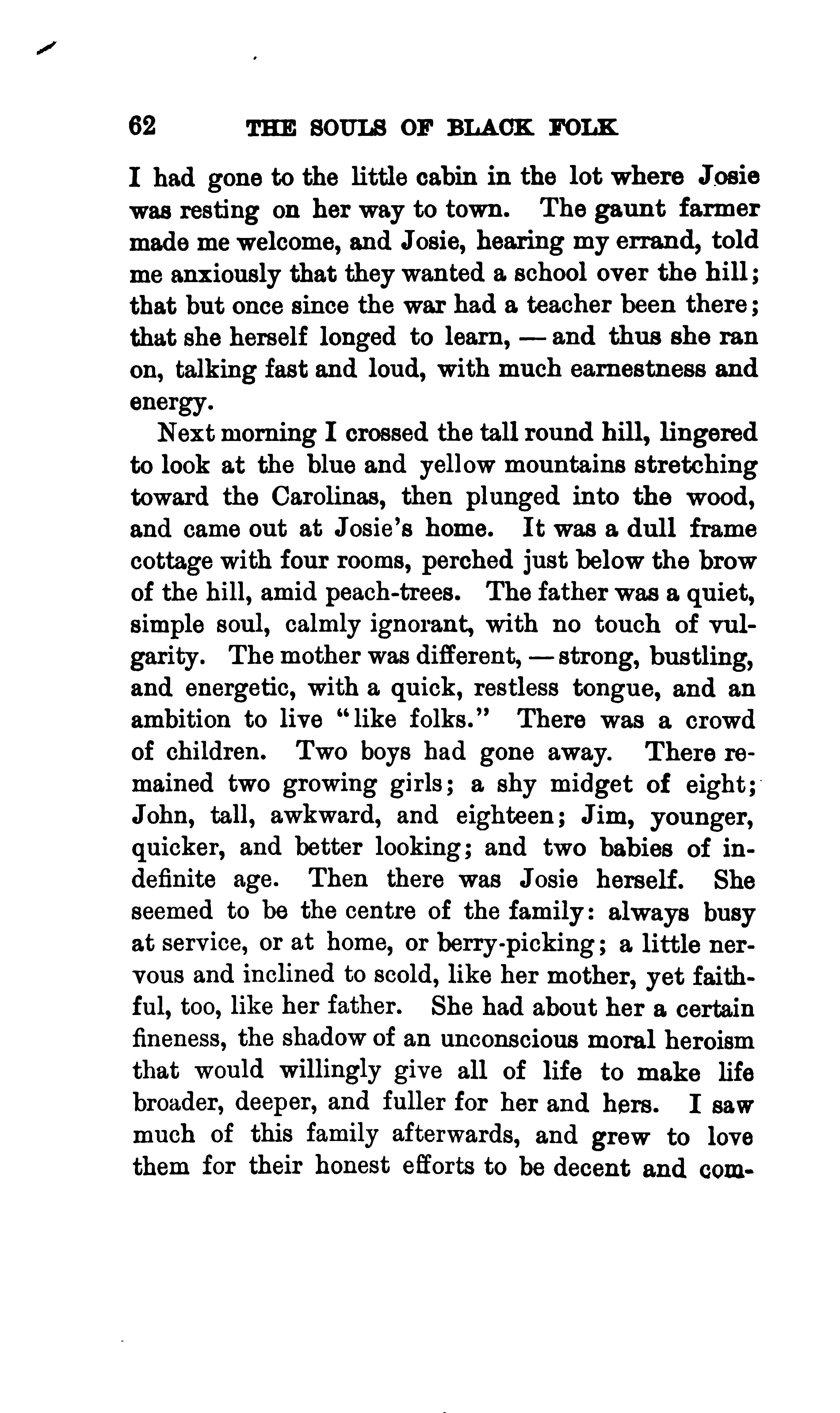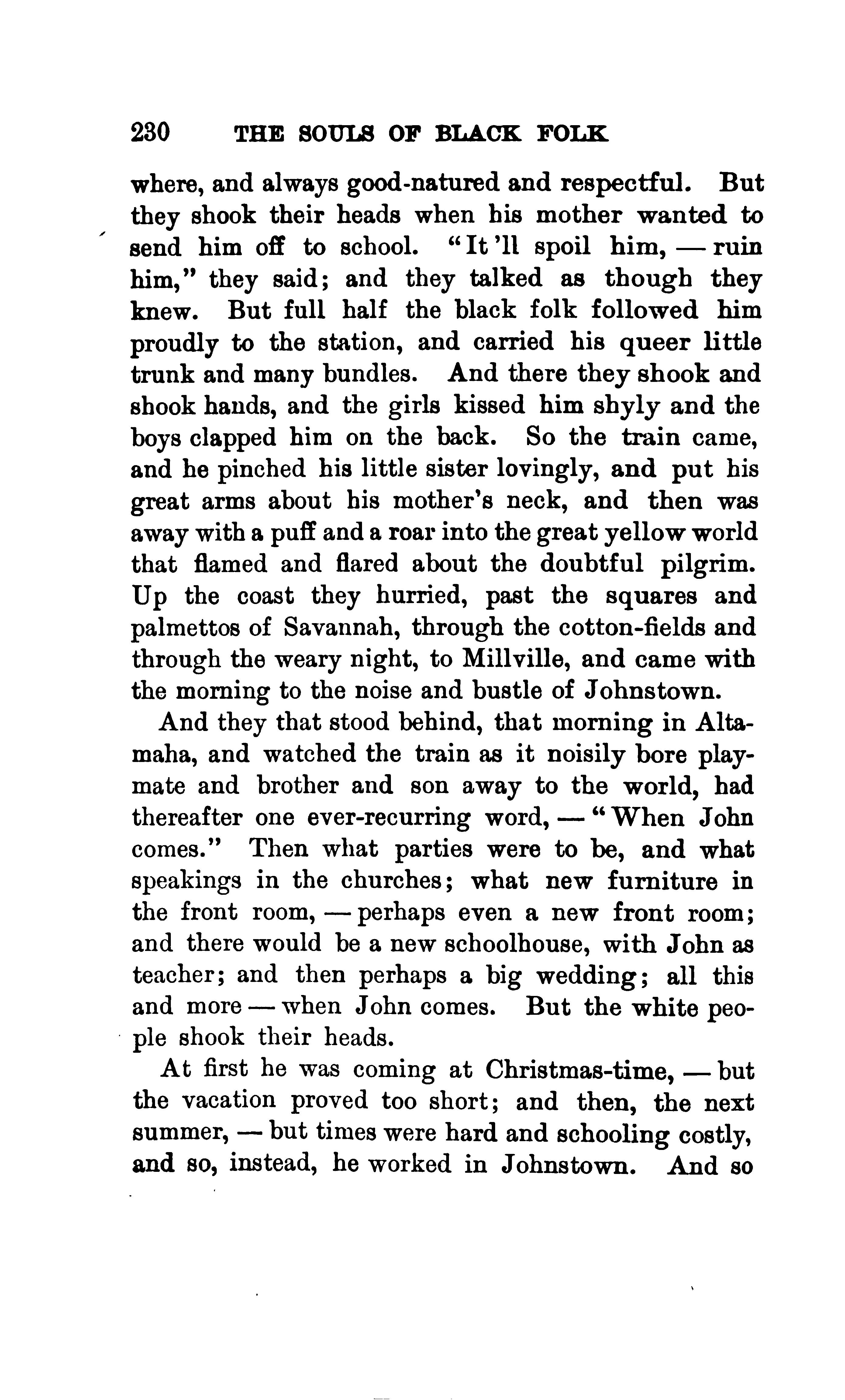 Up the new path the advance guard toiled, slowly heavily, doggedly ; only those who have watched and guided the faltering feet, the misty minds, the dull understandings, of the dark pupils of these schools know howfaithfully, how piteously, this people strove to learn. It was weary work. The cold statistician wrote down the inches of progress here and there, noted also where here and there a foot had slipped or some one had fallen. To the tired climbers, the horizon was ever dark, the mists were often cold, the Canaan was always dim and far away. If, however, the vistas disclosed as yet no goal, no restingplace, little but flattery and criticism, the journey at least gave leisure for reflection and self-examination ; it changed the child of Emancipation to the youth with dawning self-consciousness, self-realization, selfrespect. In those sombre forests of his striving his own soul rose before him, and he saw himself, darkly as through a veil ; and yet he saw in himself some faint revelation of his power, of his mission. He began to have a dim feeling that, to attain his place in the world, he must be himself, and not another. For the first time he sought to analyze the burden he bore upon his back, that dead-weight of social degradation partially masked behind a halfnamed Negro problem. He felt his poverty; without a cent, without a home, without land, tools, or savings, he had entered into competition with rich, landed, skilled neighbors. To be a poor man is hard, but to be a poor race in a land of dollars is the very bottom of hardships. He felt the weight of his ignorance,not simply of letters, but of life, of