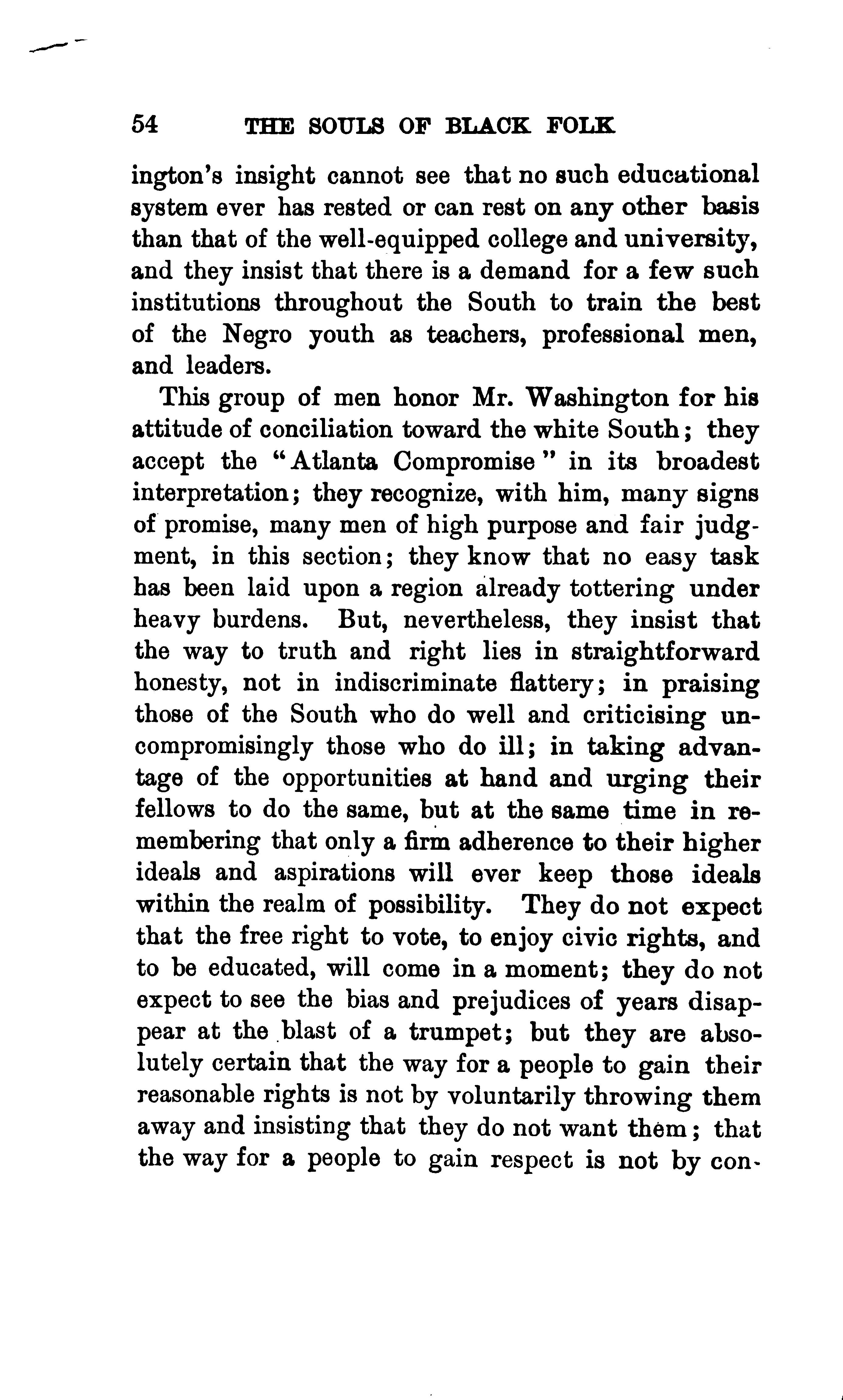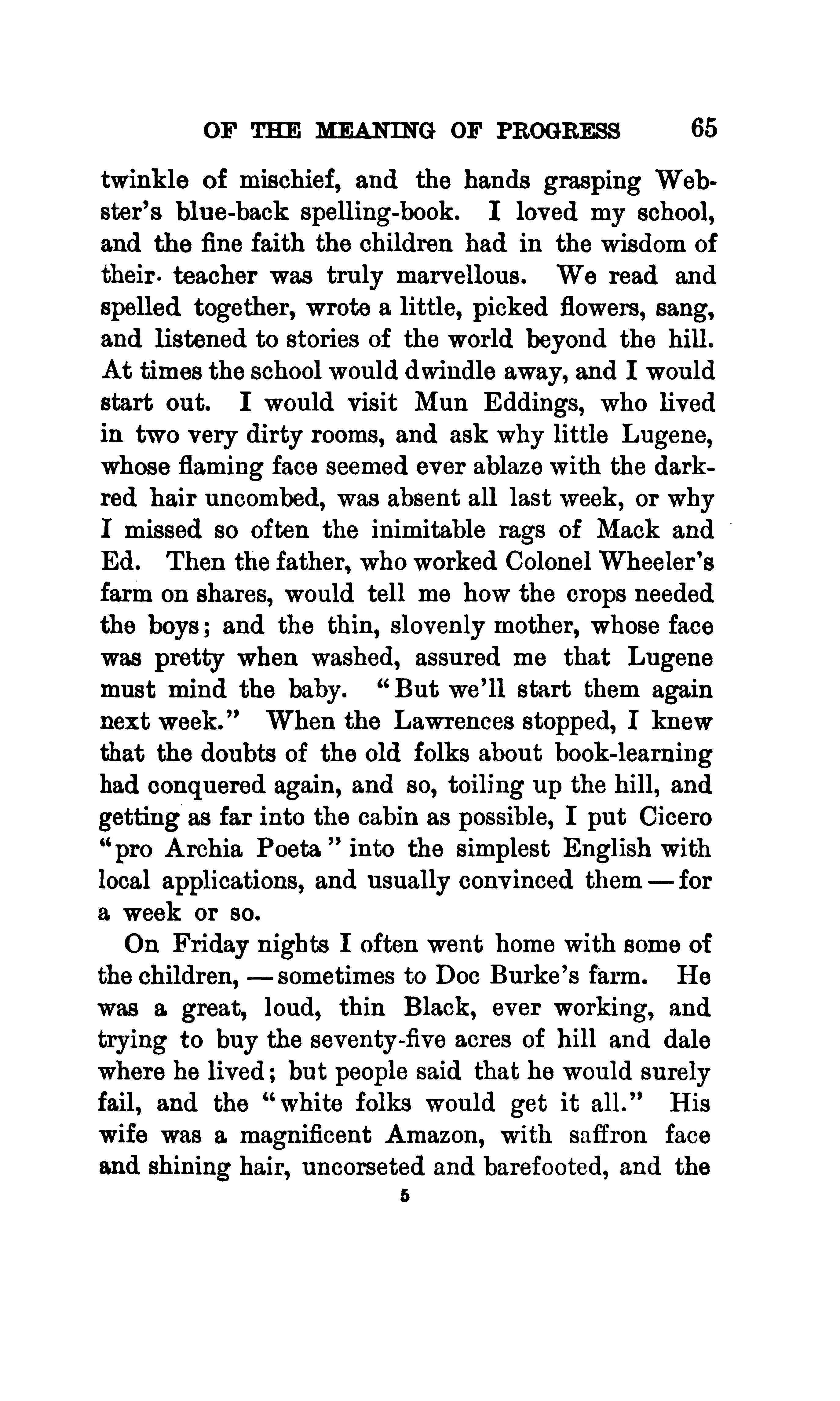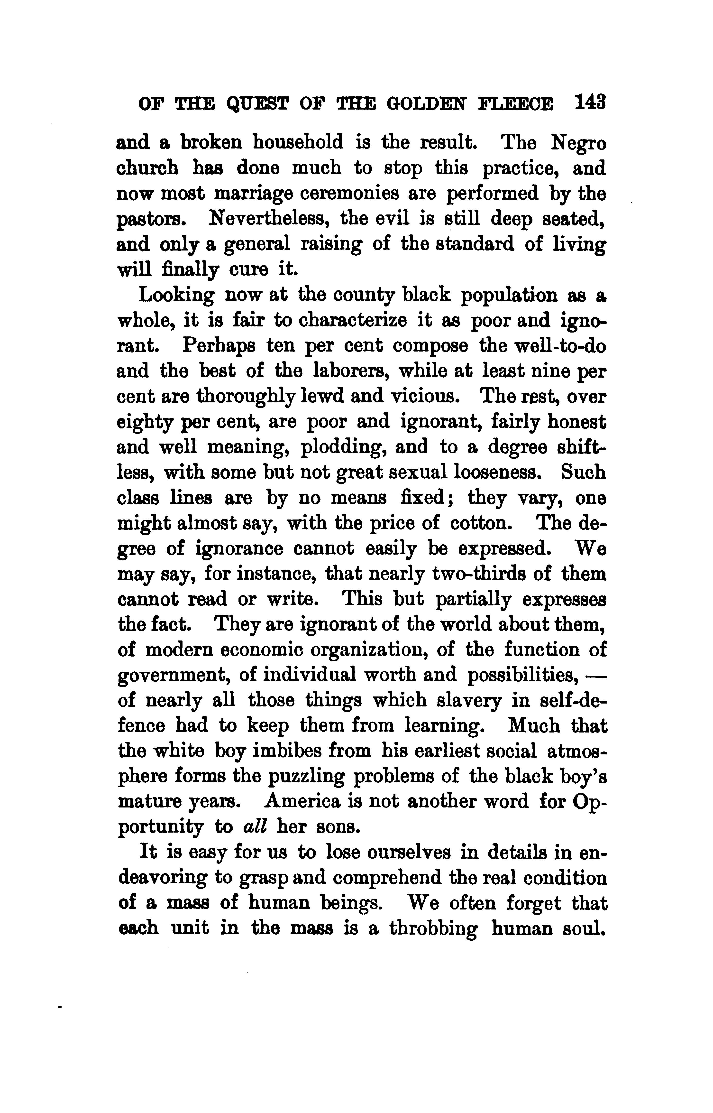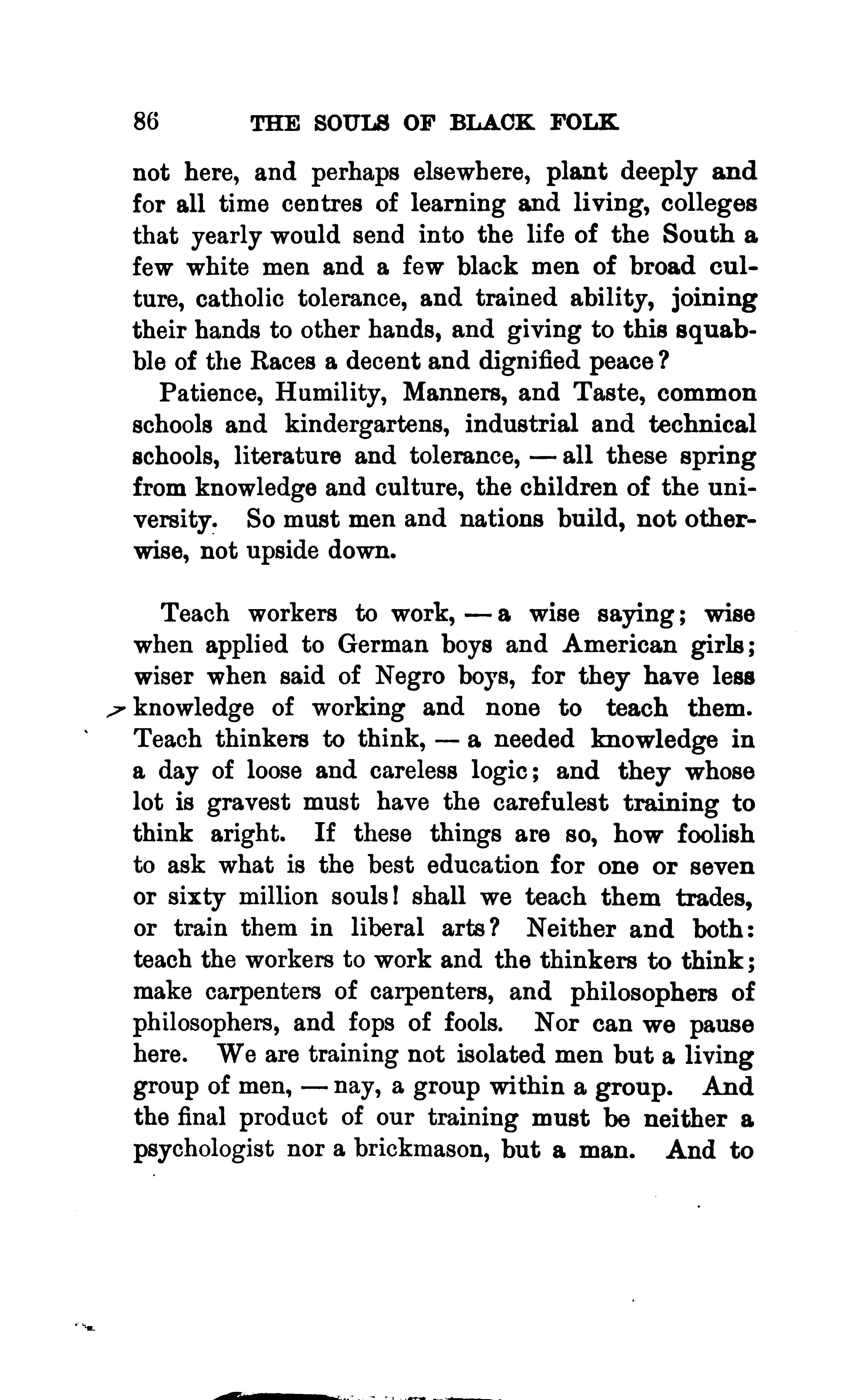 Up the new path the advance guard toiled, slowly heavily, doggedly ; only those who have watched and guided the faltering feet, the misty minds, the dull understandings, of the dark pupils of these schools know howfaithfully, how piteously, this people strove to learn. It was weary work. The cold statistician wrote down the inches of progress here and there, noted also where here and there a foot had slipped or some one had fallen. To the tired climbers, the horizon was ever dark, the mists were often cold, the Canaan was always dim and far away. If, however, the vistas disclosed as yet no goal, no restingplace, little but flattery and criticism, the journey at least gave leisure for reflection and self-examination ; it changed the child of Emancipation to the youth with dawning self-consciousness, self-realization, selfrespect. In those sombre forests of his striving his own soul rose before him, and he saw himself, darkly as through a veil ; and yet he saw in himself some faint revelation of his power, of his mission. He began to have a dim feeling that, to attain his place in the world, he must be himself, and not another. For the first time he sought to analyze the burden he bore upon his back, that dead-weight of social degradation partially masked behind a halfnamed Negro problem. He felt his poverty; without a cent, without a home, without land, tools, or savings, he had entered into competition with rich, landed, skilled neighbors. To be a poor man is hard, but to be a poor race in a land of dollars is the very bottom of hardships. He felt the weight of his ignorance,not simply of letters, but of life, of