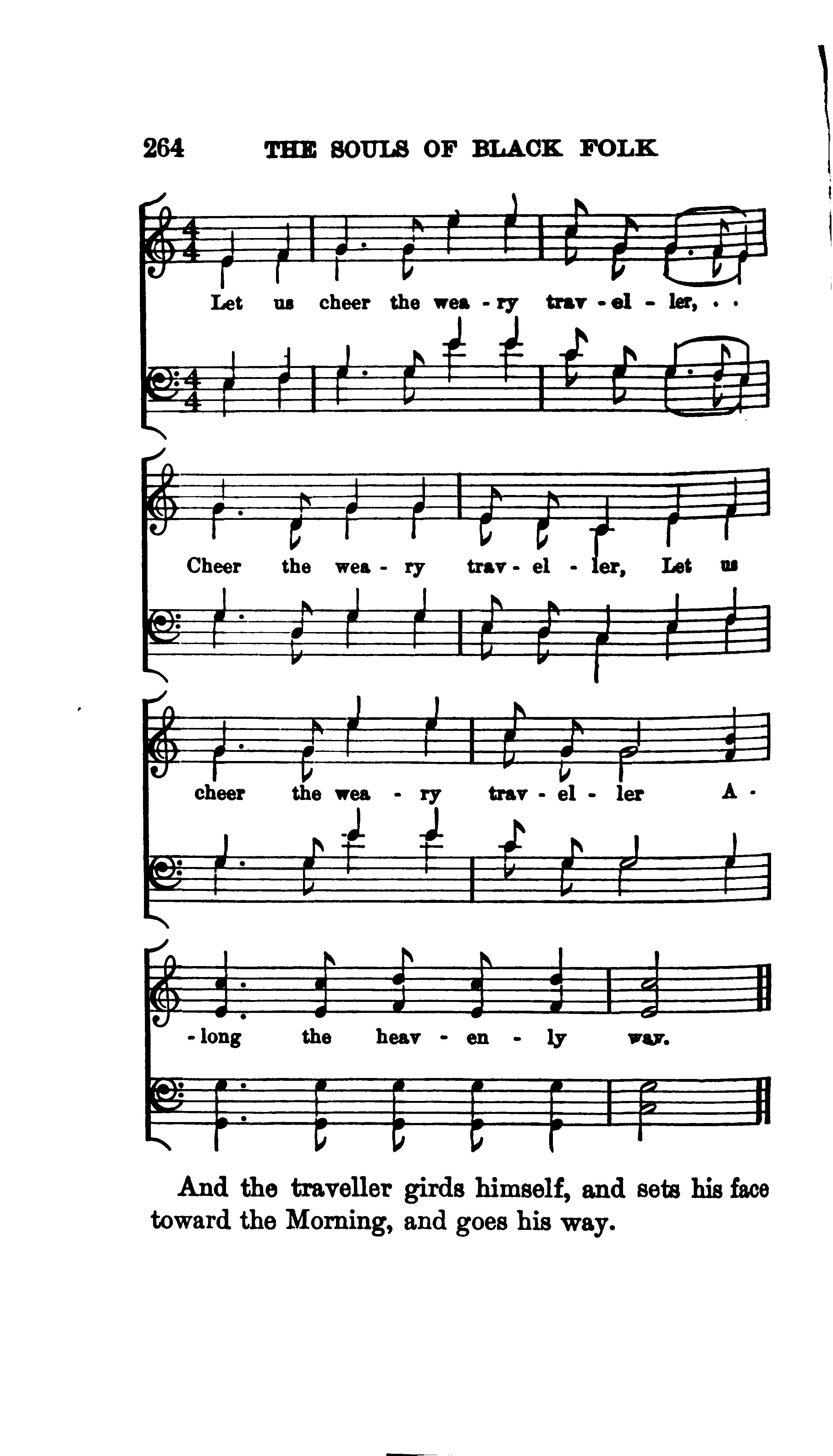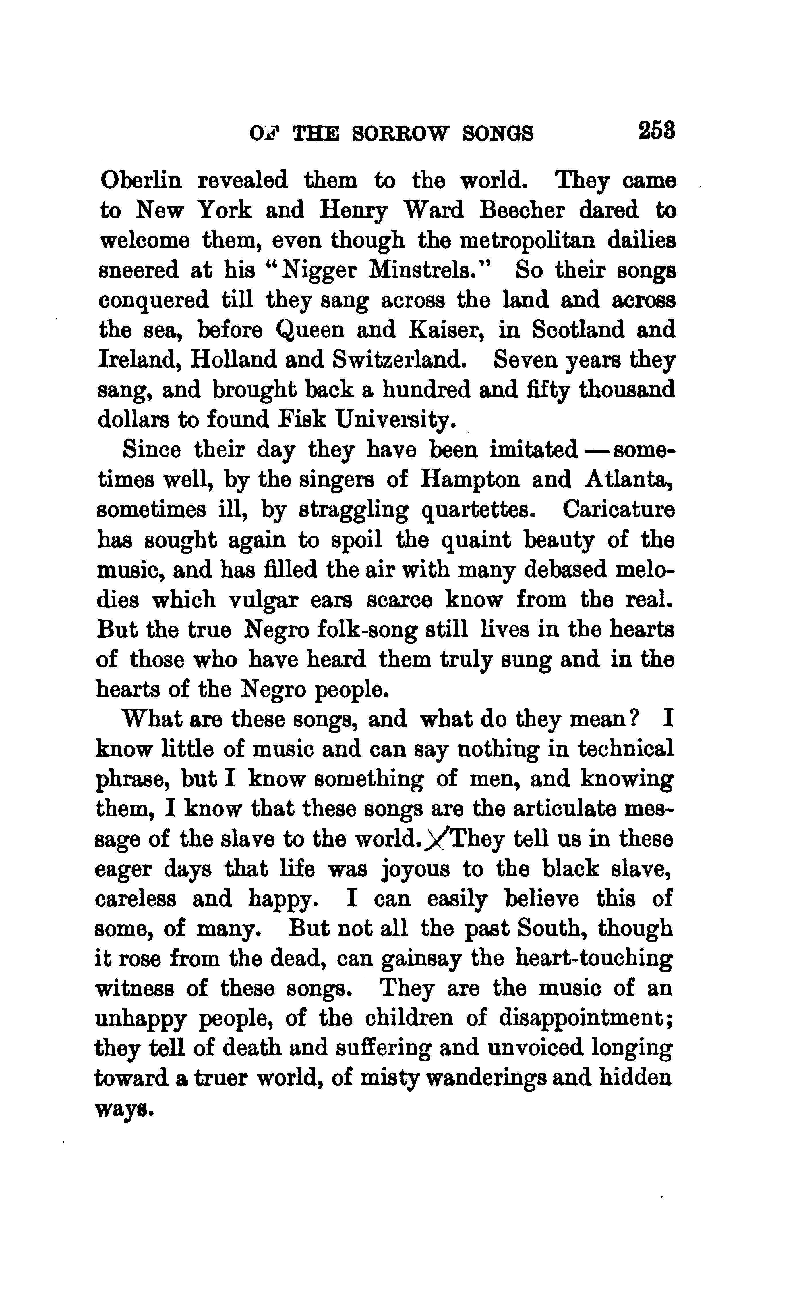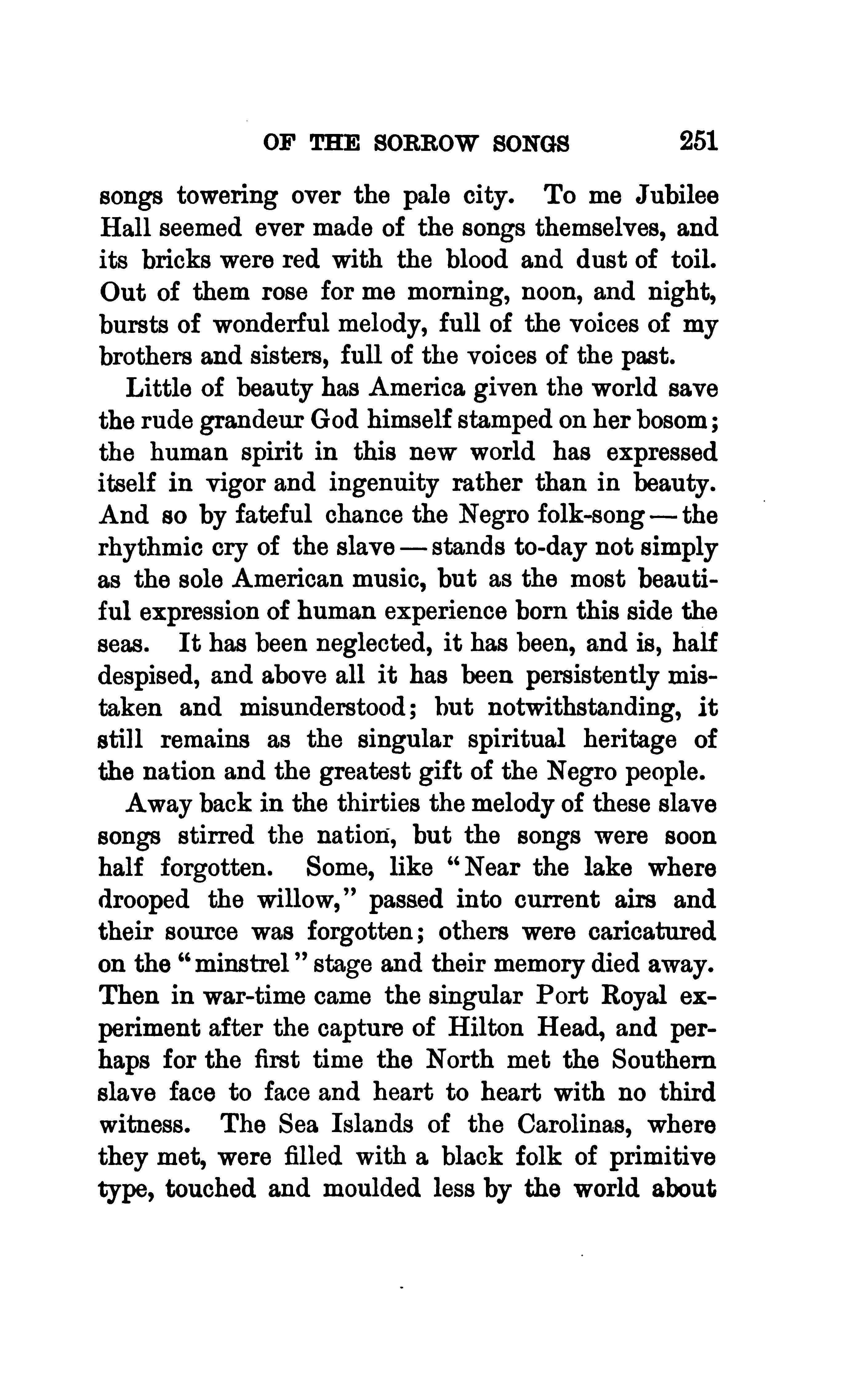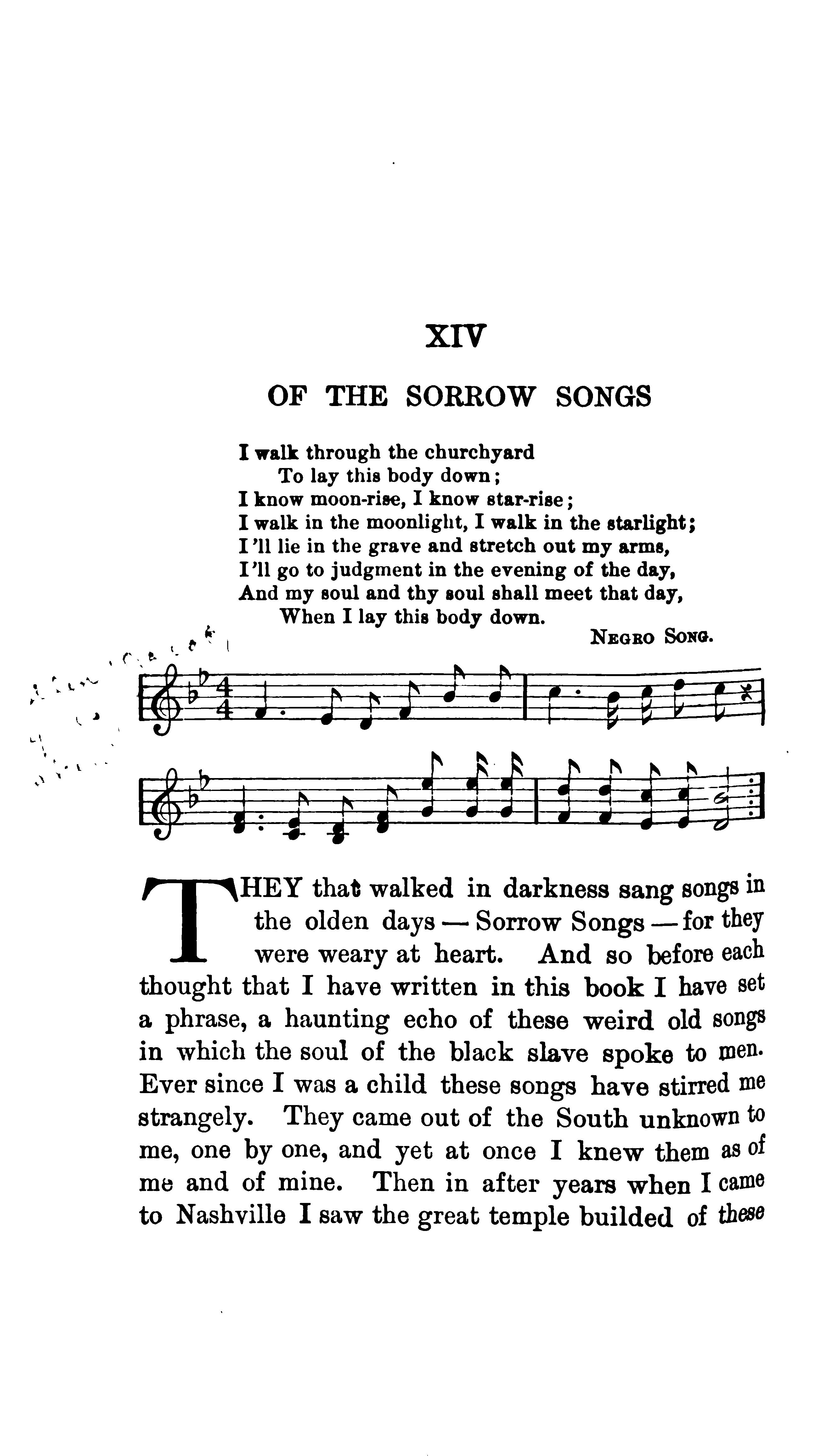 HEY that walked in darkness sang songs the olden days - Sorrow Songs - for they were weary at heart. And so before each thought that I have written in this book I have set a phrase, a haunting echo of these weird old songs in which the soul of the black slave spoke to men. Ever since I was a child these songs have stirred me strangely. They came out of the South unknown to me, one by one, and yet at once I knew them as of me and of mine. Then in after years when I came to Nashville I saw the great temple builded of these