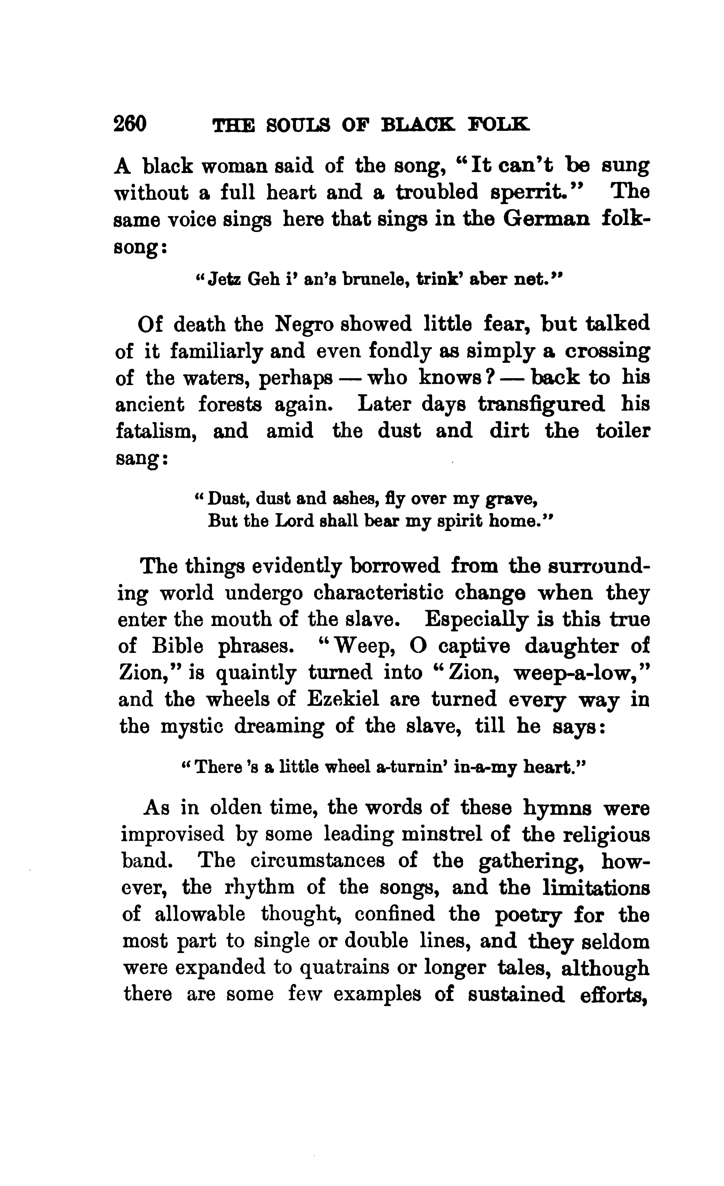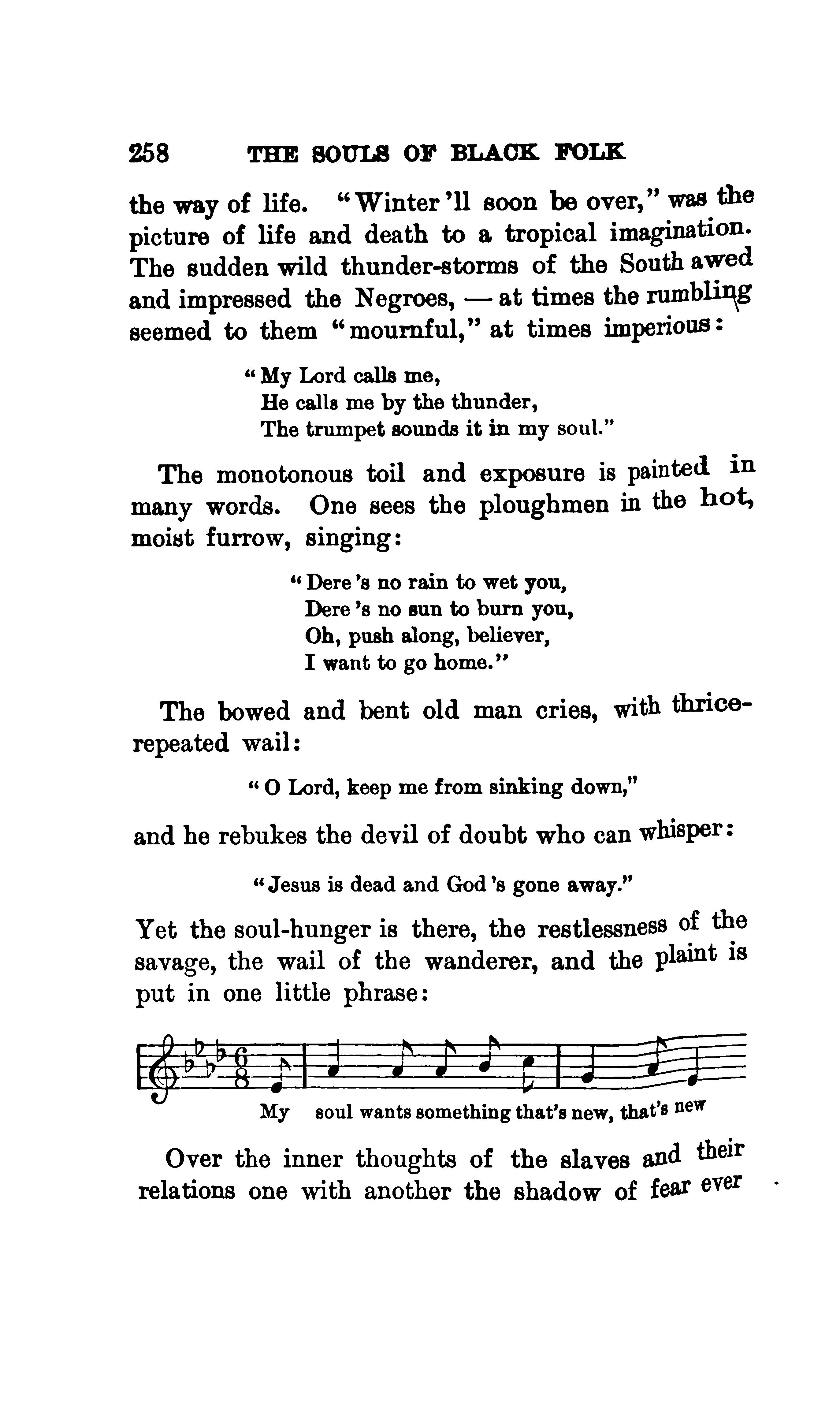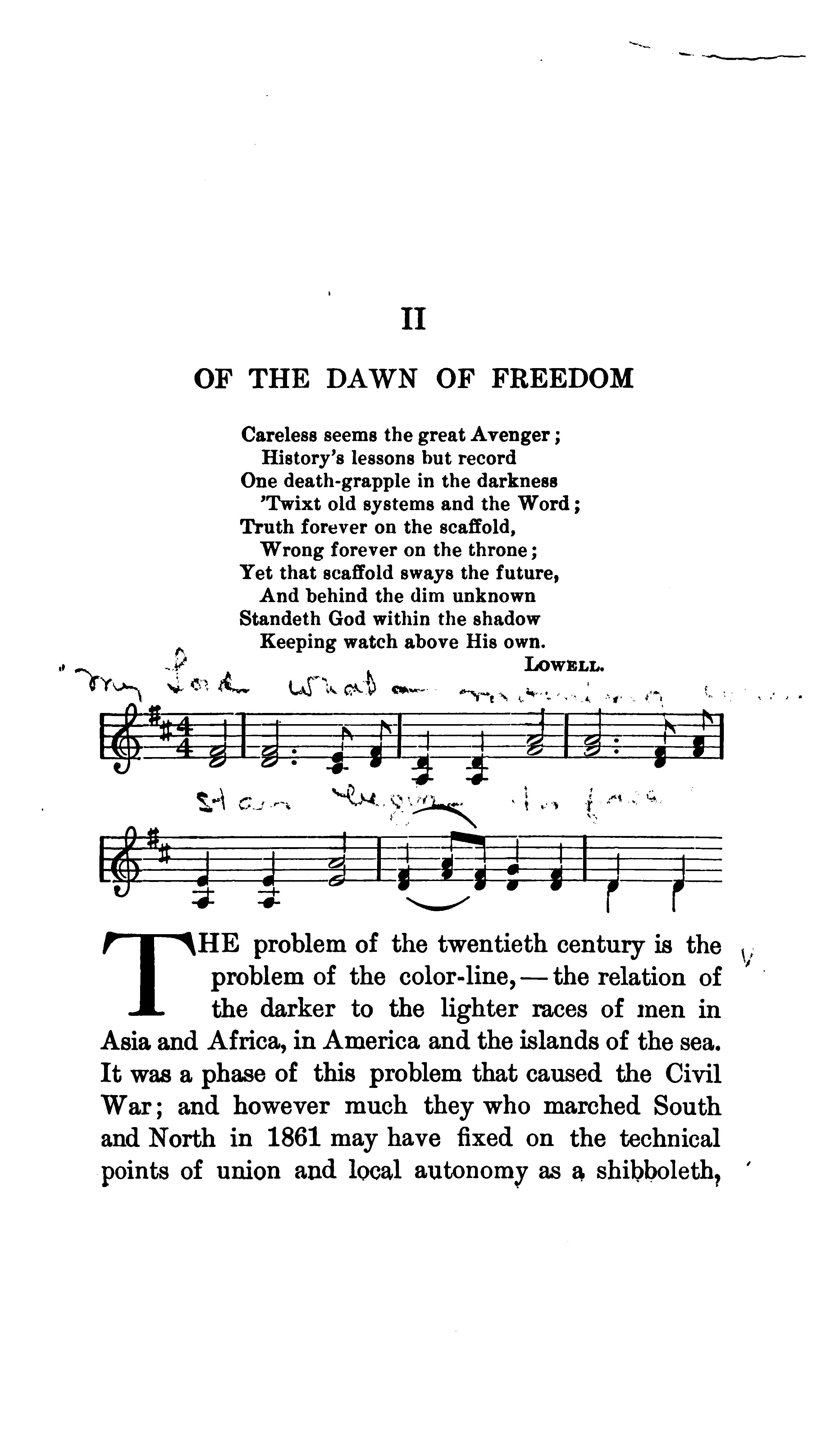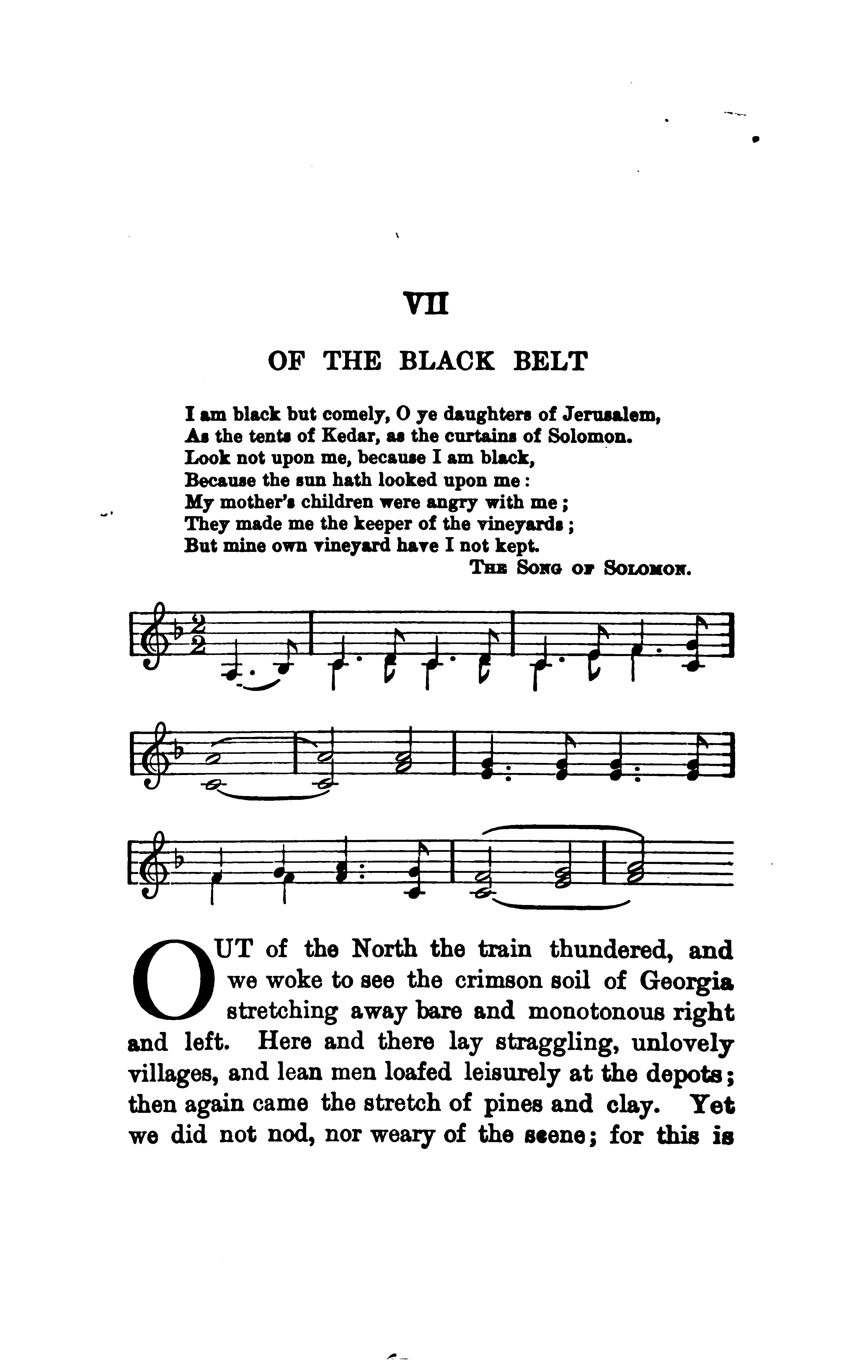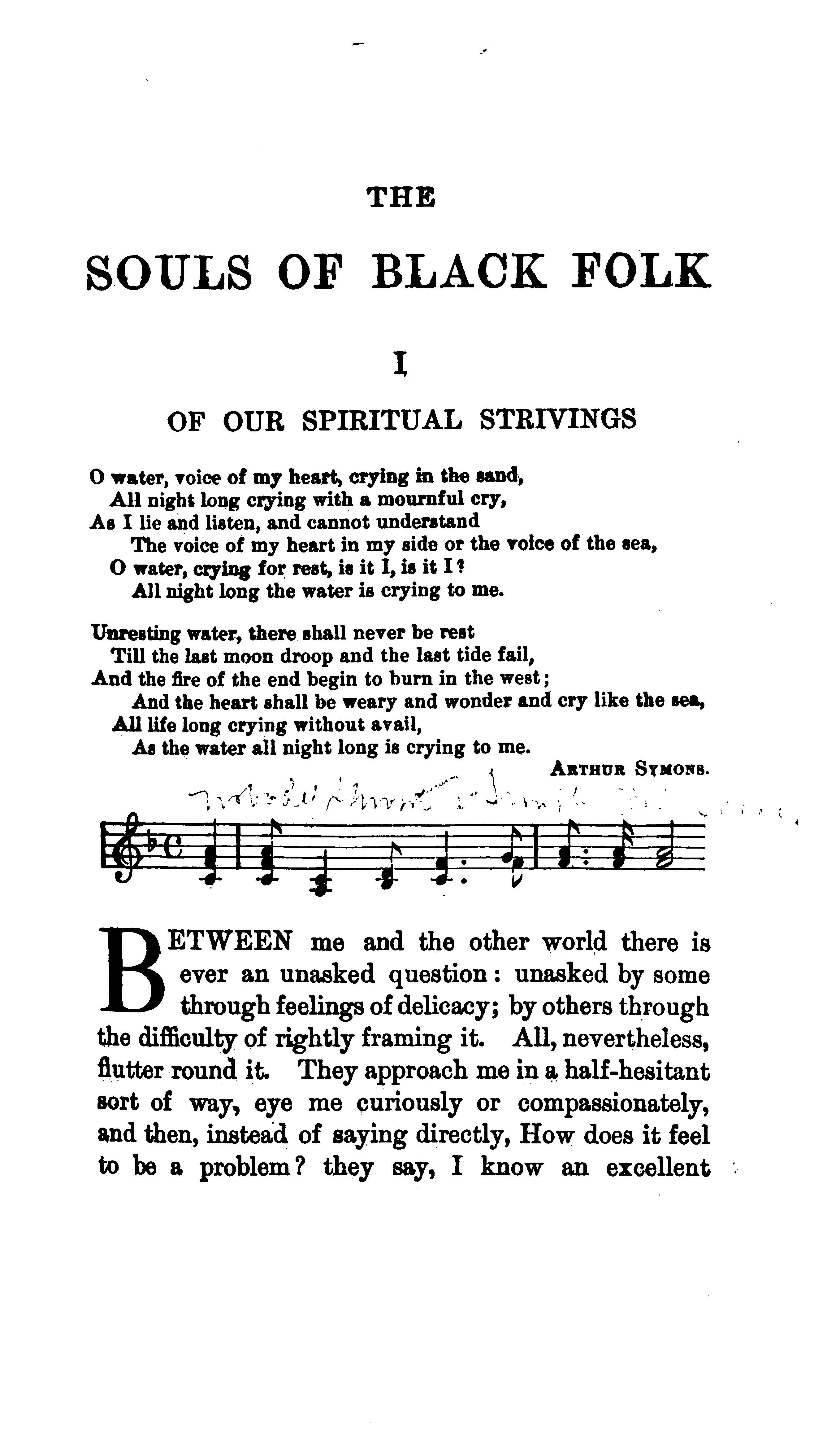 HEY that walked in darkness sang songs the olden days - Sorrow Songs - for they were weary at heart. And so before each thought that I have written in this book I have set a phrase, a haunting echo of these weird old songs in which the soul of the black slave spoke to men. Ever since I was a child these songs have stirred me strangely. They came out of the South unknown to me, one by one, and yet at once I knew them as of me and of mine. Then in after years when I came to Nashville I saw the great temple builded of these