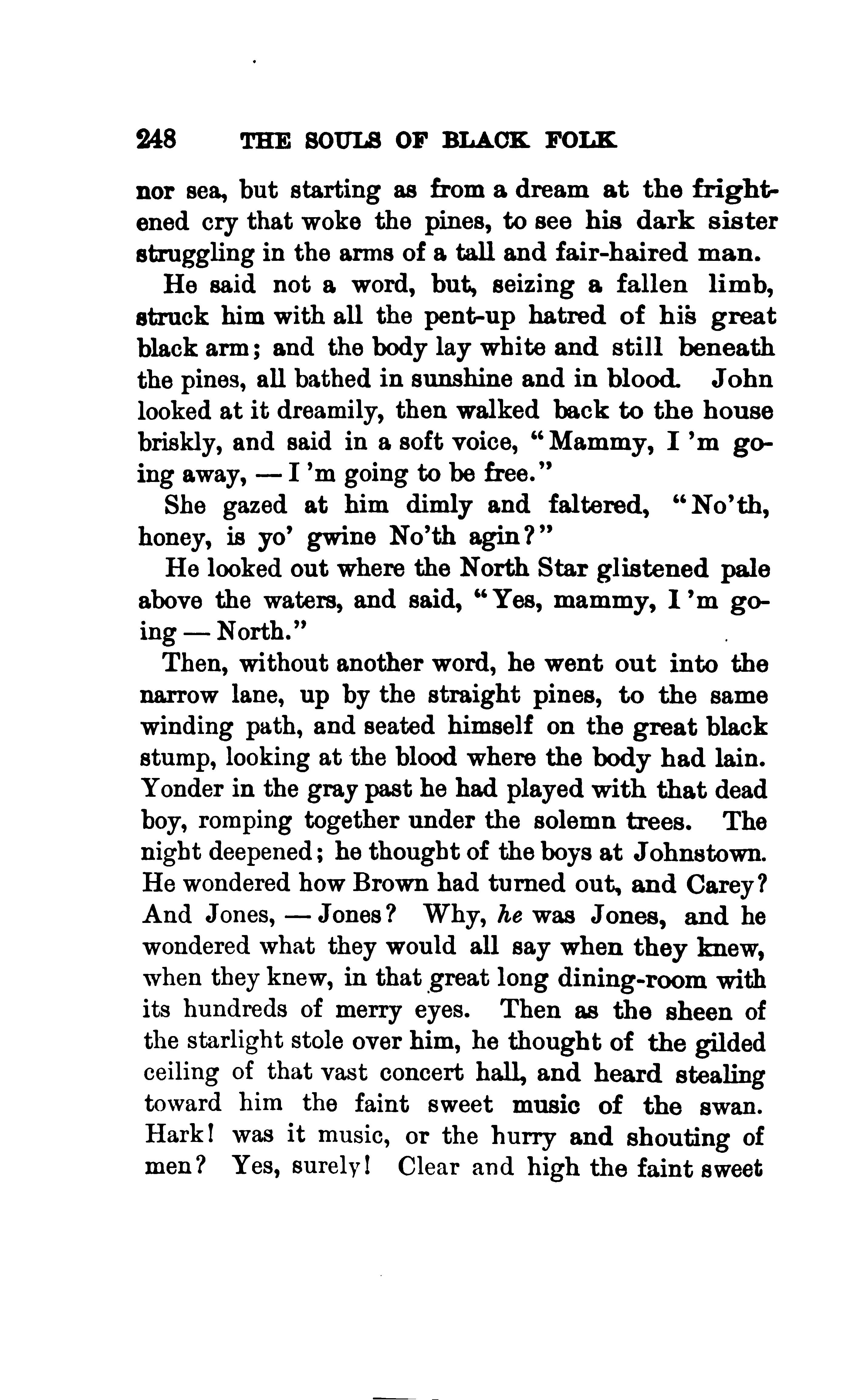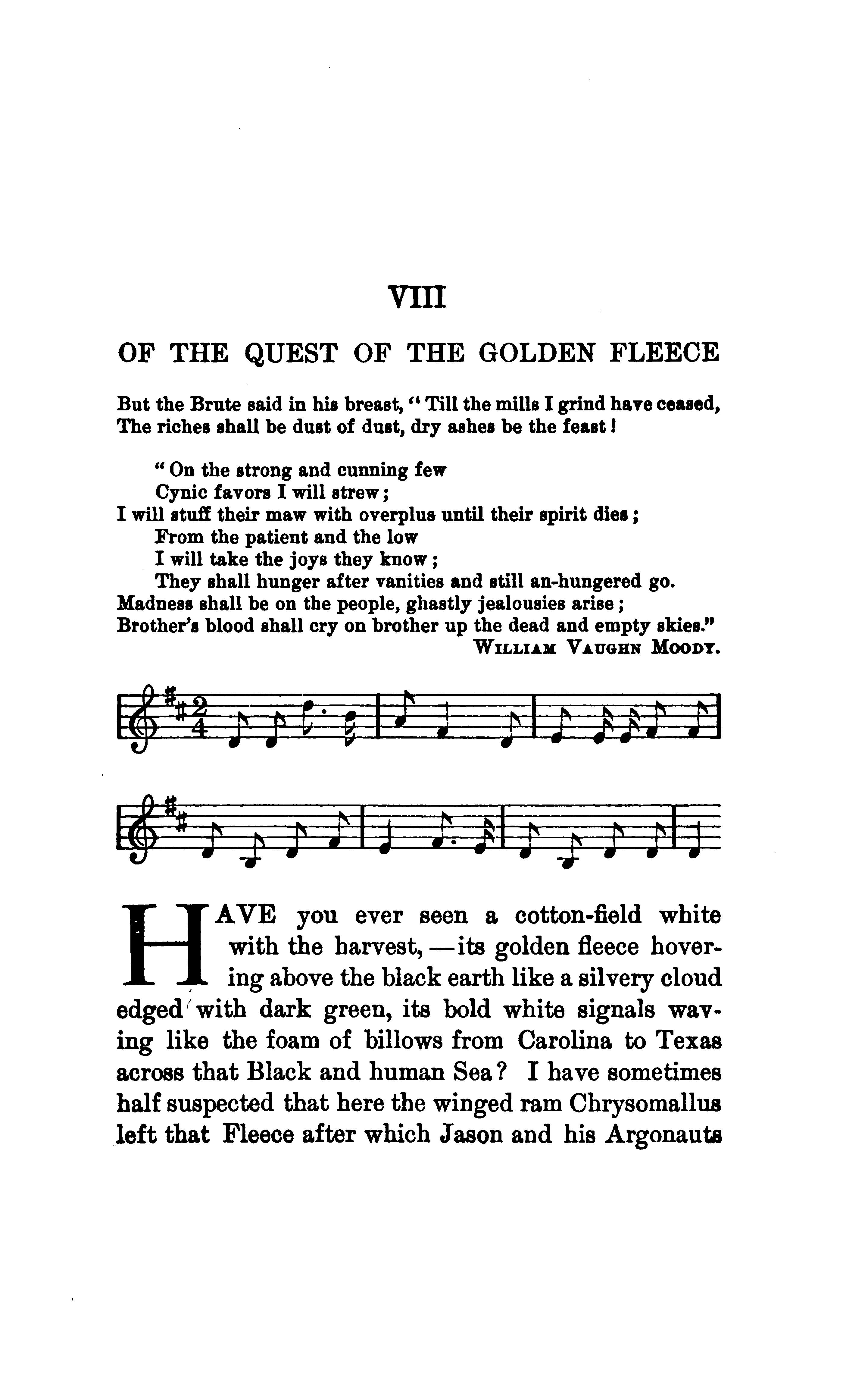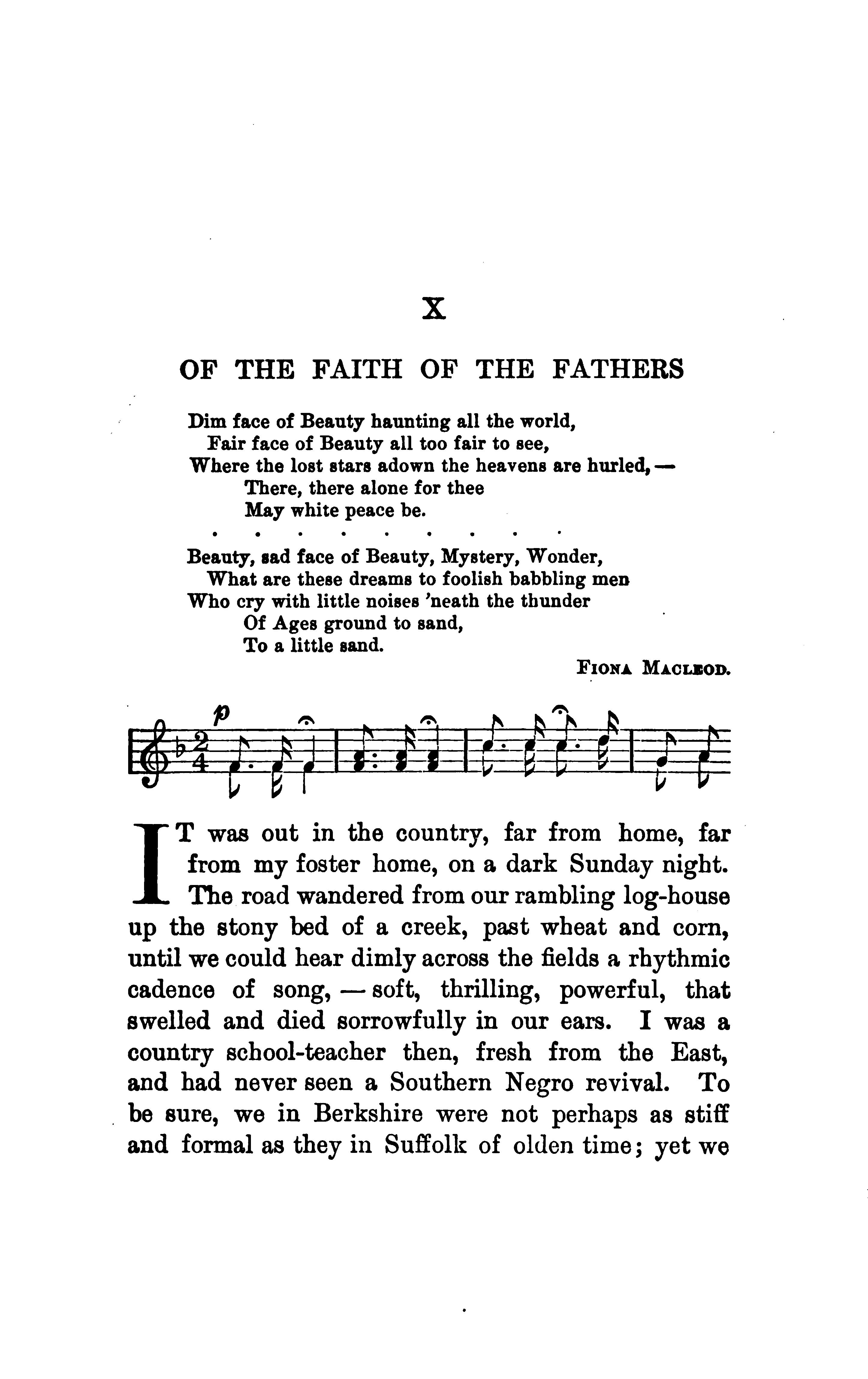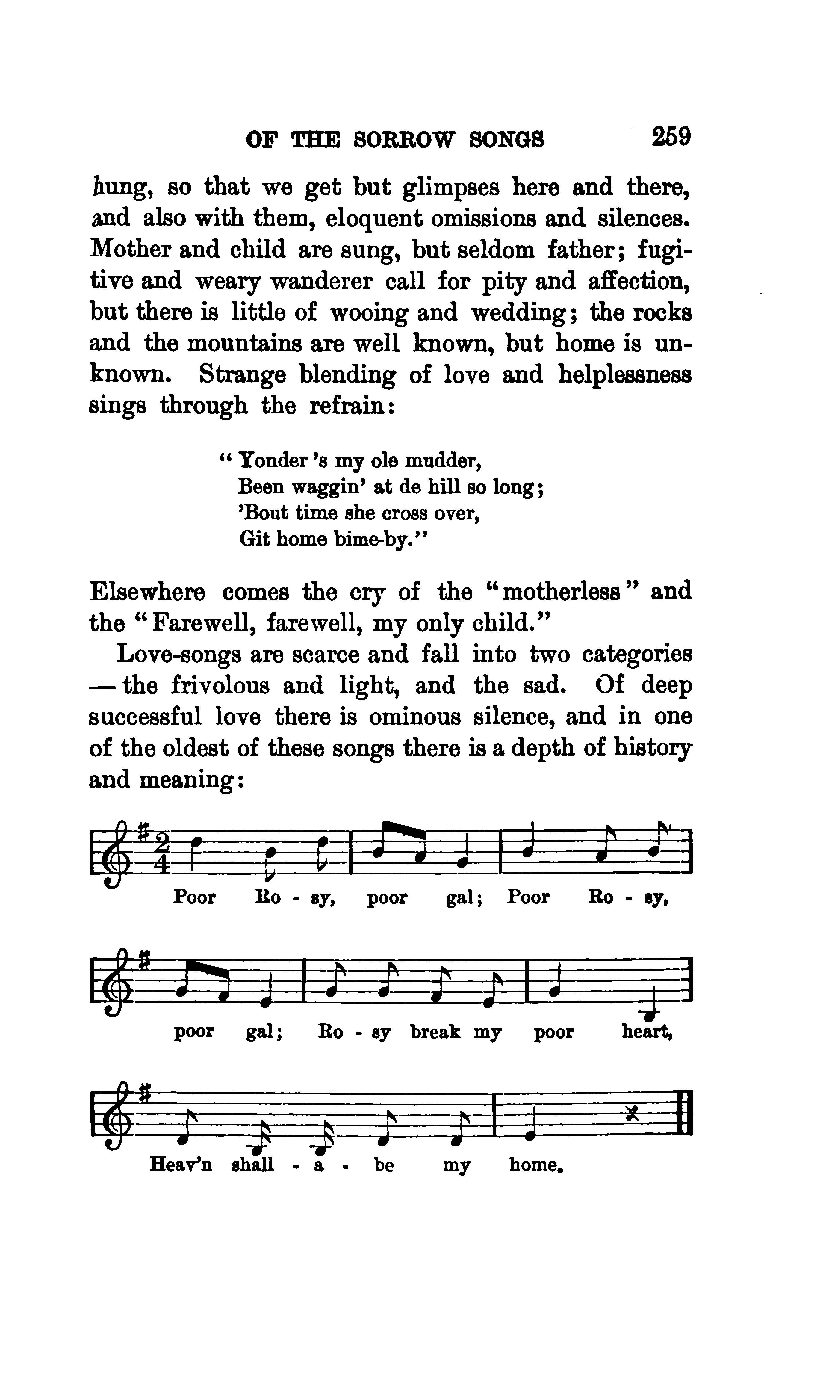 HEY that walked in darkness sang songs the olden days - Sorrow Songs - for they were weary at heart. And so before each thought that I have written in this book I have set a phrase, a haunting echo of these weird old songs in which the soul of the black slave spoke to men. Ever since I was a child these songs have stirred me strangely. They came out of the South unknown to me, one by one, and yet at once I knew them as of me and of mine. Then in after years when I came to Nashville I saw the great temple builded of these