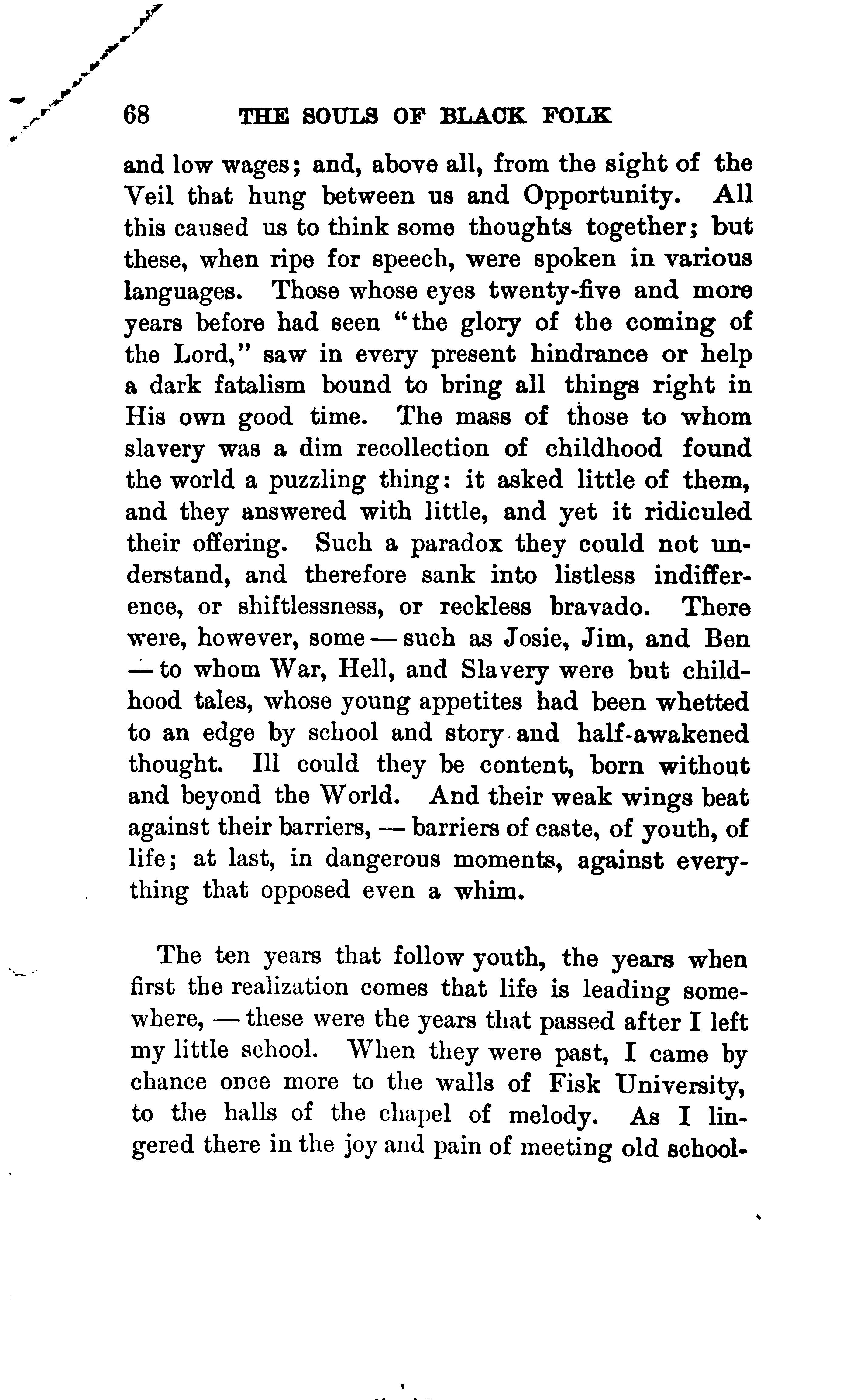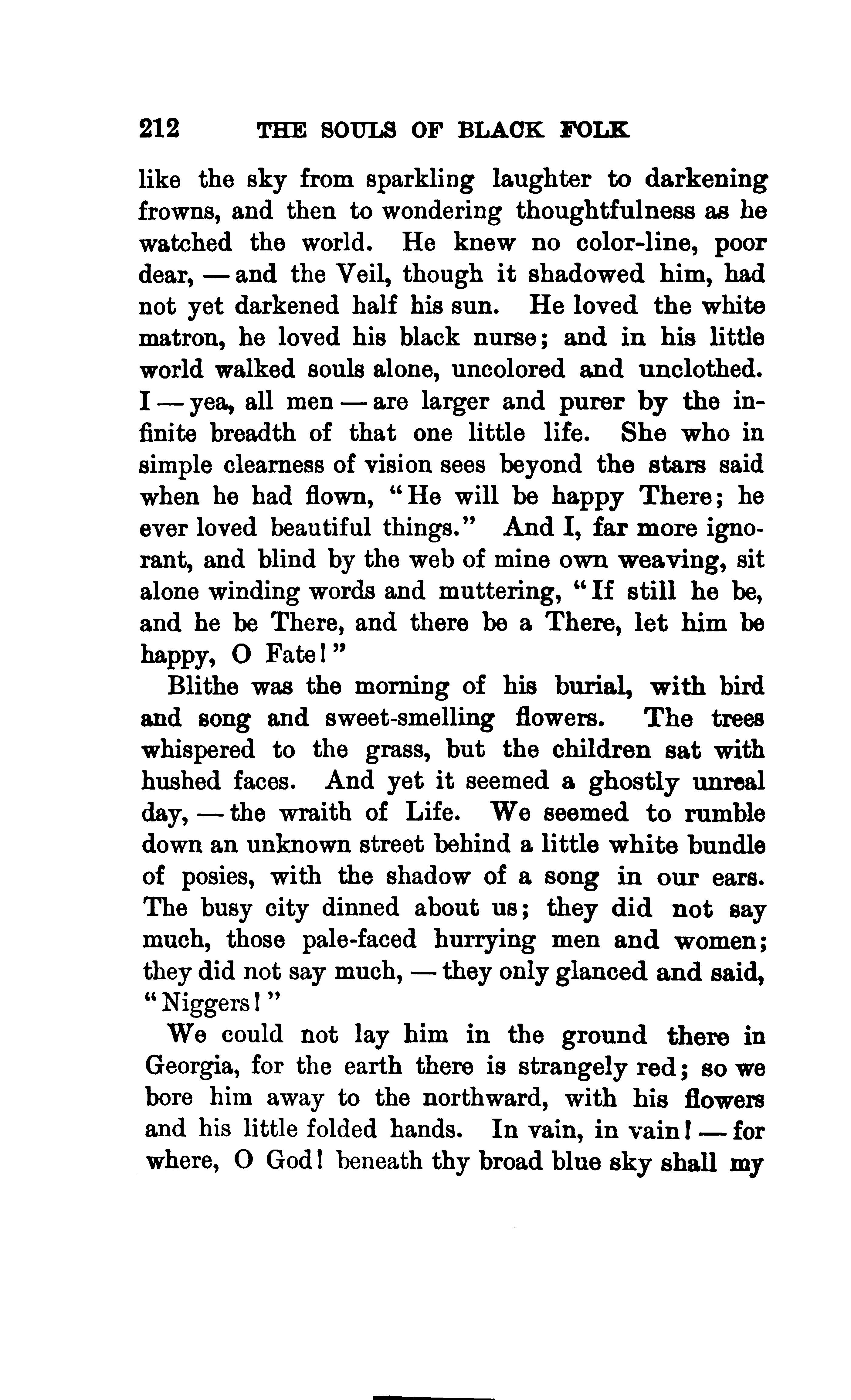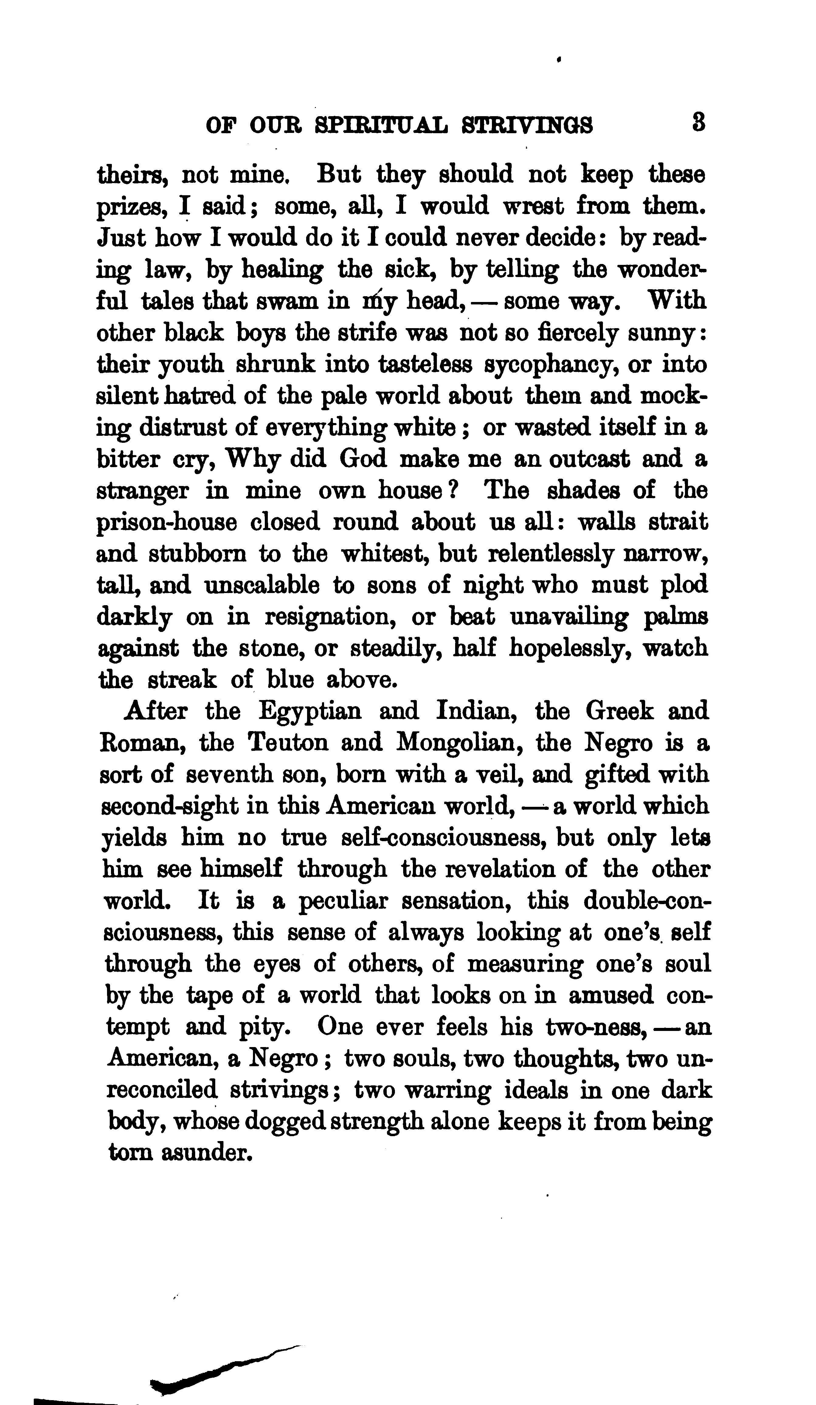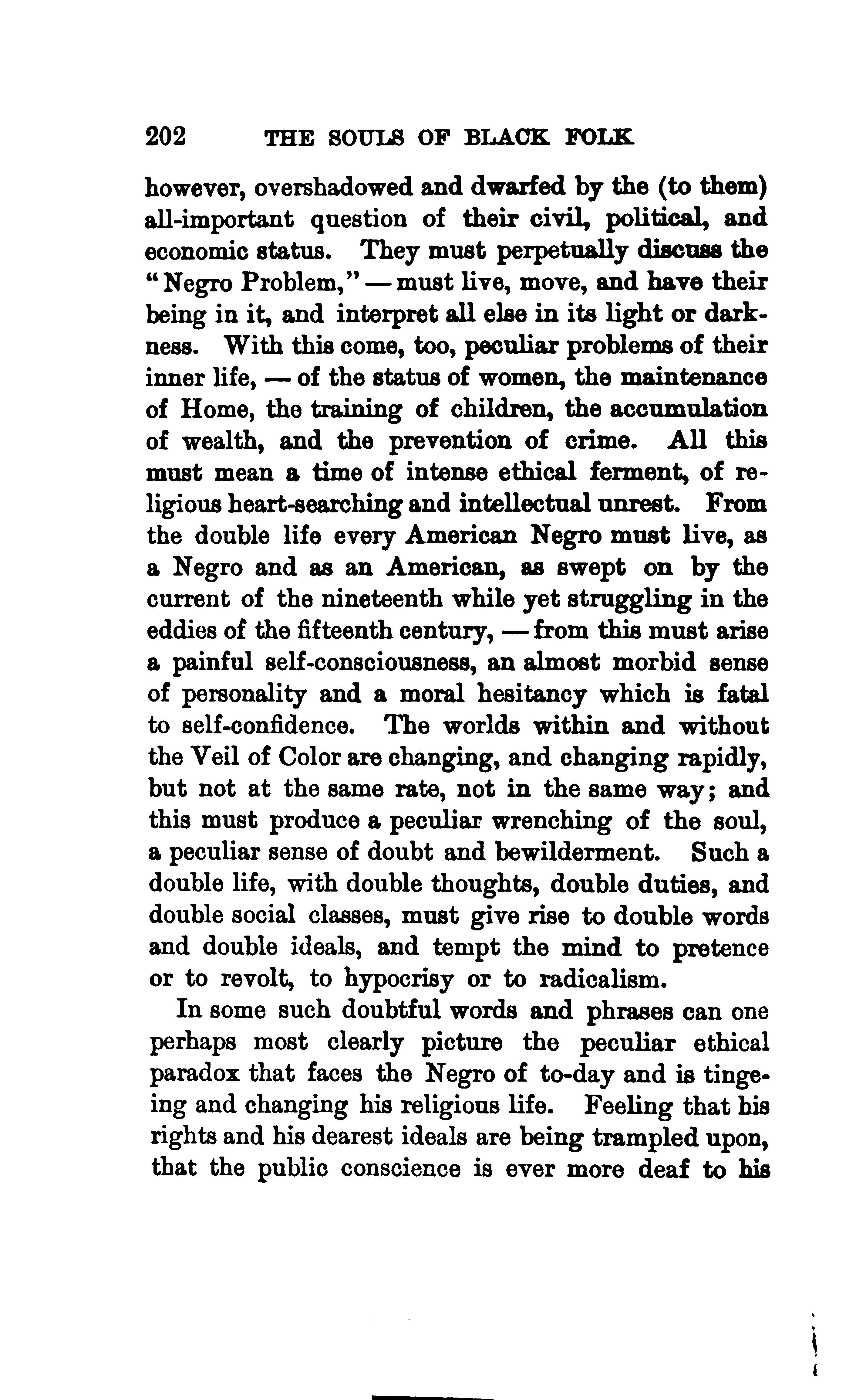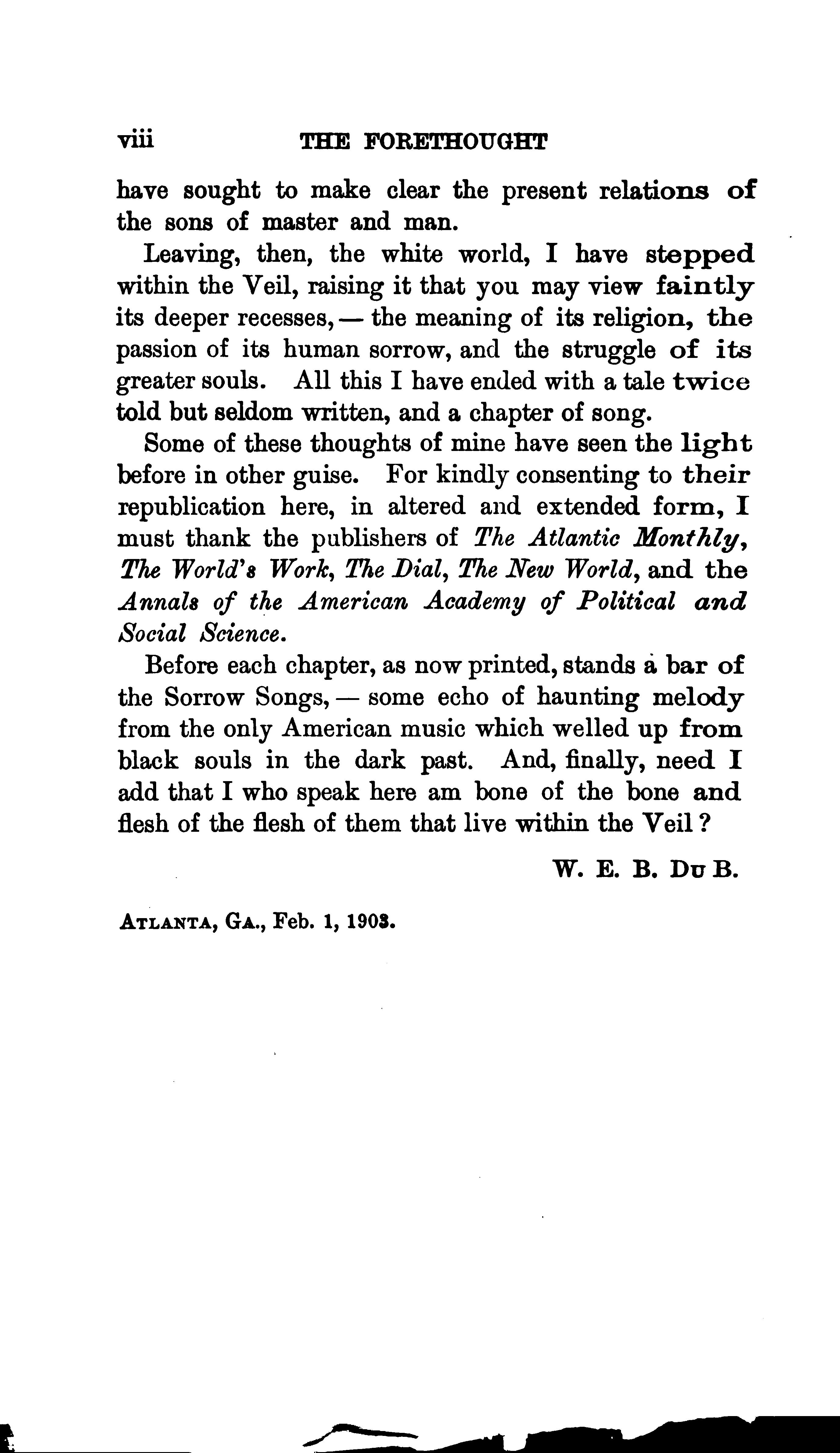 Leaving, then, the white world, I have stepped within the Veil, raising it that you may view faintly its deeper recesses, the meaning of its religion, the passion of its human sorrow, and the struggle of its greatersouls. All this I have ended with a tale twice told but seldom written, and a chapter of song.