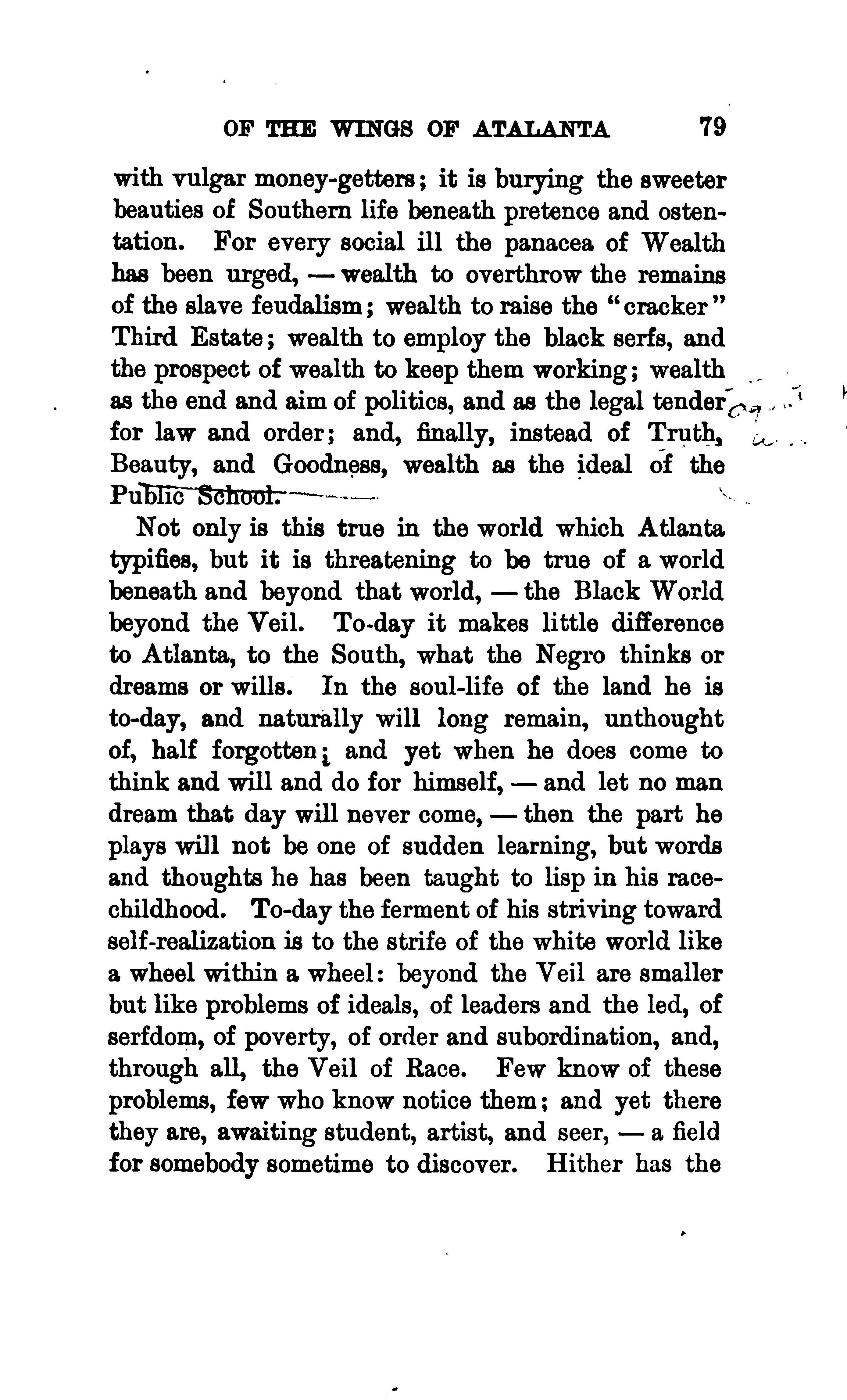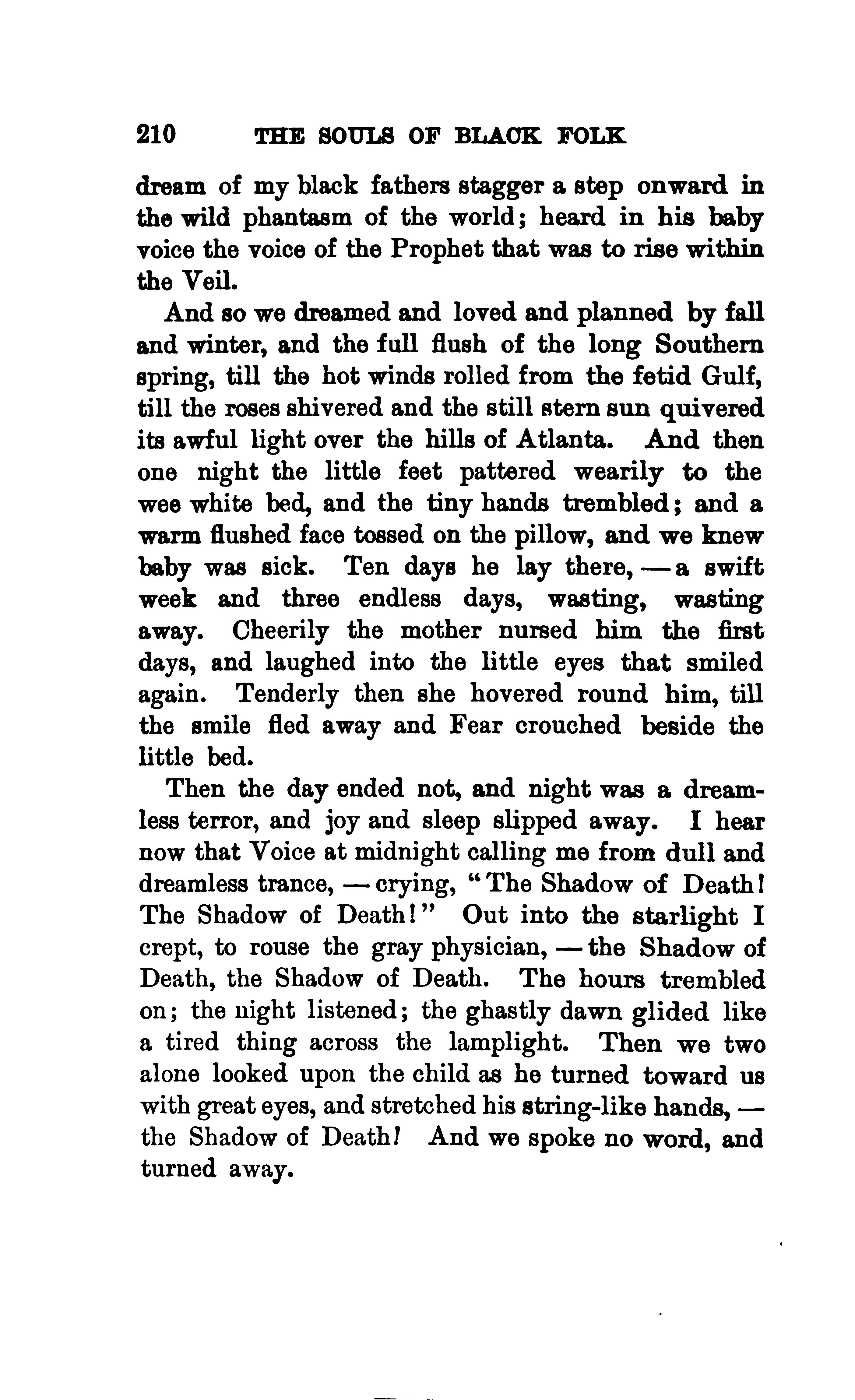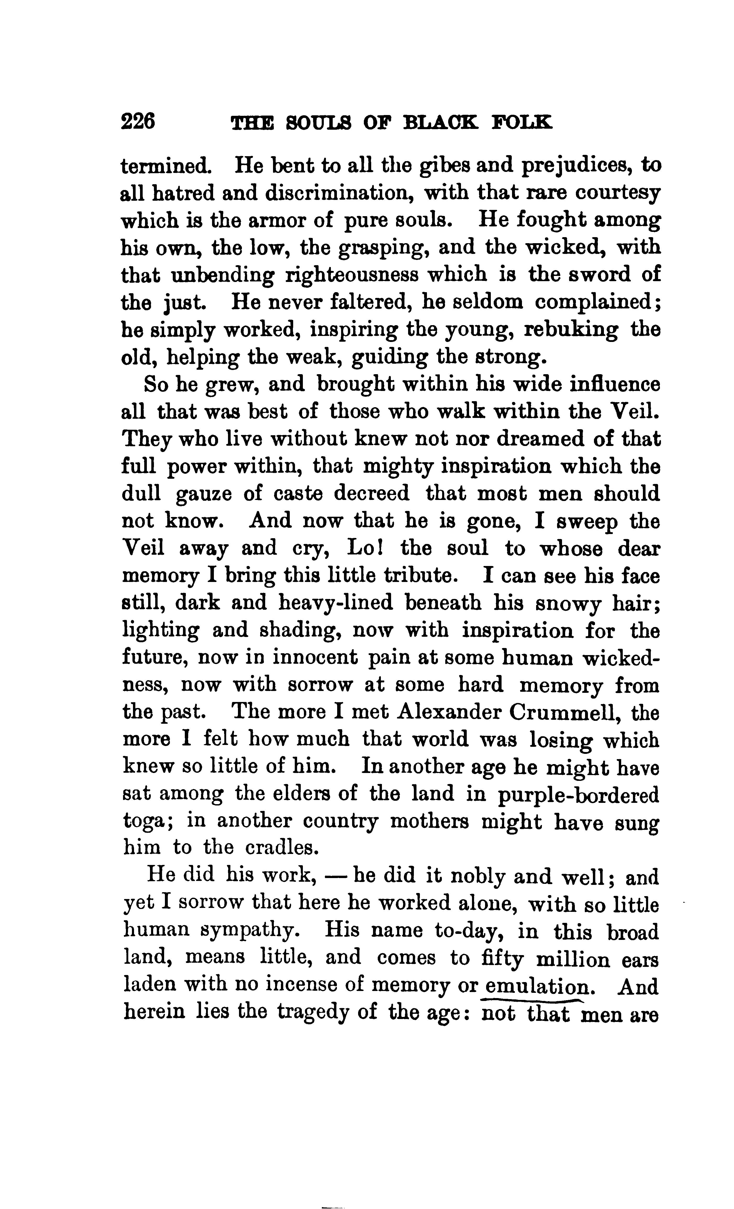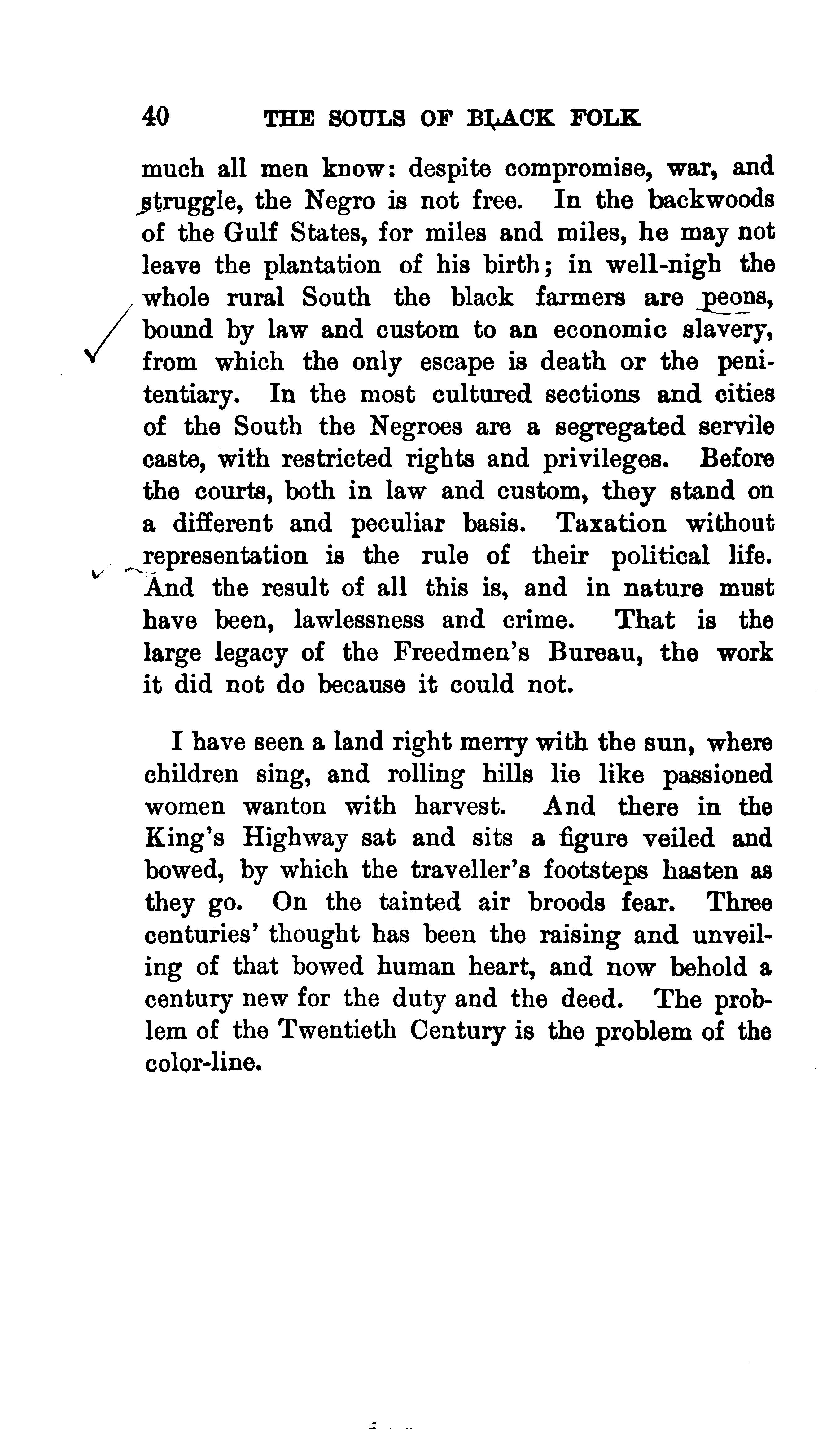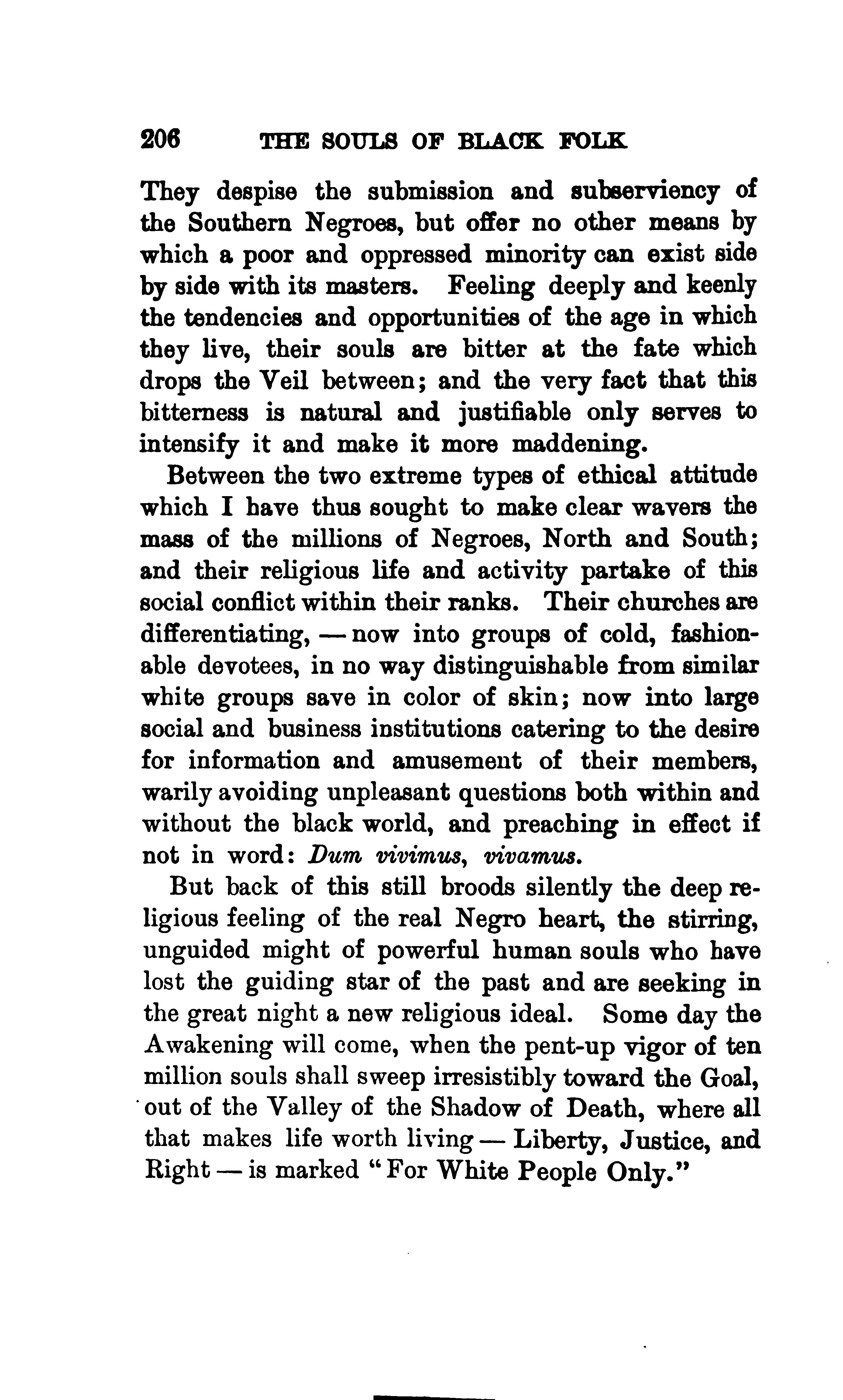 Leaving, then, the white world, I have stepped within the Veil, raising it that you may view faintly its deeper recesses, the meaning of its religion, the passion of its human sorrow, and the struggle of its greatersouls. All this I have ended with a tale twice told but seldom written, and a chapter of song.