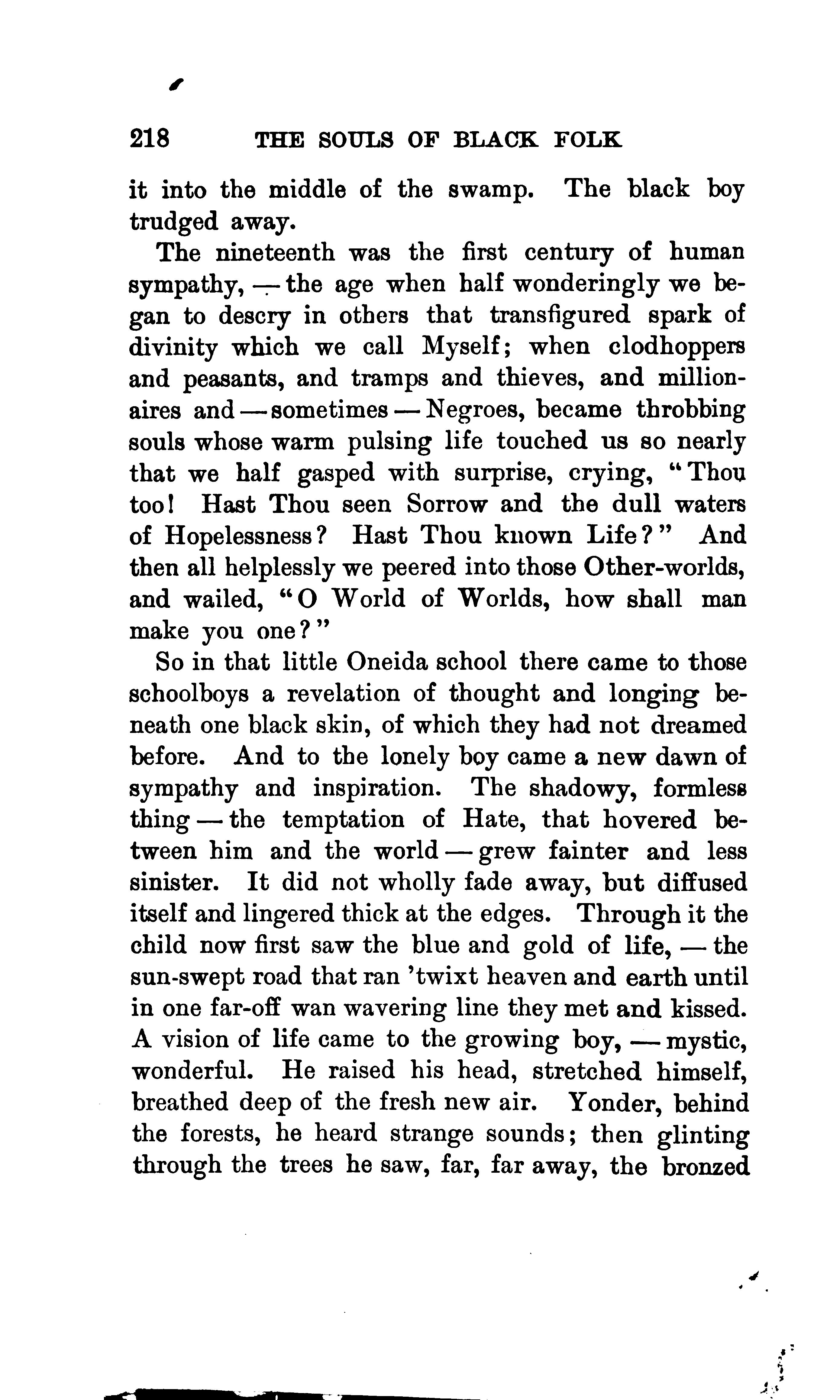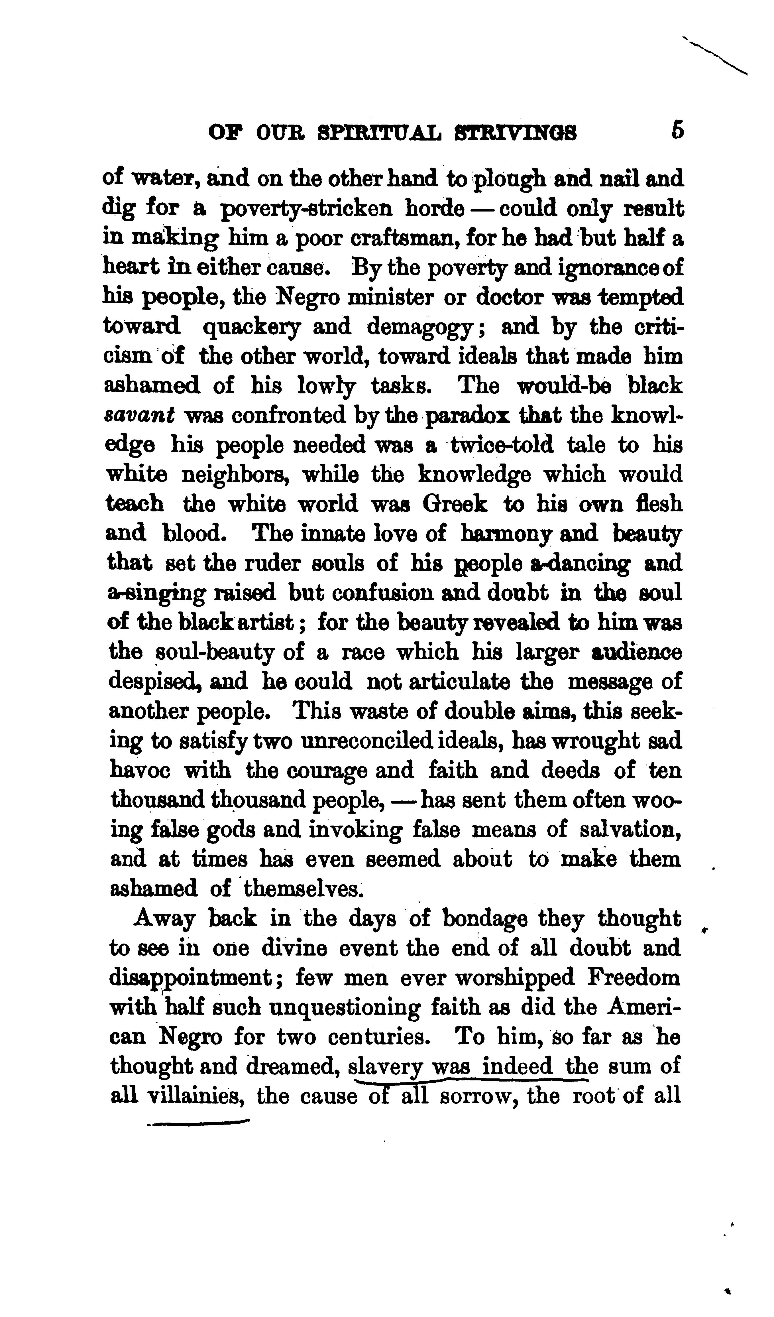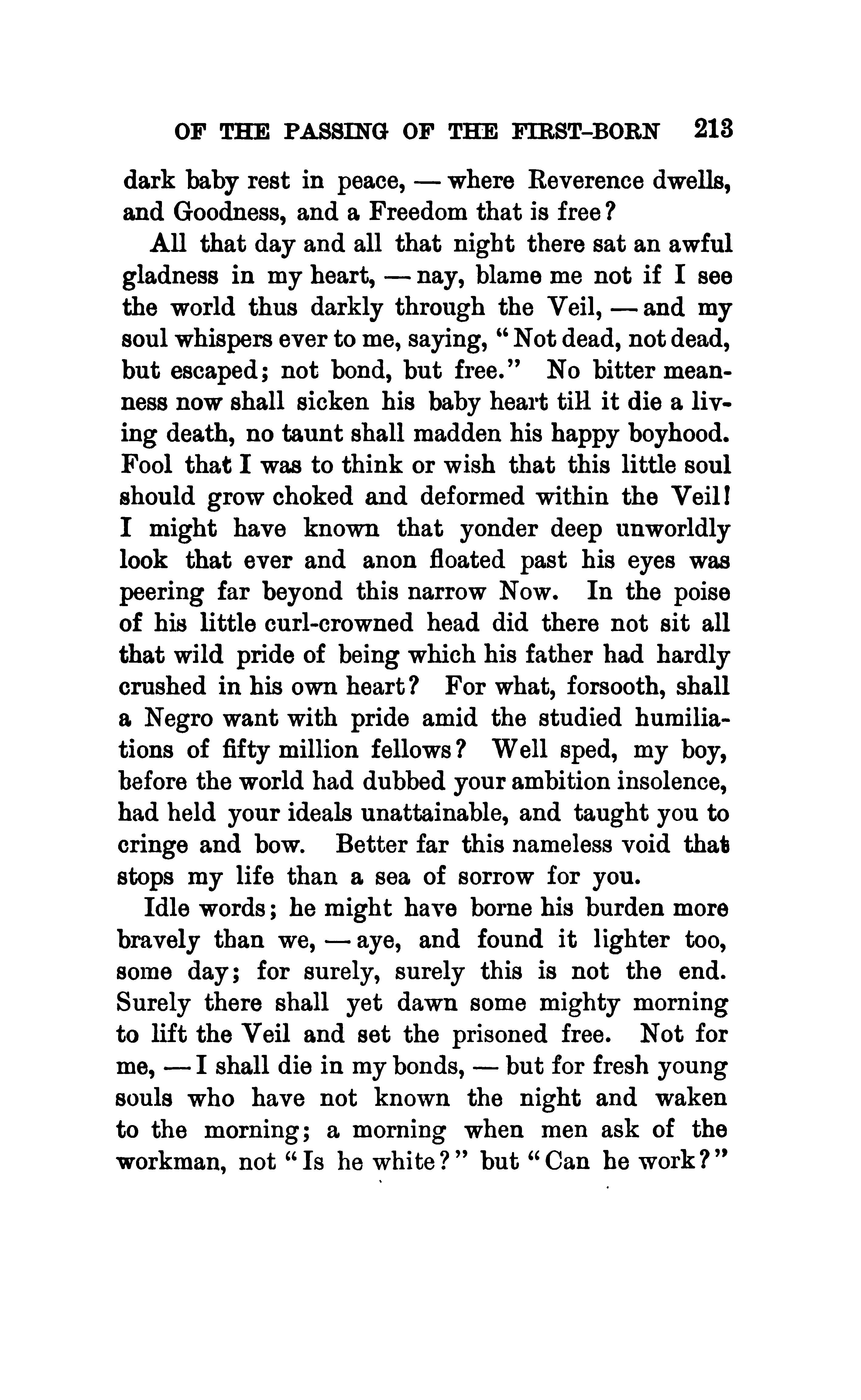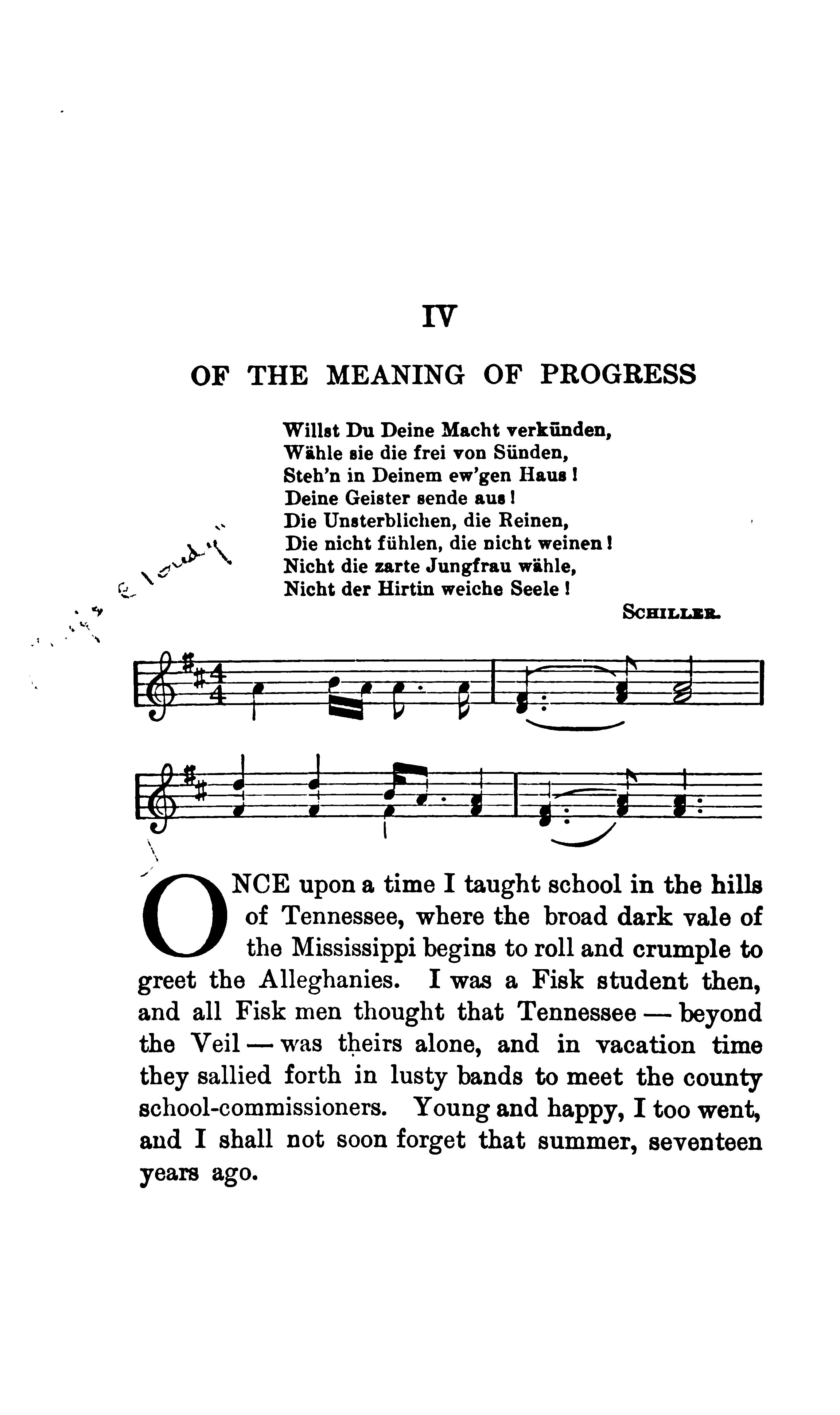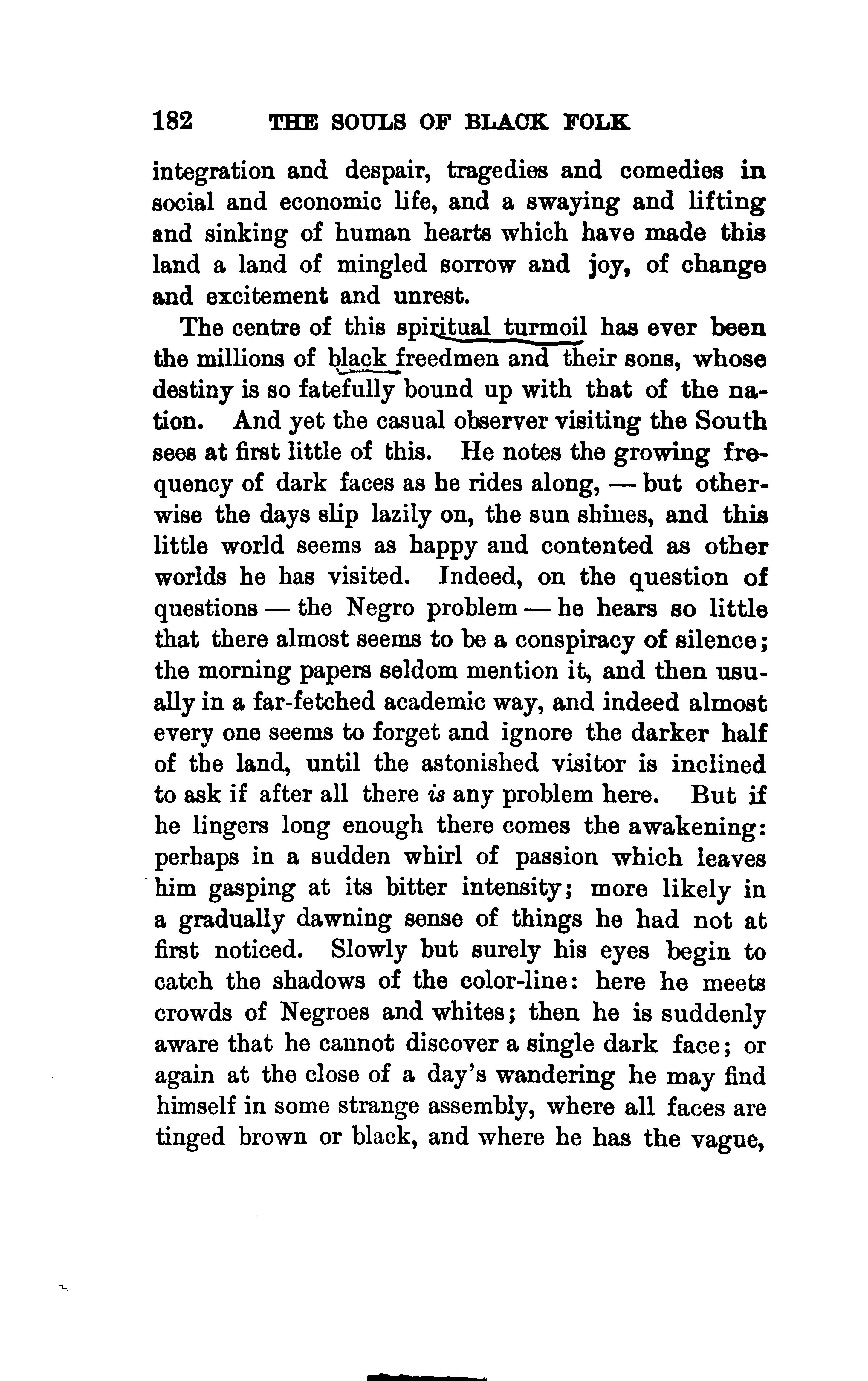 Leaving, then, the white world, I have stepped within the Veil, raising it that you may view faintly its deeper recesses, the meaning of its religion, the passion of its human sorrow, and the struggle of its greatersouls. All this I have ended with a tale twice told but seldom written, and a chapter of song.