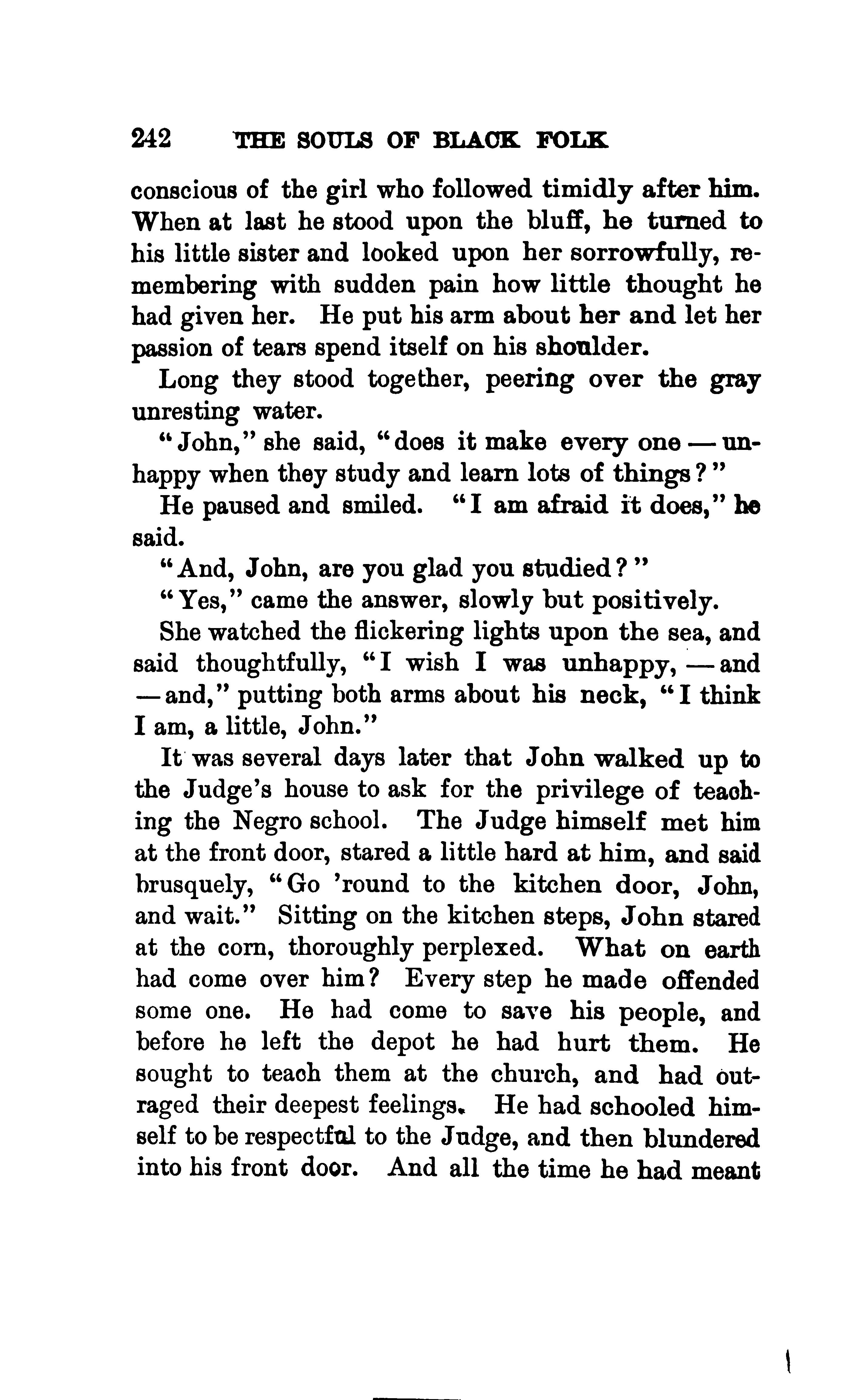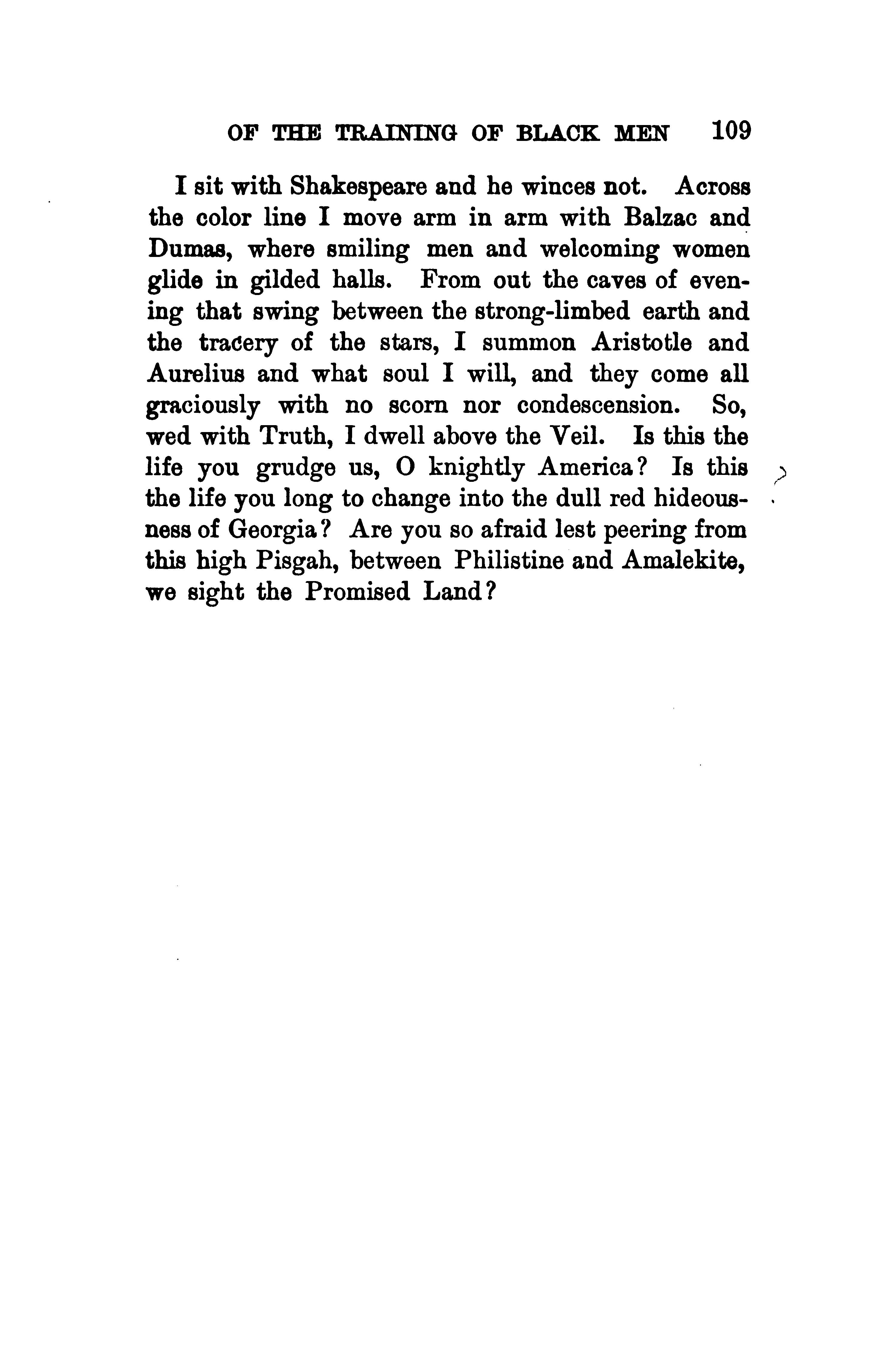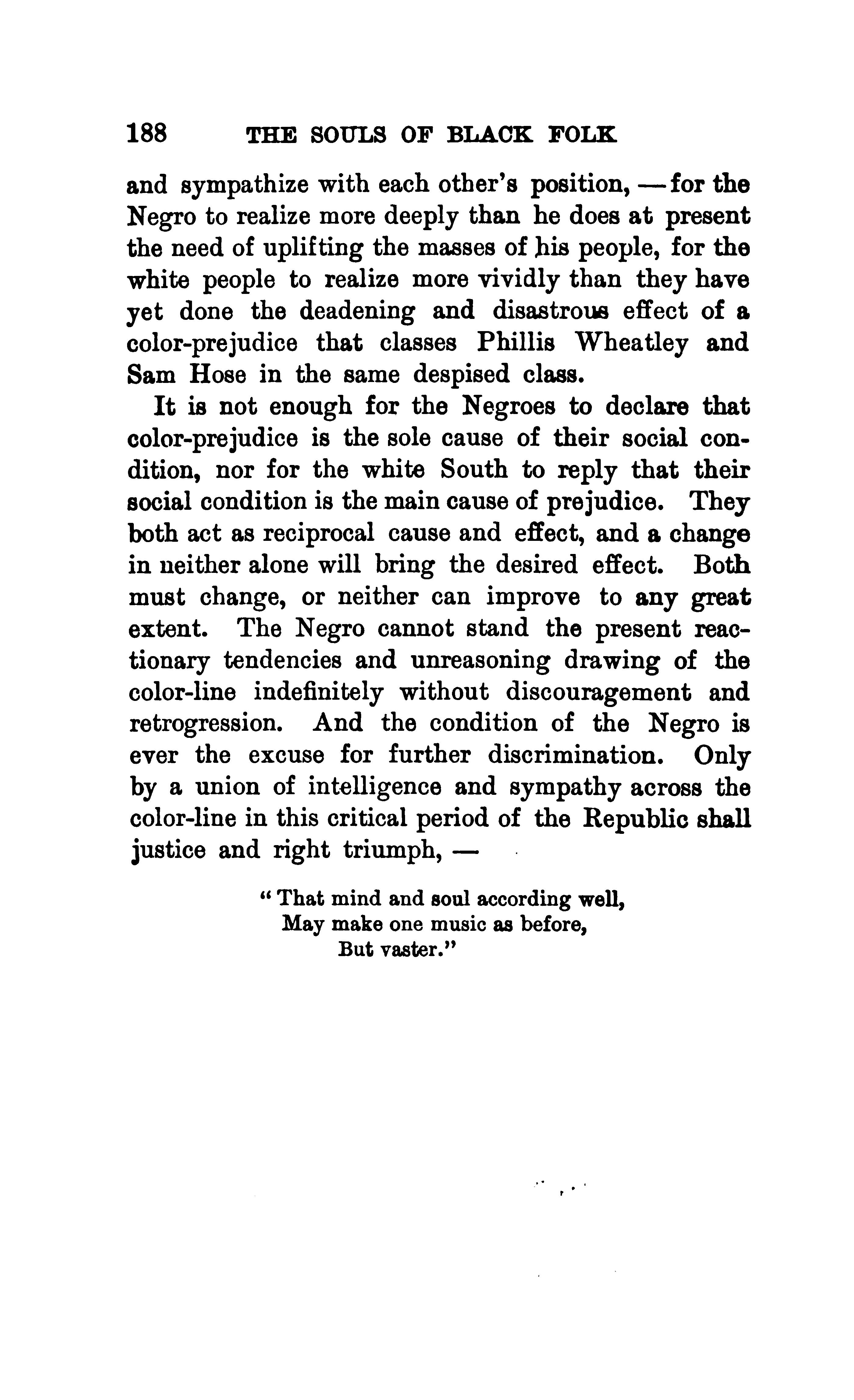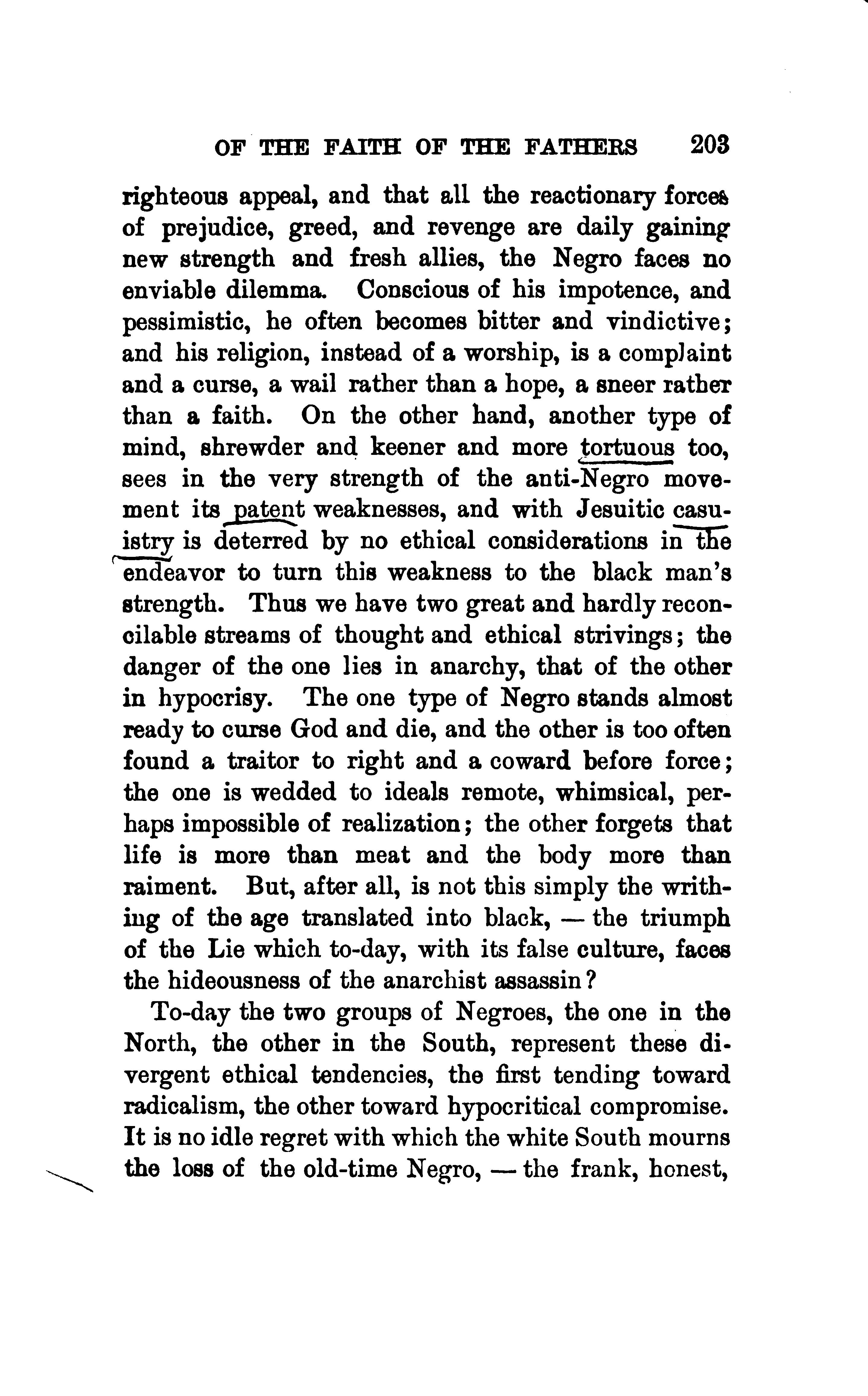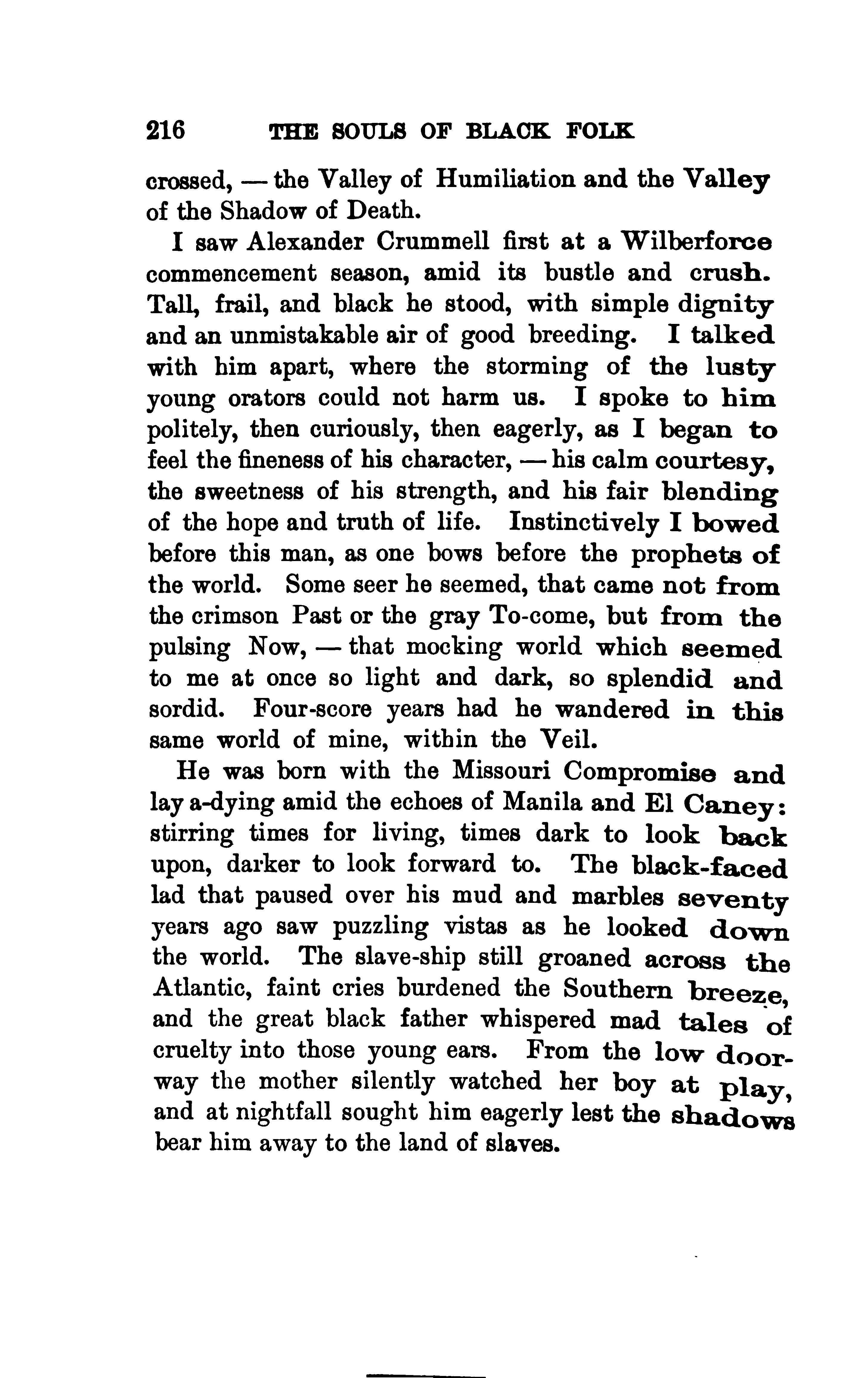 Leaving, then, the white world, I have stepped within the Veil, raising it that you may view faintly its deeper recesses, the meaning of its religion, the passion of its human sorrow, and the struggle of its greatersouls. All this I have ended with a tale twice told but seldom written, and a chapter of song.