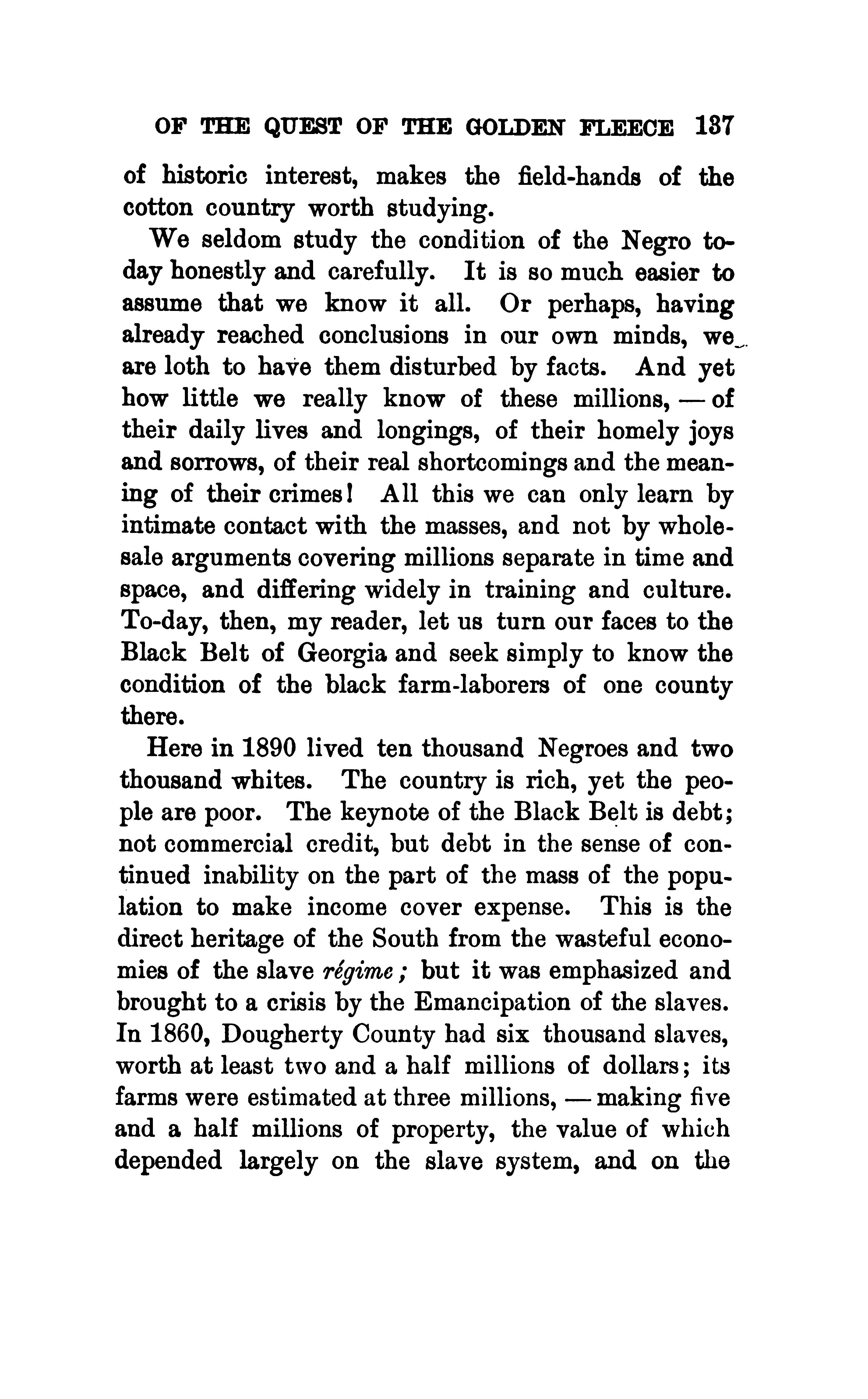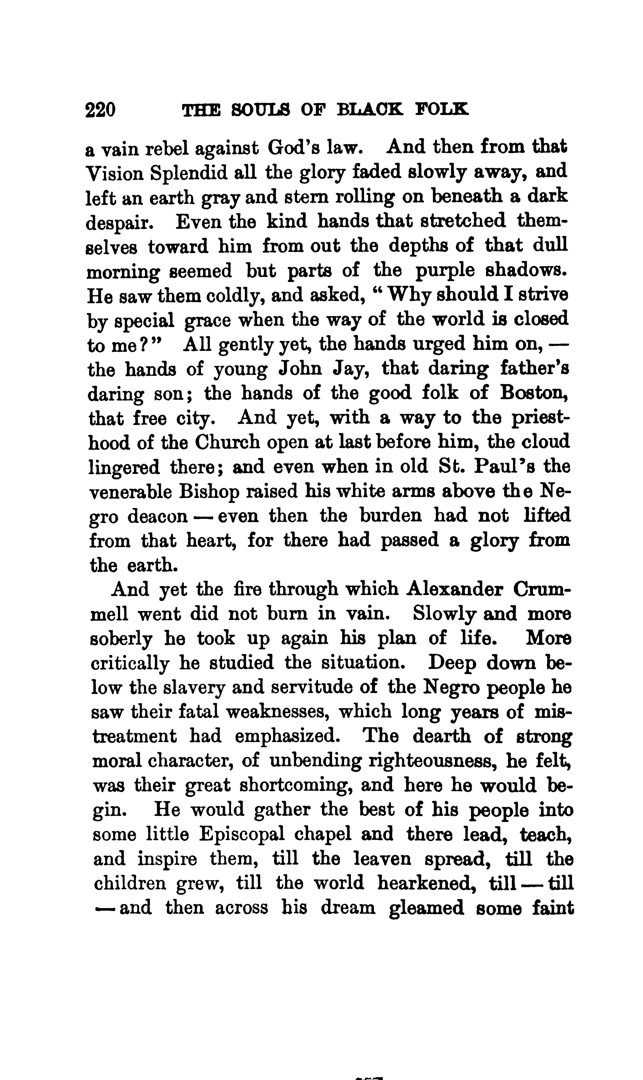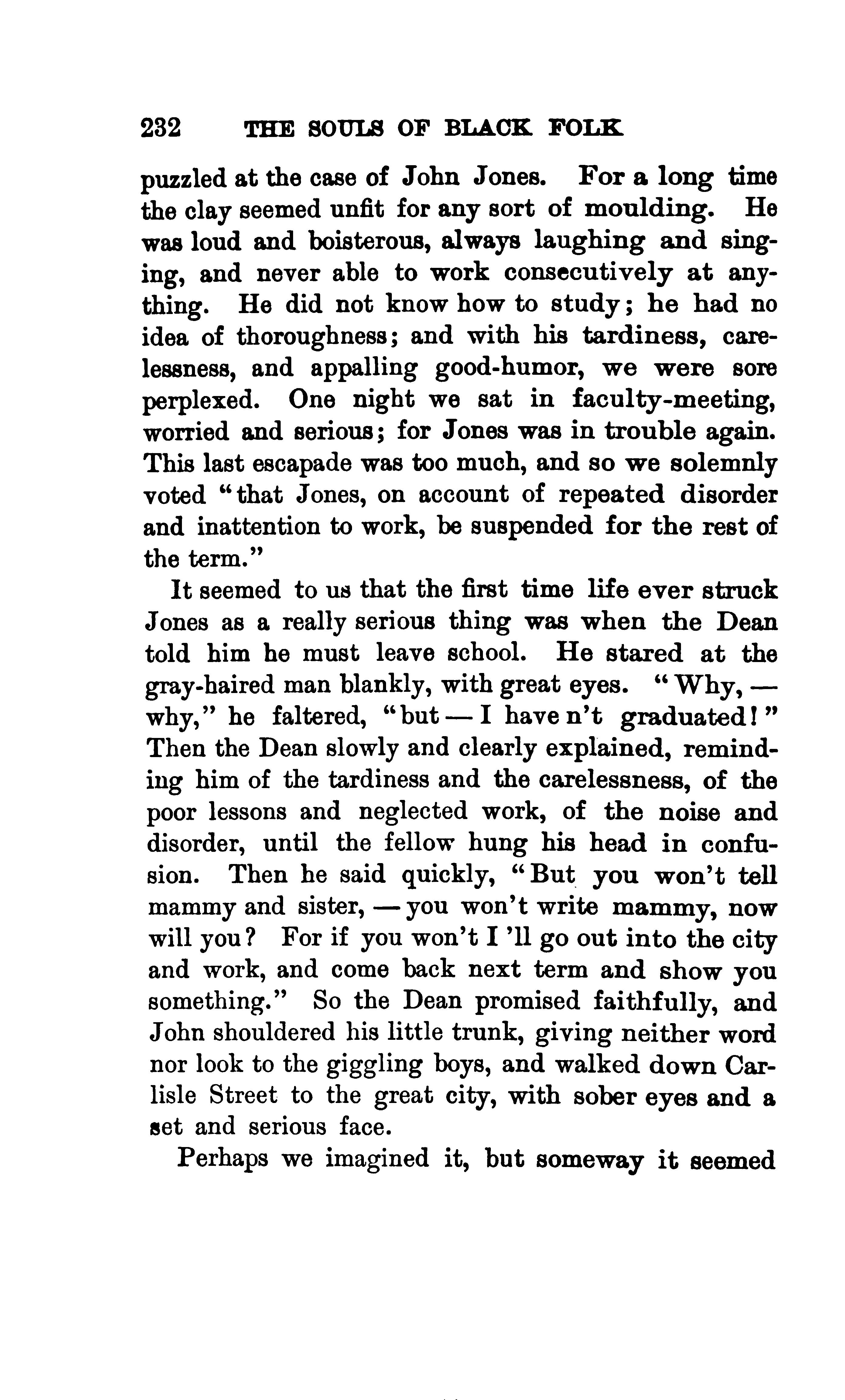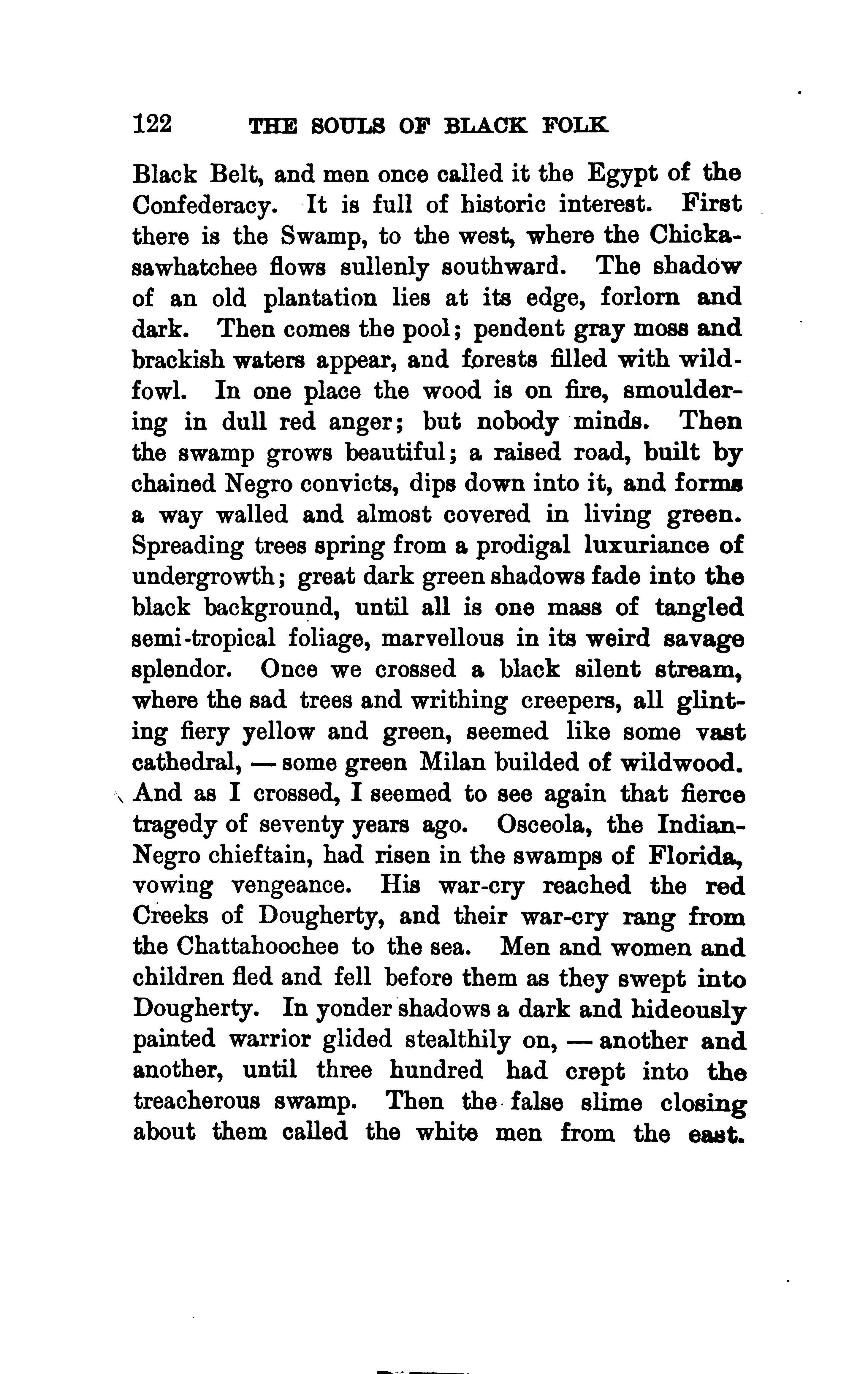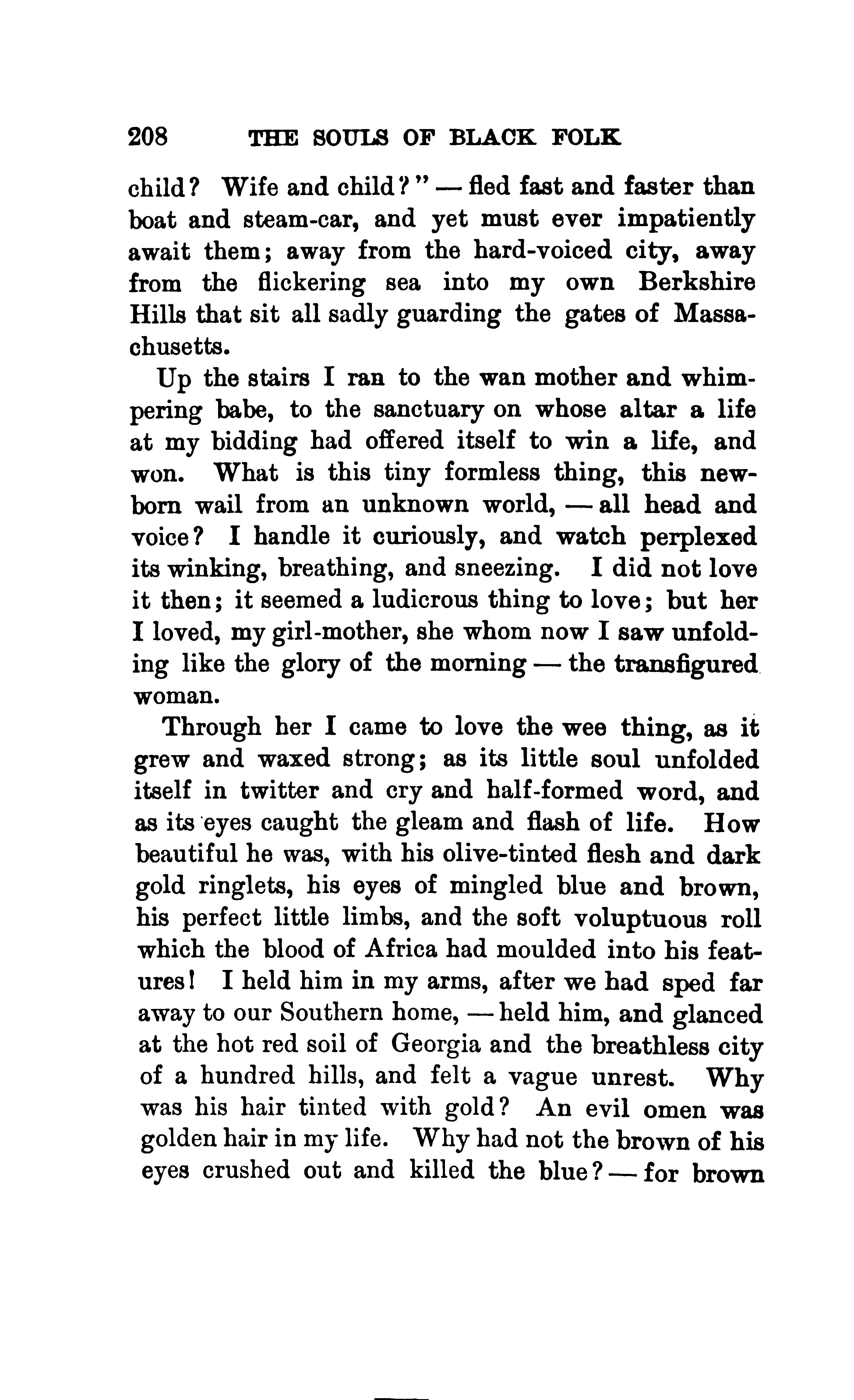 Leaving, then, the white world, I have stepped within the Veil, raising it that you may view faintly its deeper recesses, the meaning of its religion, the passion of its human sorrow, and the struggle of its greatersouls. All this I have ended with a tale twice told but seldom written, and a chapter of song.