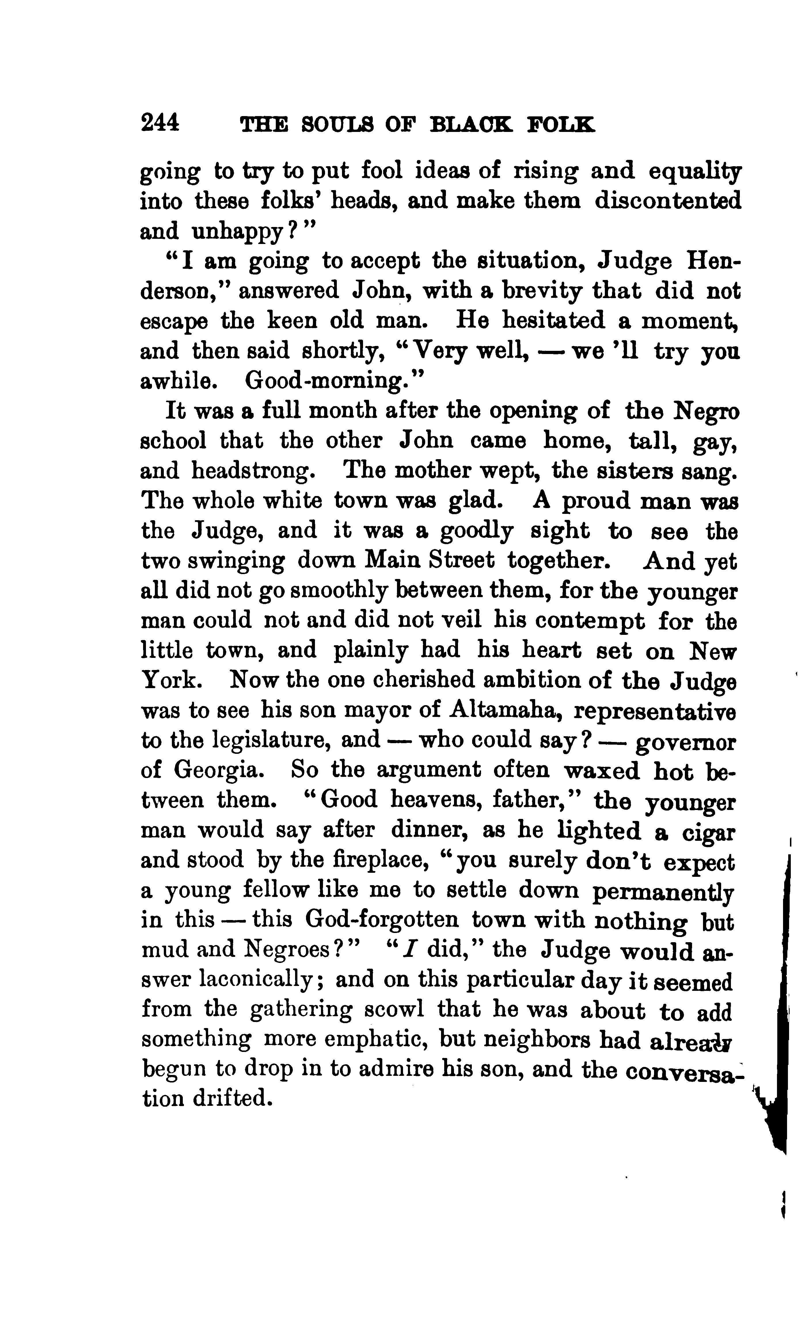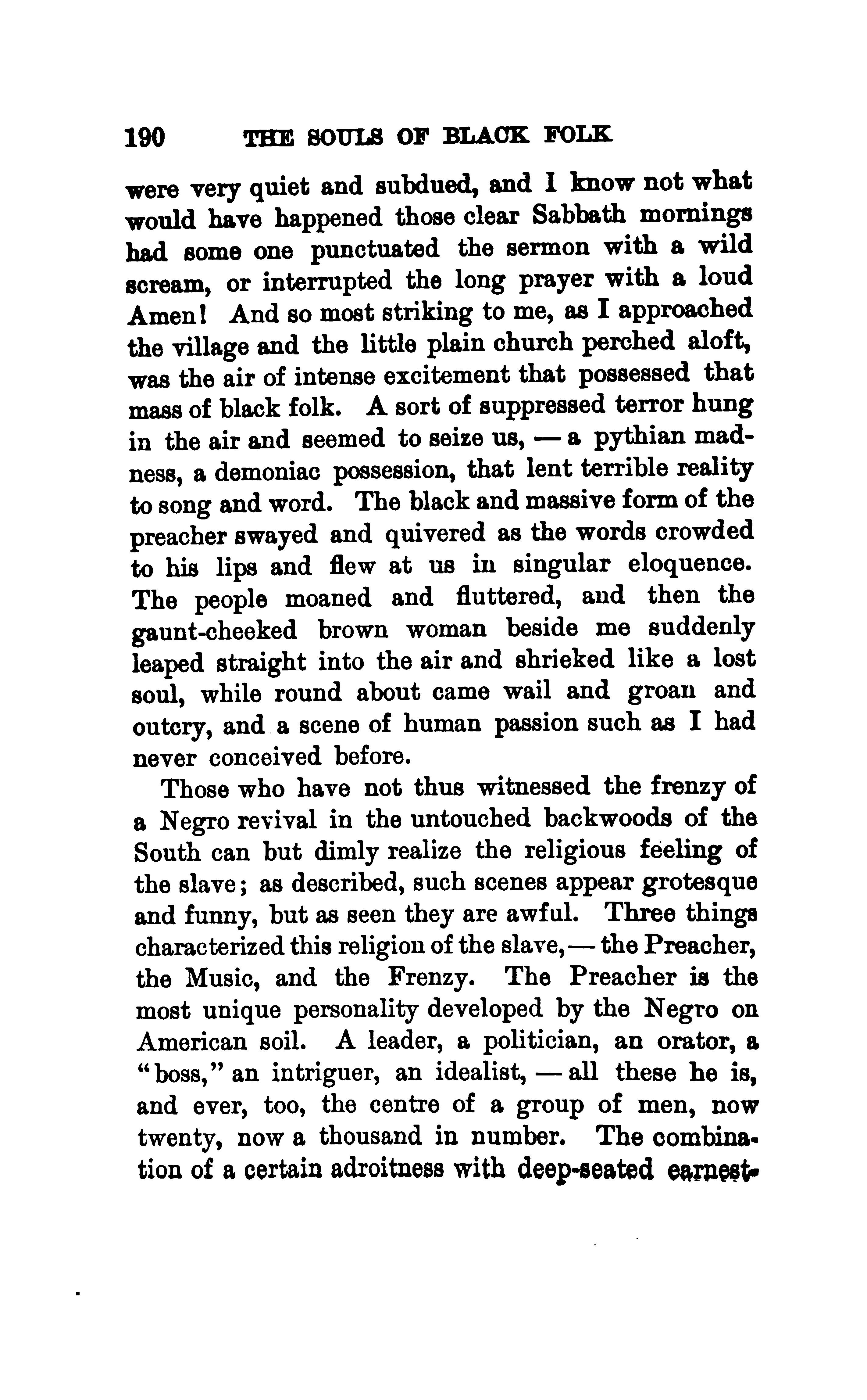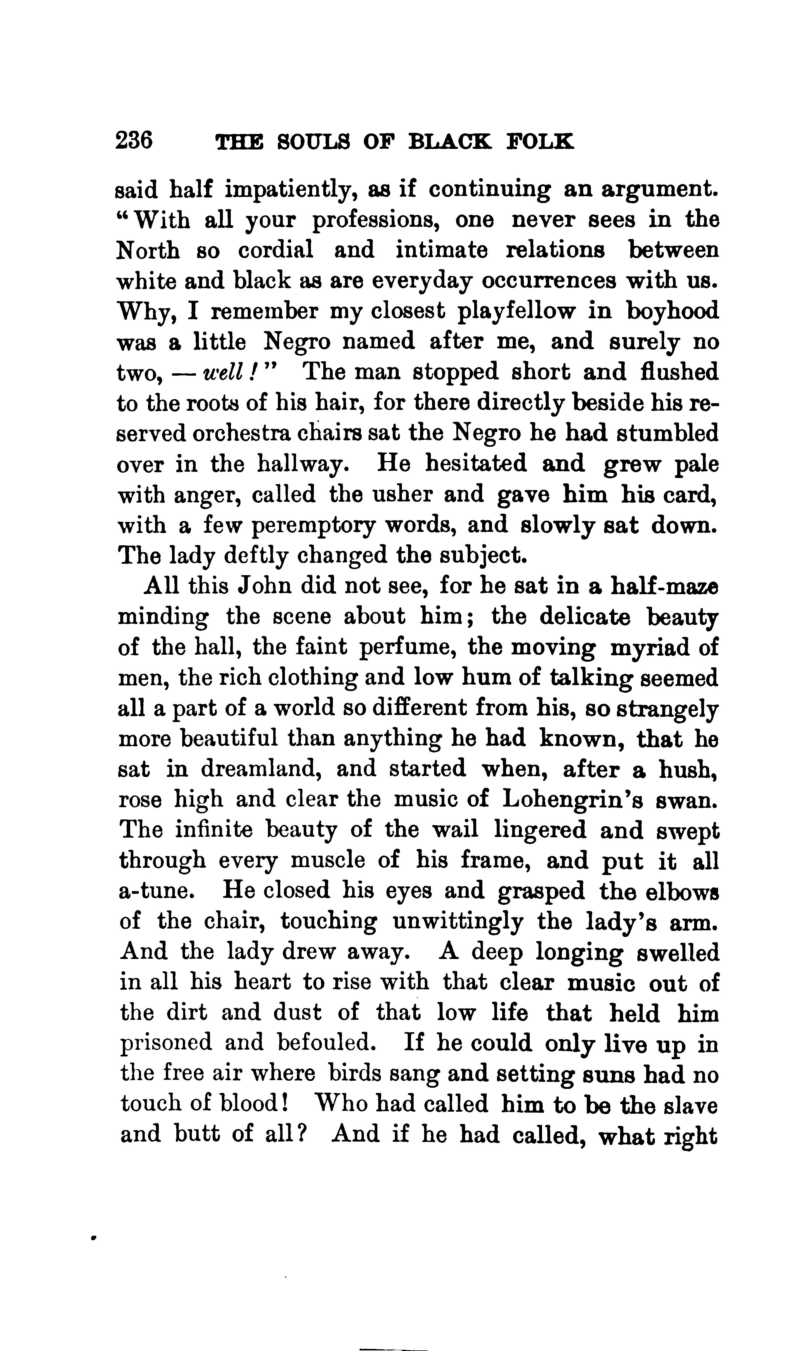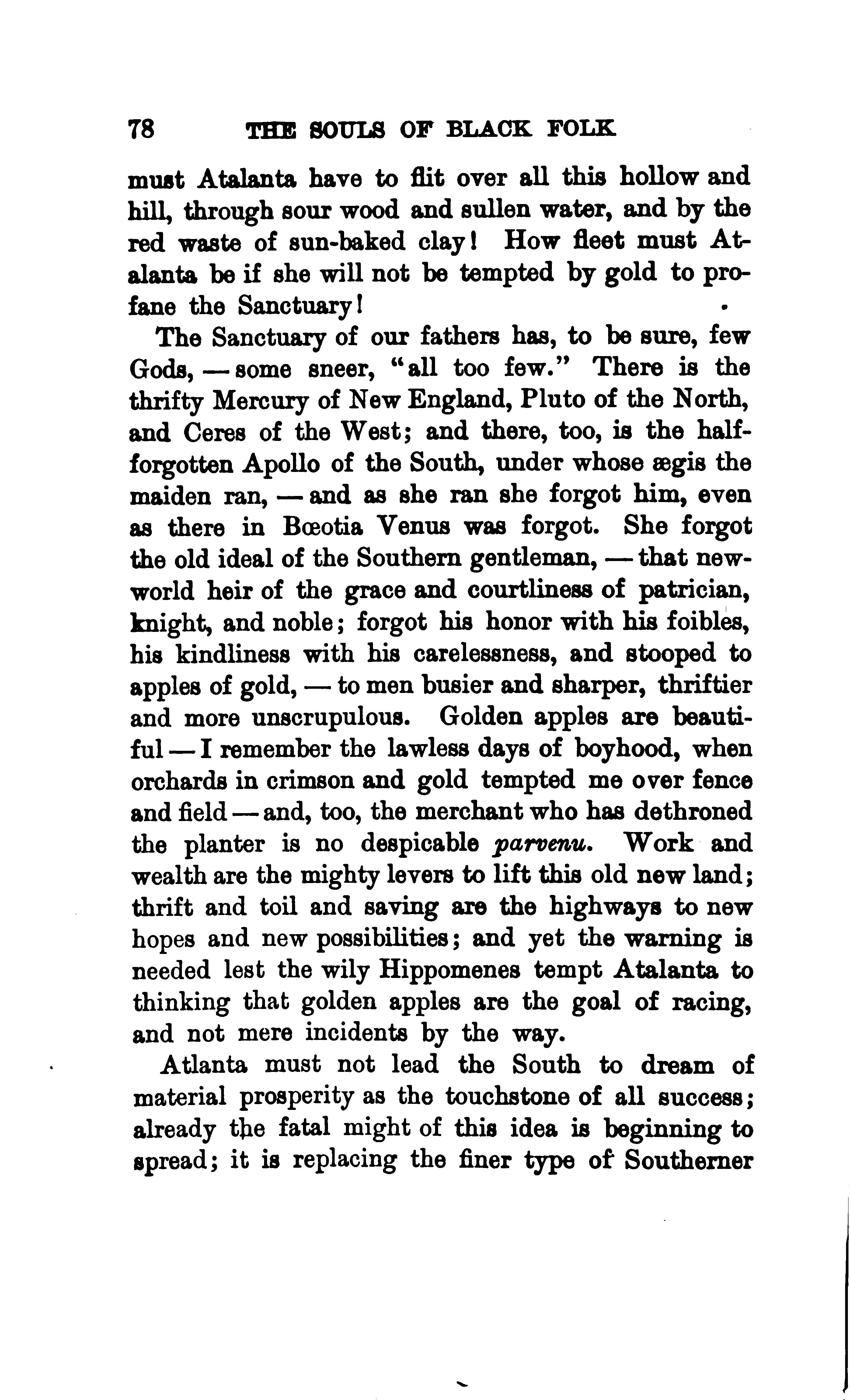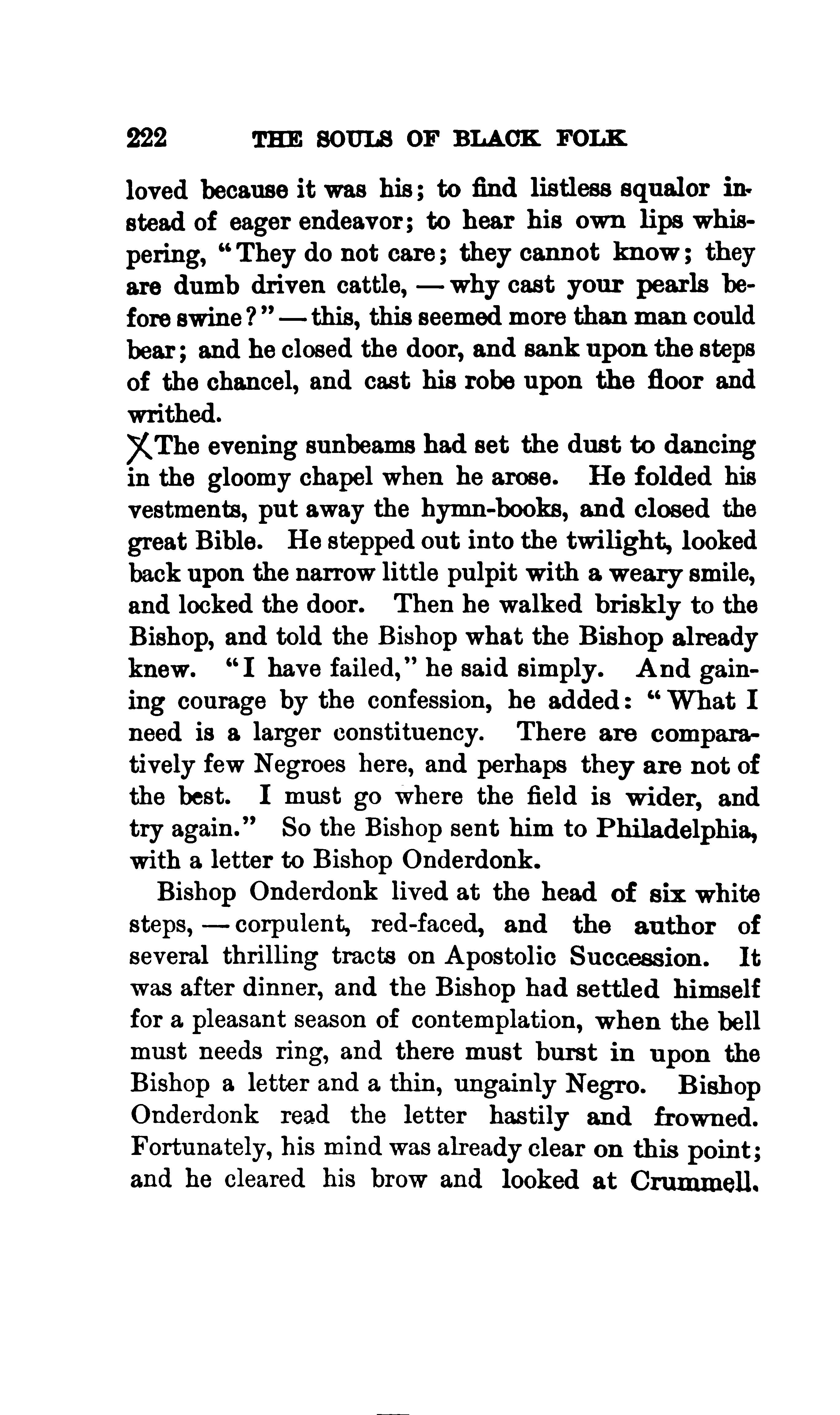 Leaving, then, the white world, I have stepped within the Veil, raising it that you may view faintly its deeper recesses, the meaning of its religion, the passion of its human sorrow, and the struggle of its greatersouls. All this I have ended with a tale twice told but seldom written, and a chapter of song.