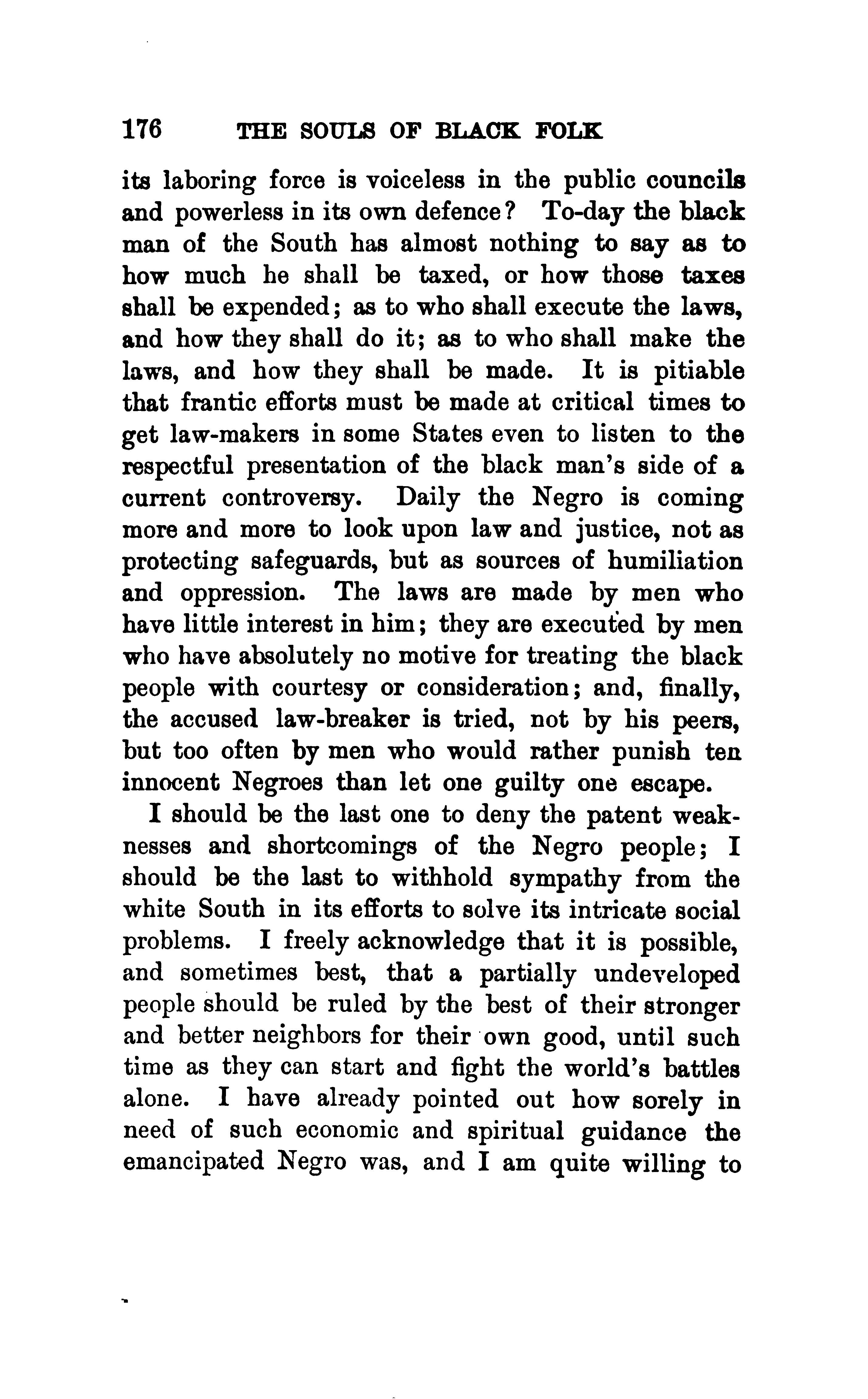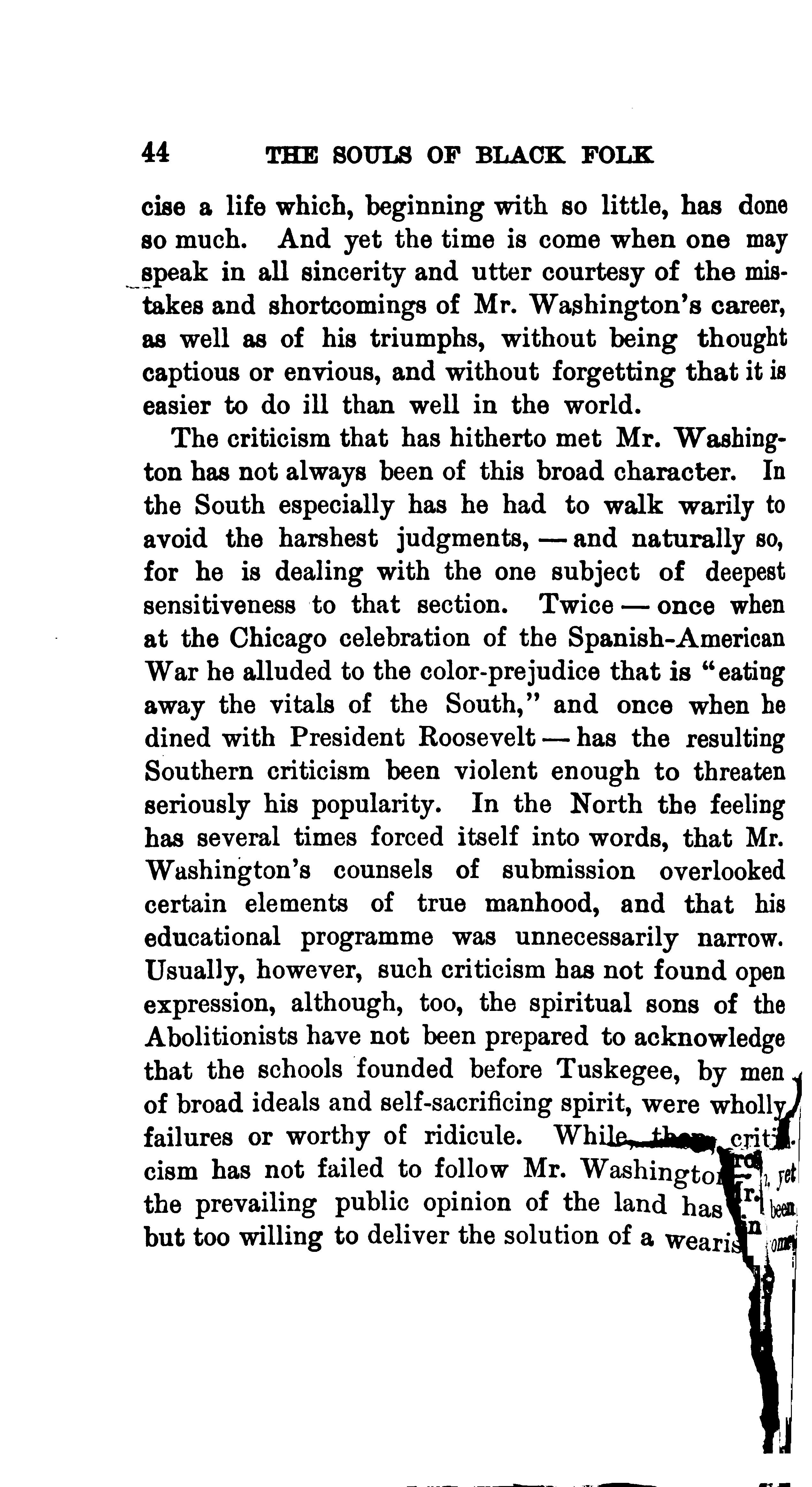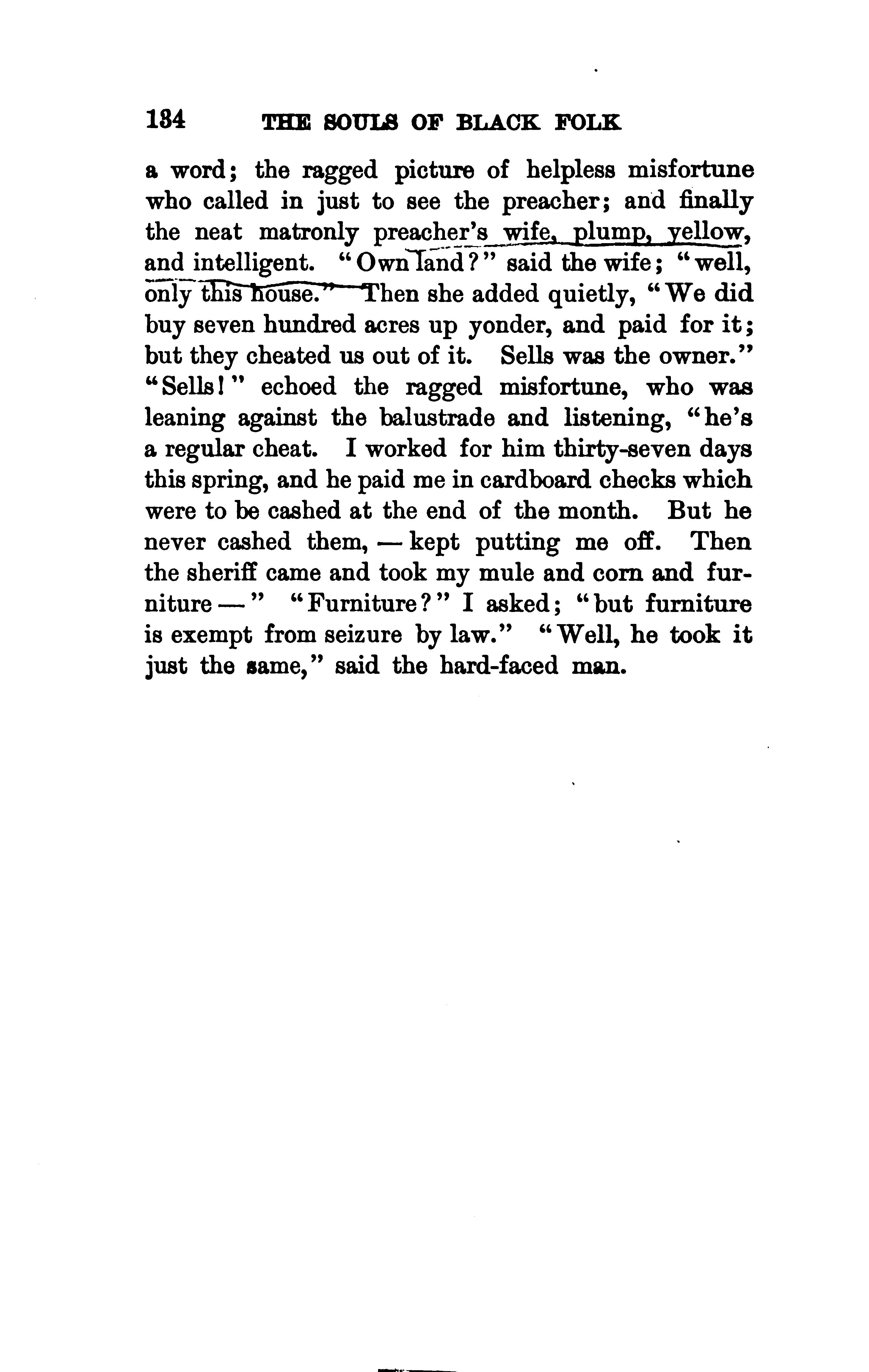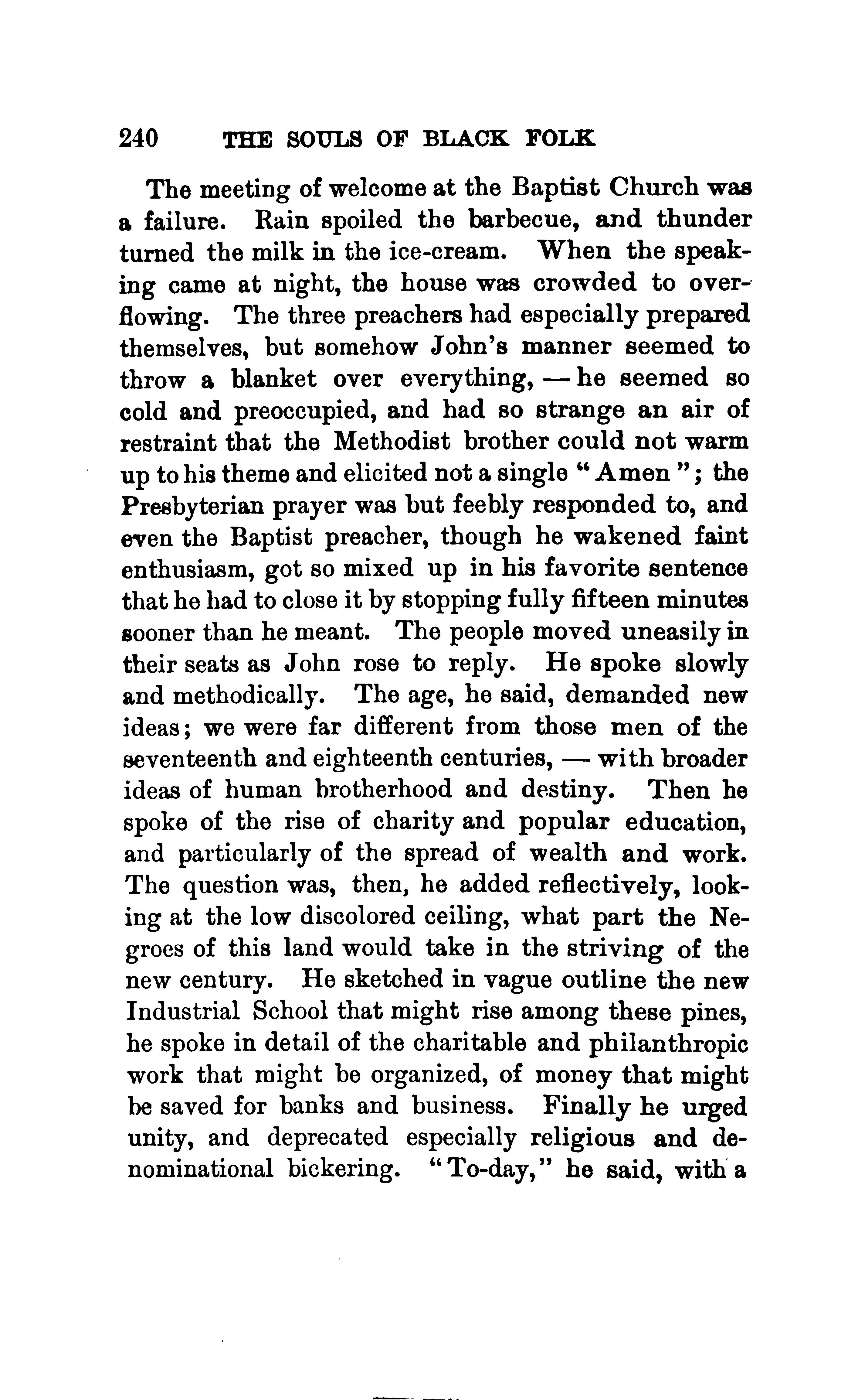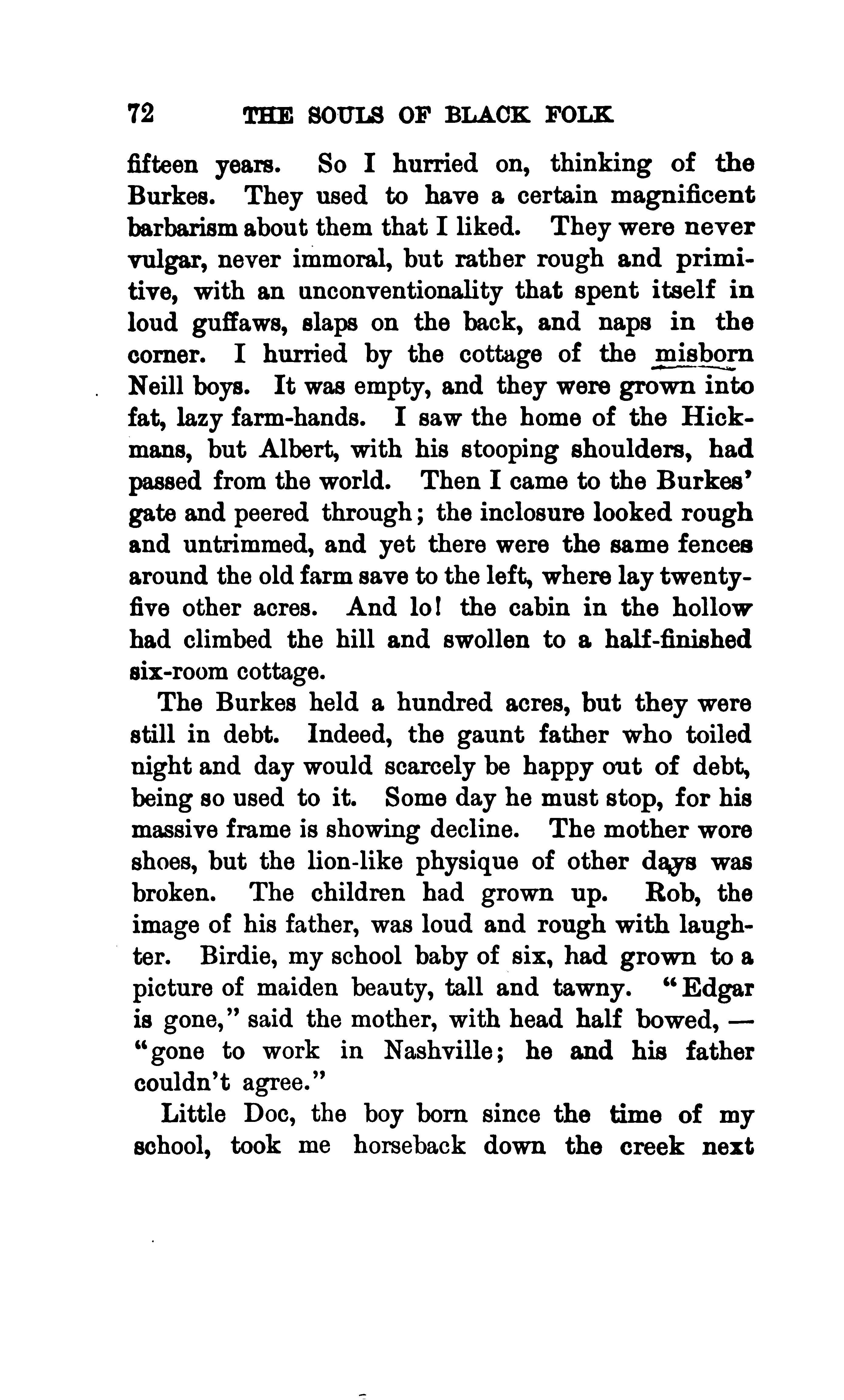 Leaving, then, the white world, I have stepped within the Veil, raising it that you may view faintly its deeper recesses, the meaning of its religion, the passion of its human sorrow, and the struggle of its greatersouls. All this I have ended with a tale twice told but seldom written, and a chapter of song.