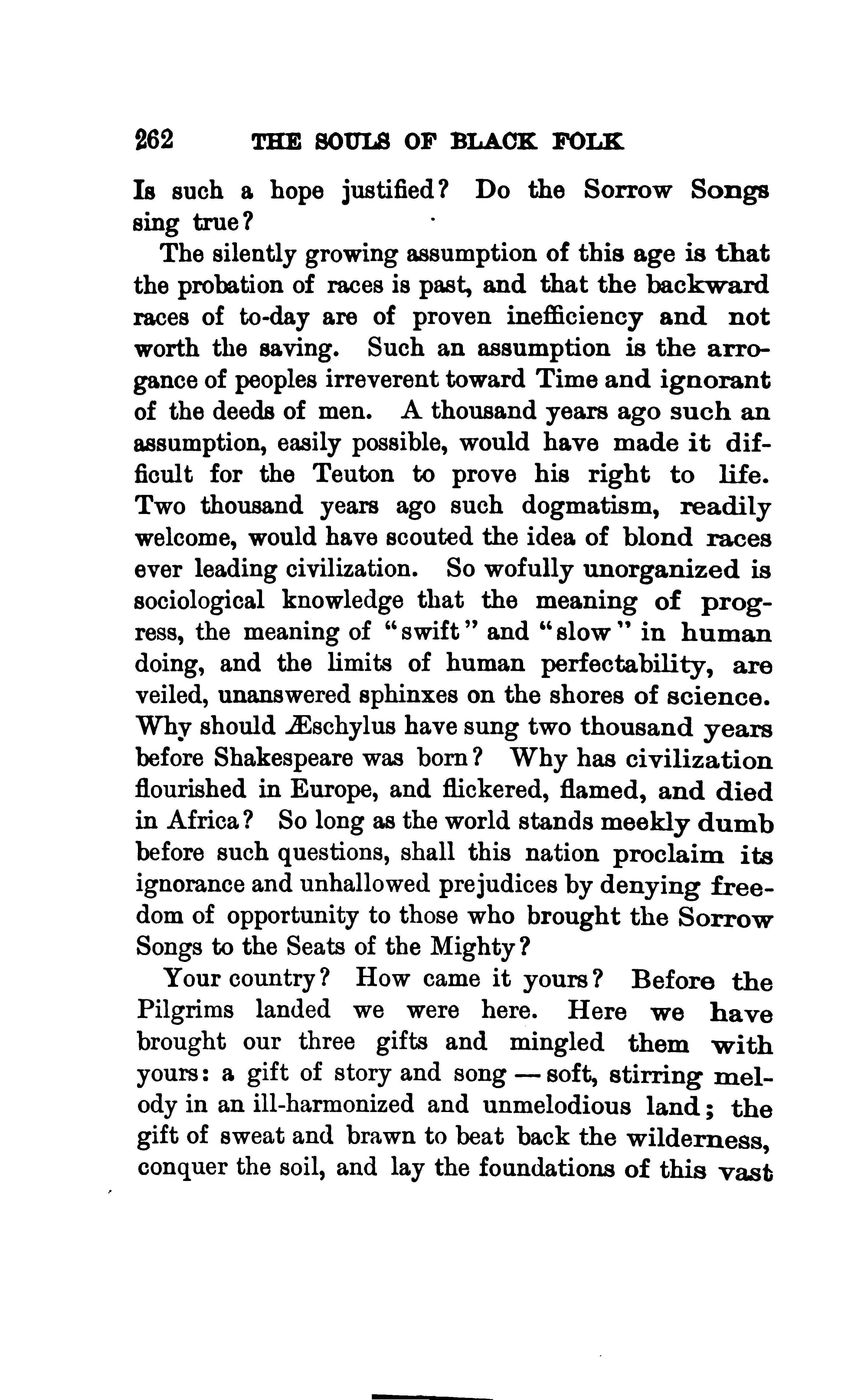 The silently growing assumption of this age is that the probation of races is past, and that the backward races of to-day are of proven inefficiency and not worth the saving. Such an assumption is the arrogance of peoples irreverent toward Time and ignorant of the deeds of men. A thousand years ago such an assumption, easily possible, would have made it difficult for the Teuton to prove his right to life. Two thousand years ago such dogmatism, readily welcome, would have scouted the idea of blond races ever leading civilization. So wofully unorganized is sociological knowledge that the meaning of progress, the meaning of " swift " and " slow" in human doing, and the limits of human perfectability, are veiled, unanswered sphinxes on the shores of science. Why should Eschylus have sung two thousand years before Shakespeare was born? Why has civilization flourished in Europe, and flickered, flamed, and died in Africa? So long asthe world stands meekly dumb before such questions, shall this nation proclaim its ignorance and unhallowed prejudices by denying freedom of opportunity to those who brought the Sorrow Songs tothe Seats of the Mighty?