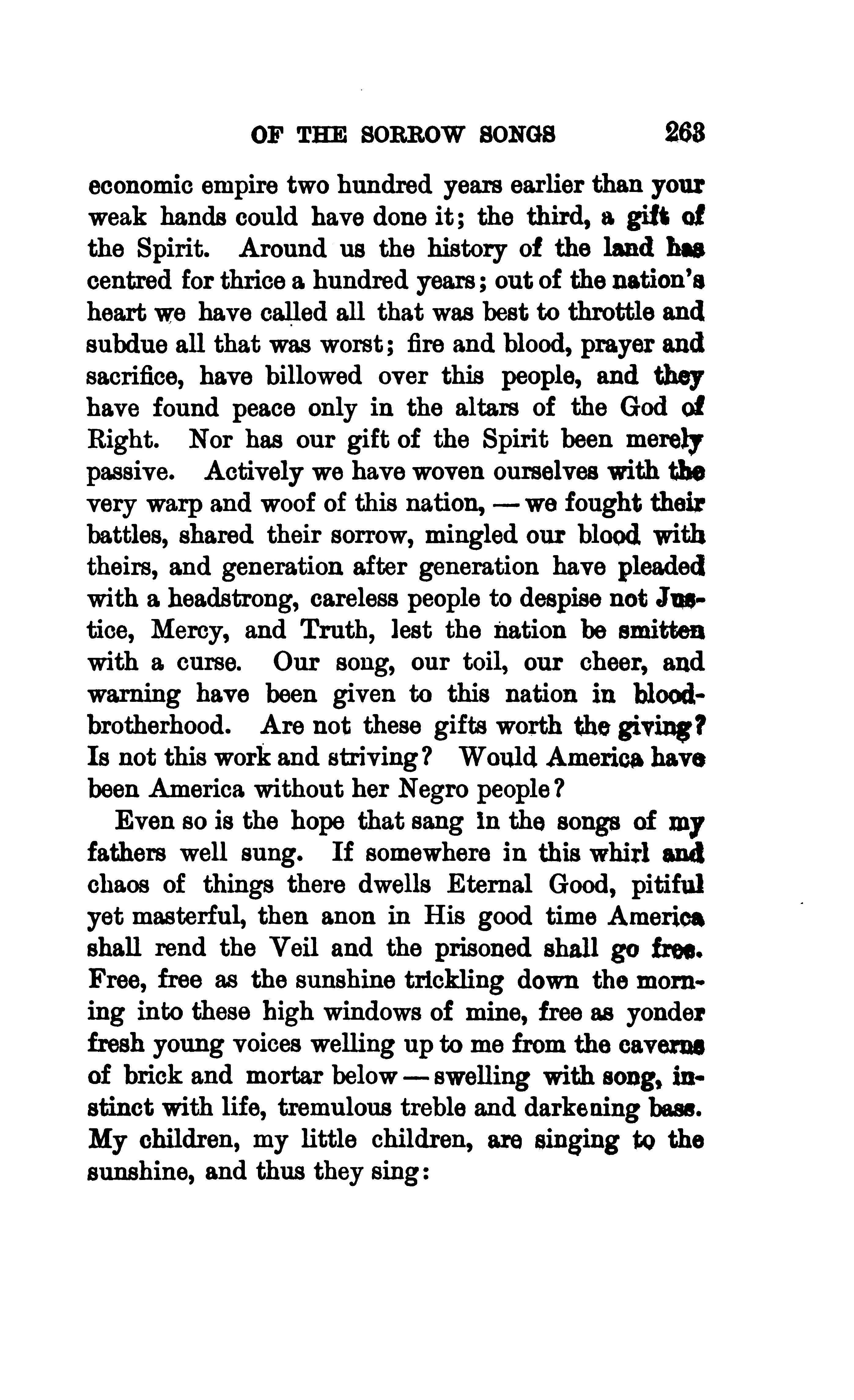 economic empire two hundred years earlier than your weak hands could have done it; the third, a gift of the Spirit. Around us the history of the land has centred for thrice a hundred years; out of the nation's heart we have called all that was best to throttle and subdue all that was worst; fire and blood, prayer and sacrifice, have billowed over this people, and they have found peace only in the altars of the God of Right. Nor has our gift of the Spirit been merely passive. Actively we have woven ourselves with the very warp and woof of this nation, we fought their battles, shared their sorrow, mingled our blood with theirs, and generation after generation have pleaded with a headstrong, careless people to despise not Justice, Mercy, and Truth, lest the nation be smitten with a curse. Our song, our toil, our cheer, and warning have been given to this nation in bloodbrotherhood. Are not these gifts worth the giving? Is not this work and striving? Would America have been America without her Negro people? Even so is the hope that sang inthe songs of my fathers well sung. If somewhere in this whirl and chaos of things there dwells Eternal Good, pitiful yet masterful, then anon in His good time America shall rend the Veil and the prisoned shall go free. Free, free as the sunshine trickling down the morning into these high windows of mine, free as yonder fresh young voices welling upto me fromthe caverns of brick and mortar below- swelling with song, instinct with life, tremulous treble and darkening bass. My children, my little children, are singing to the sunshine, and thus they sing: