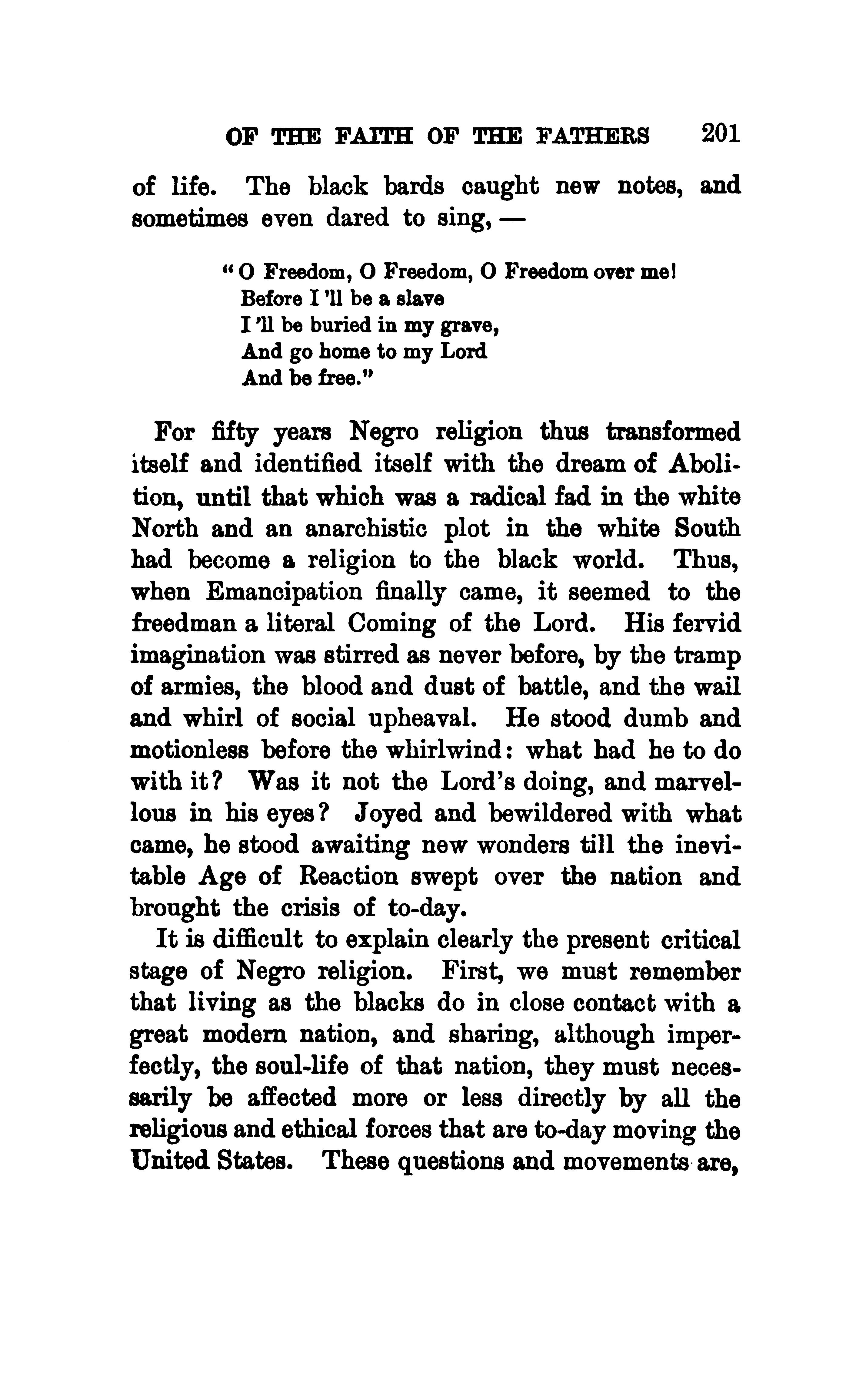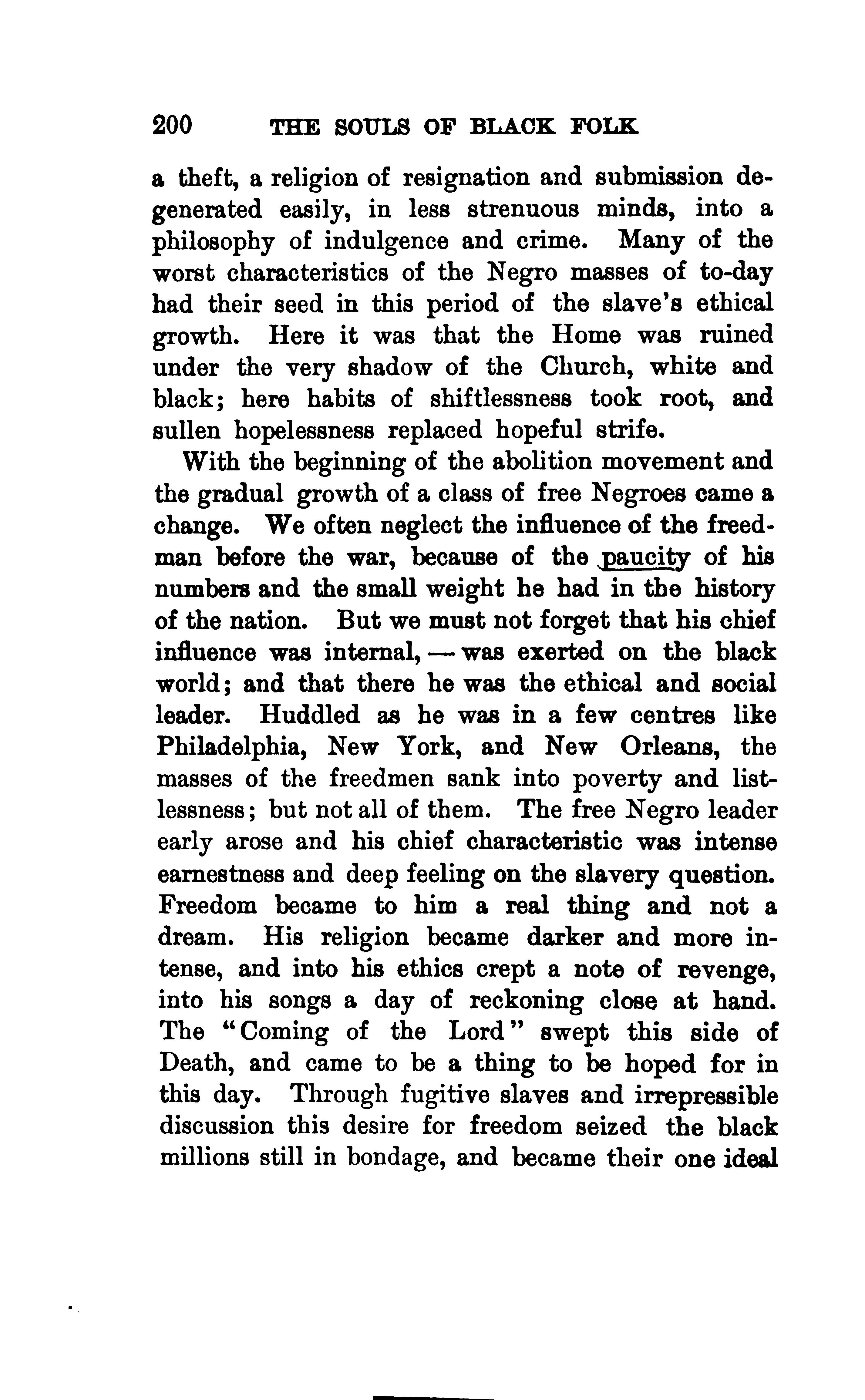 Away back in the days of bondage they thought to see in one divine event the end of all doubt and disappointment; few men ever worshipped Freedom with half such unquestioning faith as did the American Negro for two centuries. To him, so far as he thought and dreamed, slavery was indeed the sum of all villainies, the cause of all sorrow, the root of all