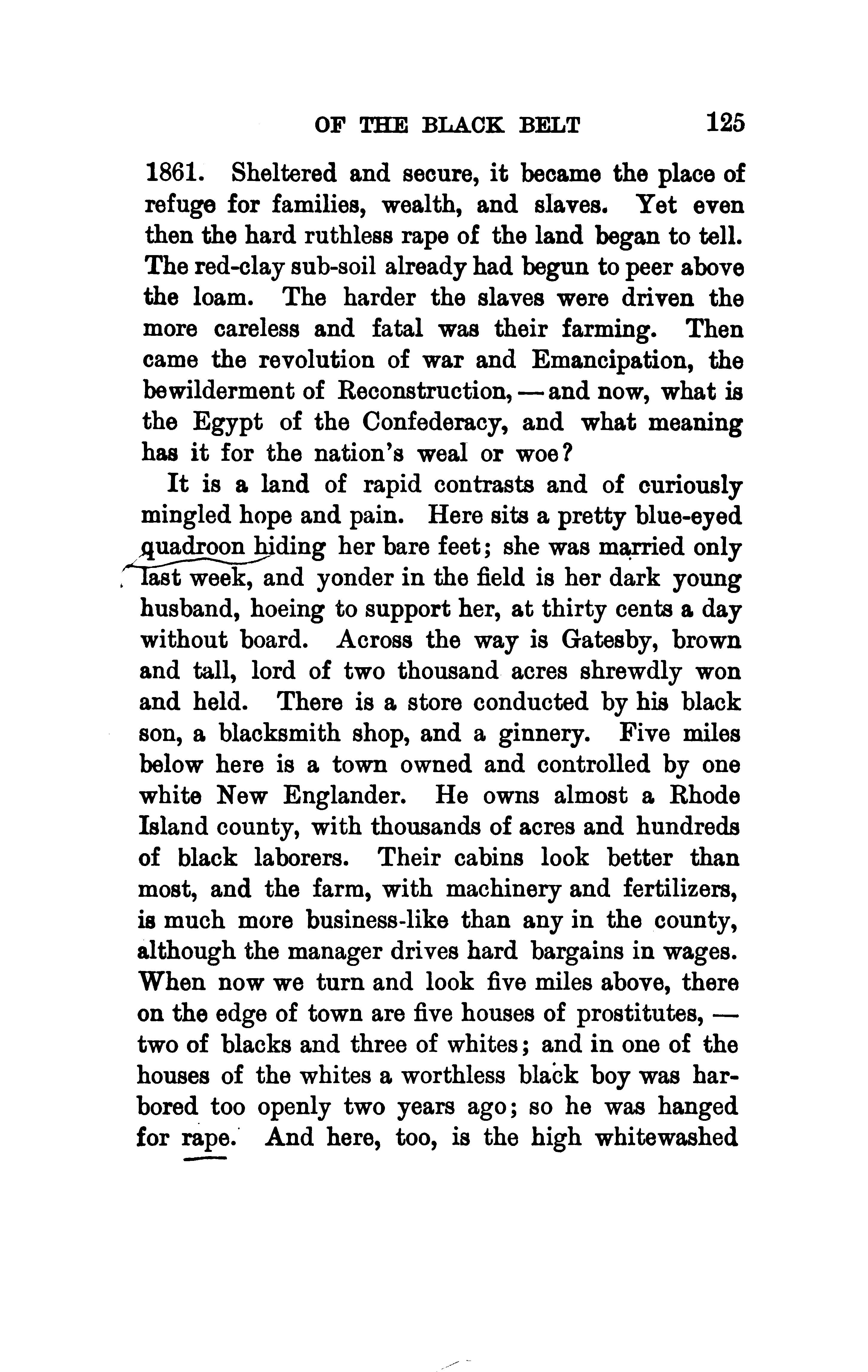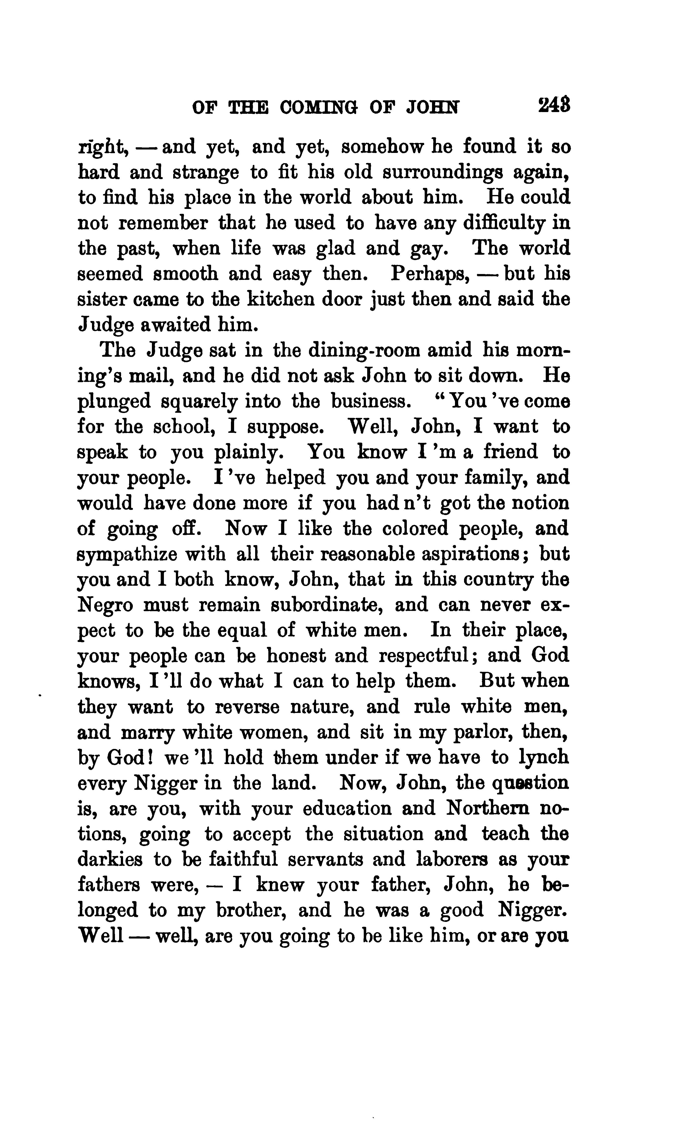 world, only to see her dark boy's limbs scattered to the winds by midnight marauders riding after " damned Niggers." These were the saddest sights of that woful day; and no man clasped the hands of these two passing figures of the present-past; but, hating, they went to their long home, and, hating, their children's children live to-day.