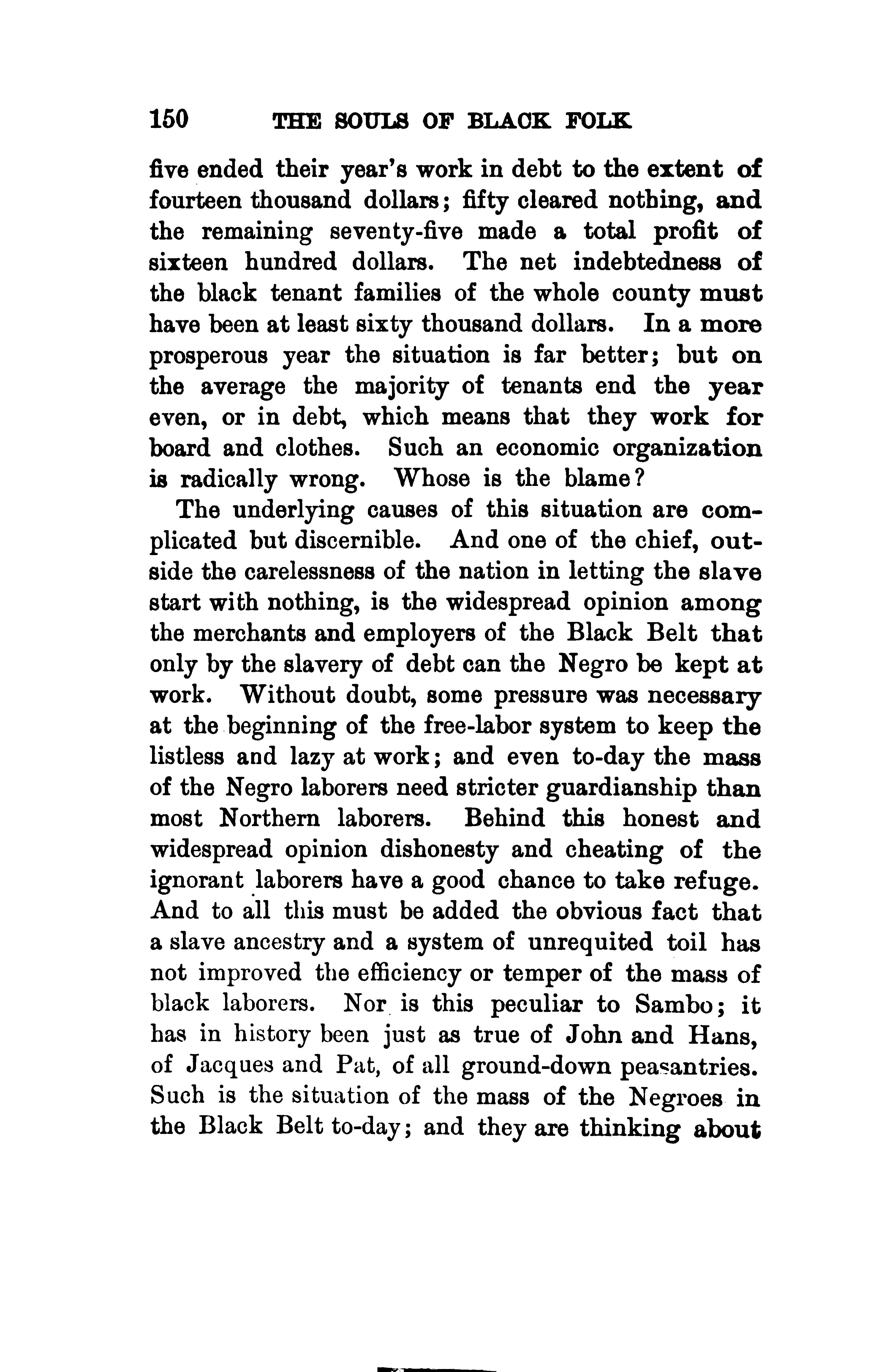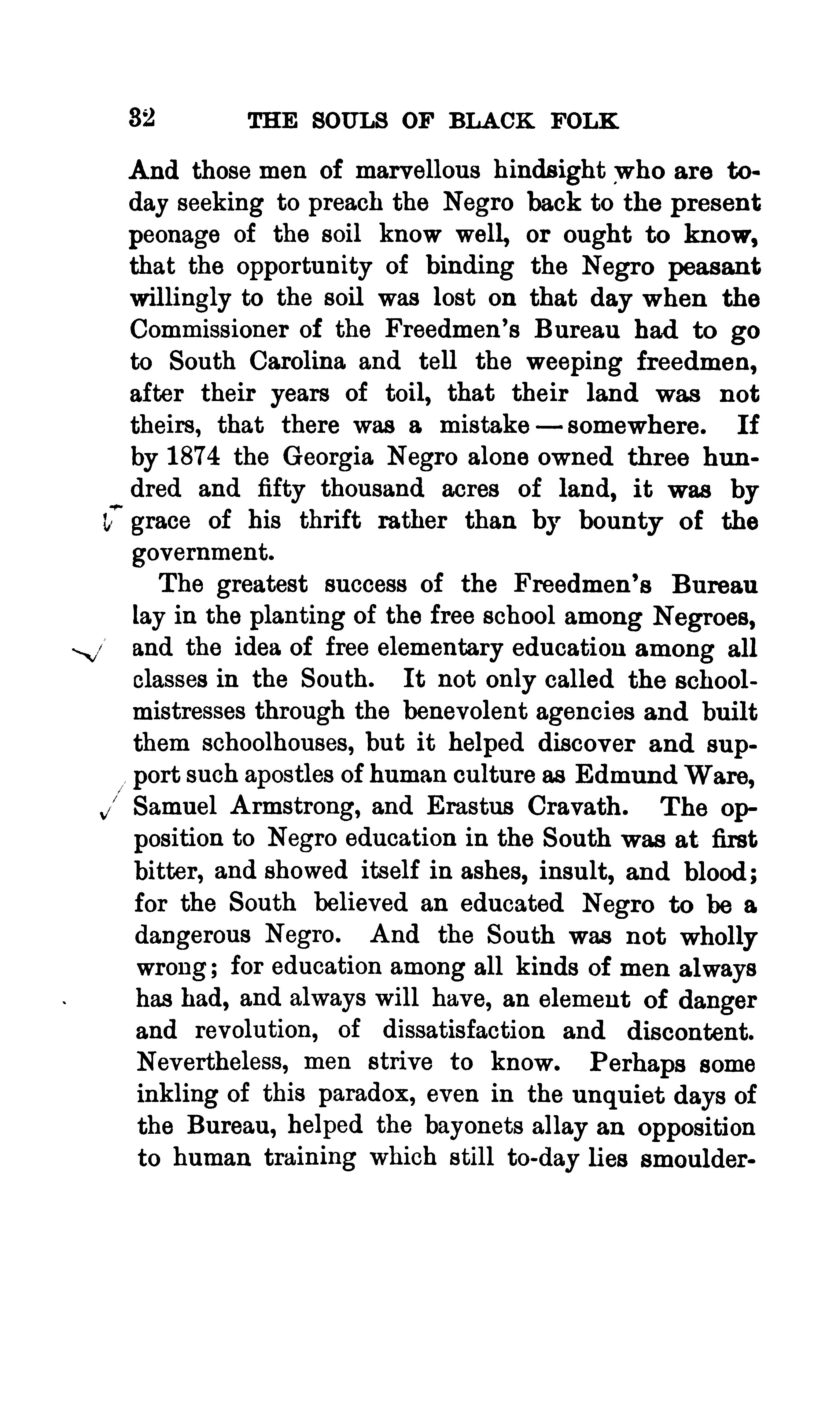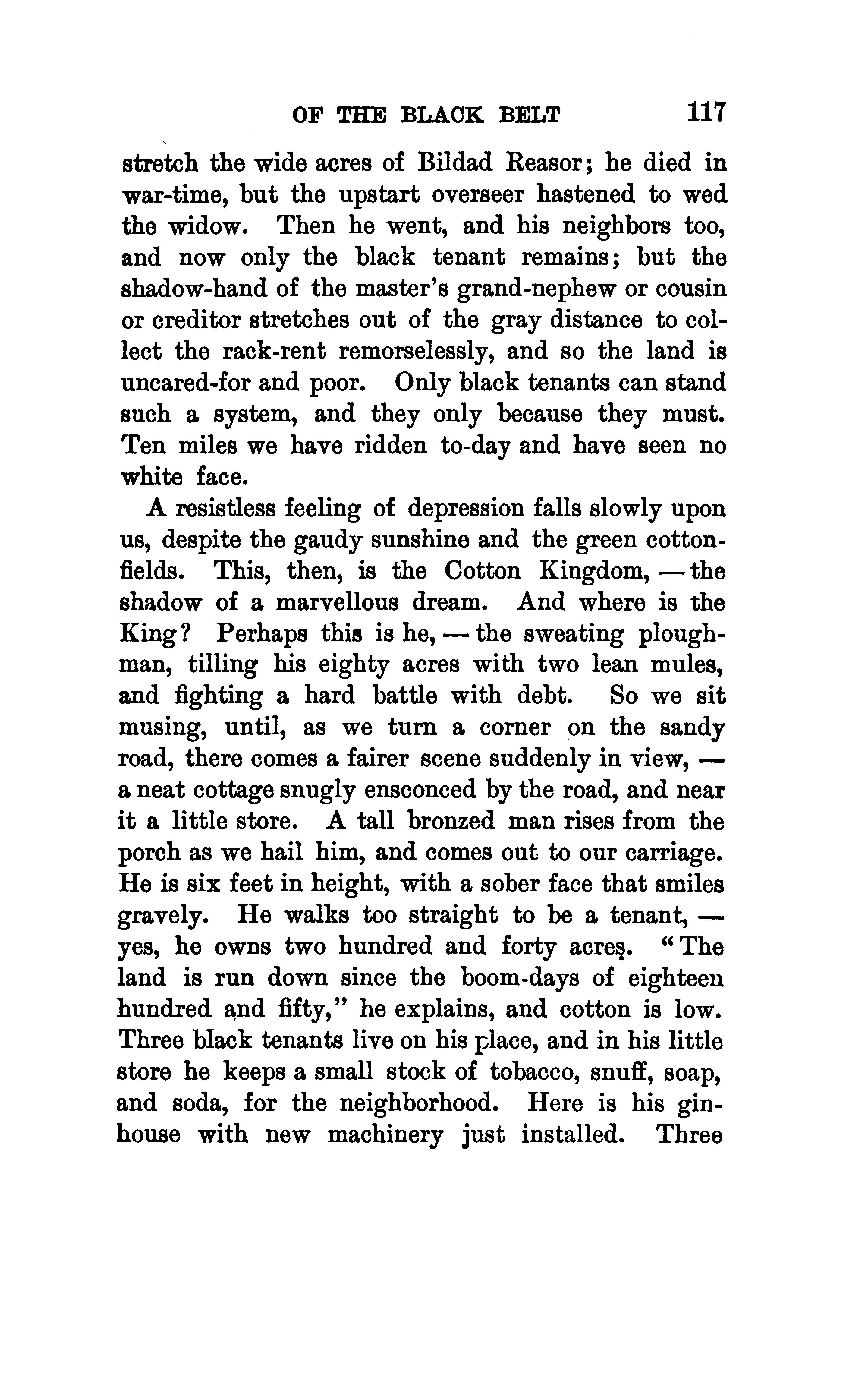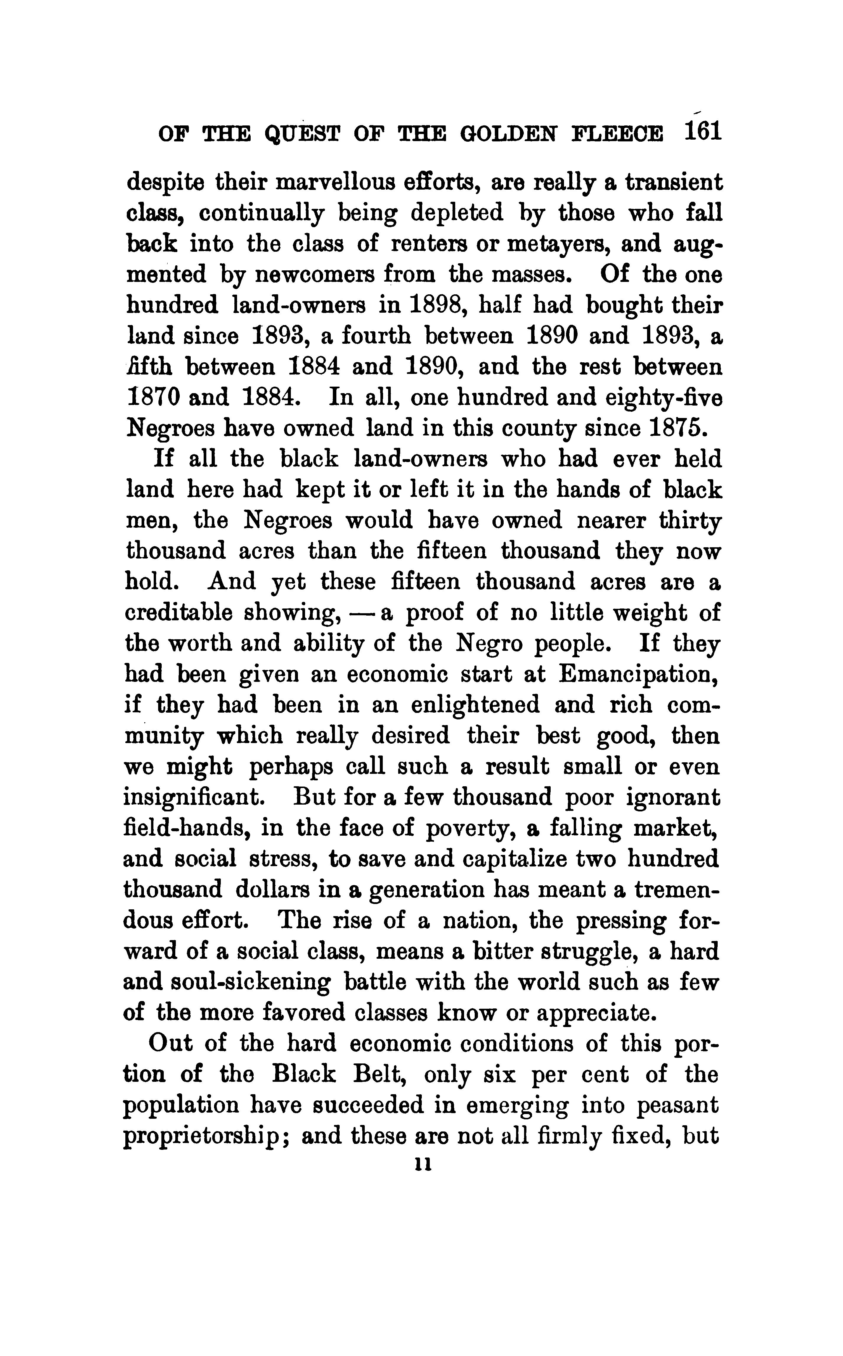And those men of marvellous hindsight who are today seeking to preach the Negro back to the present peonage of the soil know well, or ought to know, that the opportunity of binding the Negro peasant willingly to the soil was lost on that day when the Commissioner of the Freedmen's Bureau had to go to South Carolina and tell the weeping freedmen, after their years of toil, that their land was not theirs, that there was a mistake somewhere. If by 1874 the Georgia Negro alone owned three hundred and fifty thousand acres of land, it was by grace of his thrift rather than by bounty of the government.