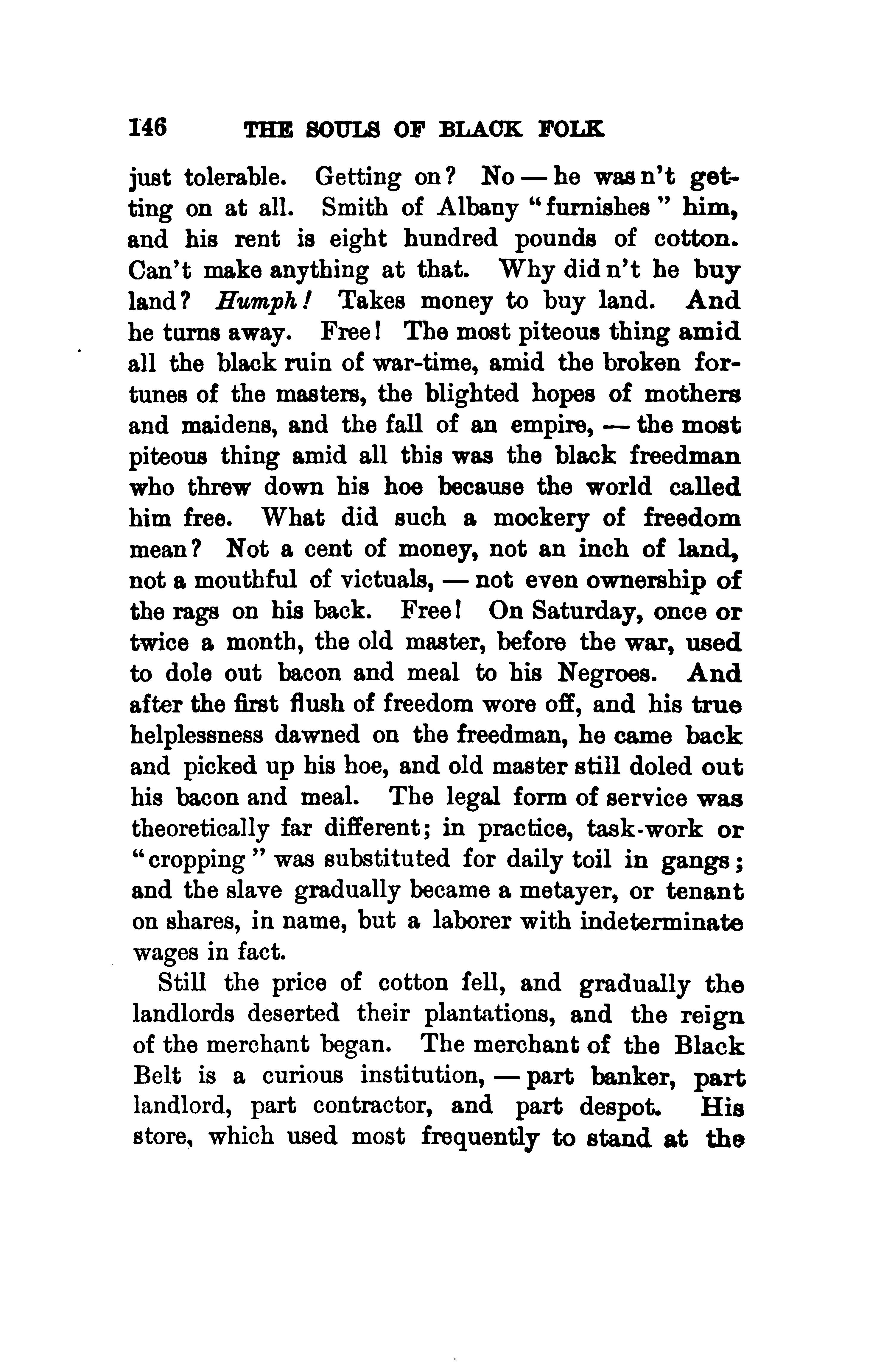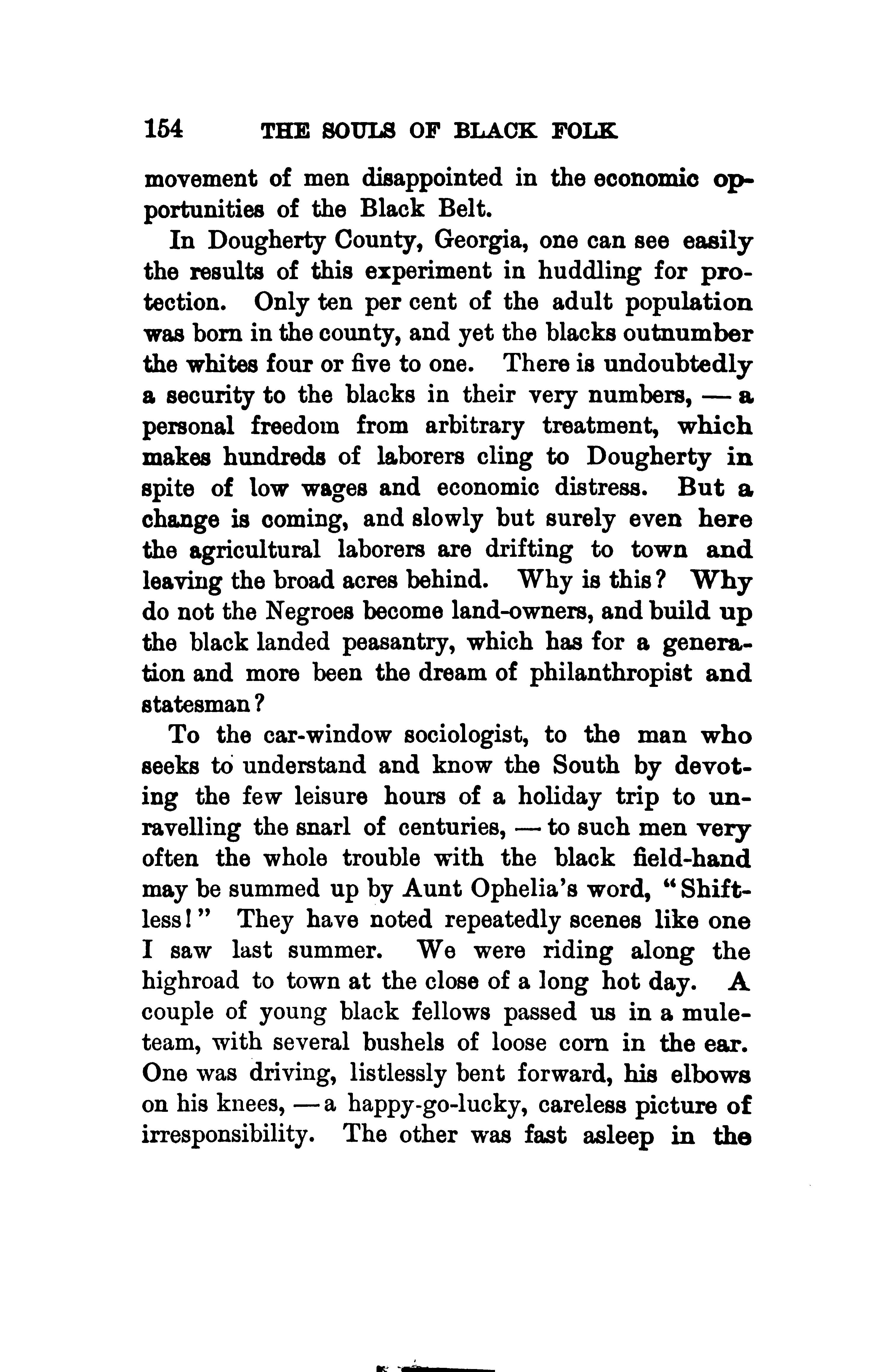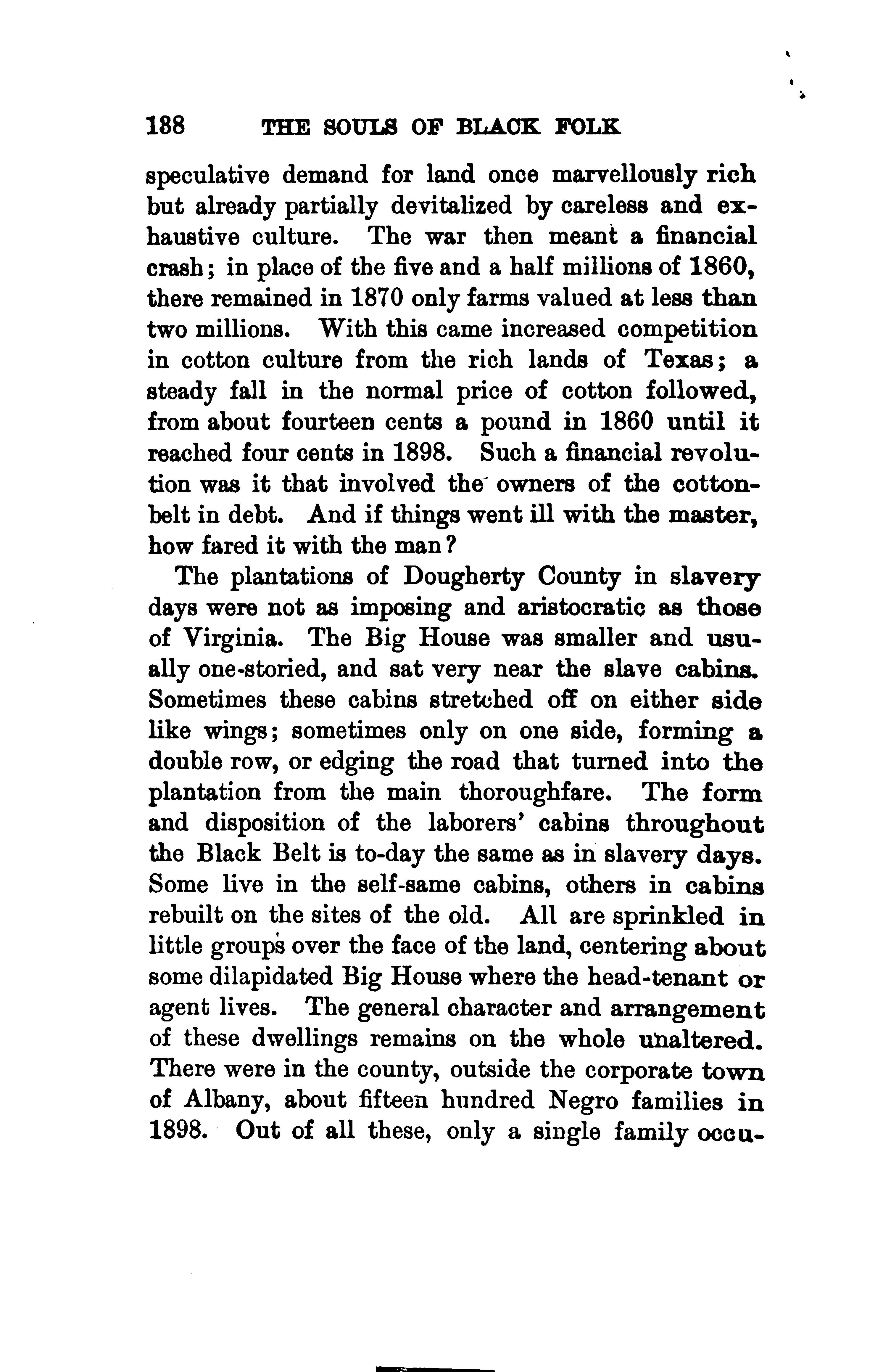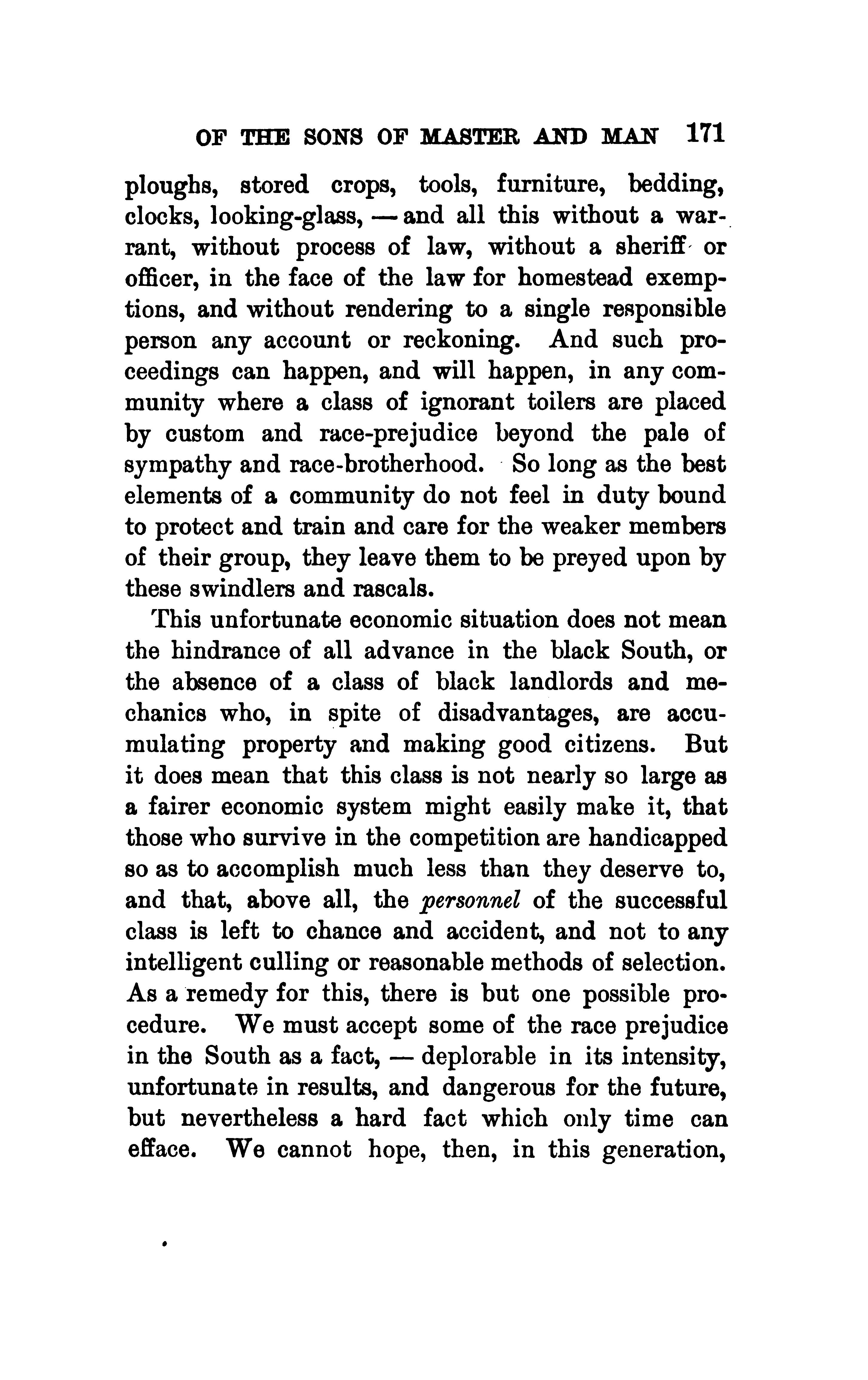 And those men of marvellous hindsight who are today seeking to preach the Negro back to the present peonage of the soil know well, or ought to know, that the opportunity of binding the Negro peasant willingly to the soil was lost on that day when the Commissioner of the Freedmen's Bureau had to go to South Carolina and tell the weeping freedmen, after their years of toil, that their land was not theirs, that there was a mistake somewhere. If by 1874 the Georgia Negro alone owned three hundred and fifty thousand acres of land, it was by grace of his thrift rather than by bounty of the government.
