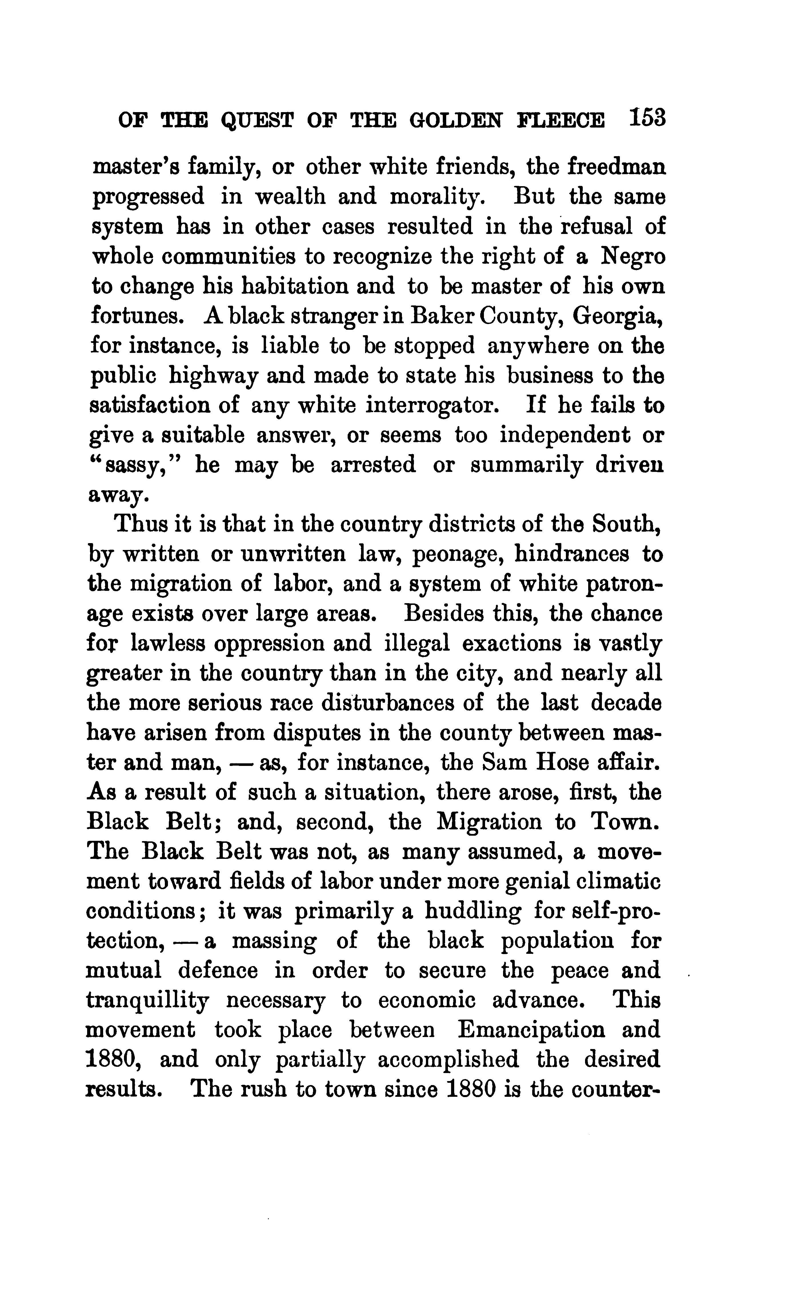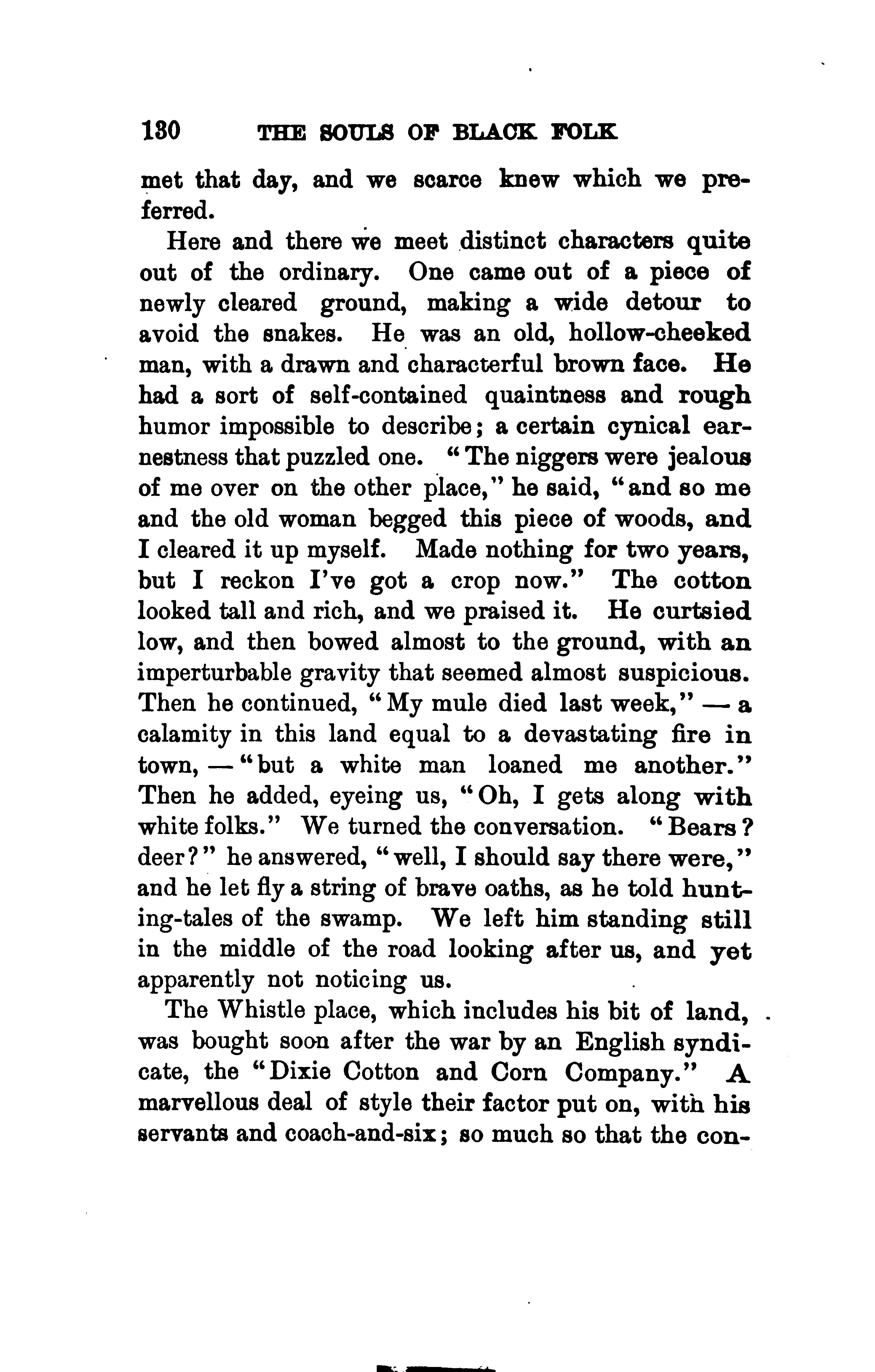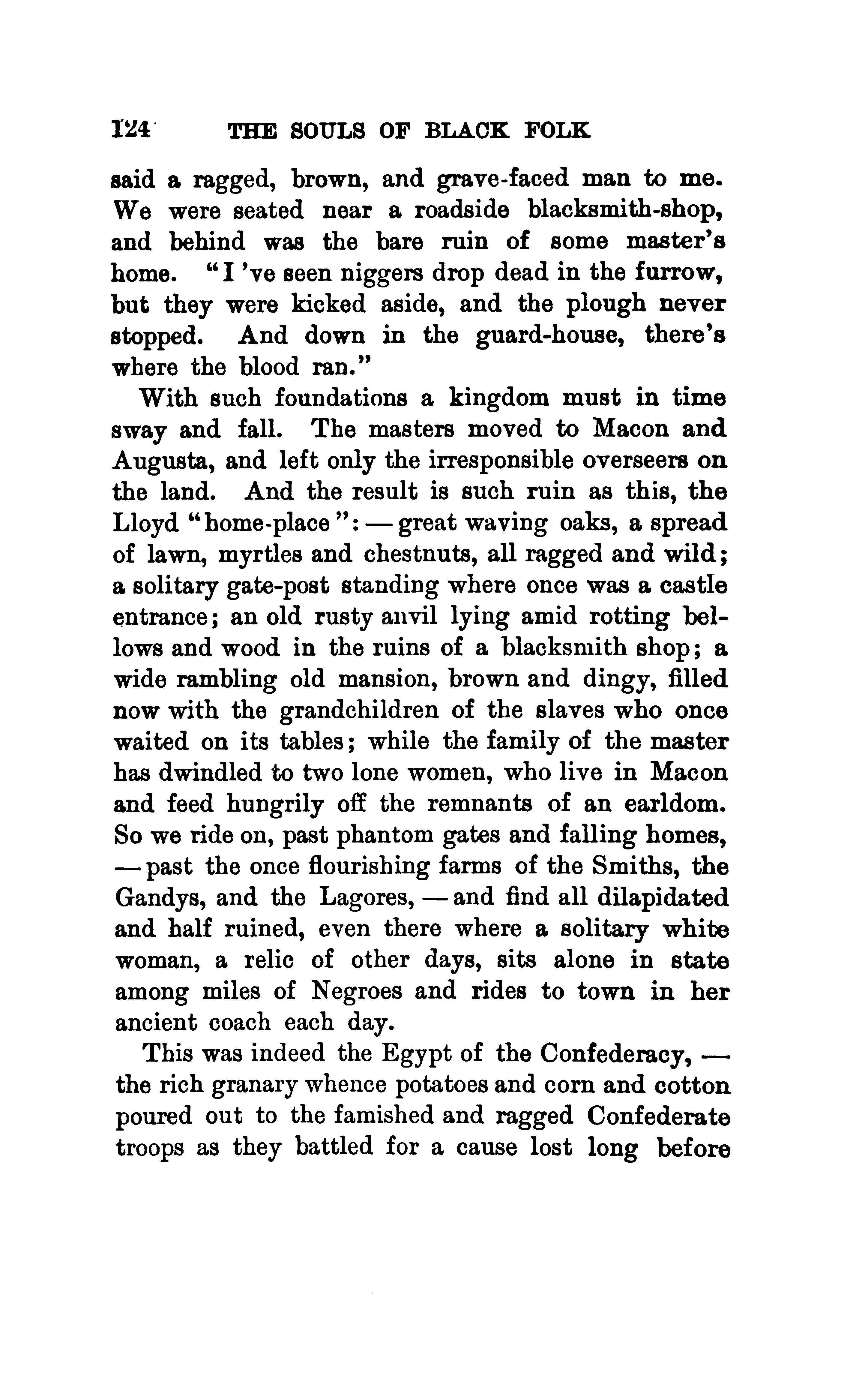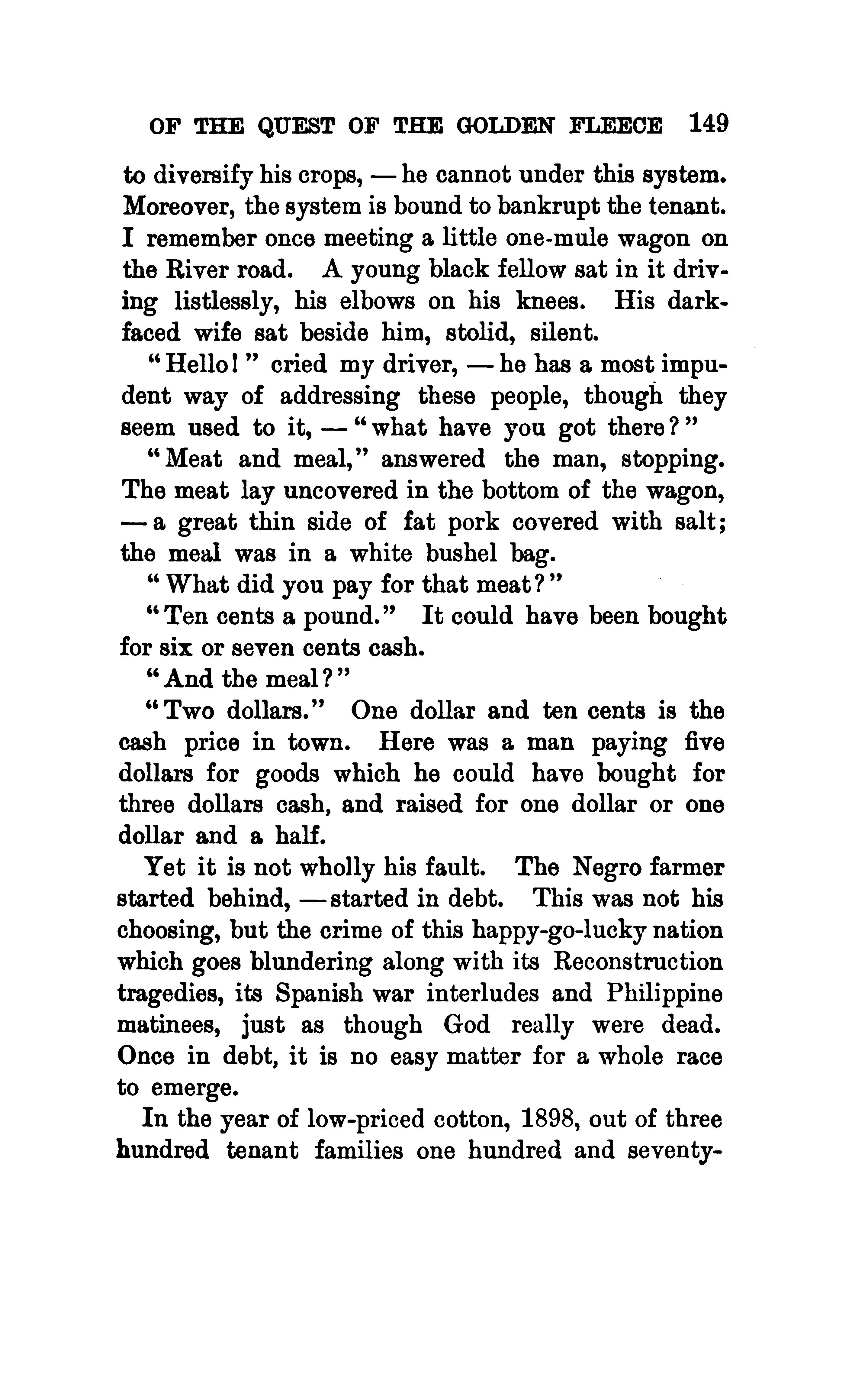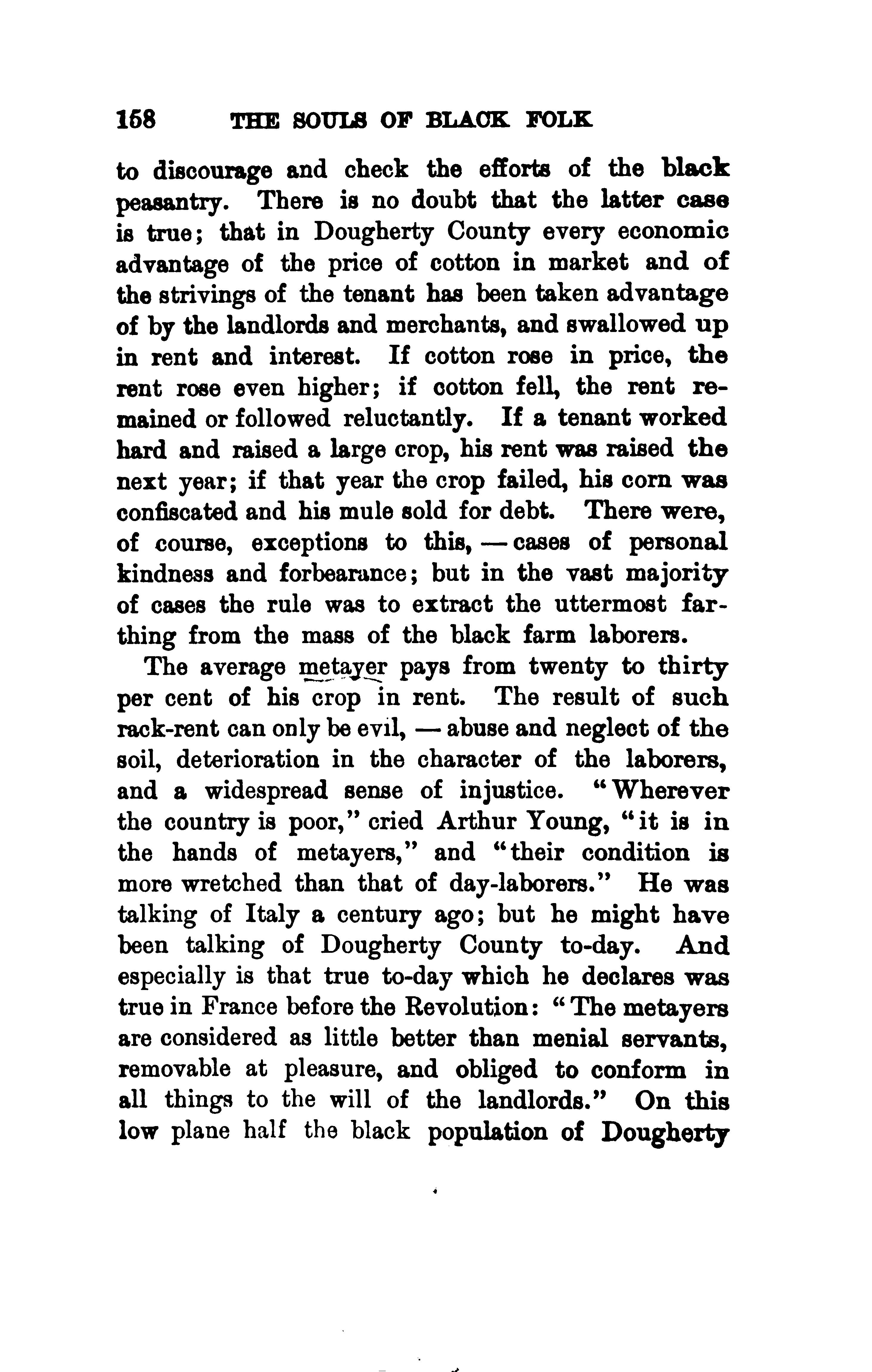 And those men of marvellous hindsight who are today seeking to preach the Negro back to the present peonage of the soil know well, or ought to know, that the opportunity of binding the Negro peasant willingly to the soil was lost on that day when the Commissioner of the Freedmen's Bureau had to go to South Carolina and tell the weeping freedmen, after their years of toil, that their land was not theirs, that there was a mistake somewhere. If by 1874 the Georgia Negro alone owned three hundred and fifty thousand acres of land, it was by grace of his thrift rather than by bounty of the government.