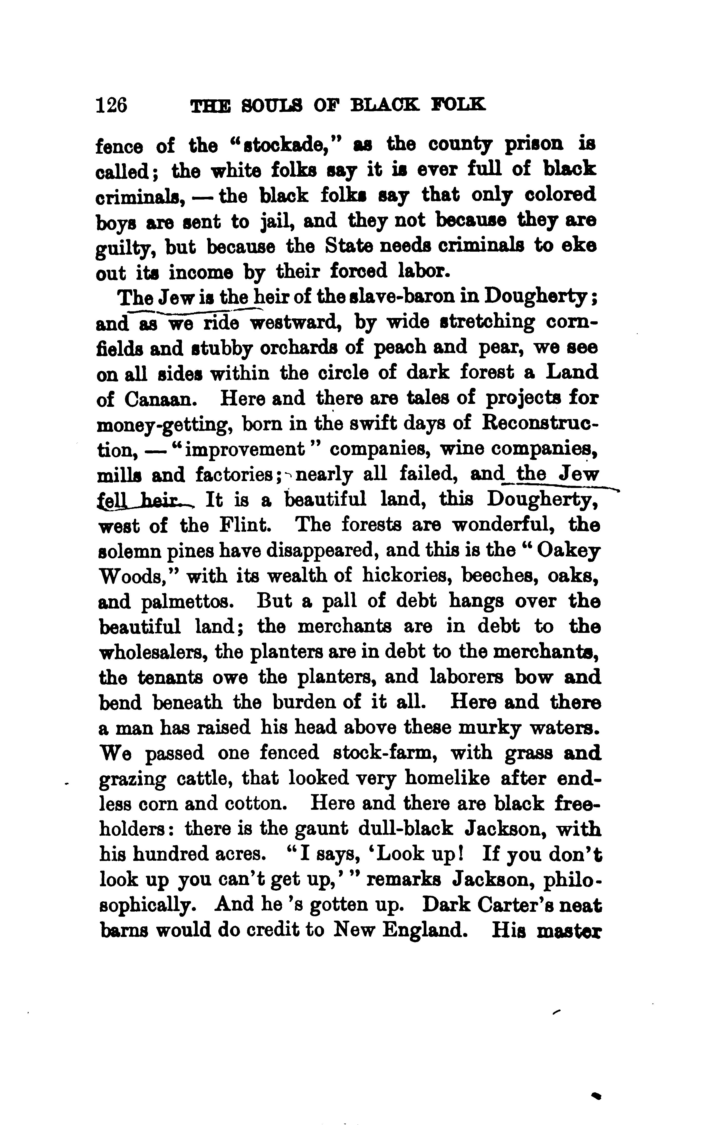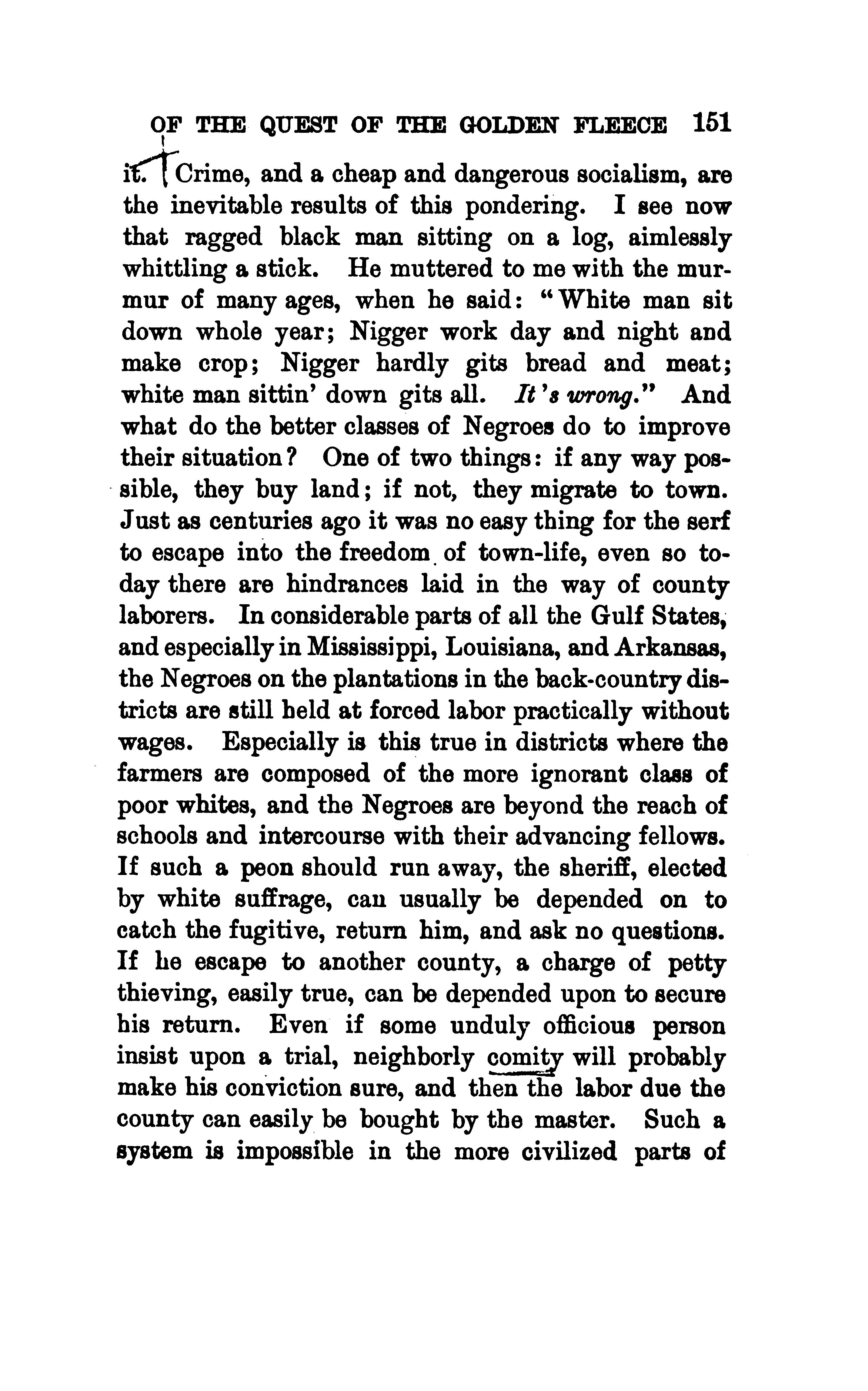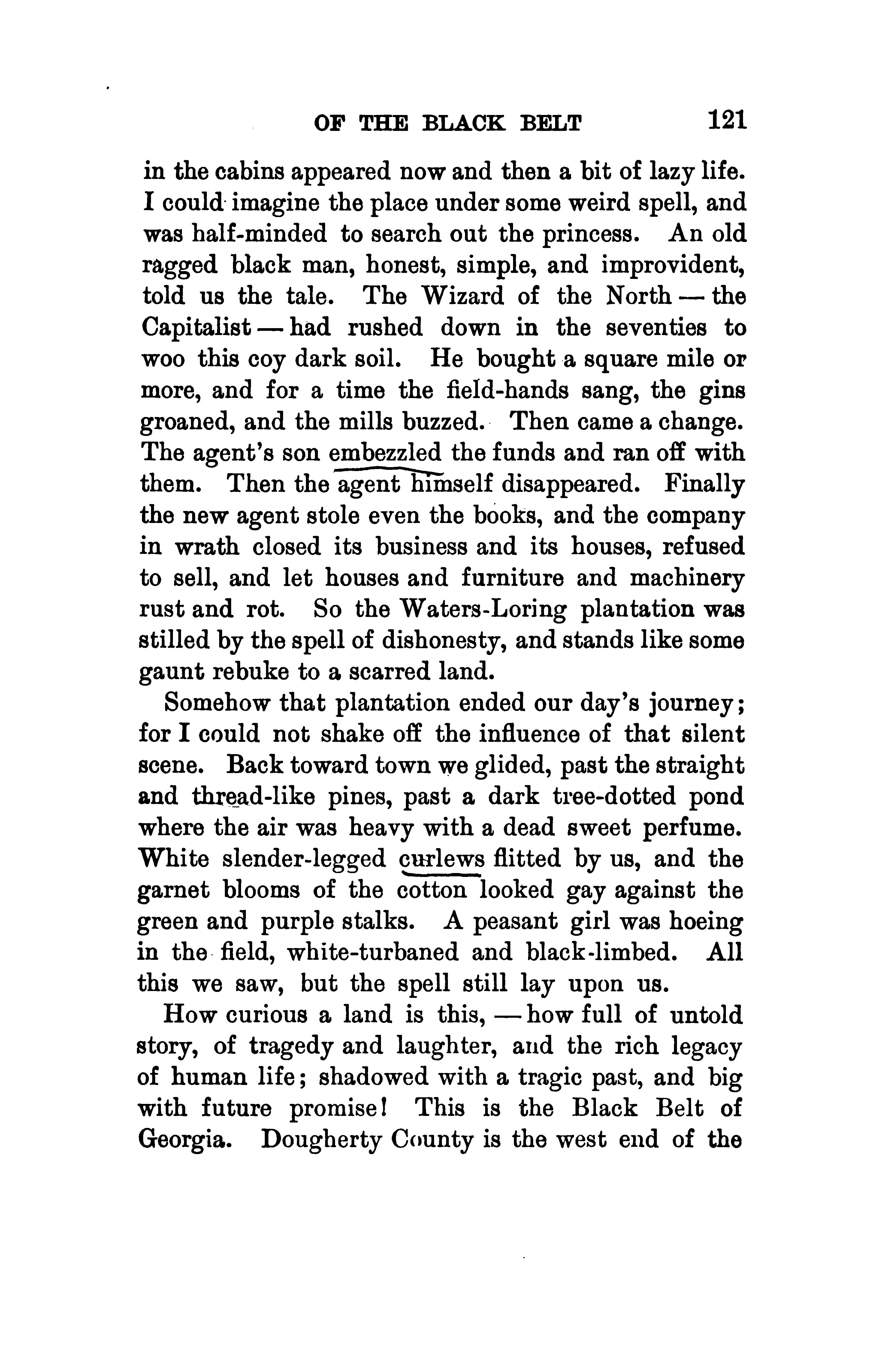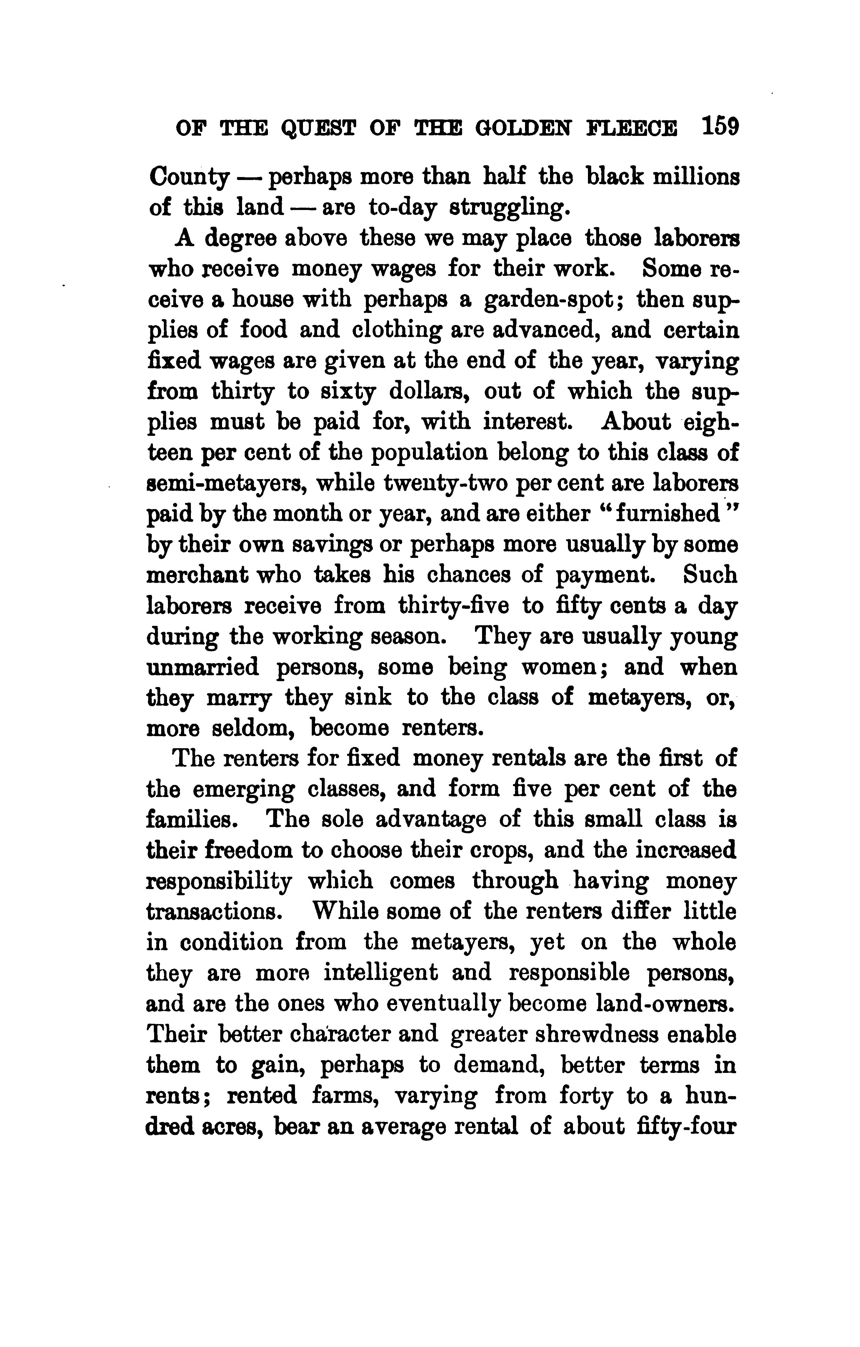 And those men of marvellous hindsight who are today seeking to preach the Negro back to the present peonage of the soil know well, or ought to know, that the opportunity of binding the Negro peasant willingly to the soil was lost on that day when the Commissioner of the Freedmen's Bureau had to go to South Carolina and tell the weeping freedmen, after their years of toil, that their land was not theirs, that there was a mistake somewhere. If by 1874 the Georgia Negro alone owned three hundred and fifty thousand acres of land, it was by grace of his thrift rather than by bounty of the government.