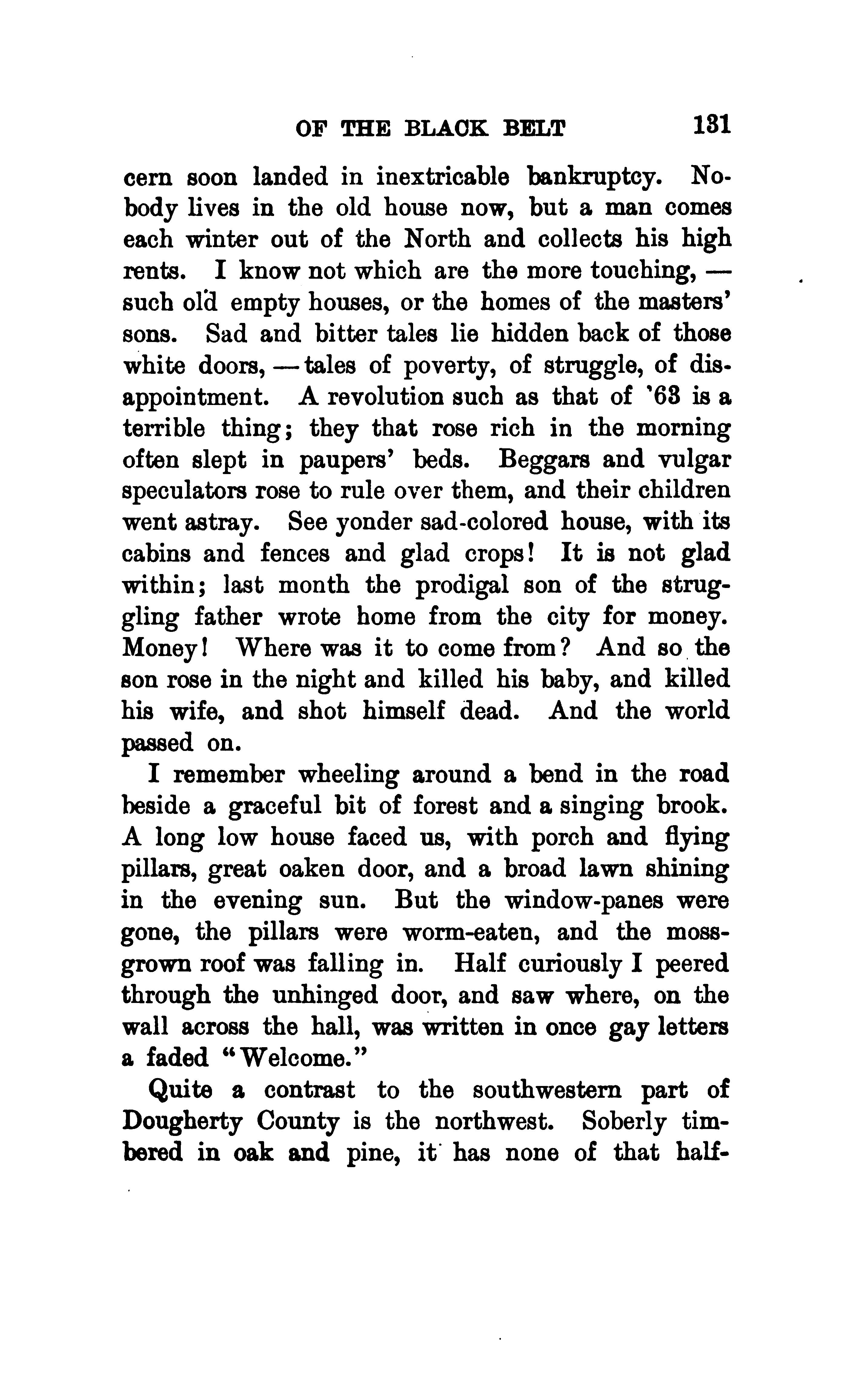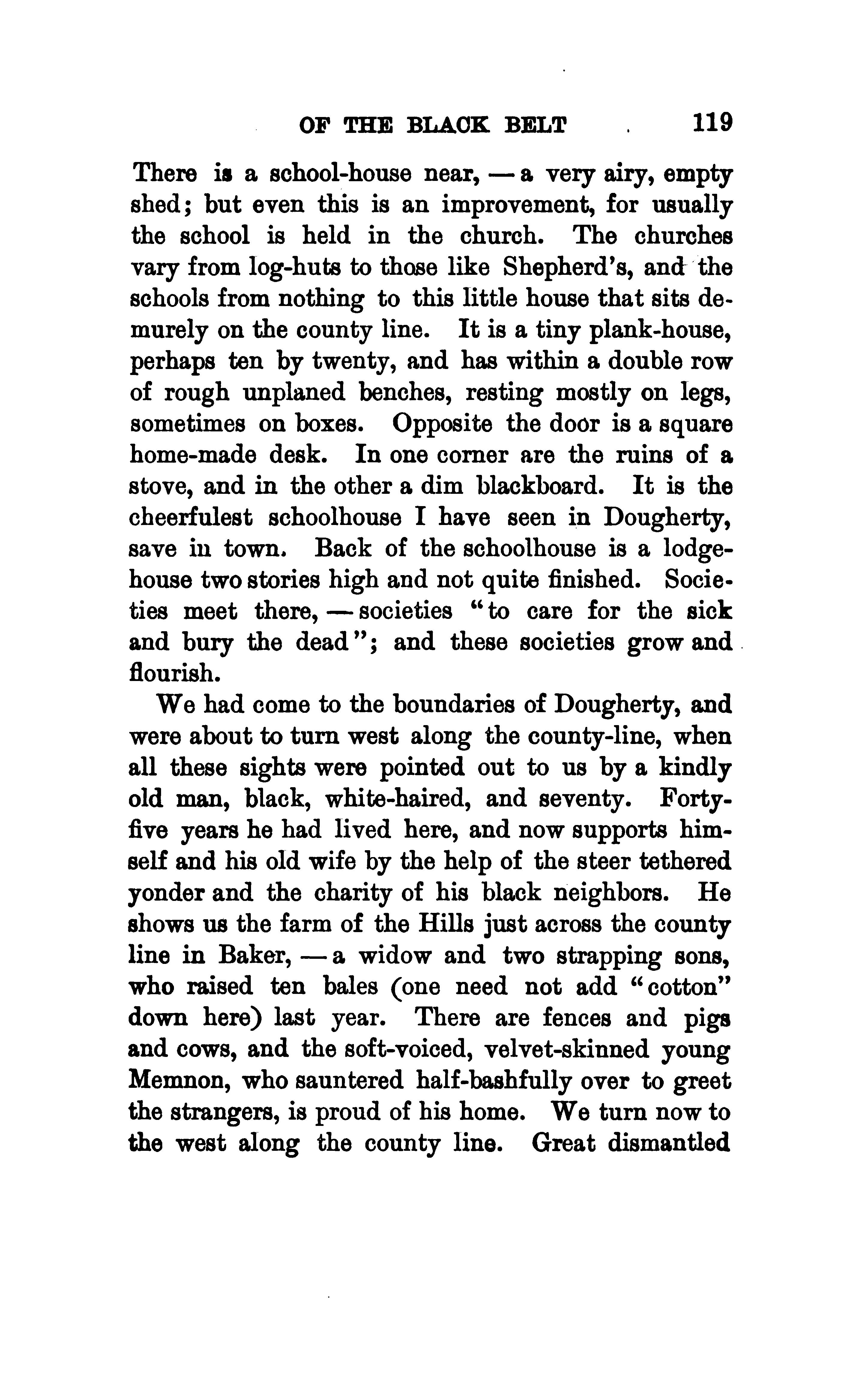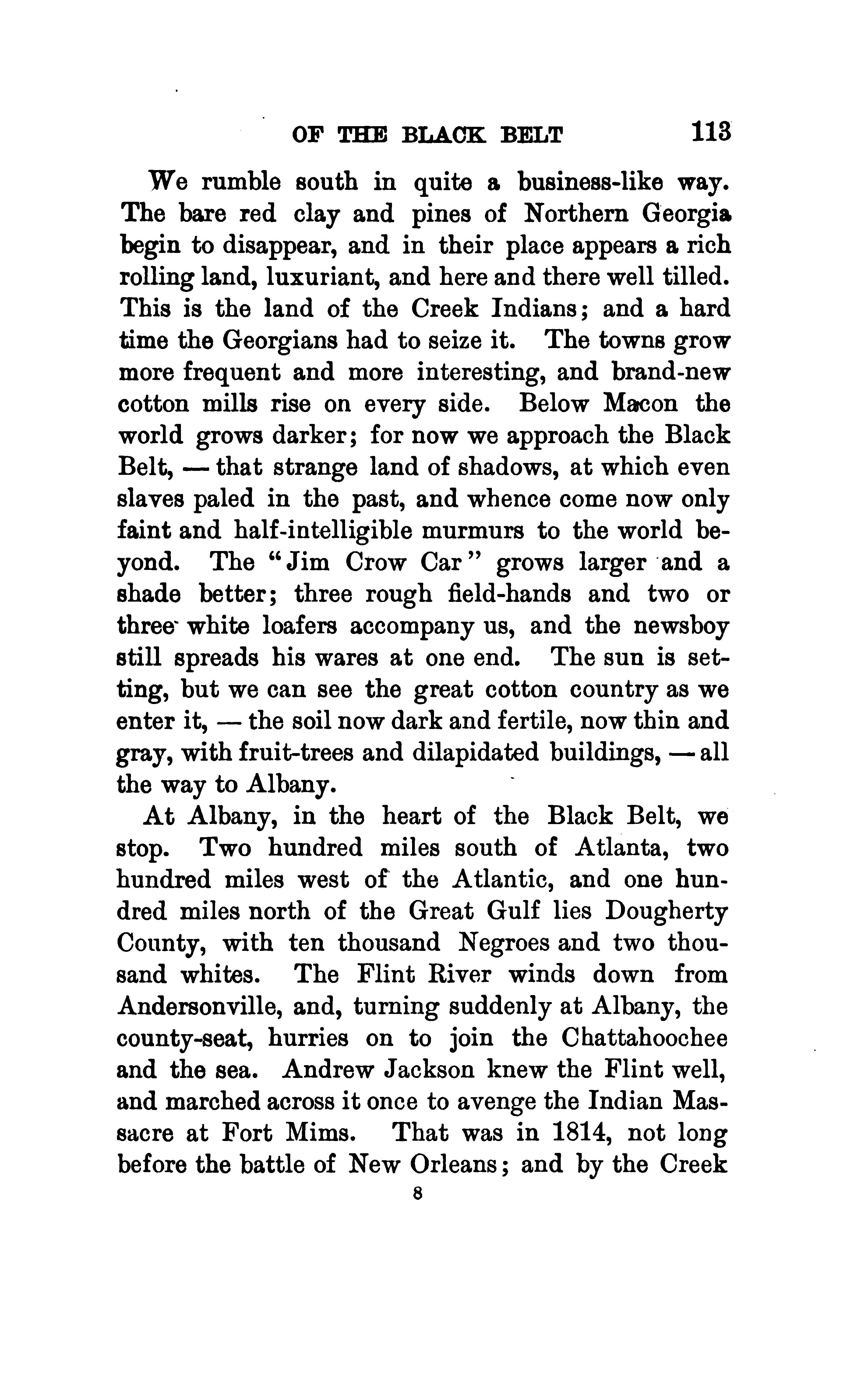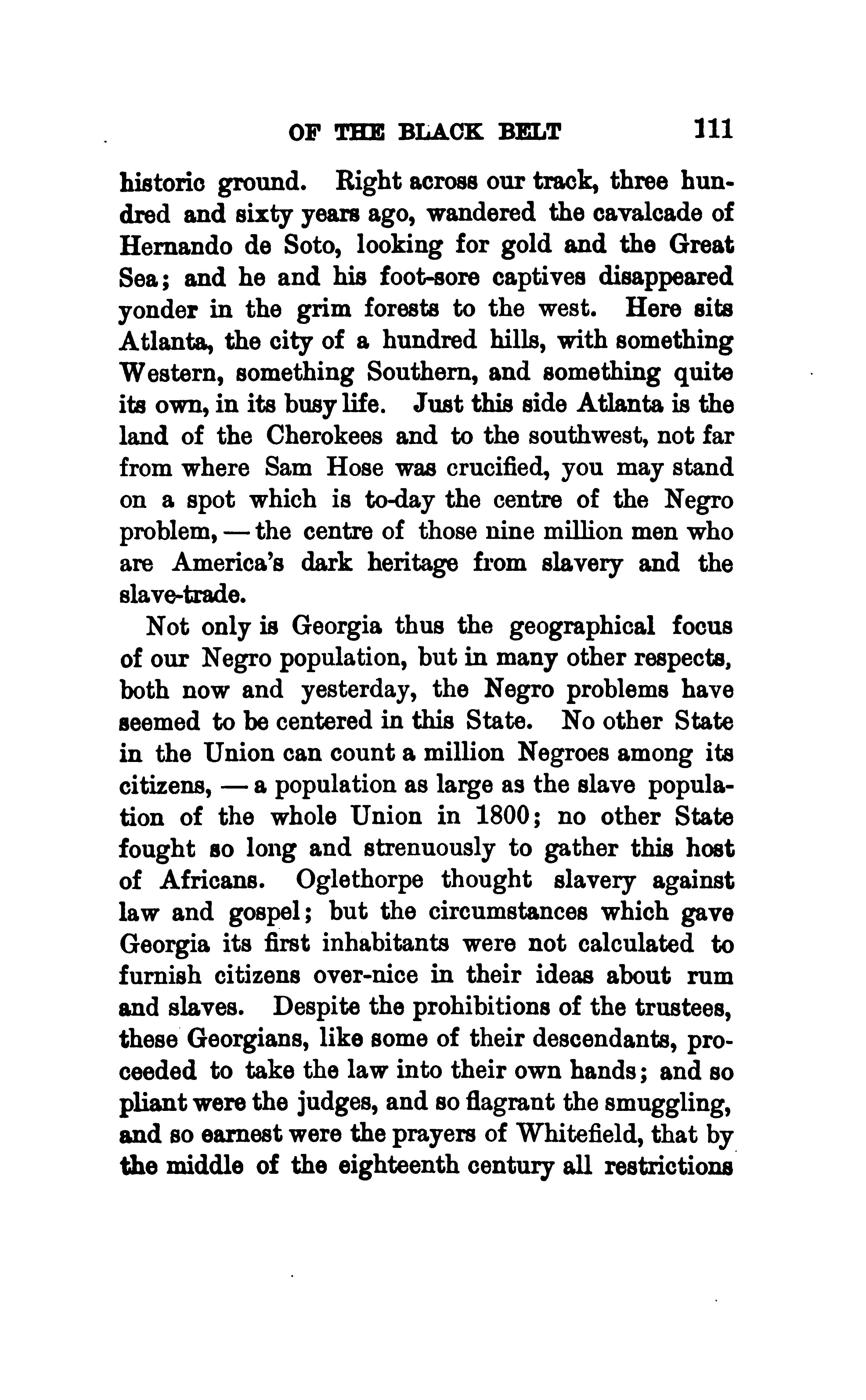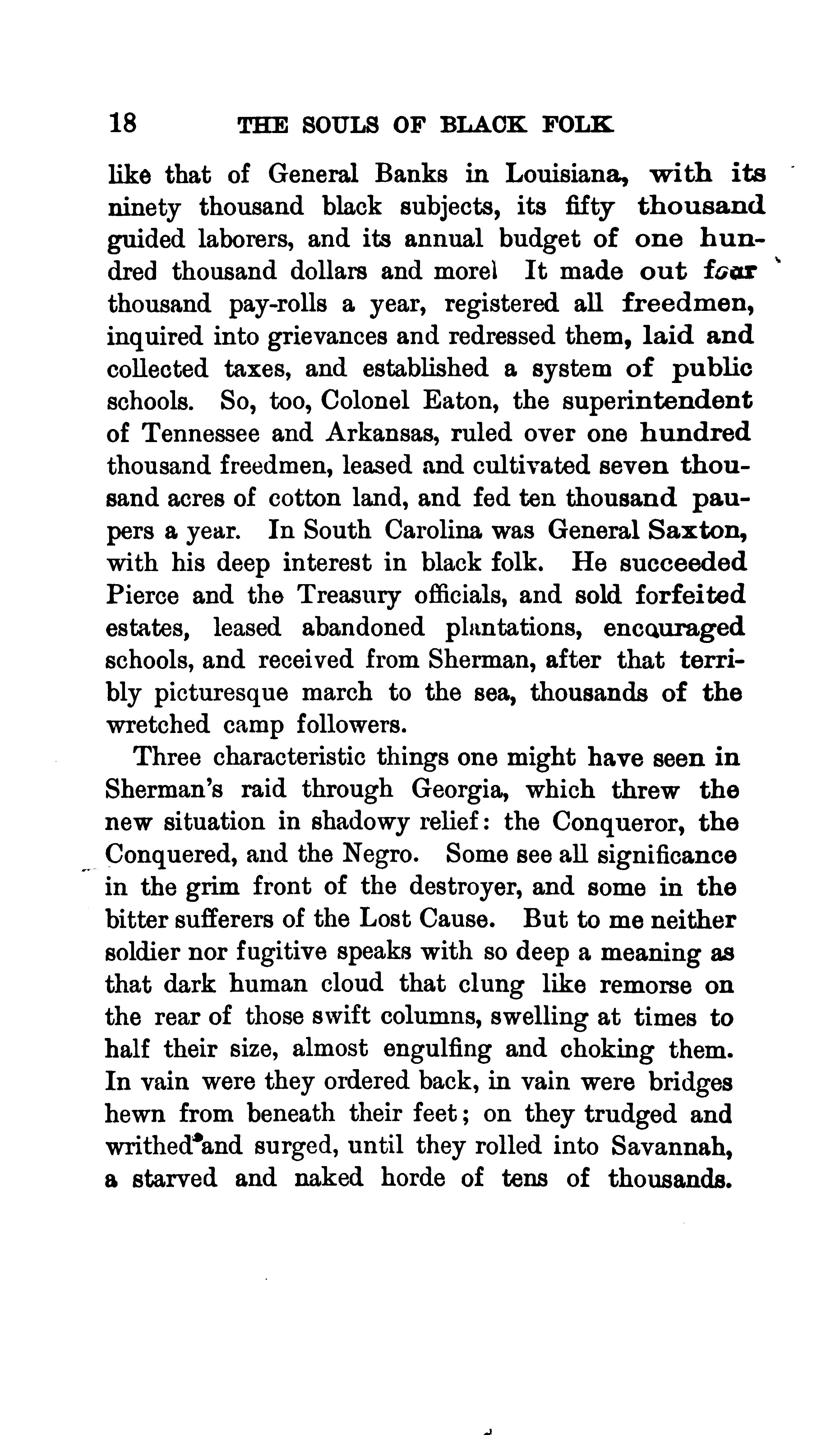 Three characteristic things one might have seen in Sherman's raid through Georgia, which threw the new situation in shadowy relief: the Conqueror, the Conquered, and the Negro. Some see all significance in the grim front of the destroyer, and some in the bitter sufferers of the Lost Cause. But to me neither soldier nor fugitive speaks with so deep a meaning as that dark human cloud that clung like remorse on the rear of those swift columns, swelling at times to half their size, almost engulfing and choking them. In vain were they ordered back, in vain were bridges hewn from beneath their feet ; on they trudged and writhed and surged, until they rolled into Savannah, a starved and naked horde of tens of thousands.