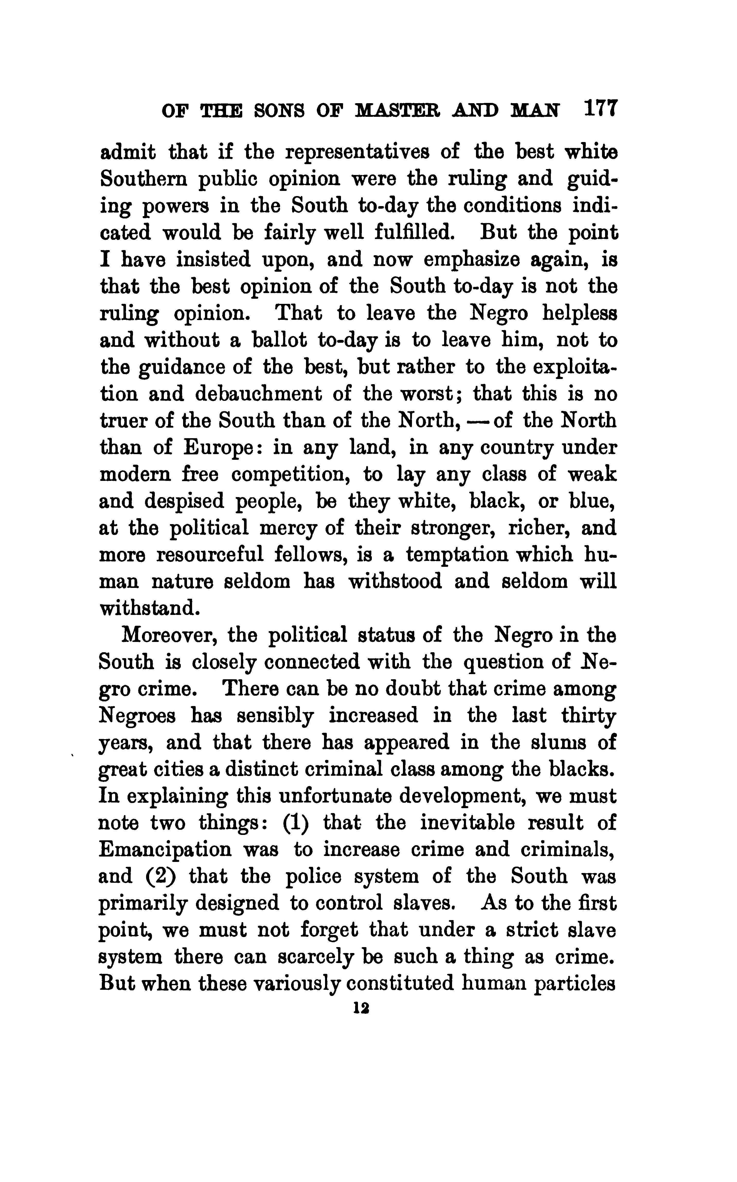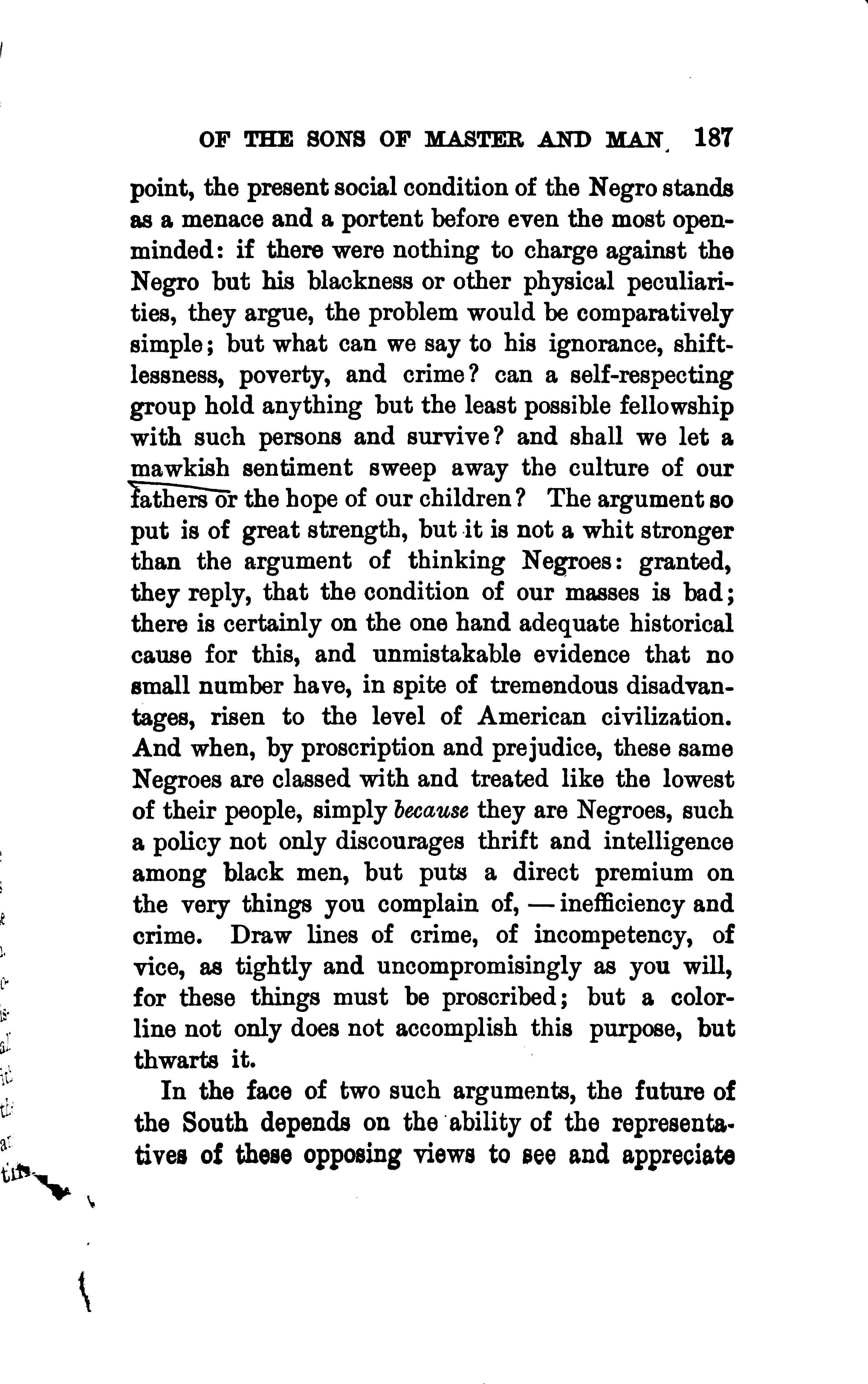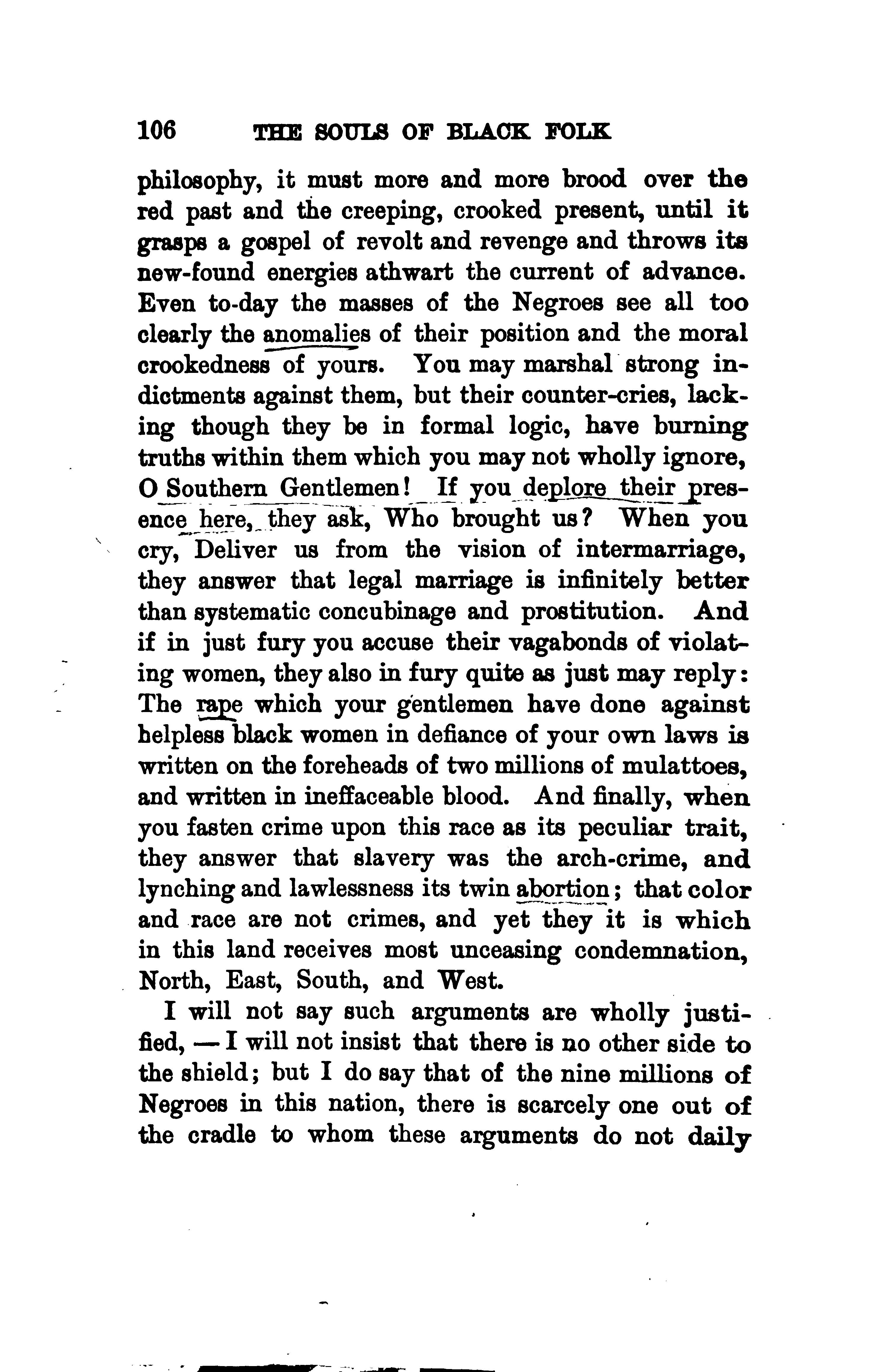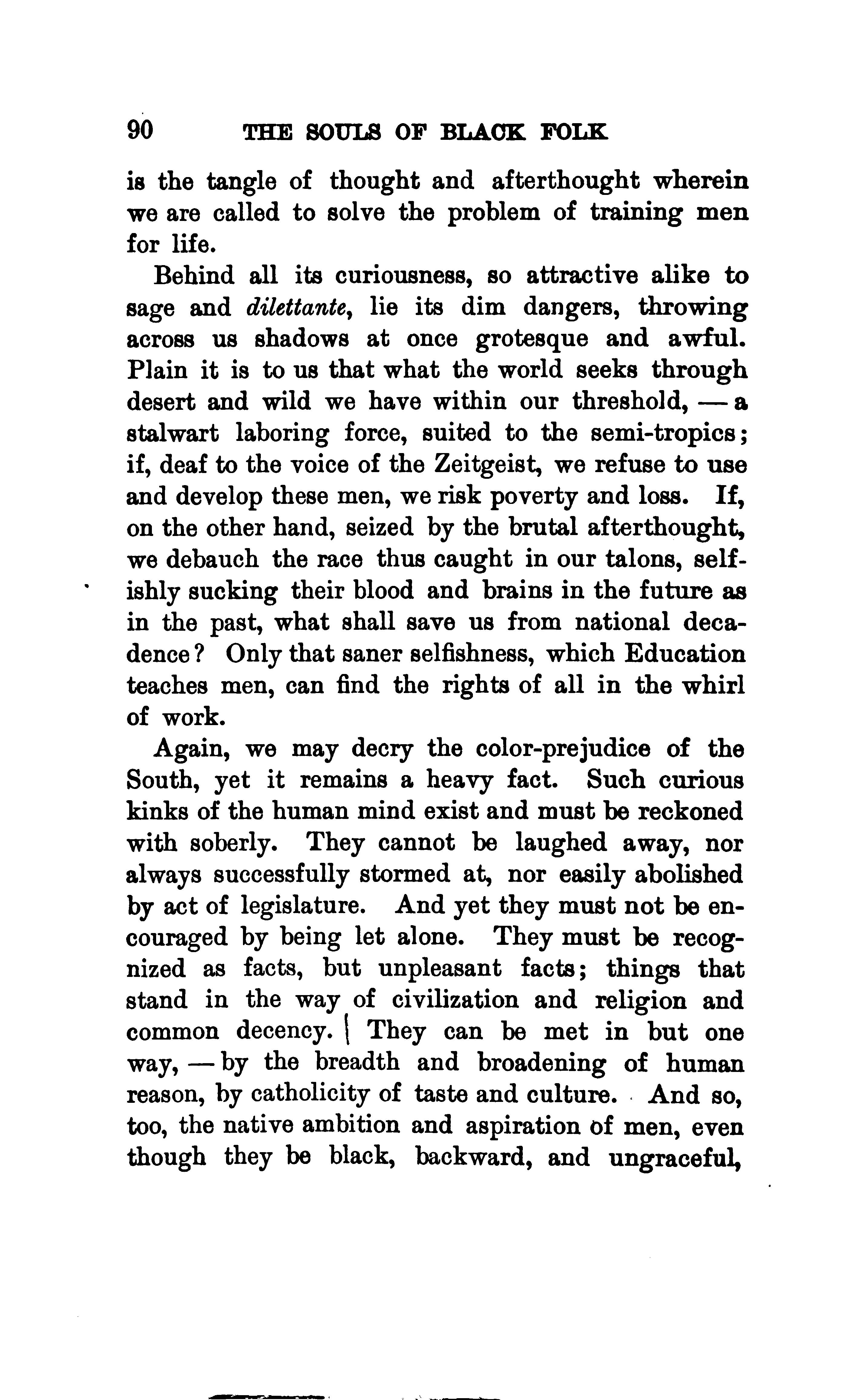 A people thus handicapped ought not to be asked to race with the world, but rather allowed to give all its time and thought to its own social problems. But alas ! while sociologists gleefully count his bastards and his prostitutes, the very soul of the toiling, sweating black man is darkened by the shadow of a vast despair. Men call the shadow prejudice, and learnedly explain it as the natural defence of culture. against barbarism, learning against ignorance, purity against crime, the "higher " against the " "lower races. To which the Negro cries Amen ! and swears that to so much of this strange prejudice as is founded on just homage to civilization, culture, righteousness, and progress, he humbly bows and meekly does obeisance. But before that nameless prejudice that leaps beyond all this he stands helpless, dismayed, and well-nigh speechless ; before that personal disrespect and mockery, the ridicule and systematic humiliation, the distortion of fact and wanton license of fancy, the cynical ignoring of the better and the boisterous welcoming ofthe worse, the all-pervading desire to inculcate disdain for everything