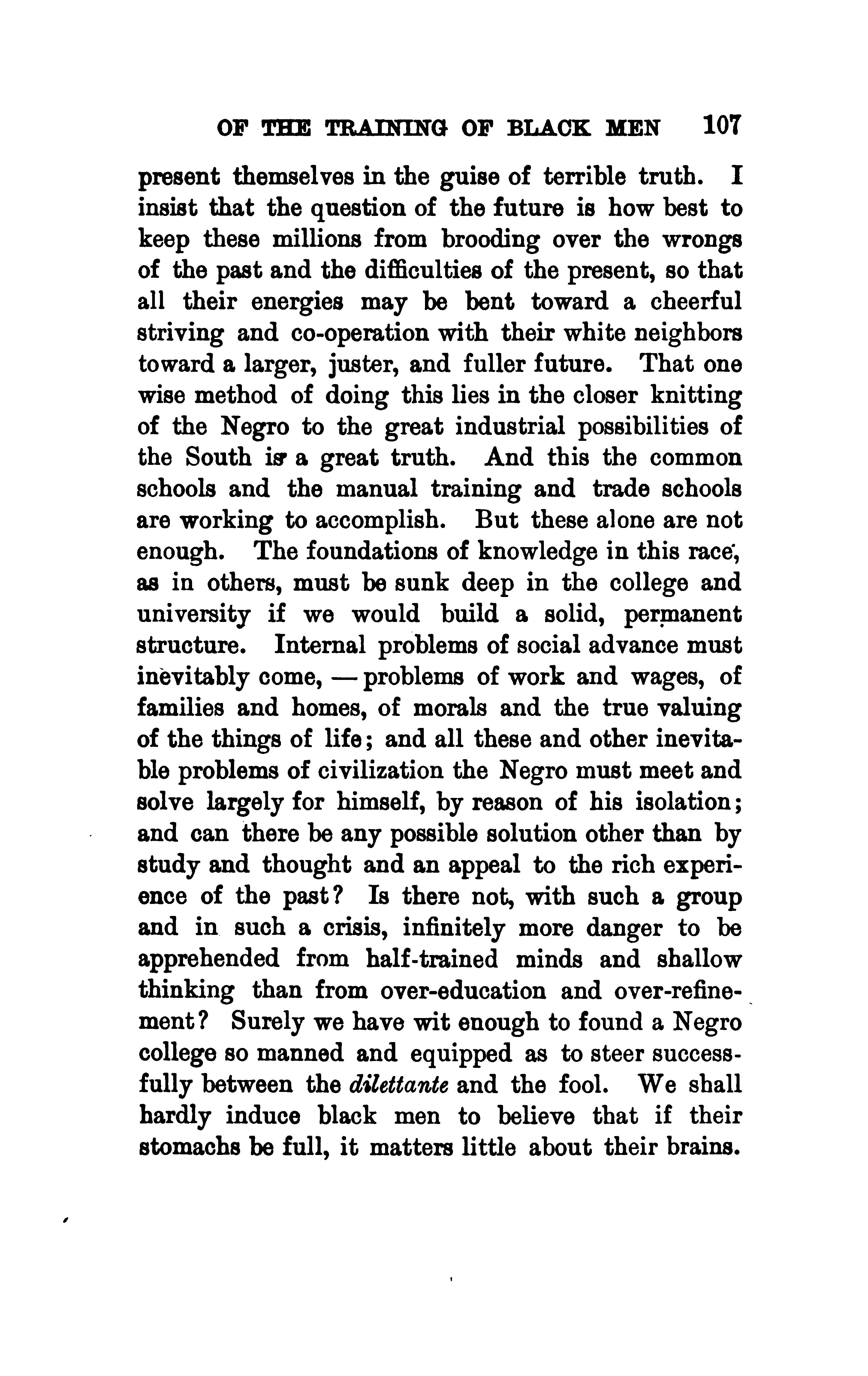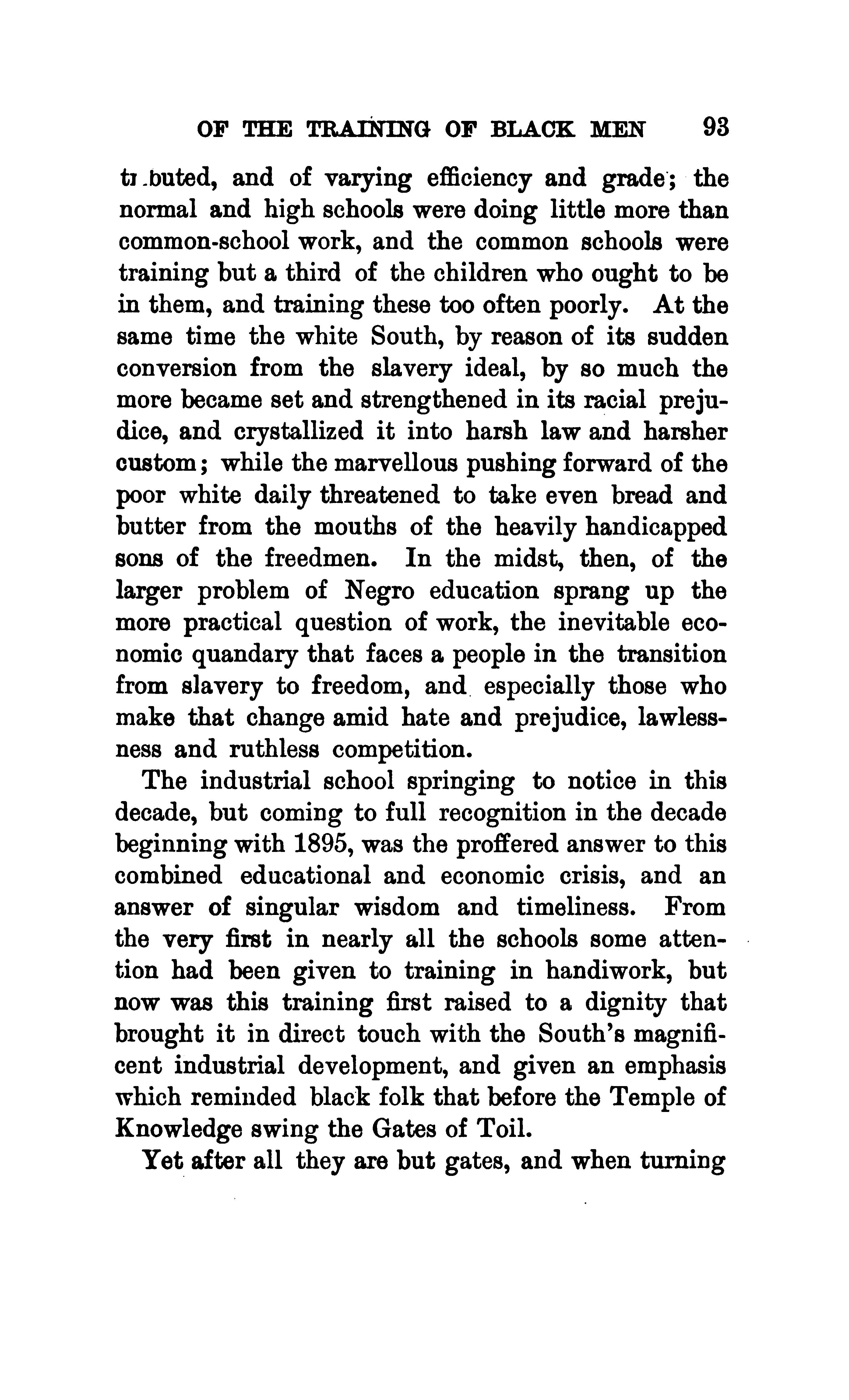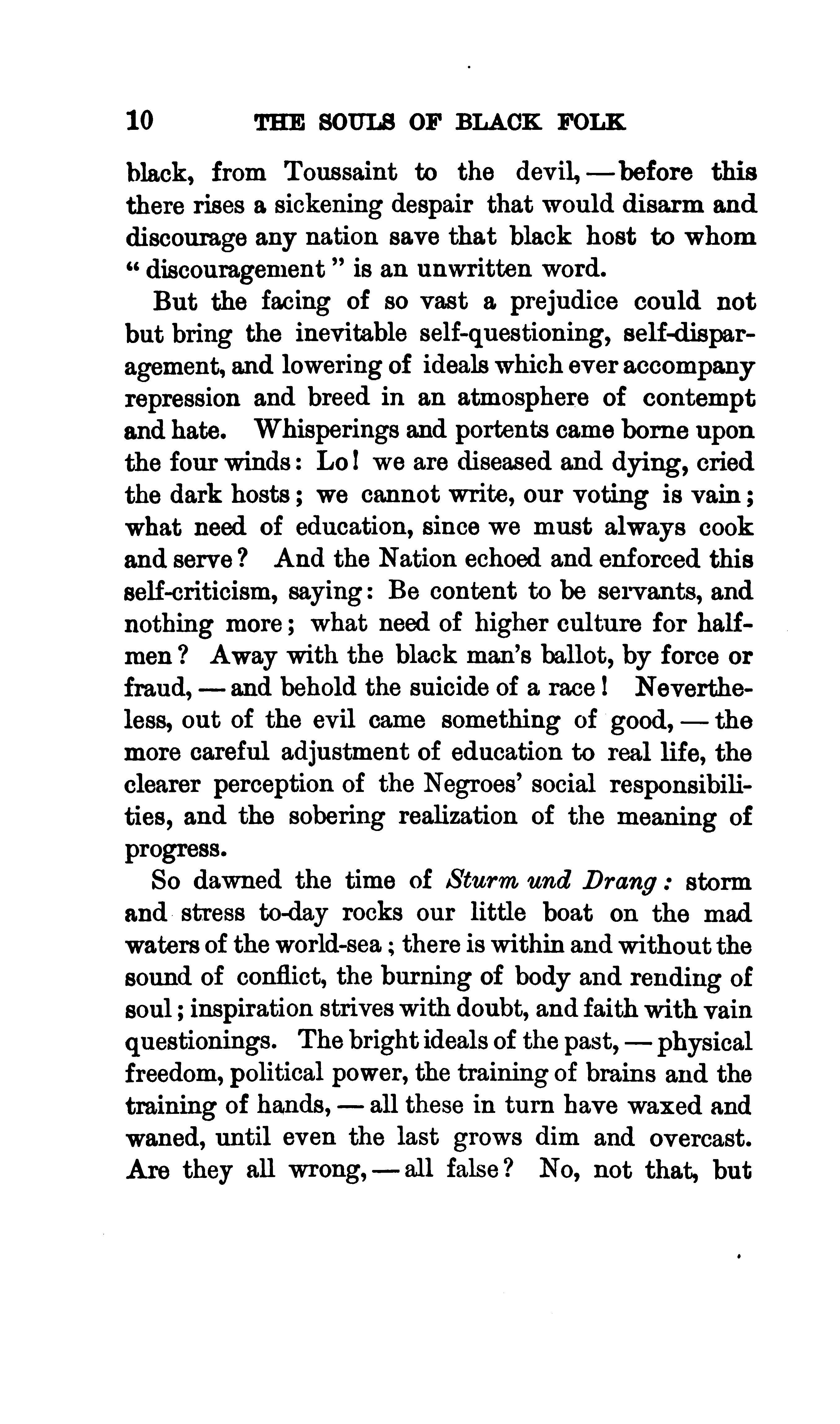 So dawned the time of Sturm und Drang : storm and stress to-day rocks our little boat on the mad waters oftheworld-sea ; there is within and withoutthe sound of conflict, the burning of body and rending of soul; inspiration strives with doubt, and faith with vain questionings. The brightideals of the past, physical freedom, political power, the training of brains and the training of hands, allthese in turn have waxed and waned, until even the last grows dim and overcast. Are they all wrong, all false? No, not that, but