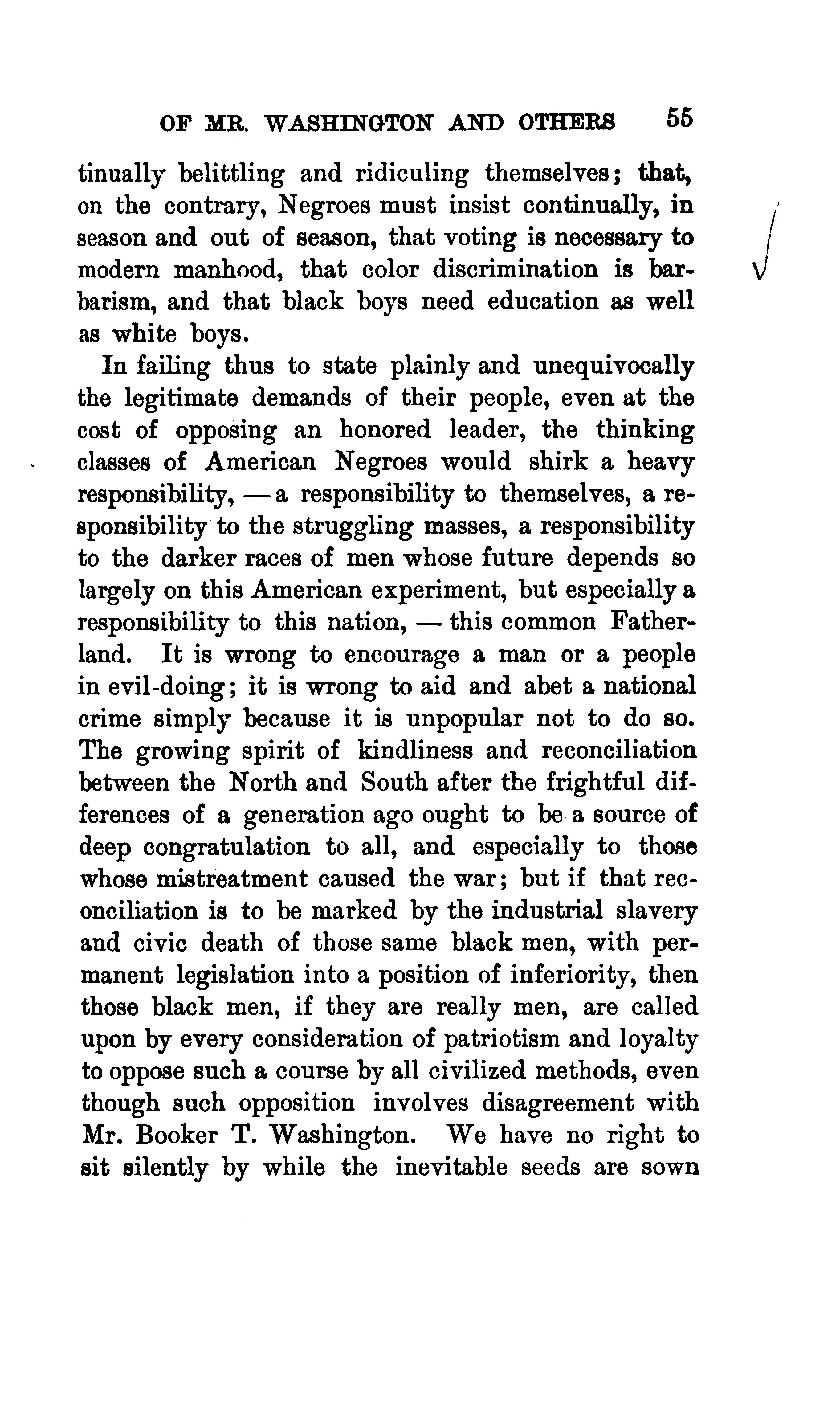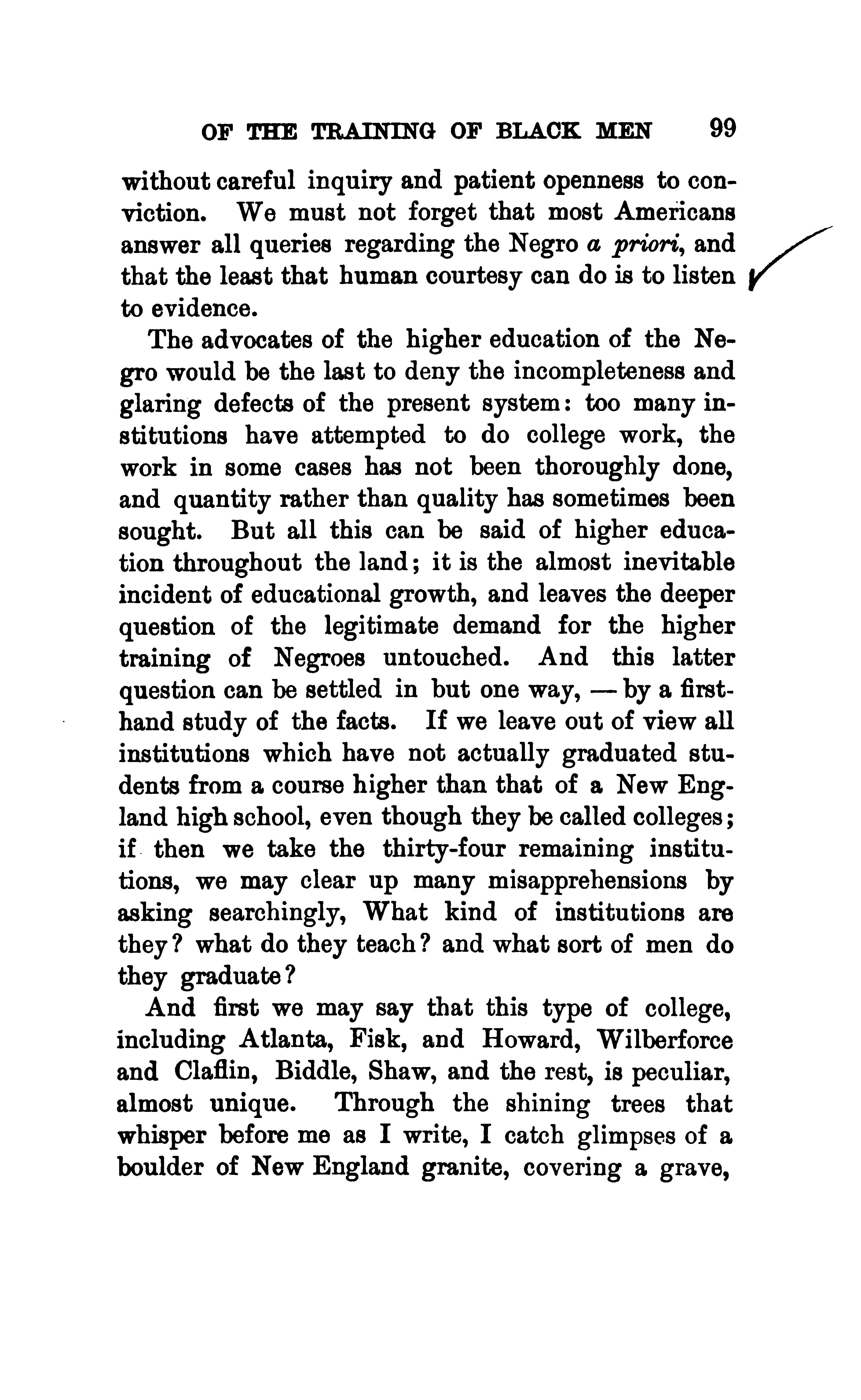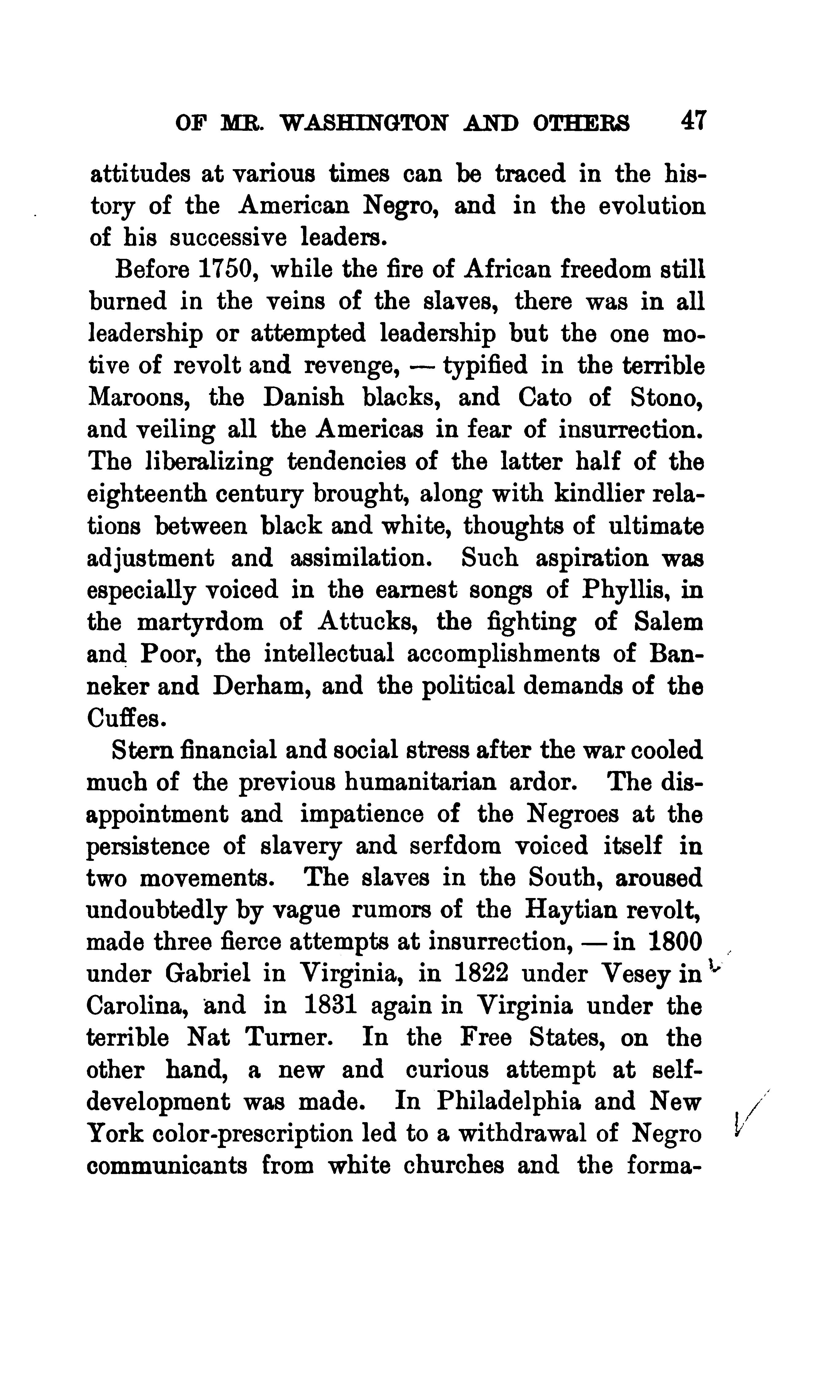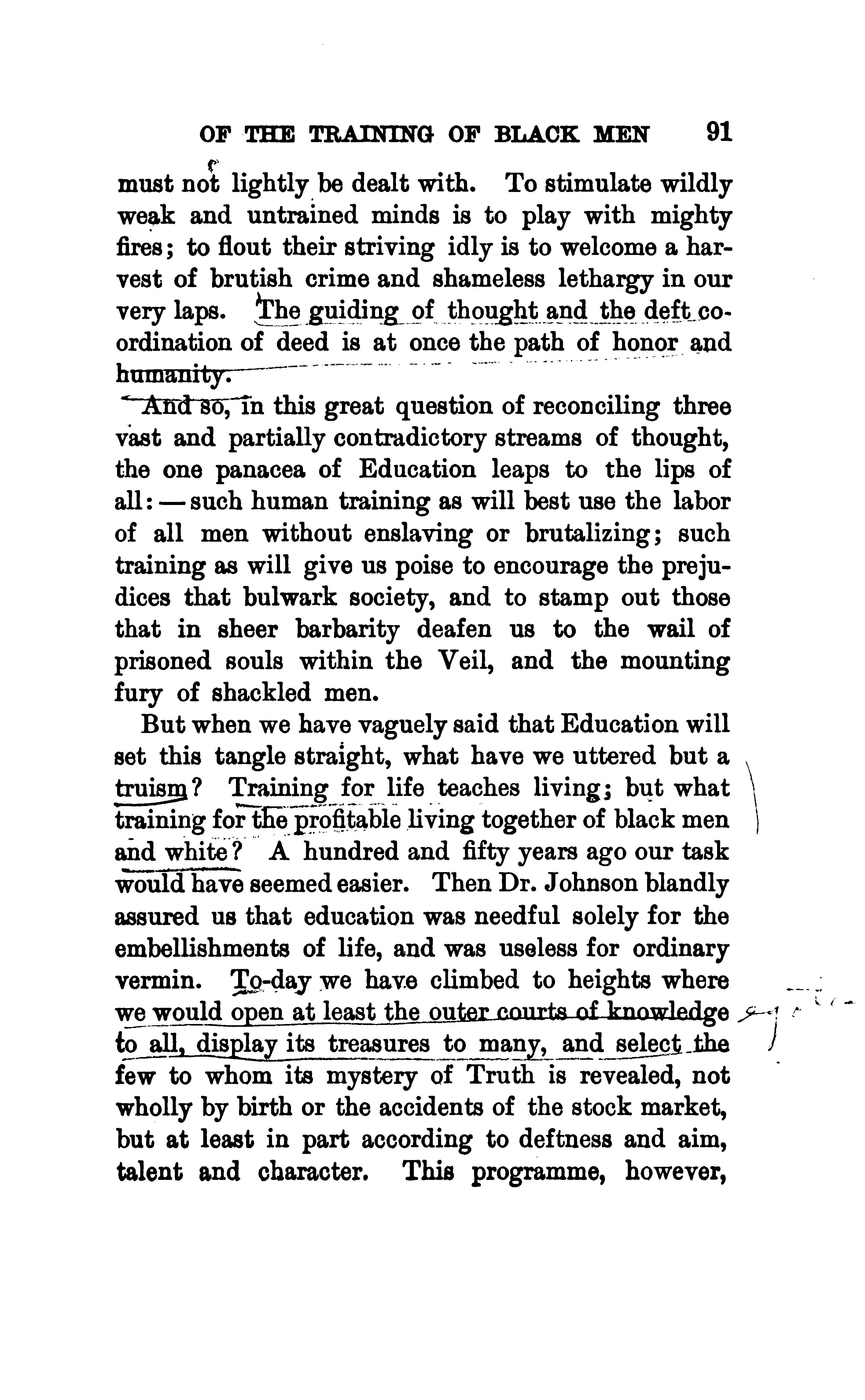 So dawned the time of Sturm und Drang : storm and stress to-day rocks our little boat on the mad waters oftheworld-sea ; there is within and withoutthe sound of conflict, the burning of body and rending of soul; inspiration strives with doubt, and faith with vain questionings. The brightideals of the past, physical freedom, political power, the training of brains and the training of hands, allthese in turn have waxed and waned, until even the last grows dim and overcast. Are they all wrong, all false? No, not that, but