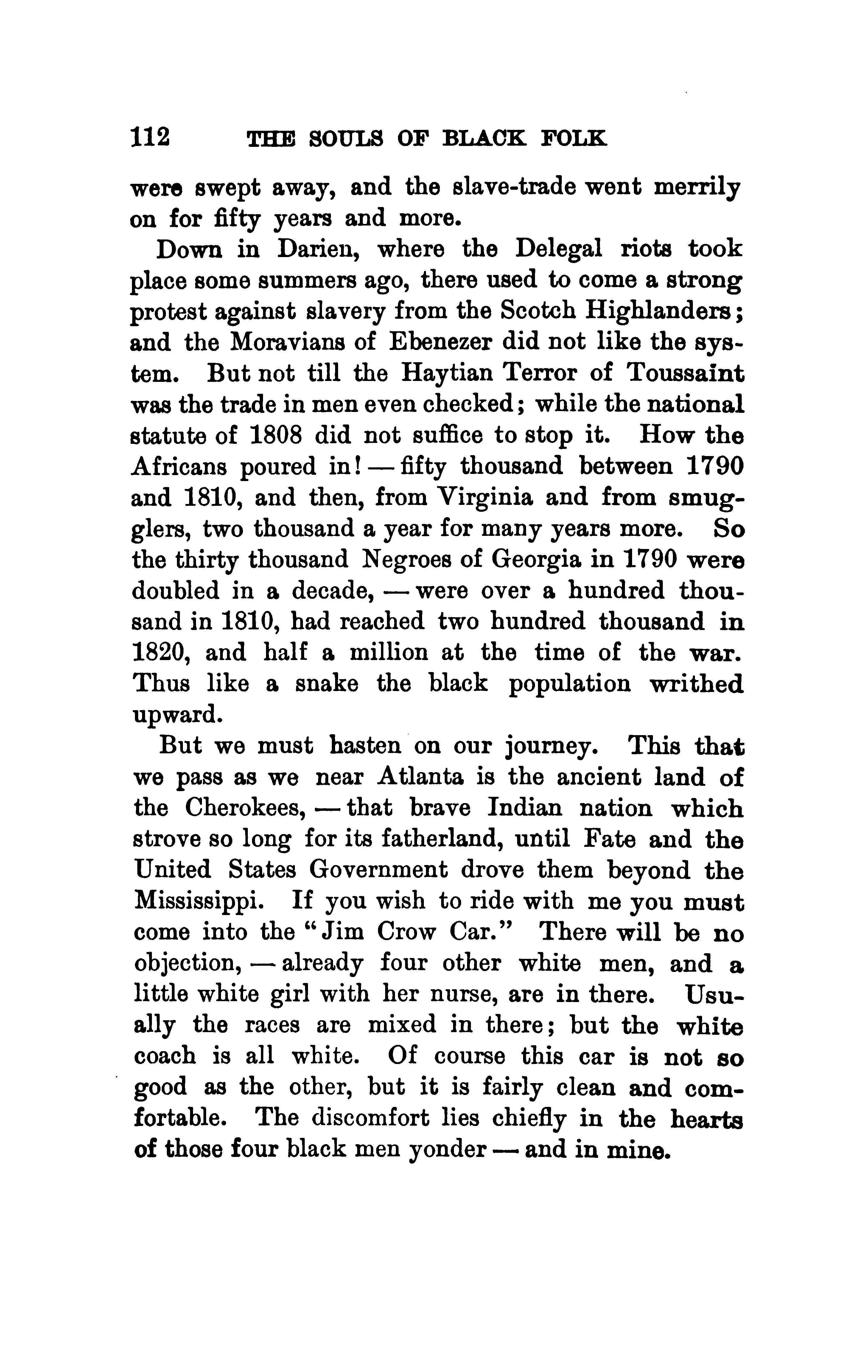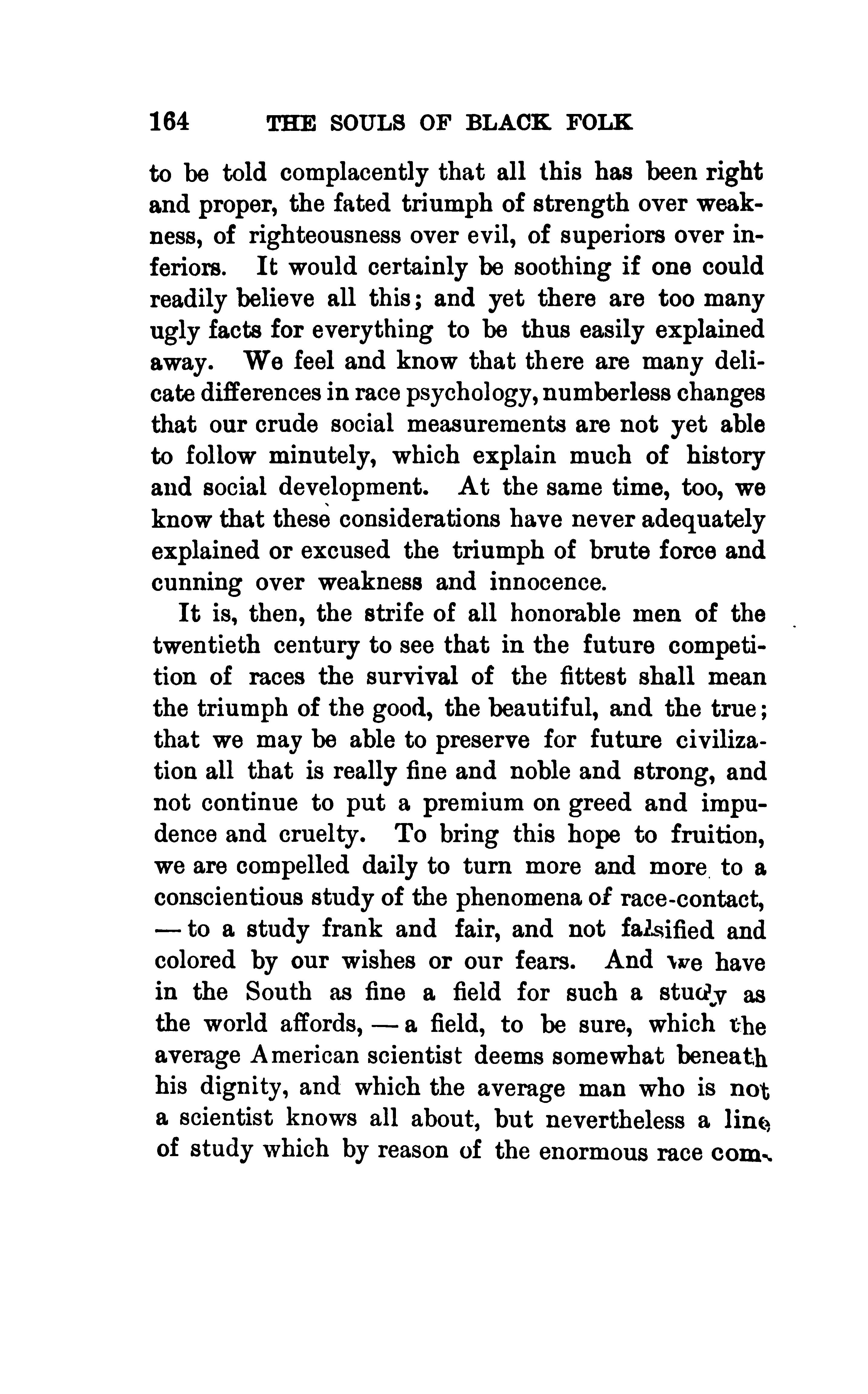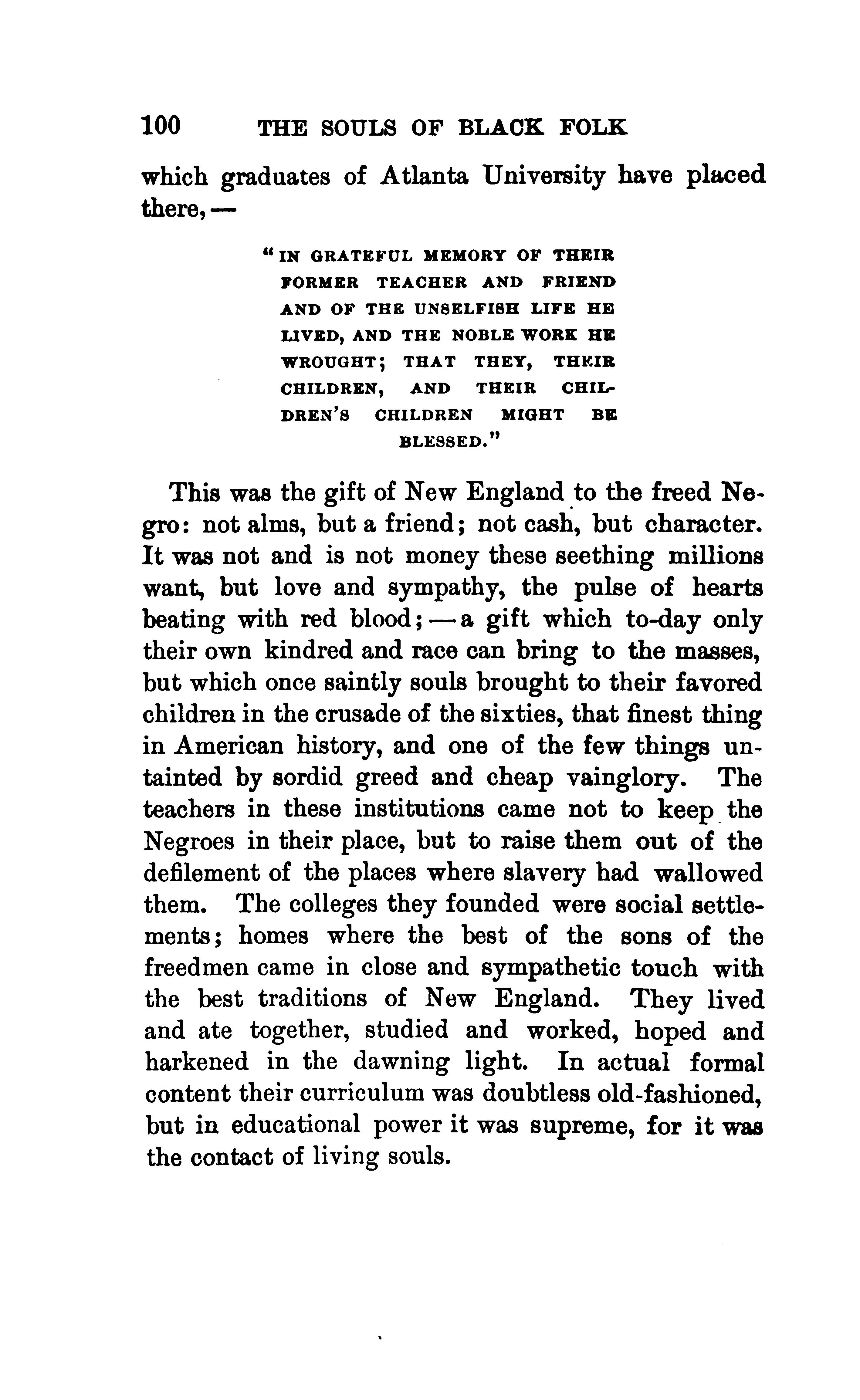 And now what I have briefly sketched in large outline let me on coming pages tell again in many ways, with loving emphasis and deeper detail, that men may listen to the striving in the souls of black folk.