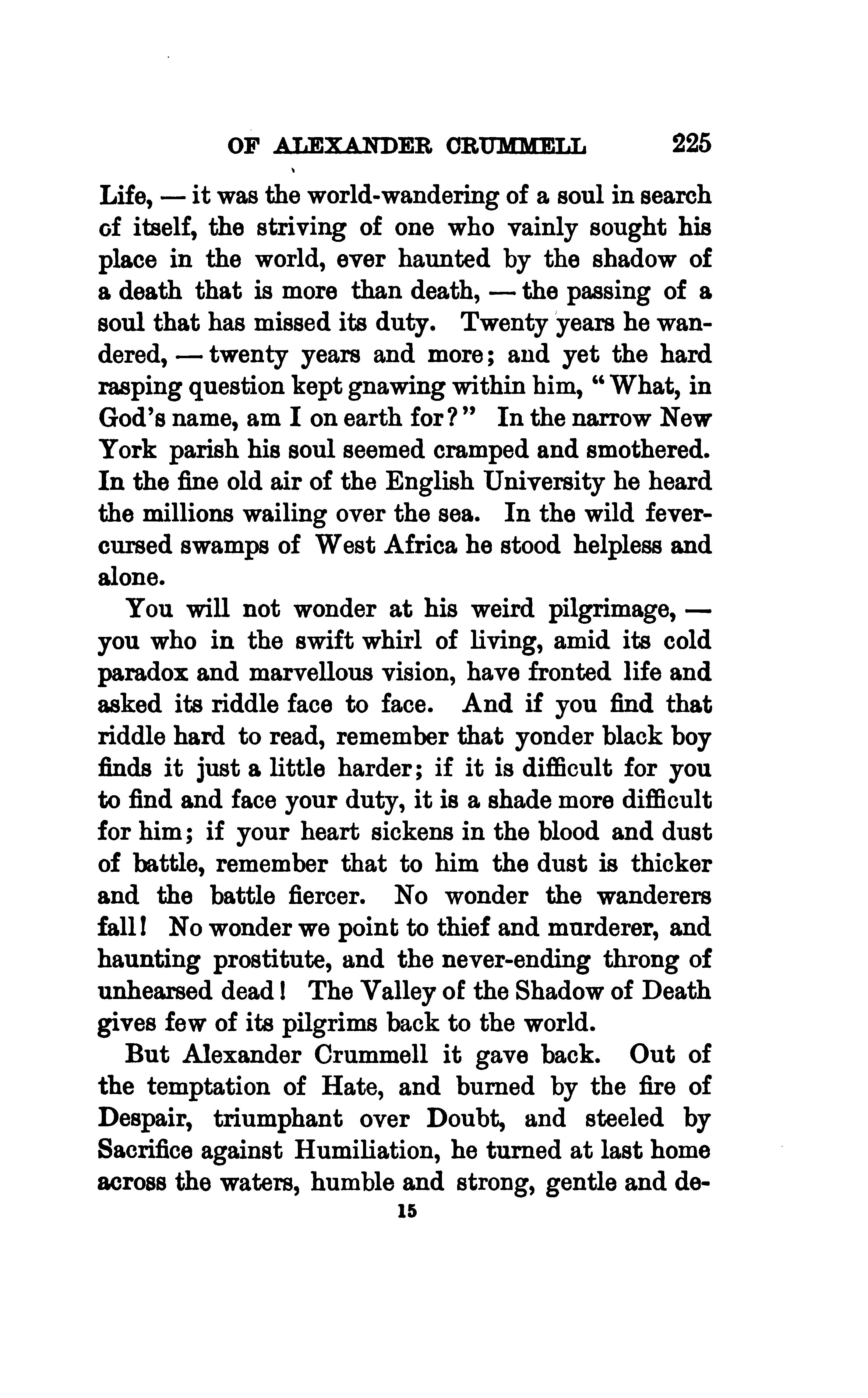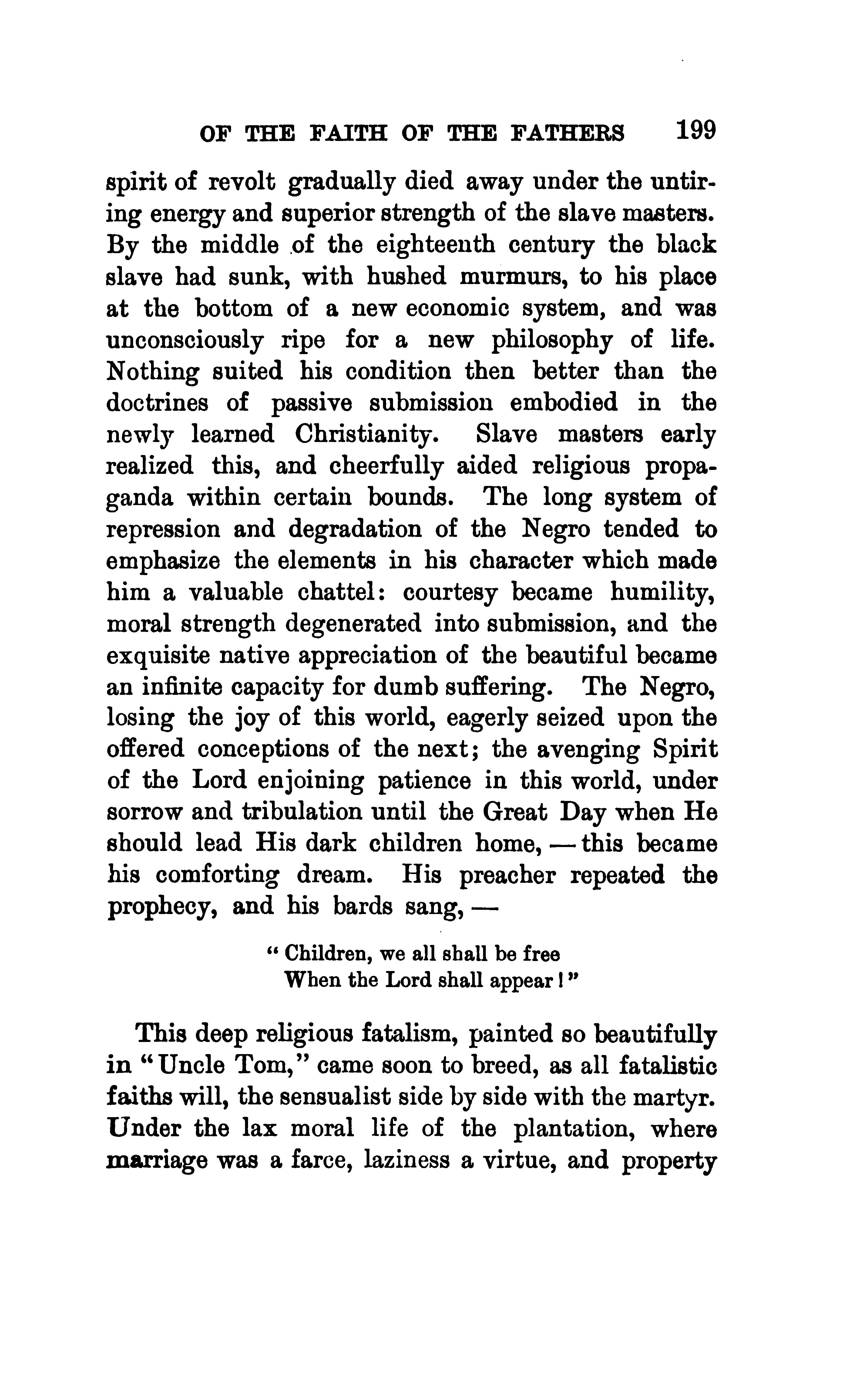The words that are left to us are not without interest, and, cleared of evident dross, they conceal much of real poetry and meaning beneath conventional theology and unmeaning rhapsody. Like all primitive folk, the slave stood near to Nature's heart. Life was a "rough and rolling sea" like the brown Atlantic of the Sea Islands; the "Wilderness " was the home of God, and the " lonesome valley " led to 17