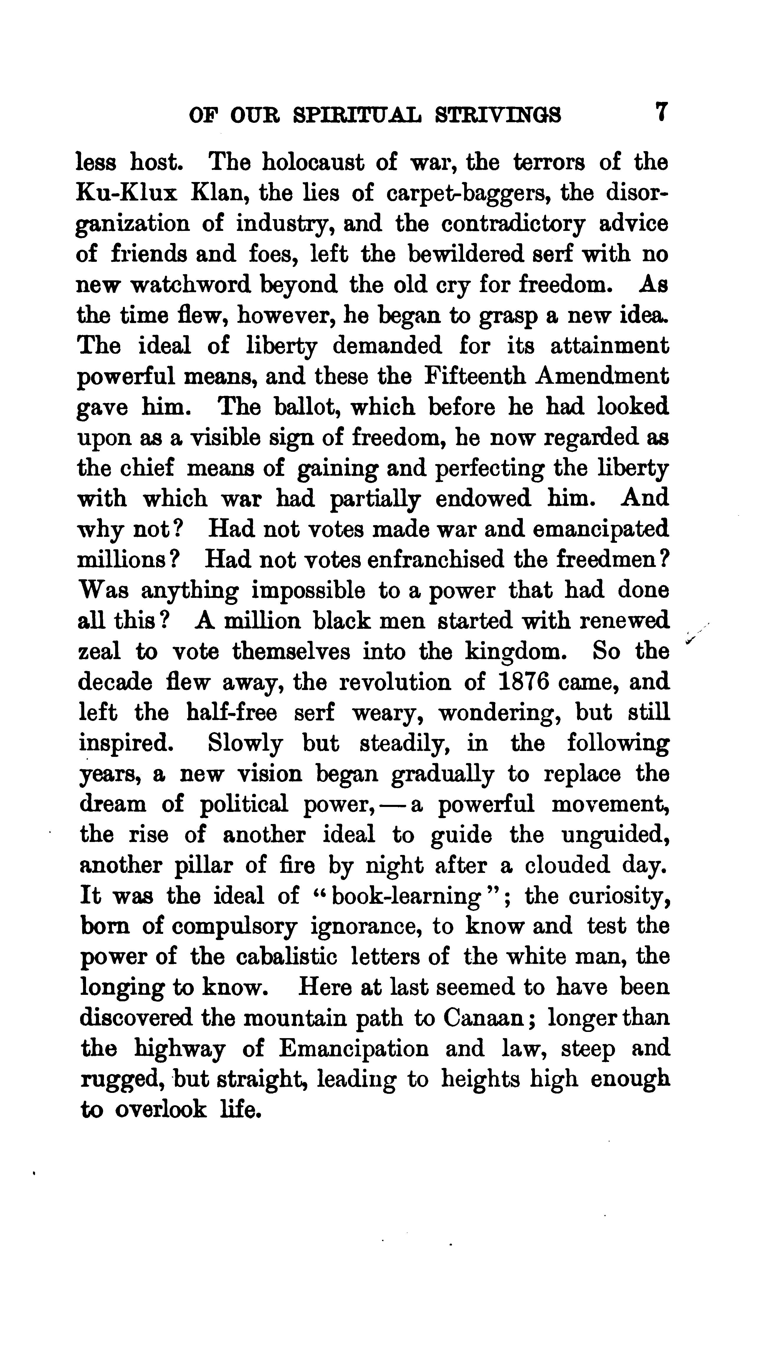 less host. The holocaust of war, the terrors of the Ku-Klux Klan, the lies of carpet-baggers, the disorganization of industry, and the contradictory advice of friends and foes, left the bewildered serf with no new watchword beyond the old cry for freedom. As the time flew, however, he began to grasp a new idea. The ideal of liberty demanded for its attainment powerful means, and these the Fifteenth Amendment gave him. The ballot, which before he had looked upon as a visible sign of freedom, he now regarded as the chief means of gaining and perfecting the liberty with which war had partially endowed him. And why not? Had not votes made war and emancipated millions? Had not votes enfranchised the freedmen? Was anything impossible to a power that had done all this? A million black men started with renewed zeal to vote themselves into the kingdom. So the decade flew away, the revolution of 1876 came, and left the half-free serf weary, wondering, but still inspired. Slowly but steadily, in the following years, a new vision began gradually to replace the dream of political power, -a powerful movement, the rise of another ideal to guide the unguided, another pillar of fire by night after a clouded day. It was the ideal of " book-learning "; the curiosity, born of compulsory ignorance, to know and test the power of the cabalistic letters of the white man, the longing to know. Here at last seemed to have been discovered the mountain path to Canaan ; longerthan the highway of Emancipation and law, steep and rugged, but straight, leading to heights high enough to overlook life.
