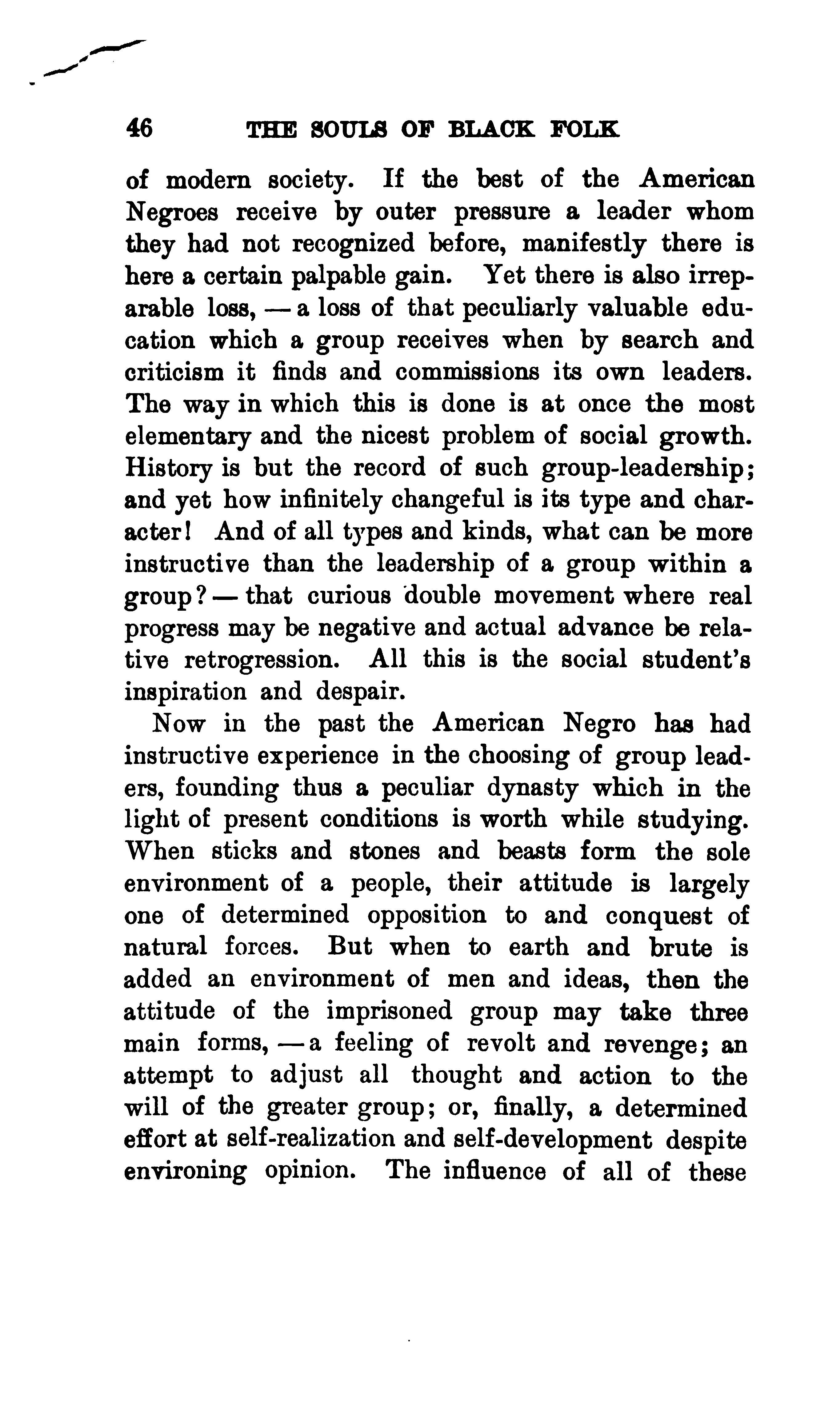 The historyofthe American Negro is the history of this strife, this longing to attain self-conscious manhood, to merge his double self into a better and truer self. In this merging he wishes neither of the older selves to be lost. He would not Africanize America, for Americahas too much to teach the world and Africa. He would not bleach his Negro soul in a flood of white Americanism, for he knows that Negro blood has a message for the world. He simply wishes to make it possible for a man to be both a Negro and an American, without being cursed and spit upon by his fellows, without having the doors of Opportunity closed roughly in his face. This, then, is the end of his striving : to be a coworkerin the kingdomof culture, to escape both death and isolation, to husband and use his best powers and his latent genius. These powers of body and mind have in the past been strangely wasted, dispersed, or forgotten. The shadow of a mighty Negro past flits through the taleof Ethiopiathe Shadowy and of Egypt the Sphinx. Throughout history, the powers of single black men flash here and there like falling stars, and die sometimes before the world has rightly gauged their brightness. Here in America, in the few days since Emancipation, the black man's turning hither and thither in hesitant and doubtful striving has often made his very strength to lose effectiveness, to seem like absence of power, like weakness. And yet it is not weakness, it is the contradiction of double aims. The double-aimed struggle of the black artisan on the one hand to escape white contempt fora nation of merehewers of wood anddrawers- -