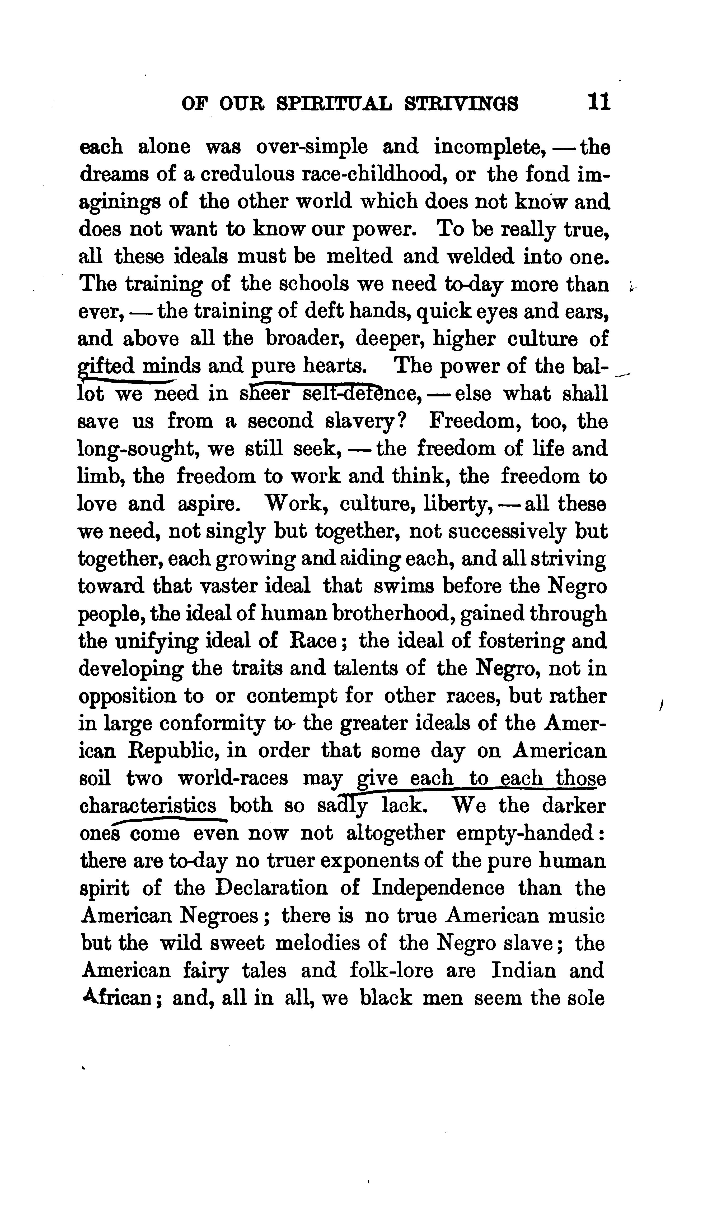 each alone was over-simple and incomplete, the dreams of a credulous race-childhood, or the fond imaginings of the other world which does not know and does not want to know our power. To be really true, all these ideals must be melted and welded into one. The training of the schools we need to-day more than ever, the training of deft hands, quick eyes and ears, and above all the broader, deeper, higher culture of gifted minds and pure hearts. The power ofthe ballot we need in sheer self-defence, save us from a second slavery? Freedom, too, the long-sought, we still seek, the freedom of life and limb, the freedom to work and think, the freedom to love and aspire. Work, culture, liberty, all these we need, not singly but together, not successively but together, each growing andaiding each, and all striving toward that vaster ideal that swims before the Negro people,the ideal ofhuman brotherhood, gained through the unifying ideal of Race ; the ideal of fostering and developing the traits and talents of the Negro, not in opposition to or contempt for other races, but rather in large conformity to the greater ideals ofthe American Republic, in order that some day on American soil two world-races may give each to each those characteristics both so sadly lack. We the darker ones come even now not altogether empty-handed : there are to-day no truer exponents of the pure human spirit of the Declaration of Independence than the American Negroes ; there is no true American music but the wild sweet melodies of the Negro slave ; the American fairy tales and folk-lore are Indian and African ; and, all in all, we black men seem the sole