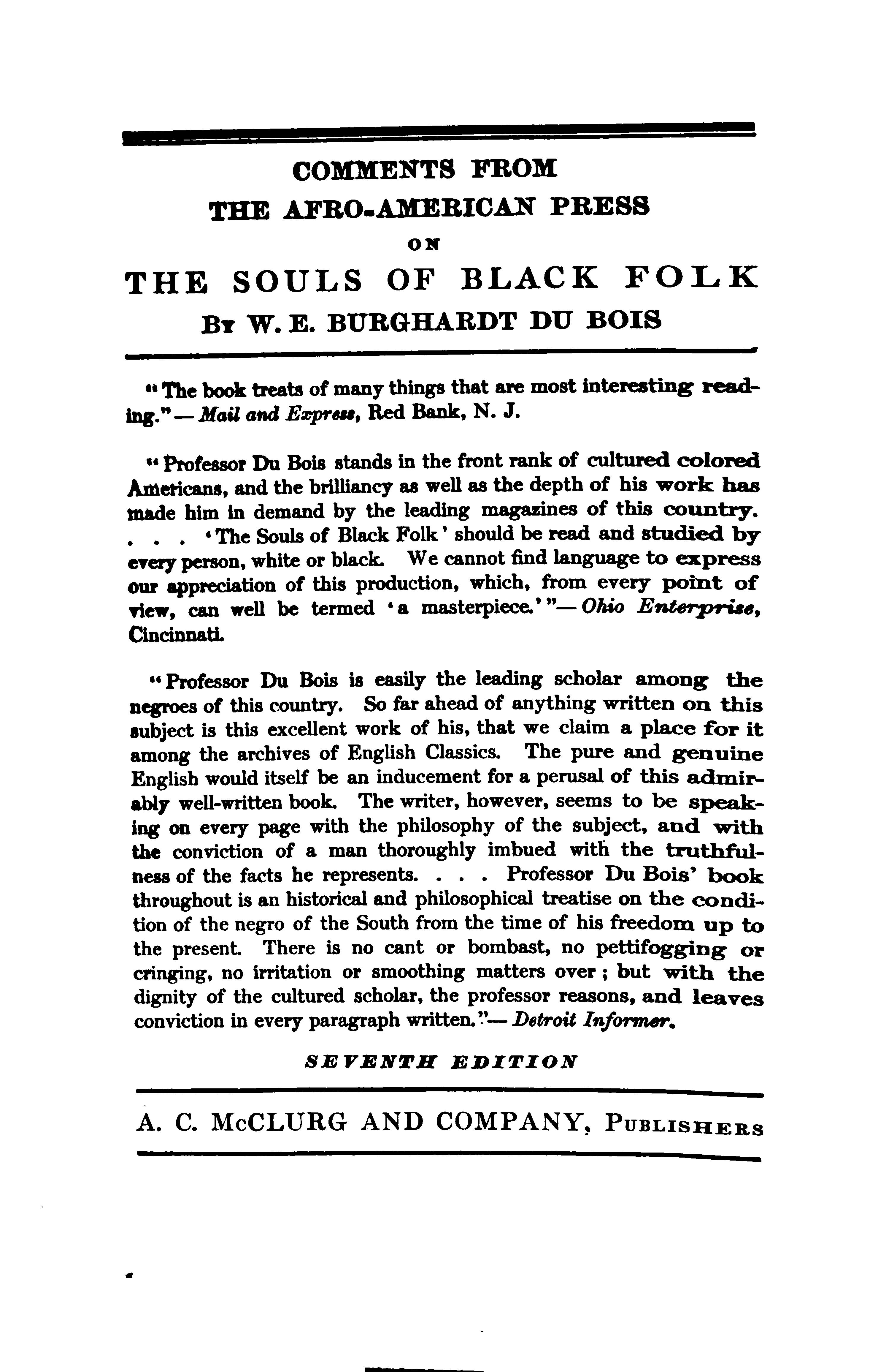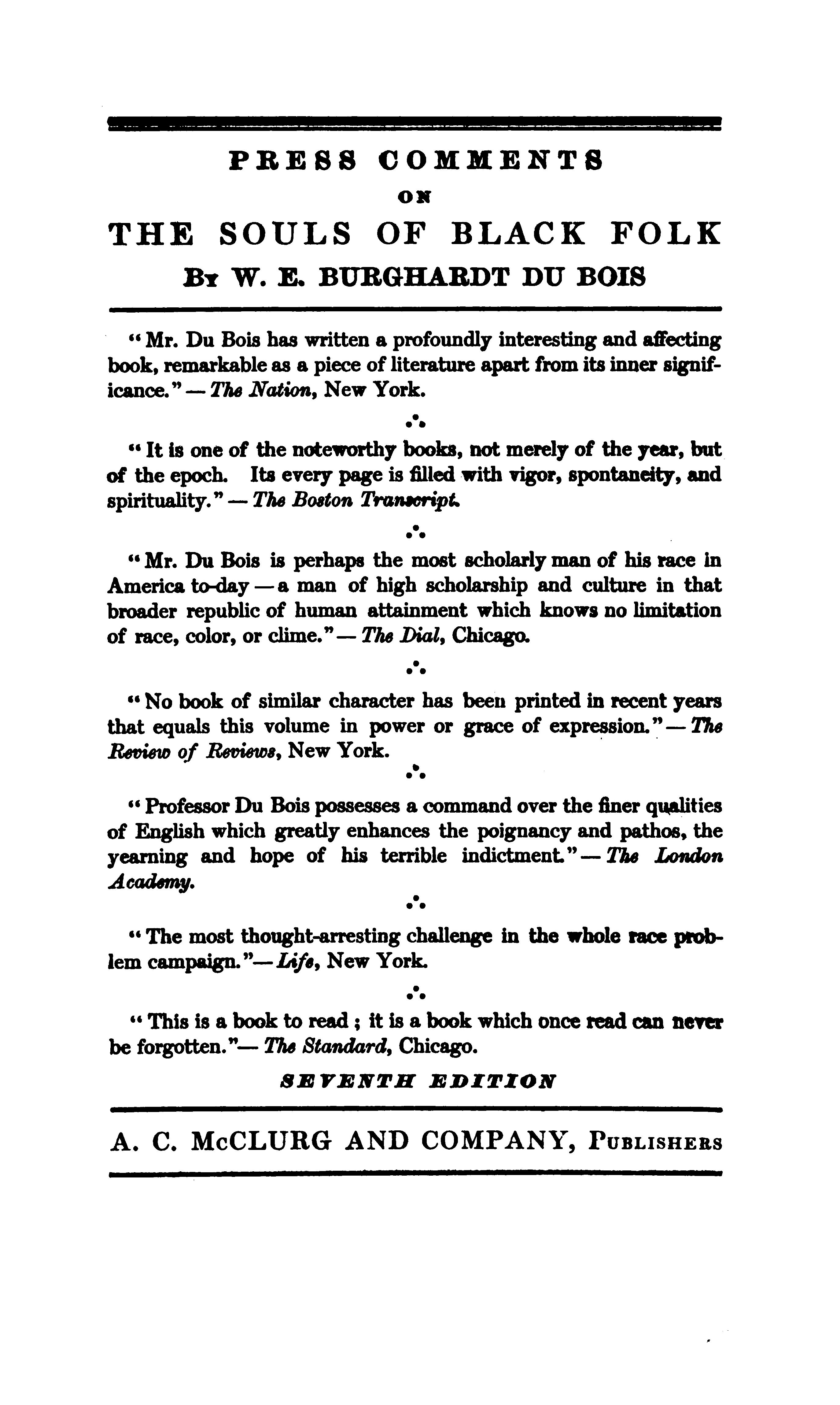 66 " In The Soulsof Black Folk,' byW. E. Burghardt DuBois, we have a work of peculiar power and penetration. It impresses the reader as a sort of psychological vivisection, so to speak, a stripping bare of the moral and mental anatomy of the African in America, so as to reveal the naked soul in its primitive simplicity, seared and scarred byages of suffering."-New York Age.