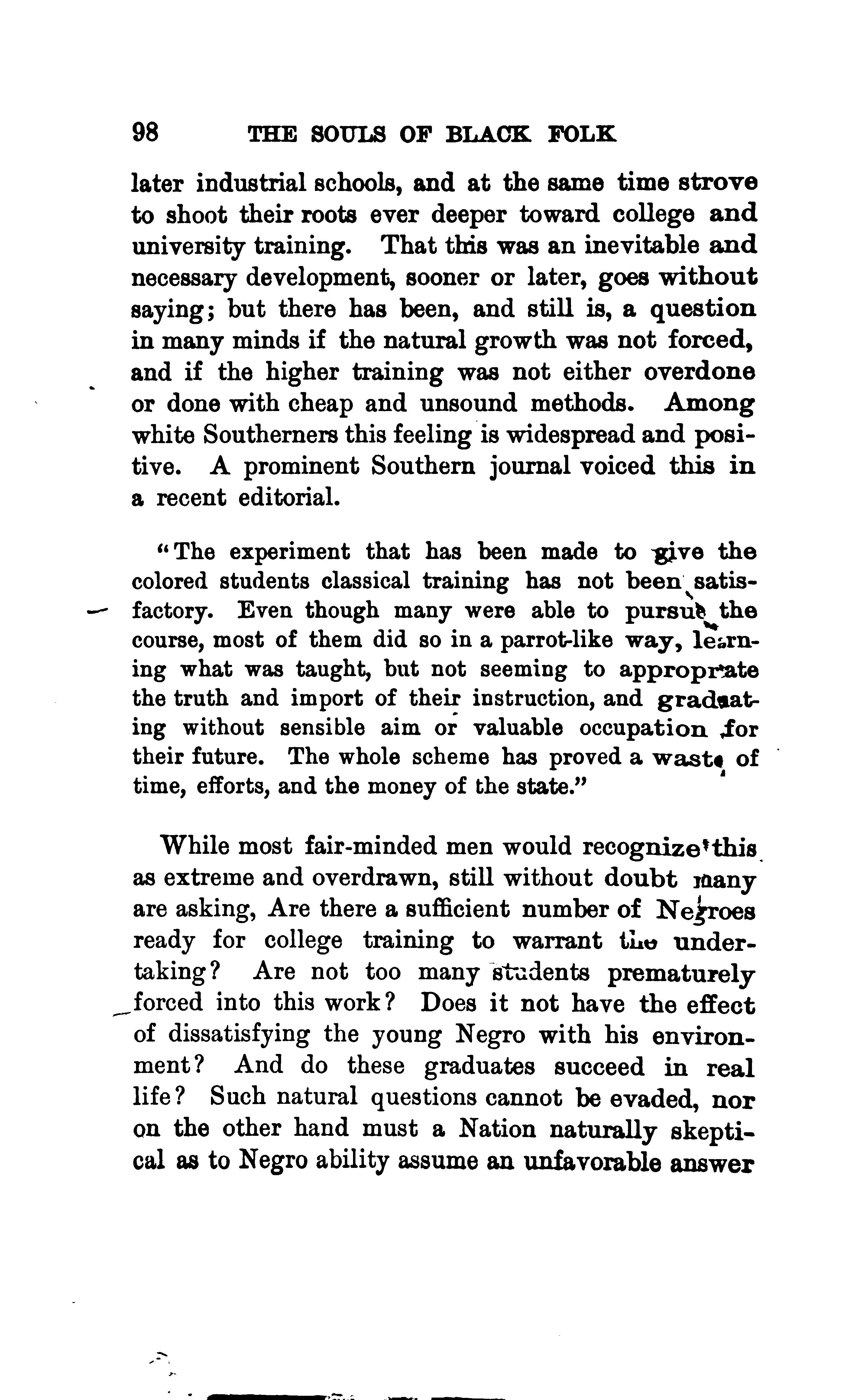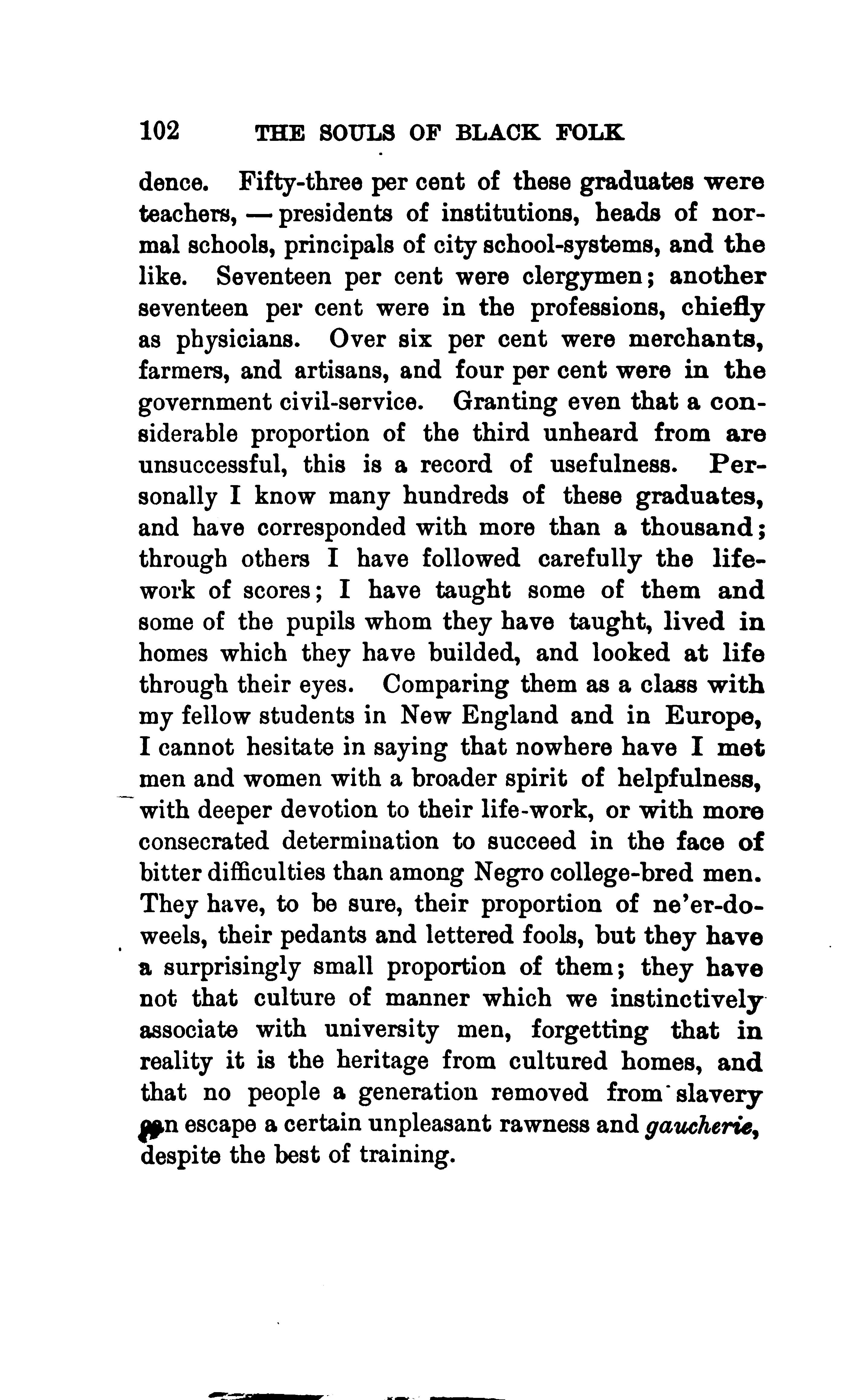 "Professor Du Bois stands in the front rank of cultured colored Americans, and the brilliancy as well as the depth of his work has made him in demand by the leading magazines of this country. The Souls of Black Folk ' should be read and studied by We cannotfind language to express everyperson,white or black. our appreciation of this production, which, from every point of view, can well be termed a masterpiece." " Ohio Enterprise, Cincinnati.