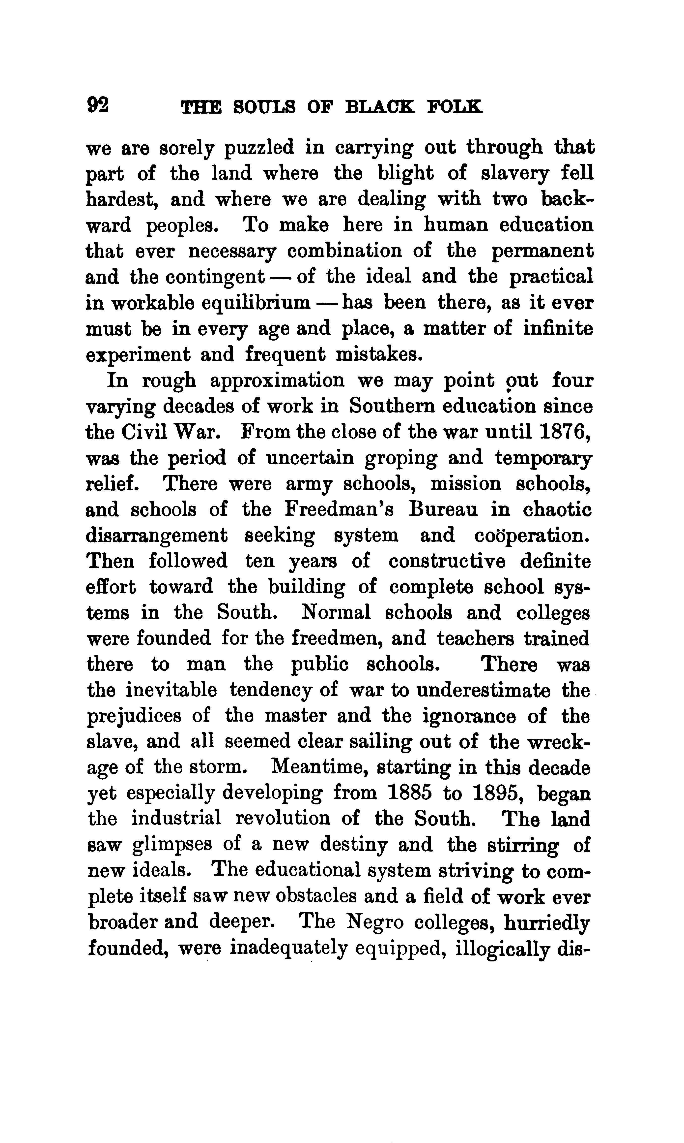 The Nation has not yet found peace from its sins; the freedman has not yet found in freedom his promised land. Whatever of good may have come in these years of change,the shadow of a deep disappointment rests upon the Negro people, a disappointment all the more bitter because the unattained ideal was unbounded save by the simple ignorance of a lowly people. -