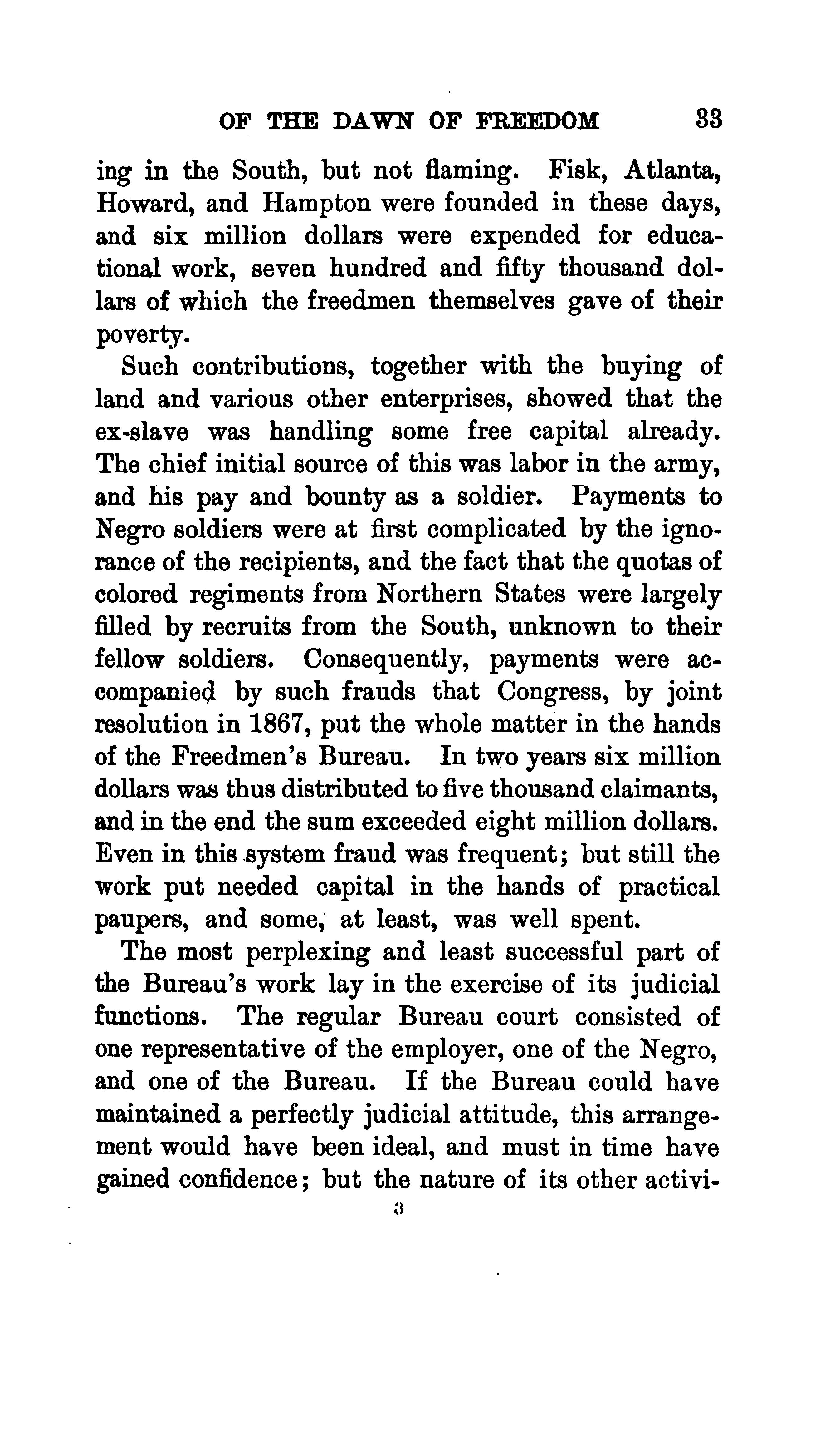 Such contributions, together with the buying of land and various other enterprises, showed that the ex-slave was handling some free capital already. The chief initial source of this was labor in the army, and his pay and bounty as a soldier. Payments to Negro soldiers were at first complicated by the ignorance of the recipients, and the fact that the quotas of colored regiments from Northern States were largely filled by recruits from the South, unknown to their fellow soldiers. Consequently, payments were accompanied by such frauds that Congress, by joint resolution in 1867, put the whole matter in the hands of the Freedmen's Bureau. In two years six million dollars was thus distributed to five thousand claimants, and in the end the sum exceeded eight million dollars. Even in this system fraud was frequent; but still the work put needed capital in the hands of practical paupers, and some, at least, was well spent.