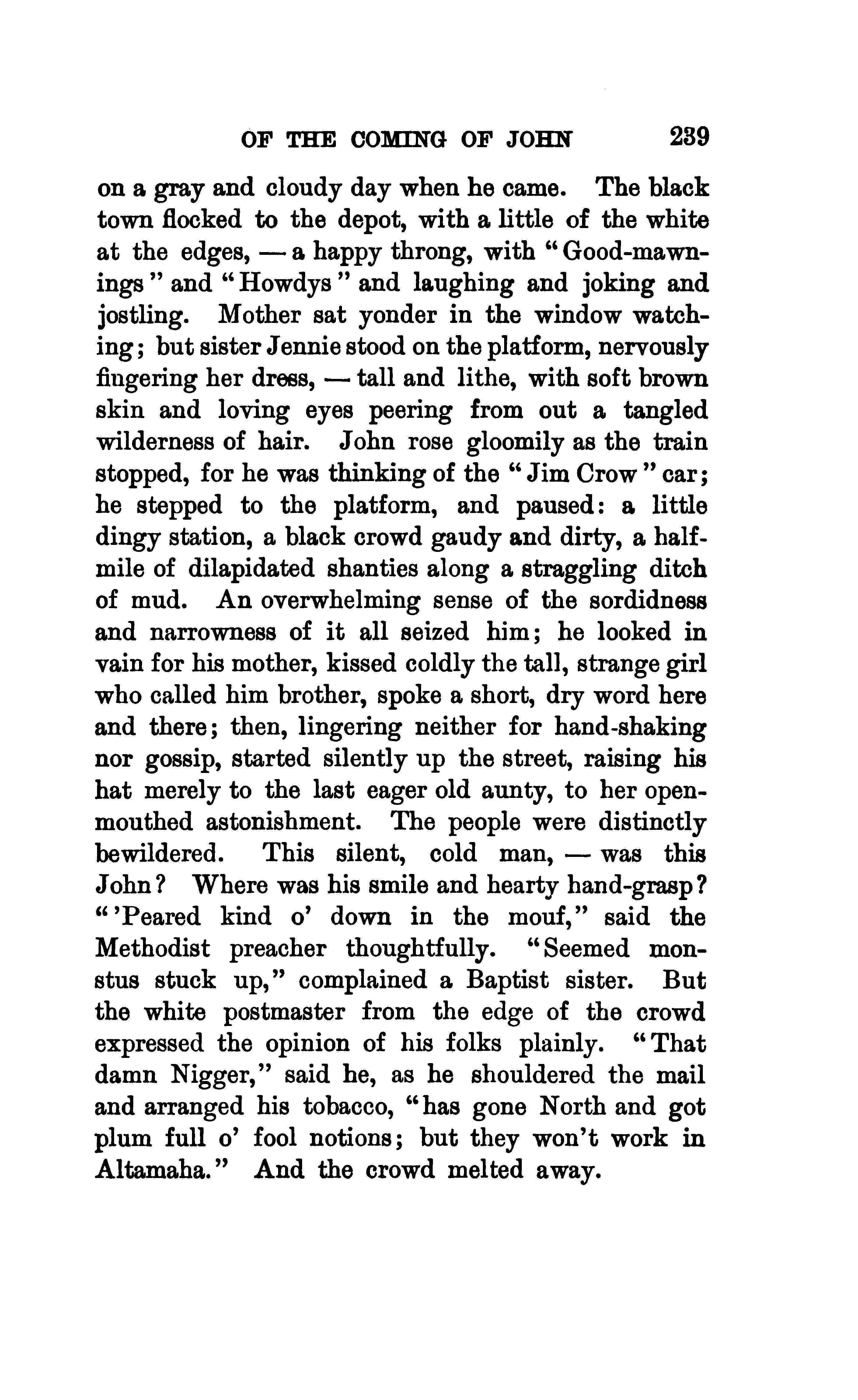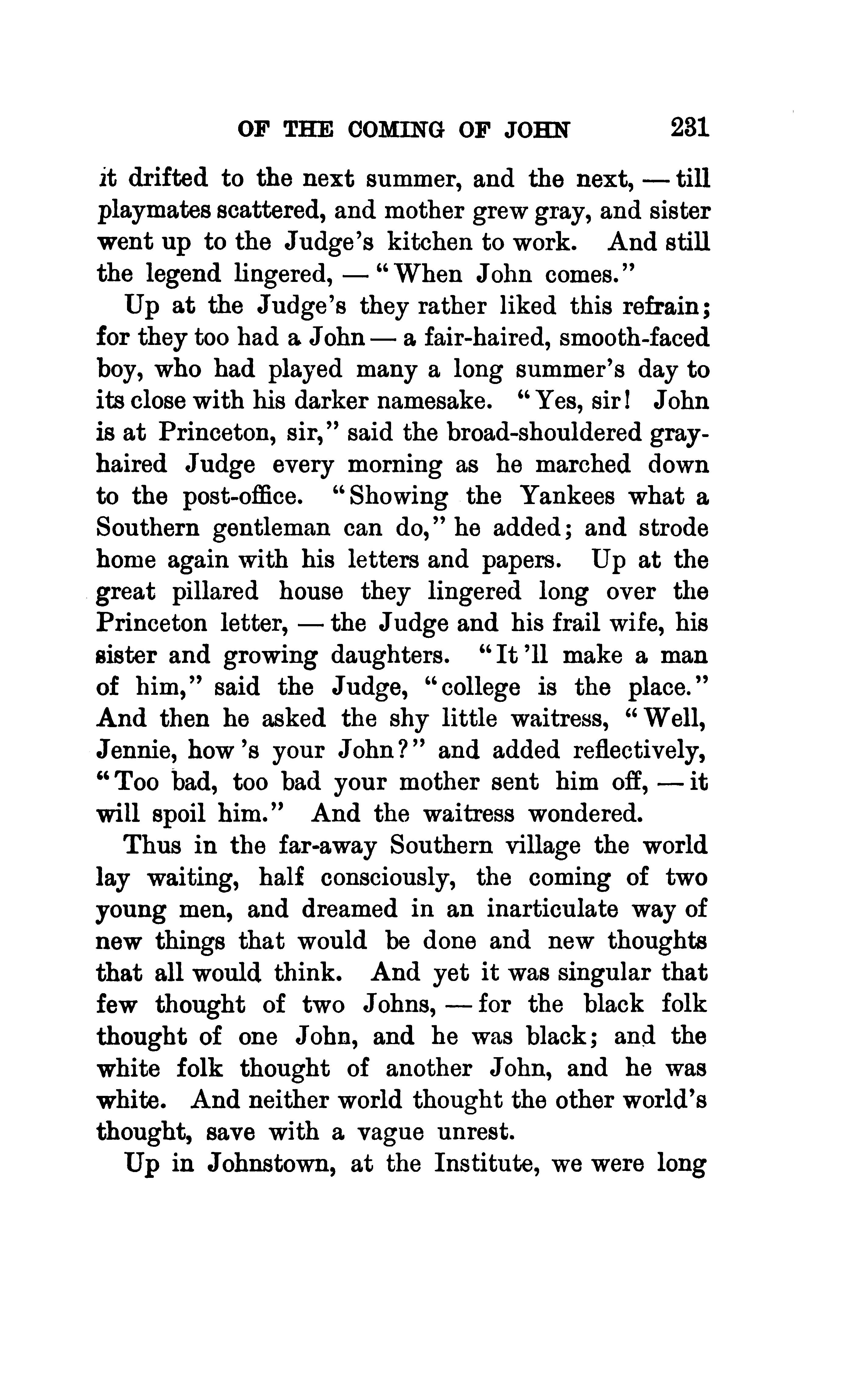 And yet, being a problem is a strange experience, peculiar even for one who has never been anything else, save perhaps in babyhood and in Europe. It is in the early days of rollicking boyhood that the revelation first bursts upon one, all in a day, as it were. I remember well when the shadow swept across me. I was a little thing, away up in the hills of New England, where the dark Housatonic winds between Hoosac and Taghkanic to the sea. In a wee wooden schoolhouse, something put it into the boys' and girls' heads to buy gorgeous visiting-cards ten cents a package and exchange. The exchange was merry, till one girl, a tall newcomer, refused my card, - refused it peremptorily, with a glance. Then it dawned upon me with a certain suddenness that I was different from the others; or like, mayhap, in heart and life and longing, but shut out from their world by a vast veil. I had thereafter no desire to tear down that veil, to creep through ; I held all beyond it in common contempt, and lived above it in a region of blue sky and great wandering shadows. That sky was bluest when I could beat my mates at examination-time, or beat them at a foot-race, or even beat their stringy heads. Alas, with the years all this fine contempt began to fade; for the worlds I longed for, and all their dazzling opportunities, were