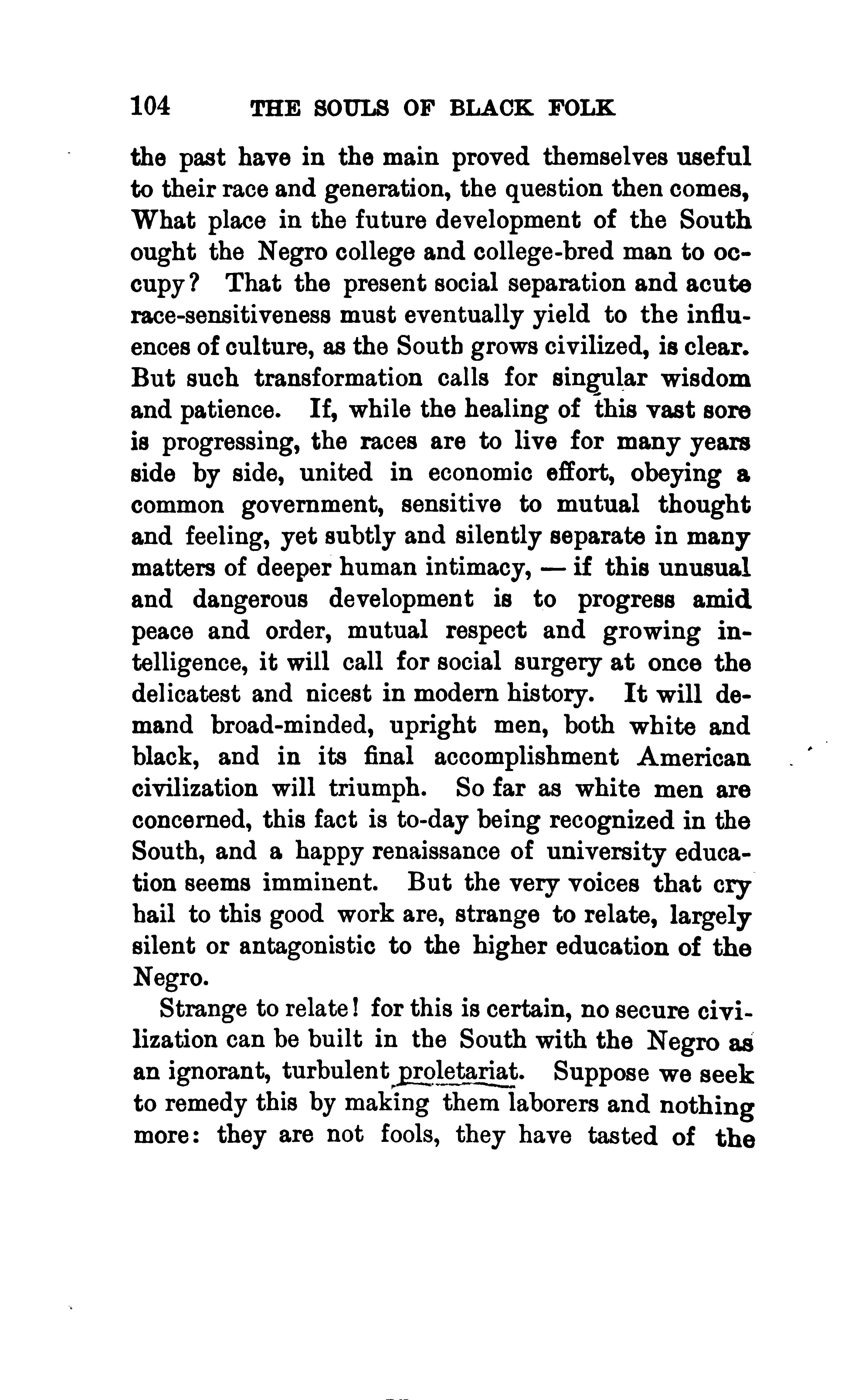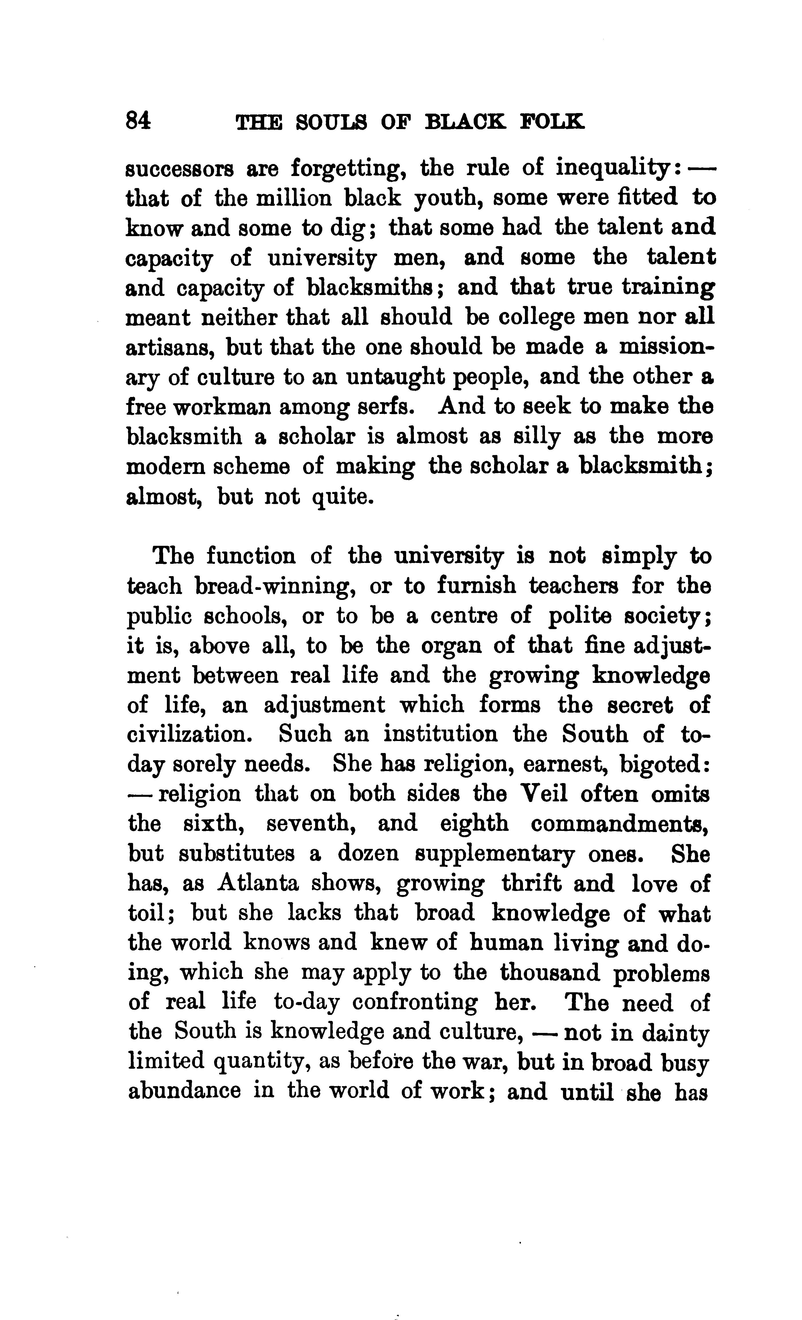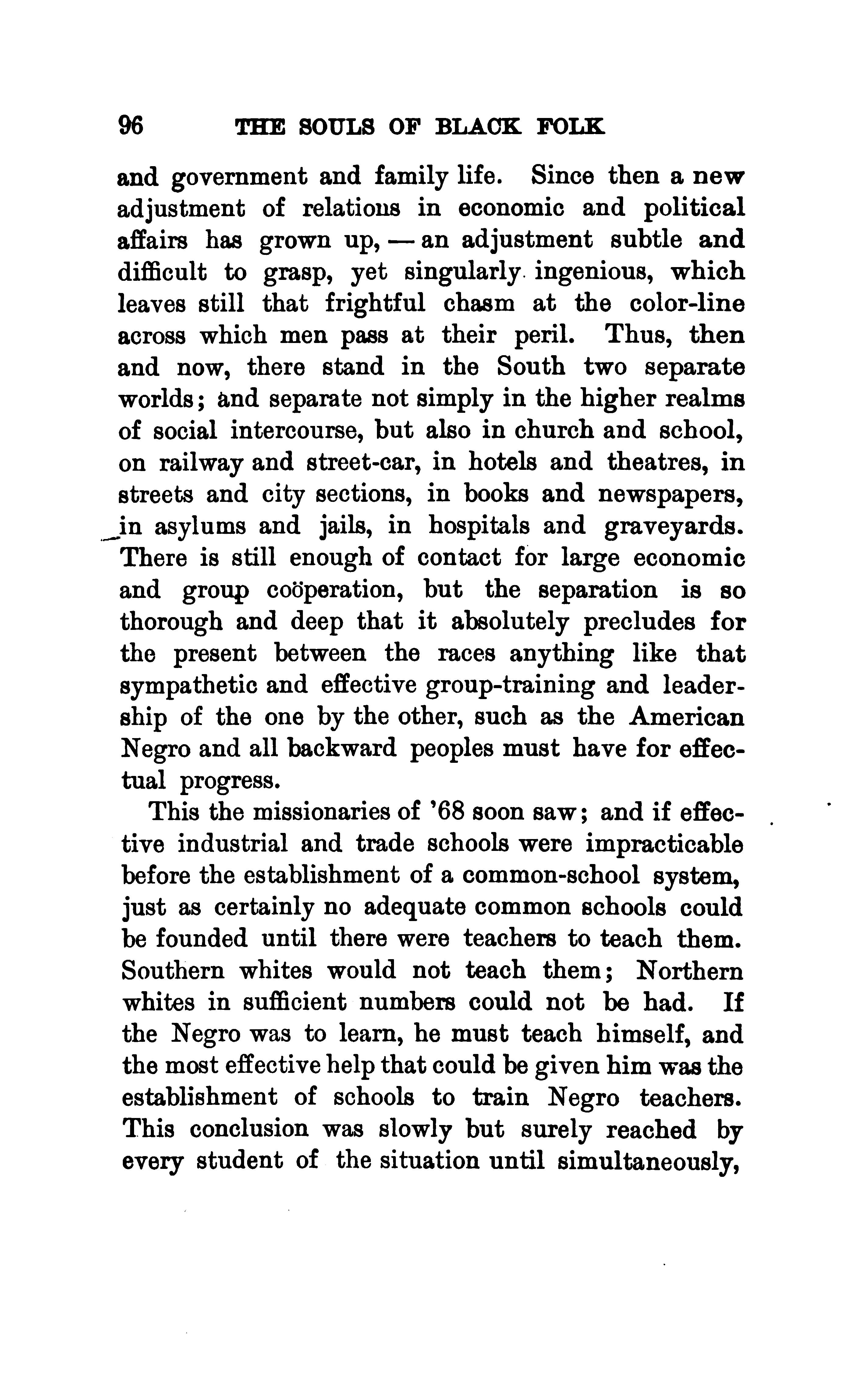 I have sought here to sketch, in vague, uncertain outline, the spiritual world in which ten thousand thousand Americans live and strive. First, in two chapters I have tried to show what Emancipation meant to them, and what was its aftermath. In a third chapter I have pointed out the slow rise of personal leadership, and criticised candidly the leader who bears the chief burden of his race to-day. Then, in two other chapters I have sketched in swift outline the two worlds within and without the Veil, and thus have come to the central problem of training men for life. Venturing now into deeper detail, I have in two chapters studied the struggles of the massed millions of the black peasantry, and inanother