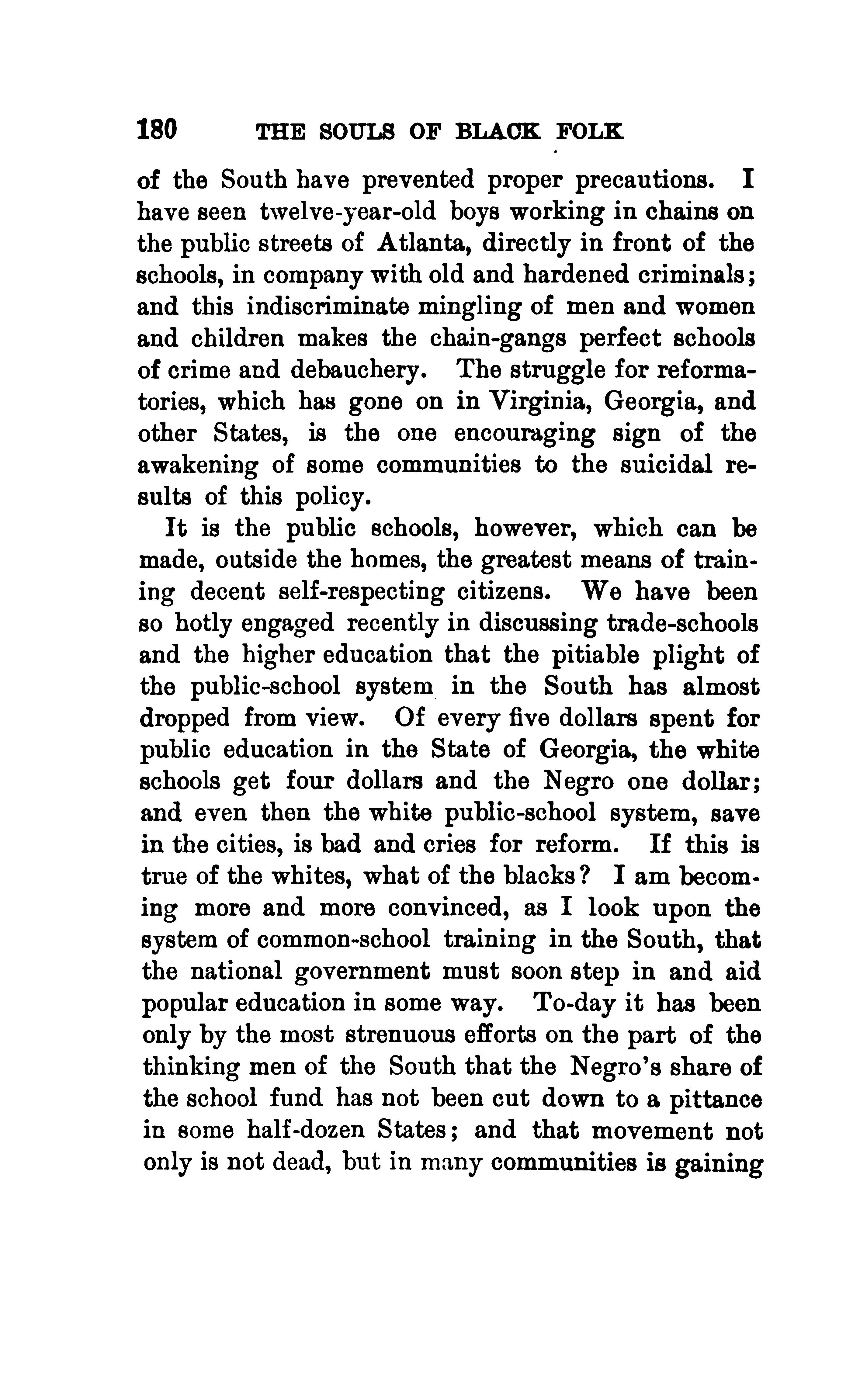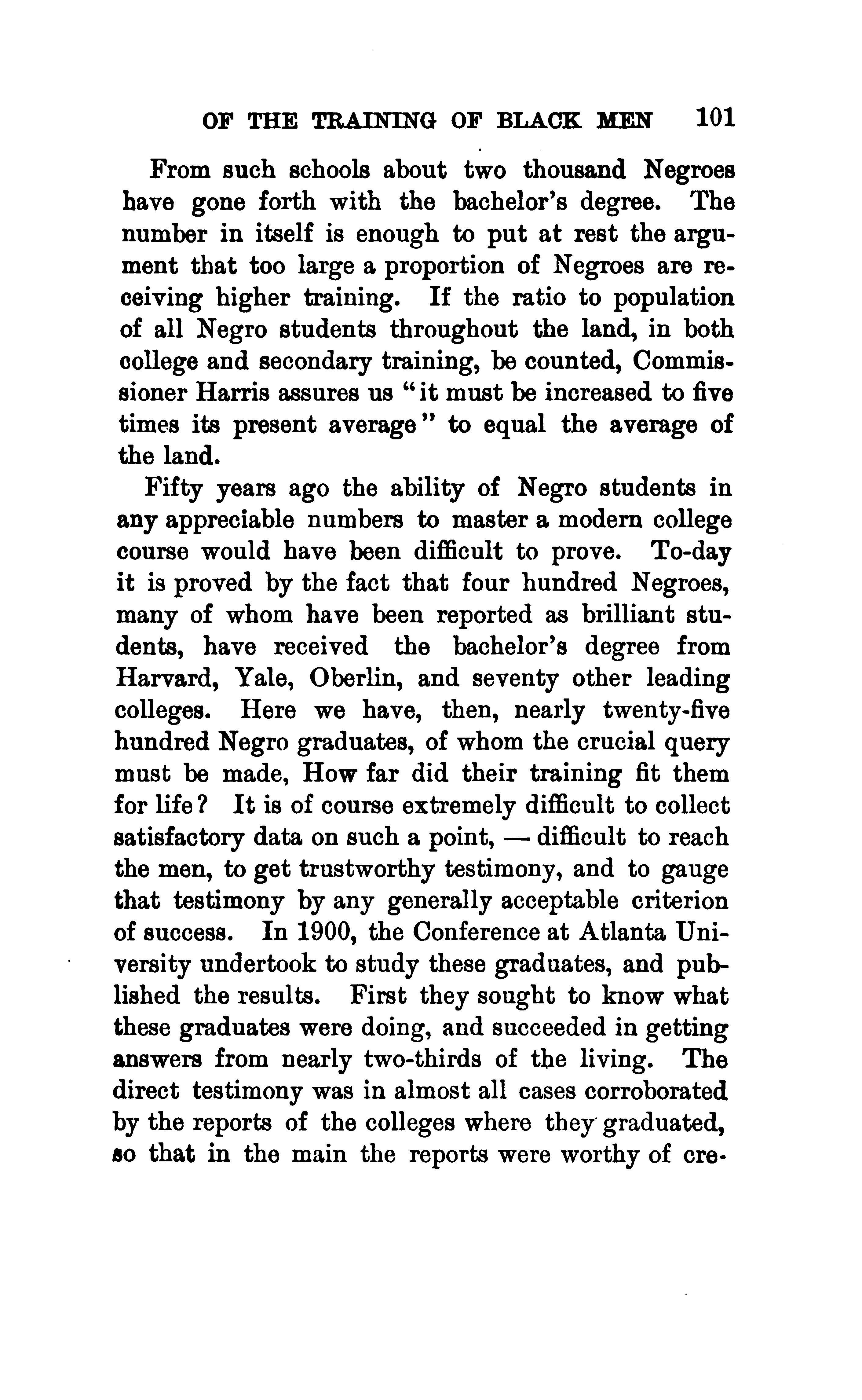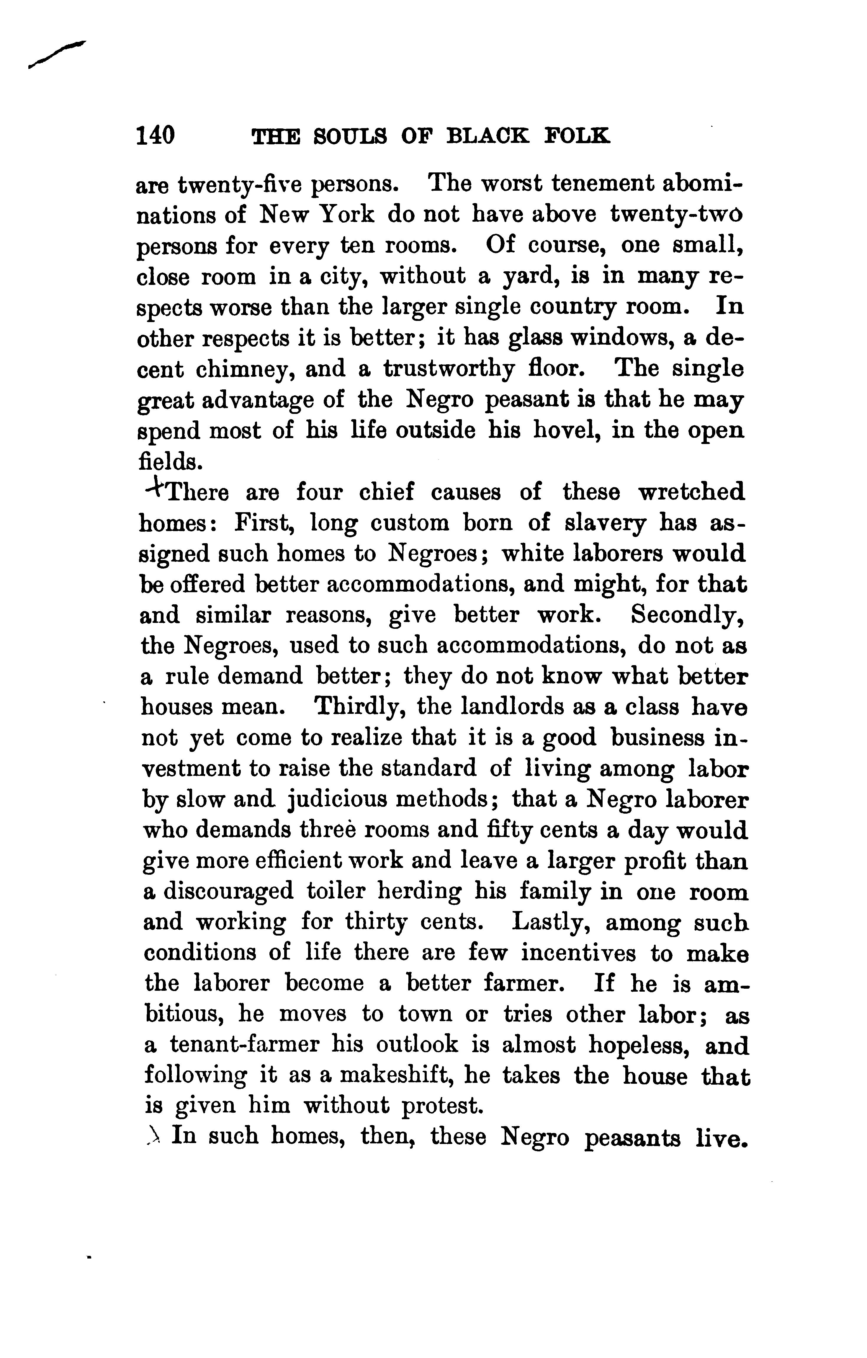 I have sought here to sketch, in vague, uncertain outline, the spiritual world in which ten thousand thousand Americans live and strive. First, in two chapters I have tried to show what Emancipation meant to them, and what was its aftermath. In a third chapter I have pointed out the slow rise of personal leadership, and criticised candidly the leader who bears the chief burden of his race to-day. Then, in two other chapters I have sketched in swift outline the two worlds within and without the Veil, and thus have come to the central problem of training men for life. Venturing now into deeper detail, I have in two chapters studied the struggles of the massed millions of the black peasantry, and inanother