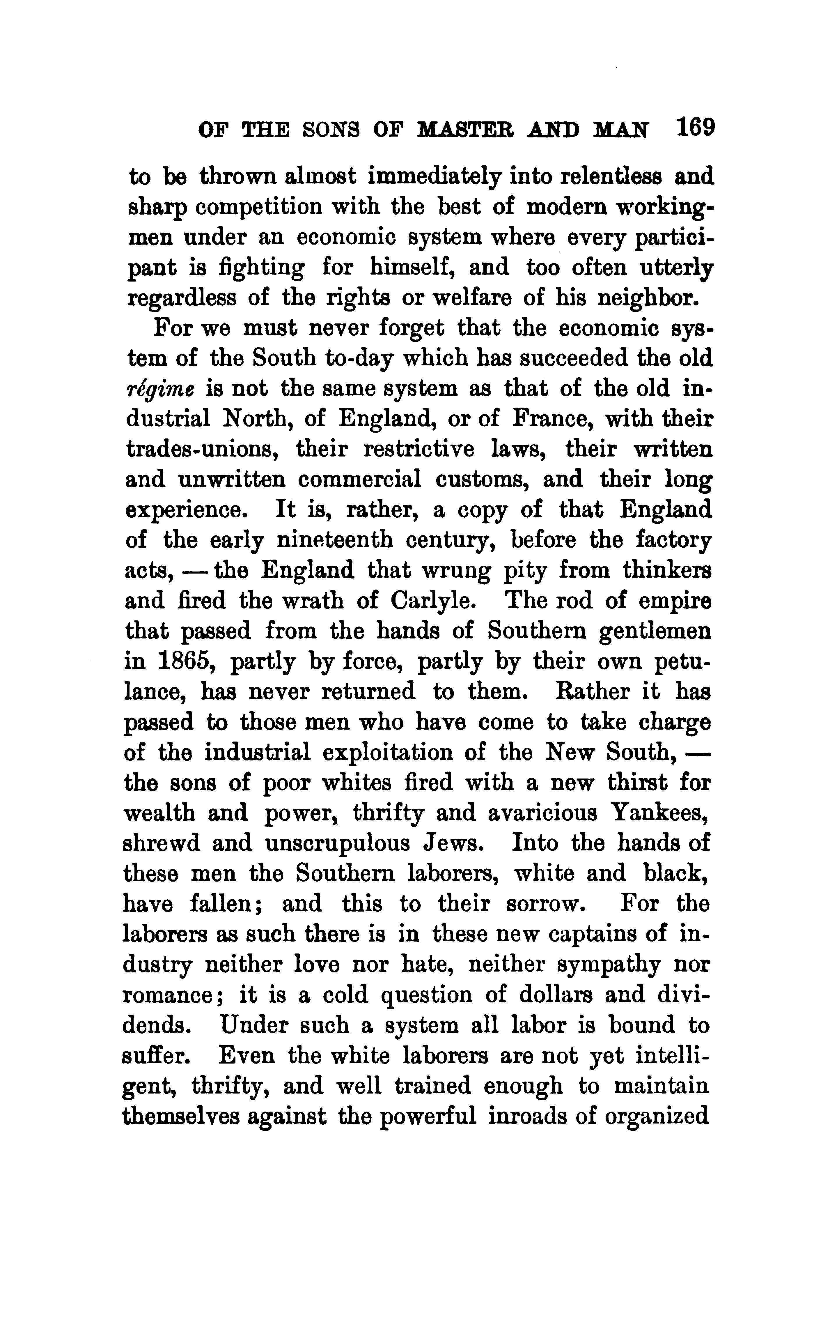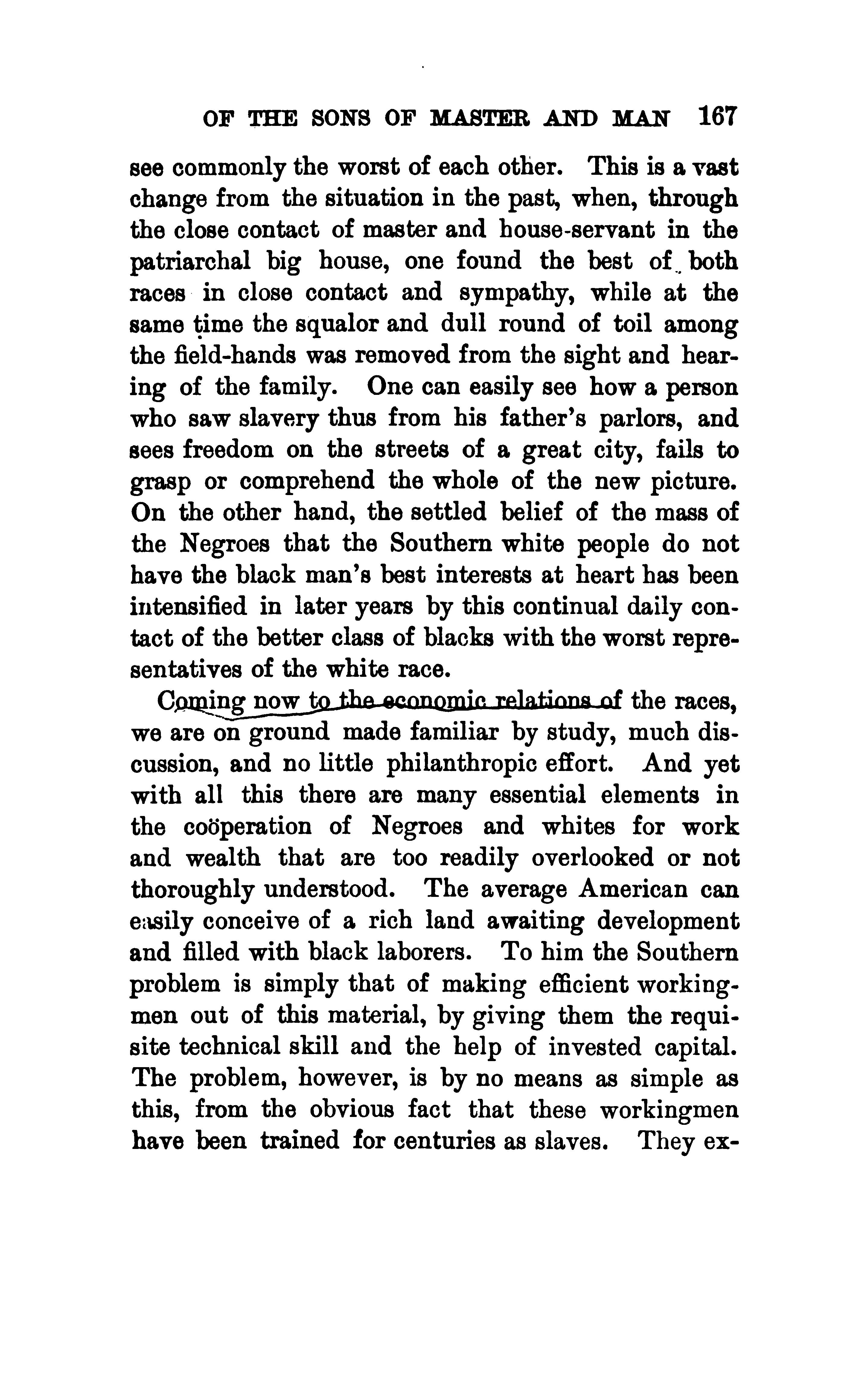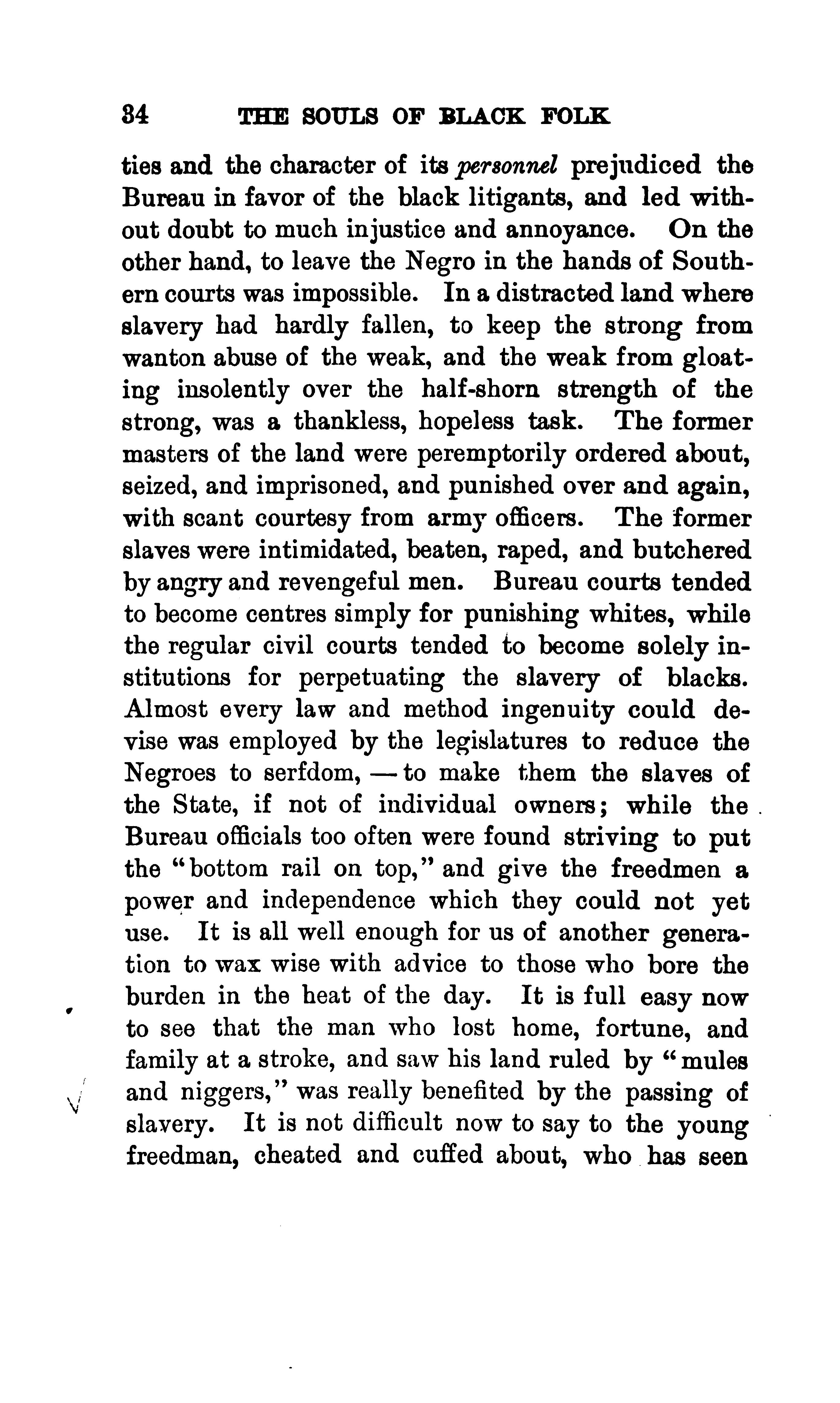 Then amid all crouched the freed slave, bewildered between friend and foe. He had emerged from slavery, - not the worst slavery in the world, not a slavery that made all life unbearable, rather a slavery that had here and there something of kindliness, fidelity, and happiness, but withal slavery, which, so far as human aspiration and desert were concerned, classed the black man and the ox together. And the Negro knew full well that, whatever their deeper convictions mayhave been, Southern men had fought with desperate energy to perpetuate this slavery under