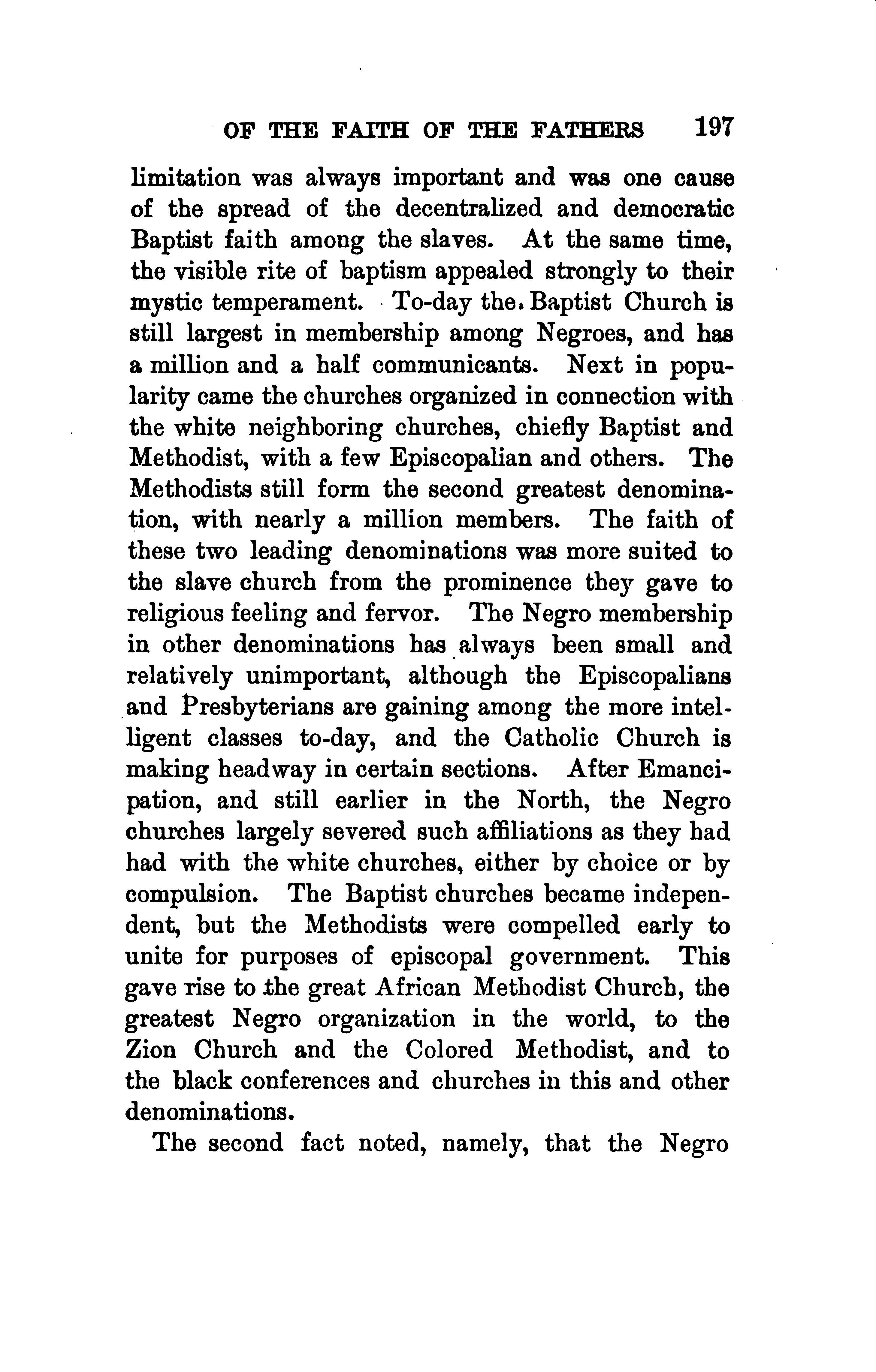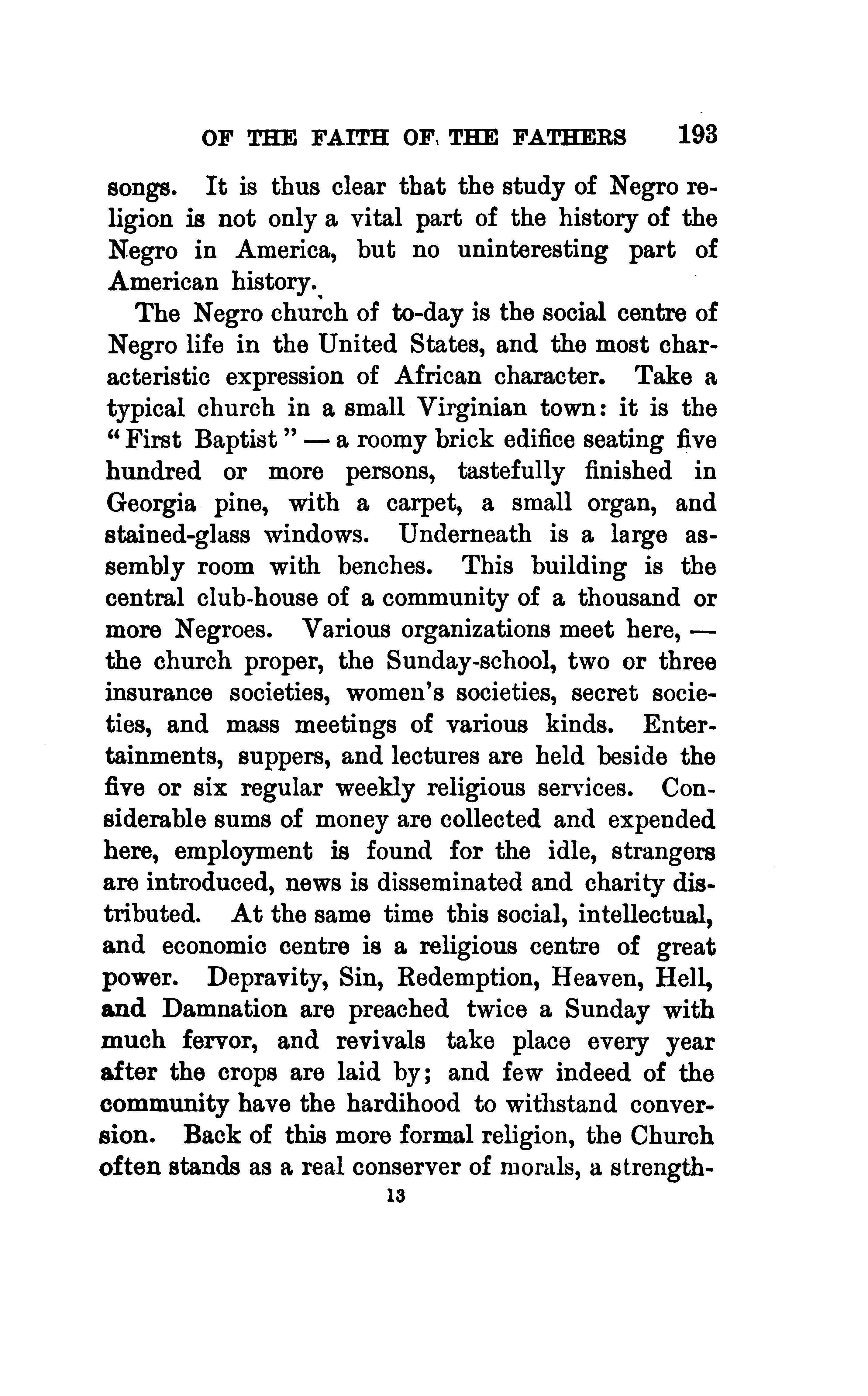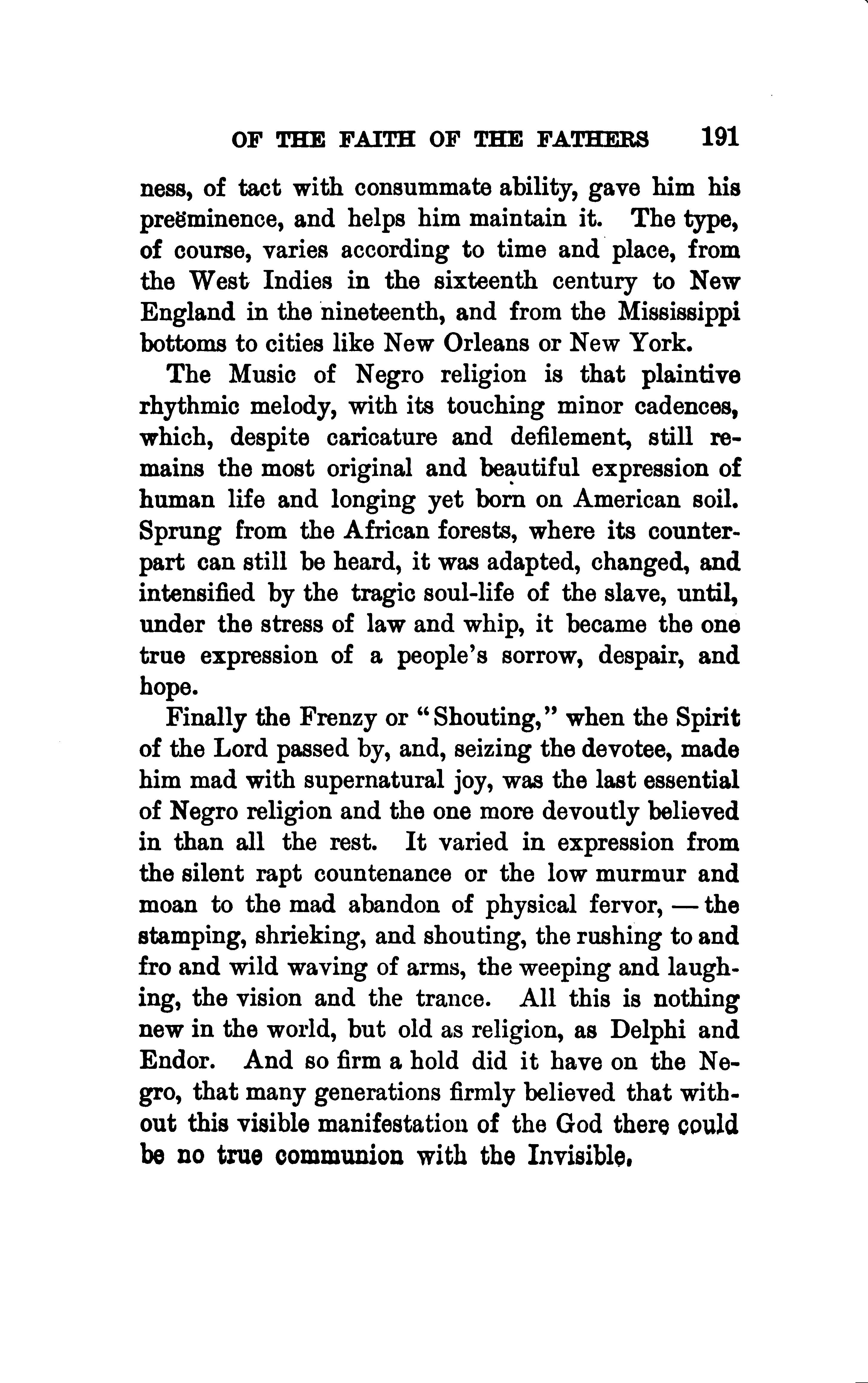 Of death the Negro showed little fear, but talked of it familiarly and even fondly as simply a crossing of the waters, perhaps who knows ?- back to his ancient forests again. Later days transfigured his fatalism, and amid the dust and dirt the toiler sang: