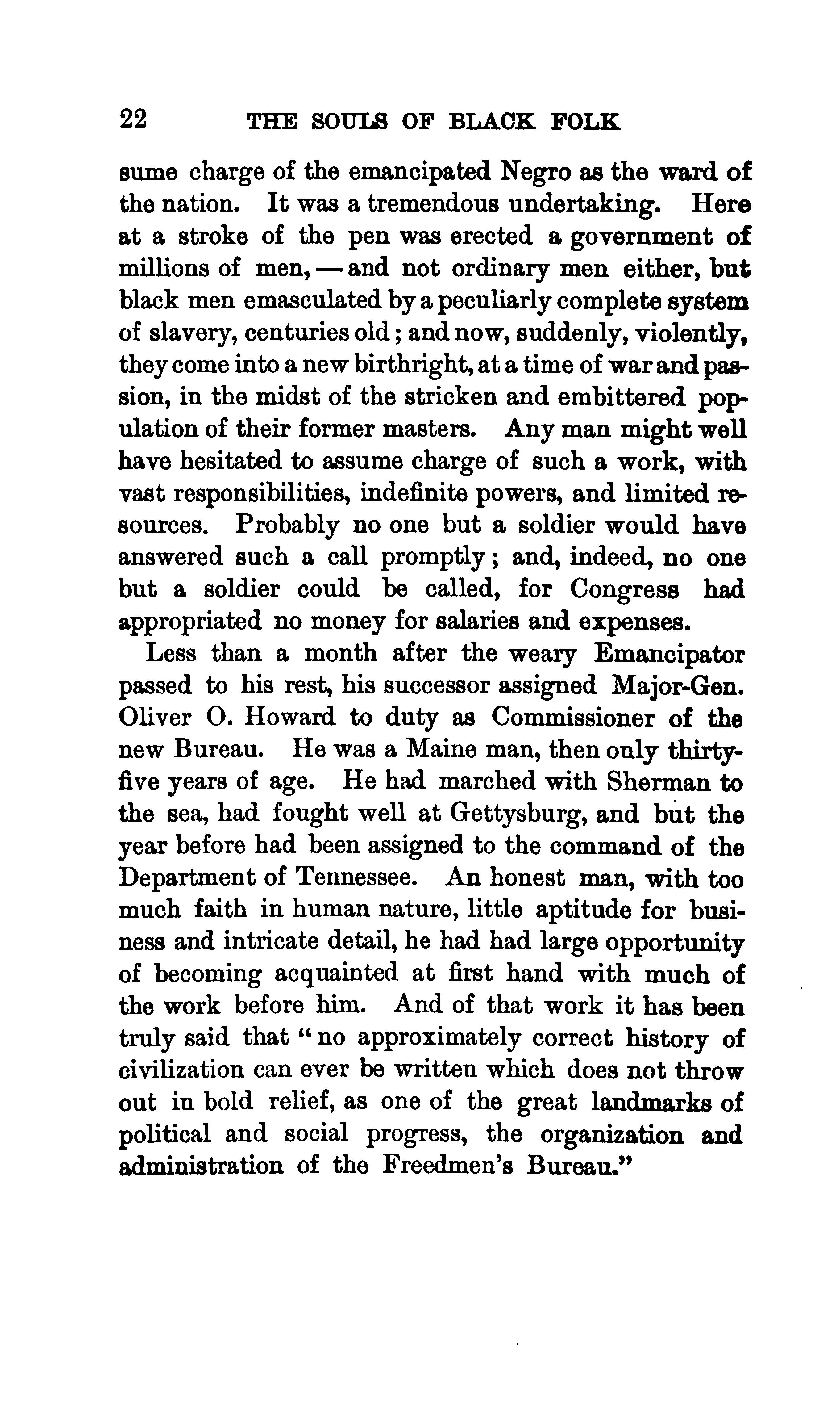 sume charge of the emancipated Negro as the ward of the nation. It was a tremendous undertaking. Here at a stroke of the pen was erected a government of millions of men, and not ordinary men either, but black men emasculated byapeculiarly complete system of slavery, centuries old ; and now, suddenly, violently, theycomeinto anewbirthright, ata time of warandpassion, in the midst of the stricken and embittered population of their former masters. Any man might well have hesitated to assume charge of such a work, with vast responsibilities, indefinite powers, and limited resources. Probably no one but a soldier would have answered such a call promptly ; and, indeed, no one but a soldier could be called, for Congress had appropriated no money for salaries and expenses. Less than a month after the weary Emancipator passed to his rest, his successor assigned Major-Gen. Oliver O. Howard to duty as Commissioner of the new Bureau. He was a Maine man, then only thirtyfive years of age. He had marched with Sherman to the sea, had fought well at Gettysburg, and but the year before had been assigned to the command of the Department of Tennessee. An honest man, with too much faith in human nature, little aptitude for business and intricate detail, he had had large opportunity of becoming acquainted at first hand with much of the work before him. And of that work it has been truly said that " no approximately correct history of civilization can ever be written which does not throw out in bold relief, as one of the great landmarks of political and social progress, the organization and administration of the Freedmen's Bureau."