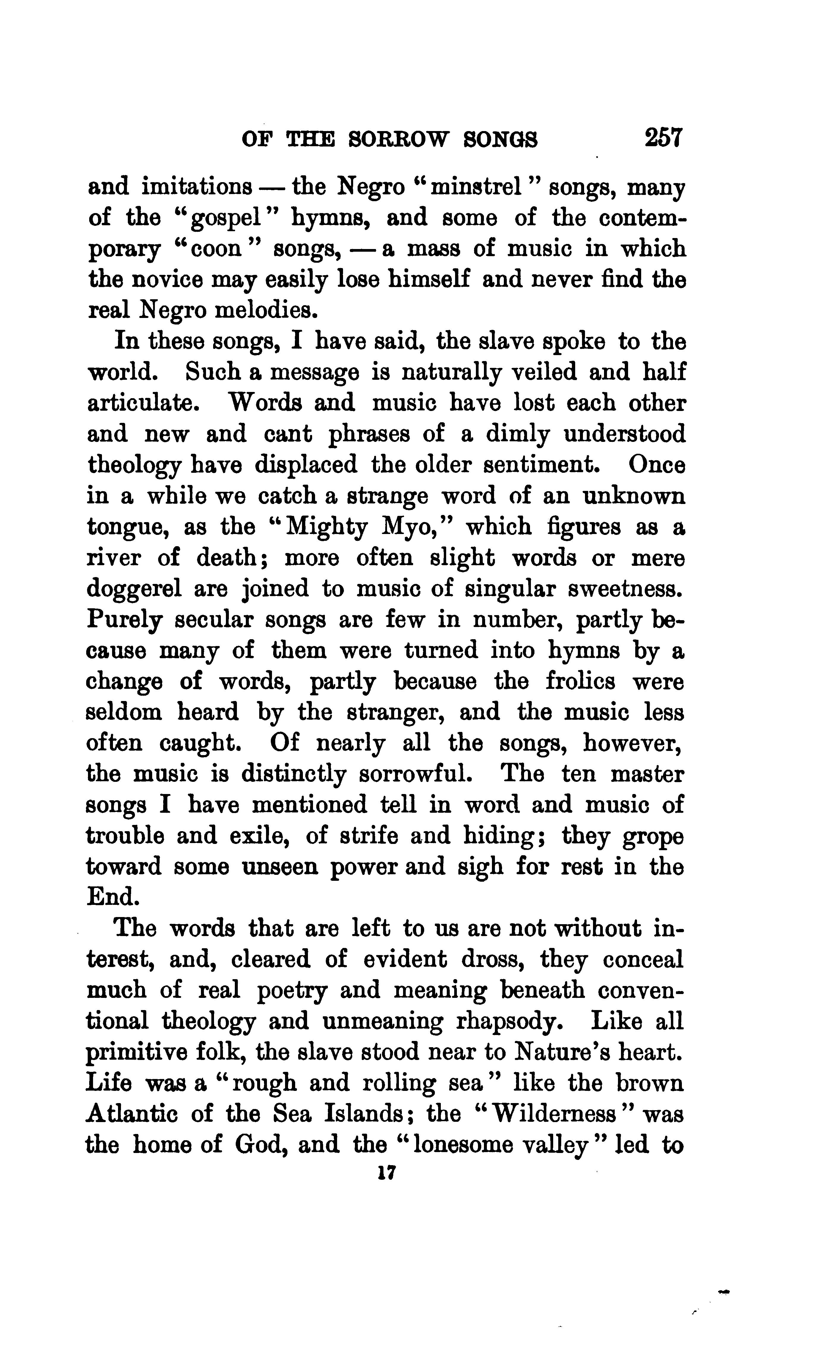 In these songs, I have said, the slave spoke to the world. Such a message is naturally veiled and half articulate. Words and music have lost each other and new and cant phrases of a dimly understood theology have displaced the older sentiment. Once in a while we catch a strange word of an unknown tongue, as the " Mighty Myo," which figures as a river of death; more often slight words or mere doggerel are joined to music of singular sweetness. Purely secular songs are few in number, partly because many of them were turned into hymns by a change of words, partly because the frolics were seldom heard by the stranger, and the music less often caught. Of nearly all the songs, however, the music is distinctly sorrowful. The ten master songs I have mentioned tell in word and music of trouble and exile, of strife and hiding; they grope toward some unseen power and sigh for rest in the End.